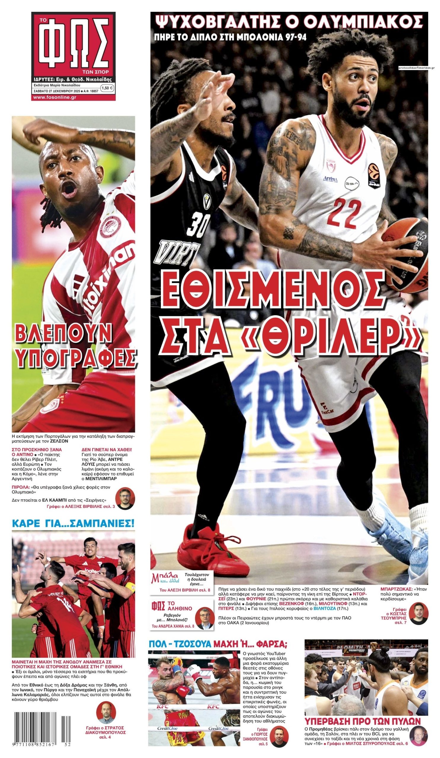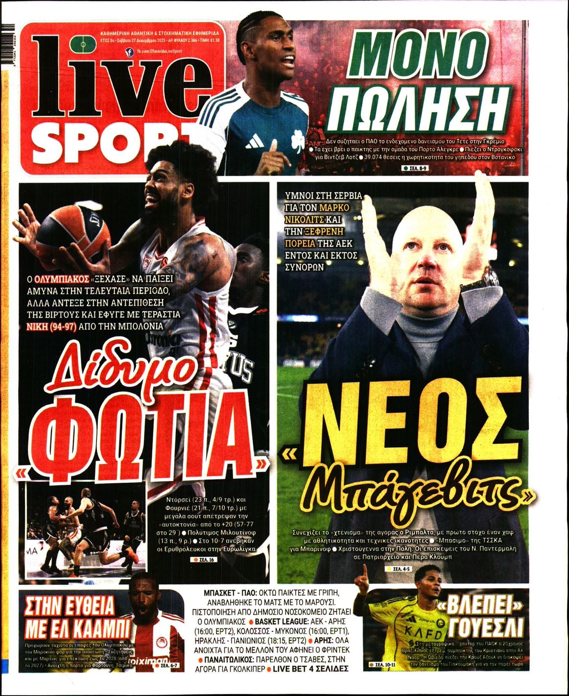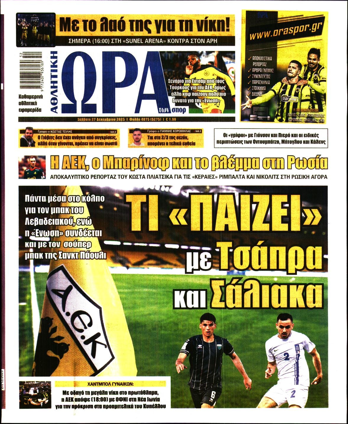 Οι αθλητικές εφημερίδες 27/12/2025 Σήφης Γαρυφαλάκης 05:42, Σάββατο 27 Δεκεμβρίου 2025 Media Διαβάστε τα πρωτοσέλιδα από τις αθλητικές εφημερίδες, σήμερα 27/12/2025. ΑΘΛΗΤΙΚΕΣ ΕΦΗΜΕΡΙΔΕΣ ΕΦΗΜΕΡΙΔΕΣ ΠΡΩΤΟΣΕΛΙΔΑ Μοιράσου το: σχολίασε κι εσύ (0 σχόλια) Ακολουθήστε το enikos.gr στο Google News και μάθετε πρώτοι όλες τις ειδήσεις Δείτε όλες τις τελευταίες ειδήσεις από την Ελλάδα και τον Κόσμο στο enikos.gr Ειδήσεις Ροή Ειδήσεων 8 ώρες πριν Δολοφονία Ελένης Παπαδοπούλου: Σε τρεις φάσεις ο μηχανισμός θανάτου – Τα στοιχεία που οδήγησαν στη σύλληψη του γιου της 8 ώρες πριν Ξεγελάστηκαν από τον καλό καιρό οι ορειβάτες που βρέθηκαν νεκροί – Το χρονικό της τραγωδίας στα Βαρδούσια Όρη 8 ώρες πριν Συνάντηση Ζελένσκι – Τραμπ: Τα θέματα και τα «αγκάθια» που θα συζητηθούν – Γιατί ανεβάζει τώρα ταχύτητες το Κίεβο στη διπλωματία 7 ώρες πριν Θρίλερ με το αυτοκίνητο που βρέθηκε στις Σέρρες – Κλιμάκιο της Πυροσβεστικής στο σημείο για να διαπιστώσει αν ανήκει στον αγνοούμενο πυροσβέστη 9 ώρες πριν Θάνατος 7χρονου στην Ροδόπη: Για εμπρησμό από αμέλεια κατηγορείται η μητέρα του – Σε σοβαρή κατάσταση νοσηλεύεται ο αδελφός του 8 ώρες πριν «Ευλογία από τους Αγίους Τόπους»: Ανακαλύφθηκε καλούπι 1.400 ετών για τα πρώτα σουβενίρ – Ο περίτεχνος σταυρός και η ελληνική επιγραφή 9 ώρες πριν Ύπνος: Το απλό κόλπο με τη θερμοκρασία του σώματος που σας βοηθάει να χαλαρώσετε, σύμφωνα με ειδικούς 10 ώρες πριν Όσοι έχετε γεννηθεί αυτούς τους 3 μήνες, περάσατε δύσκολα το 2025 – «Το 2026 η τύχη σας αλλάζει και θα αποζημιωθείτε» 11 ώρες πριν Φούρνος: Ο φυσικός και οικονομικός τρόπος για να εξαφανίσετε τη μυρωδιά καμένου 8 λεπτά πριν Την Κυριακή με τη Realnews: Δωροεπιταγή 10€ 19 λεπτά πριν ΔΕΔΔΗΕ: Διακοπές ρεύματος σήμερα (27/12) στην Αττική 28 λεπτά πριν Ολυμπιακός – Μπαρτζώκας: «Συγχαρητήρια στους παίκτες και στους φιλάθλους, ο Ντόρσεϊ είναι μεγάλο πλεονέκτημα» 42 λεπτά πριν Αττική: Σαρωτικοί έλεγχοι της Τροχαίας για αλκοόλ, ζώνες και κράνος – Τι δείχνουν τα στοιχεία των τελευταίων ημερών 54 λεπτά πριν Οπτική ψευδαίσθηση: Μόνο το 3% των ανθρώπων θα βρει τον σκύλο σε 12 δευτερόλεπτα ENIKOS NETWORK Το γιορτινό φρούτο που μπορεί να μειώσει τον κίνδυνο για καρδιοπάθεια και να βοηθήσει στη αντιμετώπιση ουρολοιμώξεων Οι γείτονές σας μπορεί να αυξάνουν τον λογαριασμό του δικού σας ρεύματος – Προσέξτε αυτό το σημάδι Επιστροφές ΕΝΦΙΑ: Ποιοι ιδιοκτήτες θα πάρουν πίσω χρήματα για φόρους που είχαν πληρώσει Επίδομα μητρότητας: Τι αλλάζει για χιλιάδες μητέρες Ο Google Assistant θα παραμείνει λίγο περισσότερο για ορισμένους χρήστες Android Τεστ προσωπικότητας: Το βάζο που θα επιλέξετε αποκαλύπτει πώς λύνετε προβλήματα στη ζωή σας περισσότερα 05:48 , Σάββατο 27 Δεκεμβρίου 2025 Οι οικονομικές εφημερίδες 27/12/2025 Διαβάστε τα πρωτοσέλιδα από τις οικονομικές εφημερίδες, σήμερα 27/12/2025. 05:38 , Σάββατο 27 Δεκεμβρίου 2025 Οι πολιτικές εφημερίδες 27/12/2025 Διαβάστε τα πρωτοσέλιδα από τις πολιτικές εφημερίδες, σήμερα 27/12/2025. 21:24 , Παρασκευή 26 Δεκεμβρίου 2025 Γιούλικα Σκαφιδά: Το ξέσπασμα για το φιλί δύο γυναικών που «κόπηκε» στον Άγιο Έρωτα – «Kάποια στιγμή πρέπει να μιλήσουμε ανοιχτά για αυτό» Την έντονη αντίδραση της Γιούλικας Σκαφιδά προκάλεσε η απόφαση της παραγωγής να μην προβάλλει ... 10:23 , Παρασκευή 26 Δεκεμβρίου 2025 Τηλεθέαση (25/12): Τι παρακολούθησε το βράδυ των Χριστουγέννων το κοινό; Μία δυνατή «μάχη» έδωσαν το βράδυ των Χριστουγέννων (25/12) οι τηλεοπτικοί σταθμοί, κάτι που α... ΤΕ