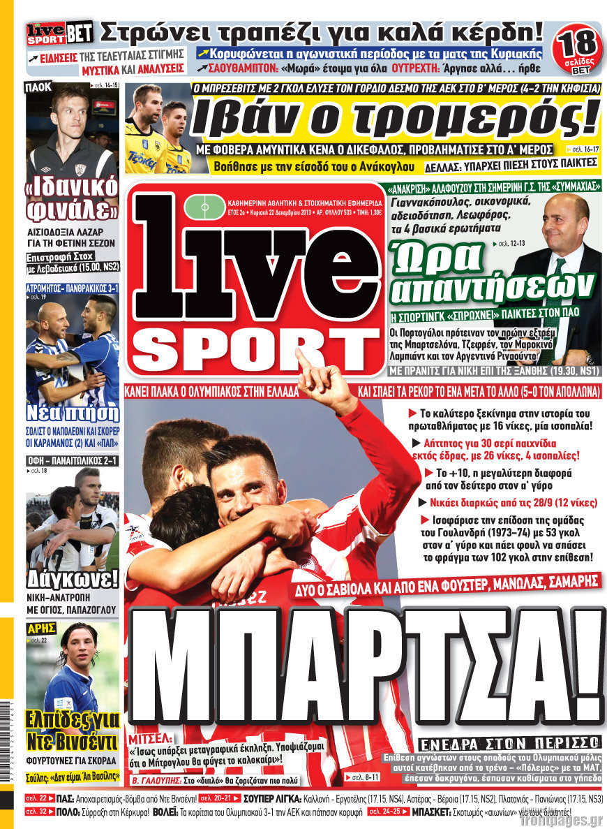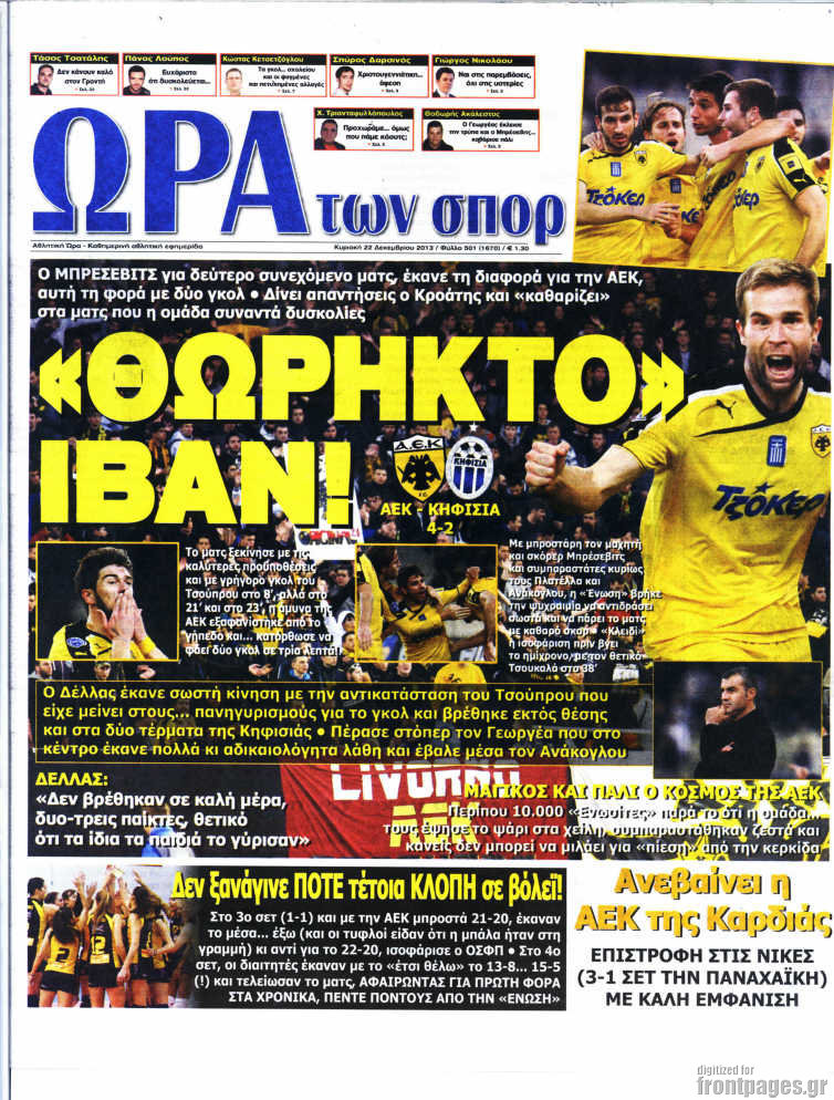 Οι αθλητικές εφημερίδες Enikos Newsroom 08:27, Κυριακή 22 Δεκεμβρίου 2013 Media Οι αθλητικές εφημερίδες ΑΘΛΗΤΙΚΕΣ ΕΦΗΜΕΡΙΔΕΣ ΕΦΗΜΕΡΙΔΕΣ Μοιράσου το: σχολίασε κι εσύ (0 σχόλια) Ακολουθήστε το enikos.gr στο Google News και μάθετε πρώτοι όλες τις ειδήσεις Δείτε όλες τις τελευταίες ειδήσεις από την Ελλάδα και τον Κόσμο στο enikos.gr Ειδήσεις Ροή Ειδήσεων 8 ώρες πριν Μητσοτάκης: Αναγκαία η μεταρρύθμιση του πρωτογενούς τομέα – Τα 6 νέα μέτρα για το στεγαστικό και οι αναφορές σε «Ιθάκη» και «πολιτικούς του καναπέ» 7 ώρες πριν Δάνεια σε ελβετικό φράγκο: Τα βασικά σημεία της ρύθμισης – ανάσας για 40.000 δανειολήπτες – Αναλυτικός οδηγός με ερωτήσεις και απαντήσεις 7 ώρες πριν Κυψέλη: Εξιτήριο πήρε η 14χρονη μαθήτρια που μαχαιρώθηκε από την 16χρονη σε σχολείο – «Θέλω να βοηθήσω το παιδί, έχει μπλέξει με κακές παρέες» 7 ώρες πριν Τραμπ: Γιατί κατέθεσε τώρα την αγωγή κατά του BBC – Πώς η κίνησή του εξυπηρετεί το νέο δόγμα του για «αντίσταση» στην Ευρώπη, υπέρ των συντηρητικών 8 ώρες πριν ΟΠΕΚΕΠΕ – Παράνομες επιδοτήσεις: Ελεύθεροι με περιοριστικούς όρους και οι 7 κατηγορούμενοι που απολογήθηκαν σήμερα 7 ώρες πριν Ανακαλύφθηκε βυθισμένη πέτρινη κατασκευή ανοιχτά της Κριμαίας – Αποτελεί μέρος αρχαίας ελληνικής αποικίας 8 ώρες πριν Ύπνος: Αυτό μπορεί να είναι το χειρότερο λάθος για το βιολογικό ρολόι σας, σύμφωνα με ειδικό 9 ώρες πριν Αριθμολογία: Οι άνθρωποι που έχουν γεννηθεί αυτές τις 3 ημερομηνίες, προσελκύουν μεγάλη τύχη πριν από το τέλος του 2025 11 ώρες πριν Οι 7 συμπεριφορές που μαρτυρούν ότι ένας άνδρας επενδύει μακροπρόθεσμα σε μια σχέση 7 λεπτά πριν Τα ζώδια σήμερα, Τετάρτη 17 Δεκεμβρίου: Κριοί, η αυτοπεποίθησή σας ενισχύεται 15 λεπτά πριν Εφημερεύοντα φαρμακεία σε Αθήνα και Θεσσαλονίκη (17/12) 20 λεπτά πριν Κόστα Ρίκα: Το Κογκρέσο απέρριψε το αίτημα για άρση της ασυλίας του προέδρου Τσάβες 28 λεπτά πριν Κολομβία: Νεκροί τέσσερις αστυνομικοί σε βομβιστικές επιθέσεις ανταρτών 36 λεπτά πριν Στάση εργασίας 11:00 – 17:00 σήμερα στα λεωφορεία του ΟΑΣΑ – Ποιες γραμμές θα λειτουργήσουν ENIKOS NETWORK Αίτημα ΙΣΑ για την εξαίρεση των προσωπικών γιατρών από τις κατ’ οίκον επισκέψεις Η σκανδιναβική μέθοδος στον ύπνο που μπορεί να σώσει έναν γάμο Πιερρακάκης: Ο προϋπολογισμός συμβάλλει ουσιαστικά στην ενίσχυση της αγοραστικής δύναμης της πλειονότητας των εργαζομένων e-ΕΦΚΑ: Παρατείνεται η προθεσμία για την υποβολή ΑΠΔ – Ποιους αφορά Σύγχρονος Νοστράδαμος: Προειδοποιεί για «μεγάλο γεγονός» τους επόμενους μήνες που θα συγκλονίσει τη Βρετανία και τον κόσμο Τεστ παρατηρητικότητας: Μπορείτε να βρείτε τις 3 διαφορές στις εικόνες με έναν πιγκουίνο σε 14 δευτερόλεπτα περισσότερα 20:06 , Τρίτη 16 Δεκεμβρίου 2025 Ο ΣΚΑΙ καταγγέλλει τον ΕΚΚΟΜΕΔ Επιστολή με την οποία καταγράφει την έντονη διαμαρτυρία του προς τον διευθύνοντα σύμβουλο του... 17:40 , Τρίτη 16 Δεκεμβρίου 2025 Eurovision: Στις 4 Ιανουαρίου αποκαλύπτονται τα 28 τραγούδια του ελληνικού τελικού Η αγωνία τελειώνει, η γιορτή της Eurovision αρχίζει στην ΕΡΤ από τις πρώτες ημέρες της νέας χρ... 17:09 , Τρίτη 16 Δεκεμβρίου 2025 Alter Ego Media: Βαθύτατη θλίψη και ειλικρινή συλλυπητήρια για την απώλεια της Ειρήνης Μαρινάκη Τη βαθύτατη θλίψη και τα ειλικρινή συλλυπητήριά της εκφράζει η Alter Ego Media για τον θάνατο ... 13:00 , Τρίτη 16 Δεκεμβρίου 2025 «Στο Παρά Πέντε – 20 Χρόνια Μετά»: Κυκλοφόρησε το τρέιλερ του επετειακού επεισοδίου της θρυλικής σειράς – Πότε θα προβληθεί Η αντίστροφη μέτρηση για το πλέον ανα