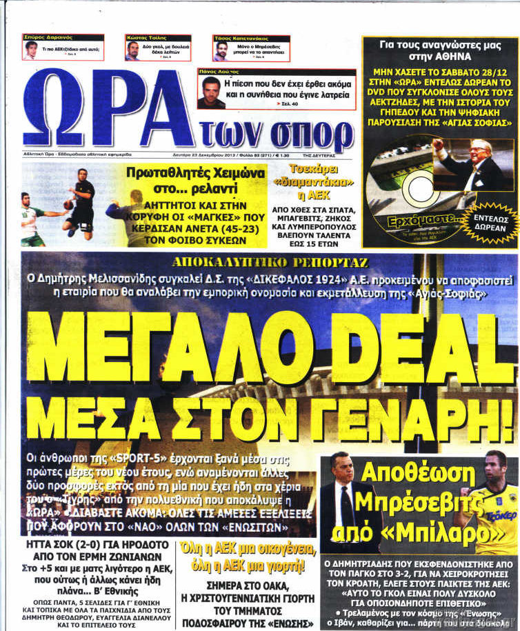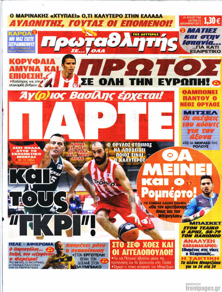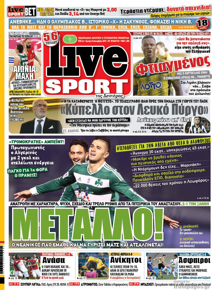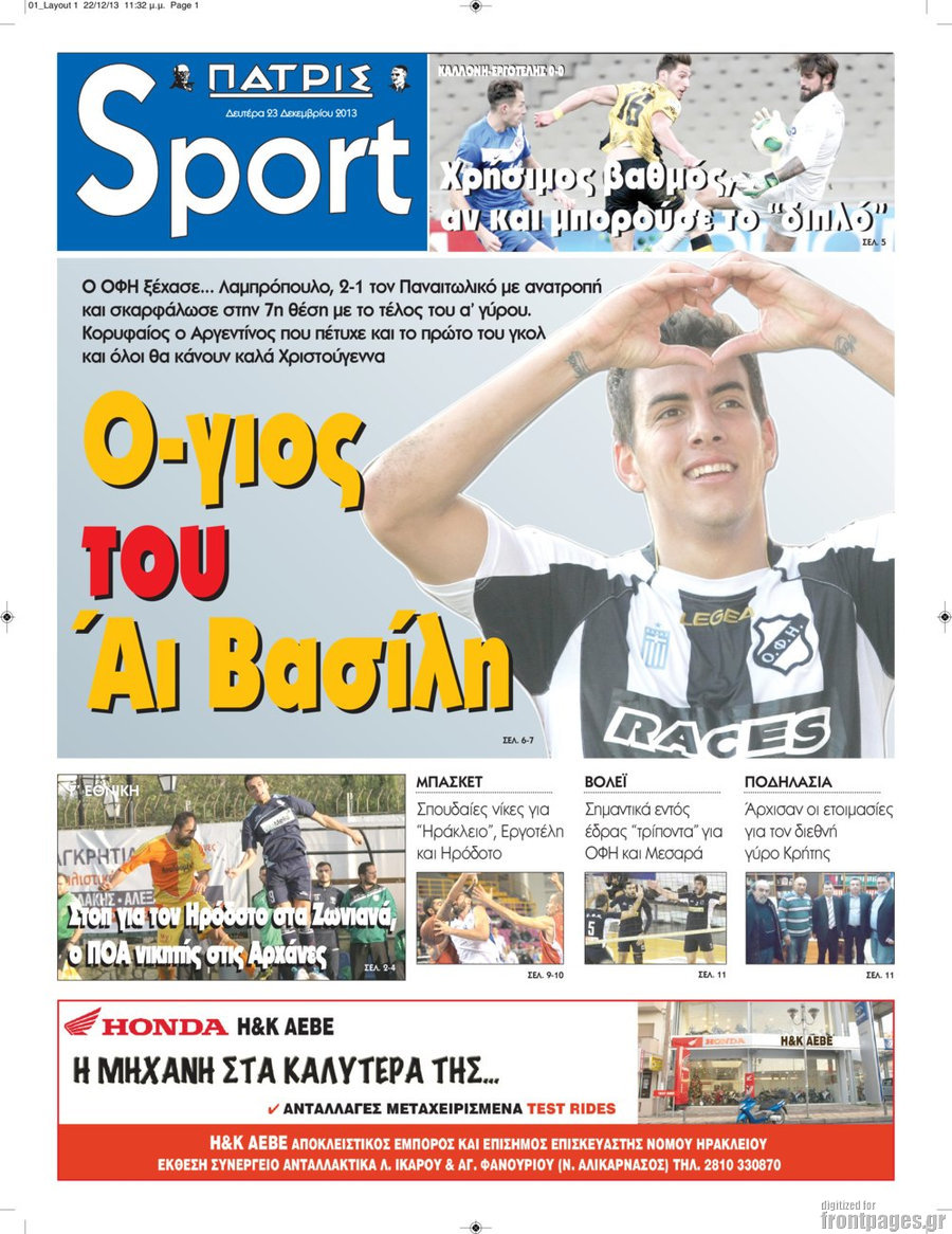Οι αθλητικές εφημερίδες Enikos Newsroom 08:40, Δευτέρα 23 Δεκεμβρίου 2013 Media Οι αθλητικές εφημερίδες ΑΘΛΗΤΙΚΕΣ ΕΦΗΜΕΡΙΔΕΣ Μοιράσου το: σχολίασε κι εσύ (0 σχόλια) Ακολουθήστε το enikos.gr στο Google News και μάθετε πρώτοι όλες τις ειδήσεις Δείτε όλες τις τελευταίες ειδήσεις από την Ελλάδα και τον Κόσμο στο enikos.gr Ειδήσεις Ροή Ειδήσεων 1 ώρα πριν Εκτός ευρωομάδας ΣΥΡΙΖΑ ο Νίκος Παππάς μετά την επίθεση στον δημοσιογράφο Νίκο Γιαννόπουλο – Η μήνυση και οι νέες δηλώσεις 2 ώρες πριν «Αγριεύουν» οι αγρότες: «Δεν συντρέχει λόγος συνάντησης με τον πρωθυπουργό» – Ώρα αποφάσεων στη σύσκεψη της Πέμπτης 2 ώρες πριν Κυψέλη: Χωρίς την οικογένειά της δίπλα της απολογήθηκε η 16χρονη – «Της είχε επιτεθεί κάποιος για να την βιάσει, φοβήθηκε και κυκλοφορούσε με μαχαίρι» 1 ώρα πριν Politico: Το πρόβλημα της Ευρώπης δεν είναι το Βέλγιο αλλά ο Ντόναλντ Τραμπ 3 ώρες πριν Αλεξανδρούπολη: Πολυοργανική ανεπάρκεια λόγω υποσιτισμού η αιτία θανάτου του 3χρονου αγοριού 2 ώρες πριν Μυστήριο με τεράστιες κυκλικές πέτρες 200 κιλών – Ανακαλύφθηκαν τυχαία κατά τη διάρκεια οδικών έργων και κανείς δεν ξέρει από πού προέρχονται 3 ώρες πριν Ύπνος: Ειδικός εξηγεί τον πραγματικό λόγο που ξυπνάτε στις 4 τα ξημερώματα – Ο ρόλος των ορμονών και του κιρκάδιου ρυθμού 4 ώρες πριν Αριθμολογία: Οι άνθρωποι που έχουν γεννηθεί αυτές τις 4 ημερομηνίες, είναι τρυφεροί και αγαπούν ανιδιοτελώς 15 ώρες πριν 20 χρόνια τα Χριστούγεννα ξεκινούν στα Public με μεγάλη ποικιλία σε δώρα! 6 λεπτά πριν Βέλγους πολιτικούς και επικεφαλής χρηματοπιστωτικών ιδρυμάτων στοχοποιεί η Μόσχα για τα κατασχεθέντα περιουσιακά στοιχεία 21 λεπτά πριν ΗΠΑ: Αναζητείται δεύτερος ύποπτος για την επίθεση στο πανεπιστήμιο Μπράουν 36 λεπτά πριν Λεωφόρος Αλεξάνδρας: Δεν εντοπίστηκε βόμβα έξω από το κολλέγιο – Προσήχθη άνδρας για το προειδοποιητικό σημείωμα 53 λεπτά πριν Ελένη Κρίτα για το reunion του «Παρά Πέντε»: «Ήταν πραγματικά σαν να μην είχαμε χαθεί ποτέ» 1 ώρα πριν Κύπελλο Ελλάδας: Αυτά είναι τα ζευγάρια στα νοκ-άουτ, οι διασταυρώσεις στους «8» κι ο δρόμος προς τον τελικό ENIKOS NETWORK Αϋπνία: Το κόλπο που θα σας βοηθήσει να κοιμηθείτε απόψε – Είναι απλό και έχει αποτέλεσμα 2,6 εκατομμύρια πολίτες έχουν ήδη εμβολιαστεί κατά της γρίπης ΕΛΣΤΑΤ: Τι δείχνουν τα νέα στοιχεία για τις ηλεκτρονικές παραγγελίες των επιχειρήσεων ΚΕΠΕ: Οι 3 διακριτές συμβολές των ΜμΕ και της μεταποίησης στην ελληνική οικονομία Χαρτογραφώντας το «σημείο χωρίς επιστροφή»: Για πρώτη φορά αποκαλύπτεται με λεπτομέρεια το ακανθώδες όριο της ατμόσφαιρας τ... Η Google καταργεί τη λειτουργία «dark web report» – Πώς θα μπορούν οι χρήστες να διαγράφουν τα δεδομένα τους περισσότερα 22:24 , Τετάρτη 17 Δεκεμβρίου 2025 Το Σπίτι Δίπλα Στο Ποτάμι: Σε κίνδυνο η υγεία του Απόστολου – Τι θα δούμε απόψε “Το Σπίτι Δίπλα στο Ποτάμι” ξετυλίγει το νήμα της ζωής των πέντε αδελφών με καταισ... 21:14 , Τετάρτη 17 Δεκεμβρίου 2025 Παιχνίδια Εκδίκησης: Θα καταφέρει ο Χρήστος να κλονίσει την εμπιστοσύνη της Μάγιας απέναντι στον Άγη; Τα «Παιχνίδια Εκδίκησης» έρχονται απόψε στις 22:30, στον Αντ1, με το τελευταίο επεισόδιο της χ... 20:57 , Τετάρτη 17 Δεκεμβρίου 2025 Άγιος Έρωτας: Η Χλόη καταθέτει εναντίον του πατέρα της και ο Χάρης αποκαλύπτει στον Κλεάνθη ότι δεν είναι ο βιολογικός του πατέρας. Γεμάτο αποκαλύψεις είναι το νέο επεισόδιο της σειράς “Άγιος Έρωτας” απόψε στις 21:... 20:15 , Τετάρτη 17 Δεκεμβρίου 2025 Η ανακοίνωση της ΕΣΗΕΑ για την επίθεση του Ευρω