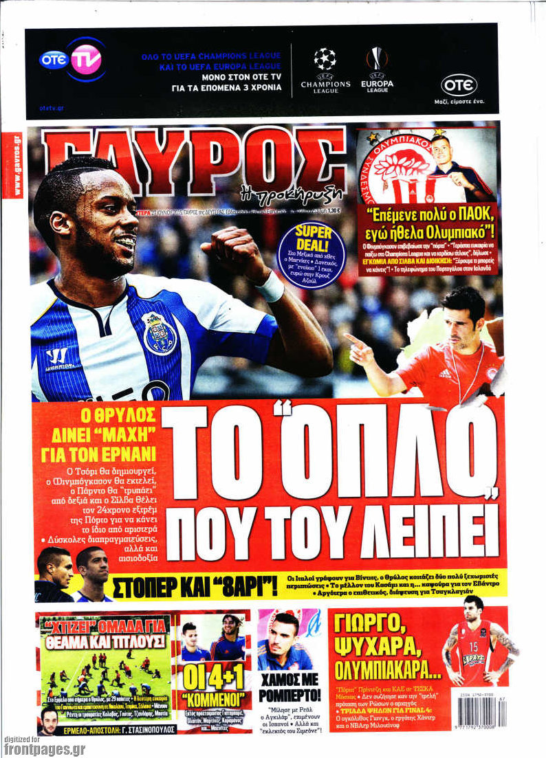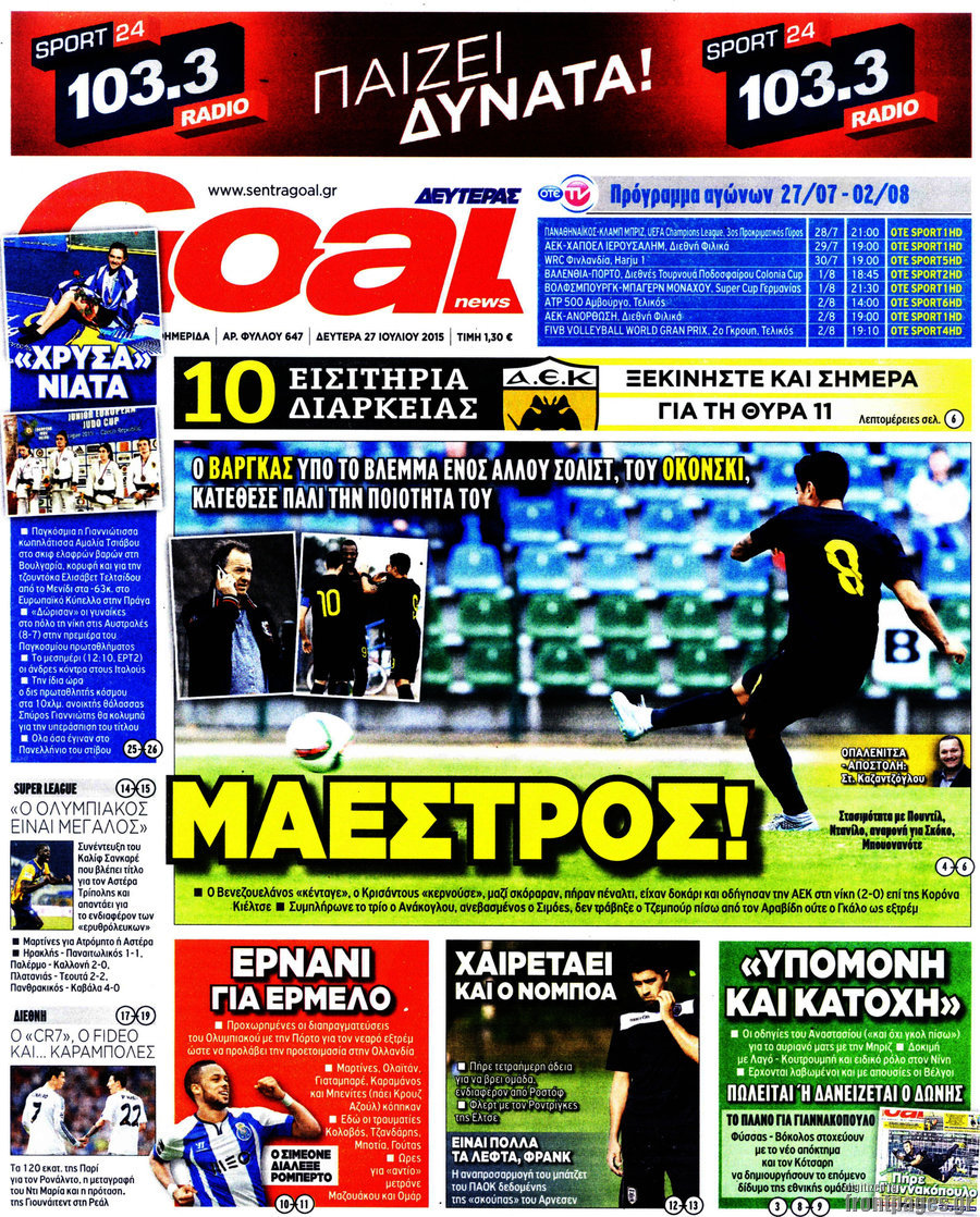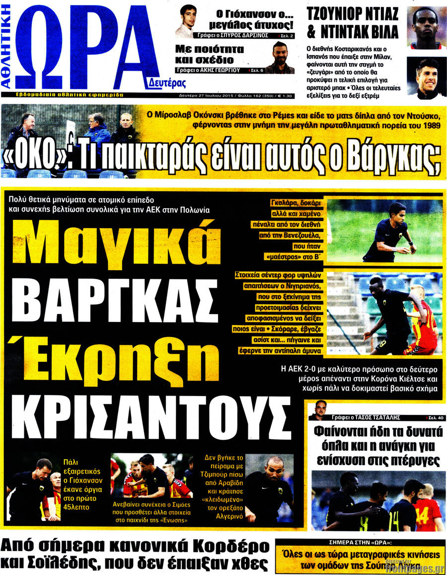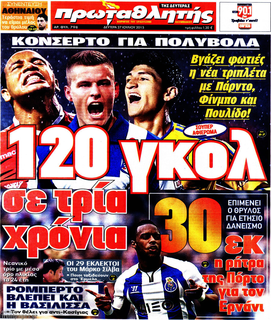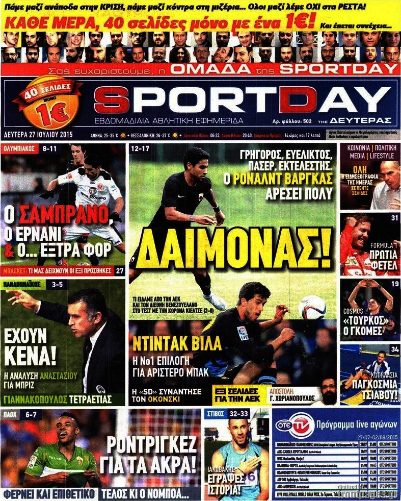 Οι αθλητικές εφημερίδες 27/7/2015 Enikos Newsroom 07:53, Δευτέρα 27 Ιουλίου 2015 Media Διαβάστε τα σημερινά πρωτοσέλιδα των αθλητικών εφημερίδων. ΑΘΛΗΤΙΚΕΣ ΕΦΗΜΕΡΙΔΕΣ ΕΦΗΜΕΡΙΔΕΣ ΠΡΩΤΟΣΕΛΙΔΑ Μοιράσου το: σχολίασε κι εσύ (0 σχόλια) Ακολουθήστε το enikos.gr στο Google News και μάθετε πρώτοι όλες τις ειδήσεις Δείτε όλες τις τελευταίες ειδήσεις από την Ελλάδα και τον Κόσμο στο enikos.gr Ειδήσεις Ροή Ειδήσεων 4 ώρες πριν Χριστούγεννα στα μπλόκα: Επιμένουν στις κινητοποιήσεις τους οι αγρότες – Ανοίγουν τα διόδια το Σαββατοκύριακο 5 ώρες πριν Ουκρανία: Η άνευ προηγουμένου επίθεση σε ρωσικό τάνκερ στη Μεσόγειο και το μήνυμα προς στον Πούτιν – Το «μακρύ χέρι» του Κιέβου 4 ώρες πριν Πούτιν: Τα μηνύματα σε Ευρώπη και ΝΑΤΟ από το μαραθώνιο «σόου» του – Η απαίτηση για «σεβασμό» και η ειρήνη «με τους όρους» της Μόσχας 5 ώρες πριν Τραμπ: Δεν αποκλείει την πιθανότητα ενός πολέμου στη Βενεζουέλα – «Ο Μαδούρο ξέρει καλύτερα από τον καθένα τι ακριβώς θέλω» 5 ώρες πριν Συνεχίζει να προκαλεί ο Μίτσκοσκι: «Για μένα το όνομα Μακεδονία είναι ιερό» 4 ώρες πριν Ανακαλύφθηκαν αρχαία χρυσά νομίσματα 2.200 ετών που απεικονίζουν τον θεό Απόλλωνα – Η άγνωστη σύνδεση με τον Φίλιππο Β΄ της Μακεδονίας 5 ώρες πριν Ύπνος: Μια κρυφή κατάσταση του εγκεφάλου πριν από τον ύπνο μπορεί να είναι το “κλειδί” για υψηλή ευφυΐα και δημιουργικότητα 6 ώρες πριν Αριθμολογία: Οι άνθρωποι που έχουν γεννηθεί αυτές τις 4 ημερομηνίες, συχνά παρεξηγούνται – «Η καλοσύνη τους κρύβει τεράστια δύναμη» 7 ώρες πριν Ξεχάστε το καθάρισμα το Σαββατοκύριακο: Ο «κανόνας των 20 λεπτών» που θα σας λύσει τα χέρια 23 λεπτά πριν Θεσσαλονίκη: Εξαφανίστηκε 13χρονος από χώρο φιλοξενίας ασυνόδευτων ανηλίκων στο Ωραιόκαστρο 33 λεπτά πριν Ντόναλντ Τραμπ: «Πολύ βαριά αντίποινα» στη Συρία – «Πλήττουμε πολύ δυνατά οχυρά του Ισλαμικού Κράτους» 48 λεπτά πριν Εξάρχεια: Ένταση με μολότοφ, χημικά και κρότου λάμψης 1 ώρα πριν ΗΠΑ: Τραγωδία στην Αλαμπάμα – Σκότωσε την δημοσιογράφο σύζυγό του και αυτοκτόνησε μπροστά στον 3χρονο γιο τους 1 ώρα πριν Πρόταση γάμου στο ΣΕΦ κατά την διάρκεια του αγώνα Ολυμπιακός-Βιλερμπάν – Δείτε βίντεο ENIKOS NETWORK Το ΕΚΑΒ τιμήθηκε από την Ακαδημία Αθηνών για τα 40 χρόνια προσφοράς του Έχετε πραγματικά μεγάλη καρδιά; 10 χαρακτηριστικά όσων έχουν καλοσύνη Αναστολή μέτρων αναγκαστικής εκτέλεσης για κτηνοτρόφους που πλήττονται από την ευλογιά των αιγοπροβάτων Πλήρης επάρκεια προϊόντων στις λαϊκές της Αττικής, παρά τις αγροτικές κινητοποιήσεις – Τι απαντούν οι πωλητές Χαρτογραφώντας το «σημείο χωρίς επιστροφή»: Για πρώτη φορά αποκαλύπτεται με λεπτομέρεια το ακανθώδες όριο της ατμόσφαιρας τ... Η Google καταργεί τη λειτουργία «dark web report» – Πώς θα μπορούν οι χρήστες να διαγράφουν τα δεδομένα τους περισσότερα 22:42 , Παρασκευή 19 Δεκεμβρίου 2025 Γιώργος Γιαννόπουλος για “Το σόι σου”: “Είναι ευτυχία και ευλογία αυτή η σειρά” «Είναι ευτυχία και ευλογία η συγκυρία αυτής της σειράς», θα πει ο Γιώργος Γιαννόπουλος -ο αγαπ... 20:37 , Παρασκευή 19 Δεκεμβρίου 2025 Don’t Forget The Lyrics: Η Έλλη Κοκκίνου υποδέχεται 4 παίκτες που θα κάνουν τα πάντα για να μη χάσουν ούτε… μισή λέξη από τους στίχους Το «Don’t Forget The Lyrics» επιστρέφει απόψε, Παρασκευή 19 Δεκεμβρίου, στις 21:00 με νέο επει... 19:31 , Παρασκευή 19 Δεκεμβρίου 2025 GNTM: Απόψε ο μεγάλος τελικός για τους 4 φιναλίστ Έπειτα από μήνες γεμάτους μόδα, δημιουργία και έντονες αναμετρήσεις, το GNTM 2025 κορυφώνεται,... 18:11 , Παρασκευή 19 Δεκεμβρί