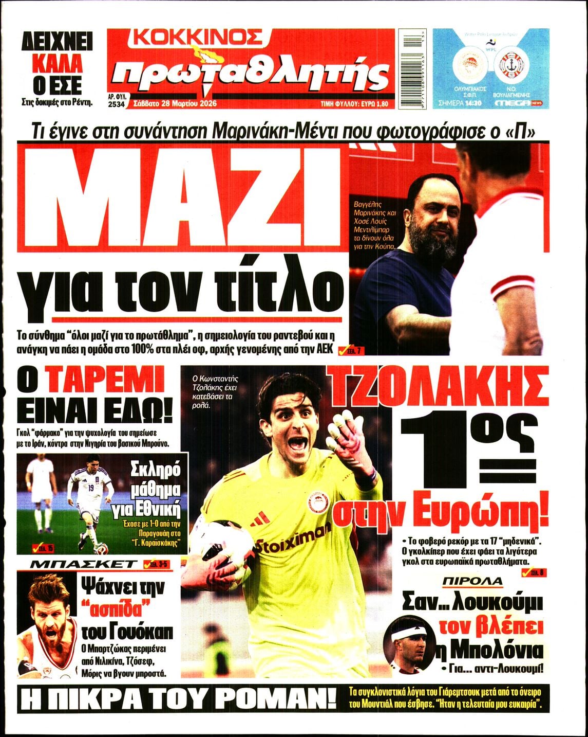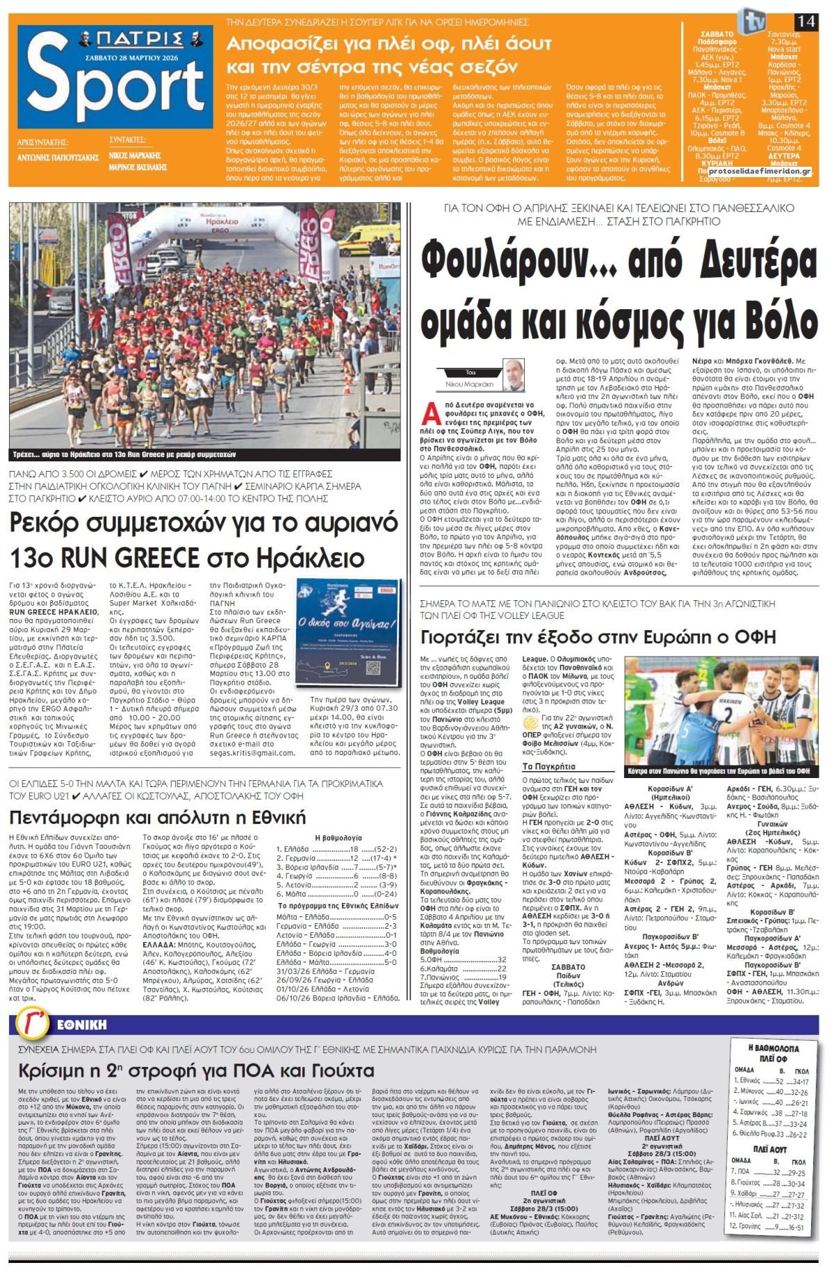 Οι αθλητικές εφημερίδες 28/3/2026 Γιωργος Λαμπρόπουλος 05:43, Σάββατο 28 Μαρτίου 2026 Media Διαβάστε τα πρωτοσέλιδα από τις αθλητικές εφημερίδες, σήμερα 28/3/2026. ΑΘΛΗΤΙΚΕΣ ΕΦΗΜΕΡΙΔΕΣ ΕΦΗΜΕΡΙΔΕΣ ΠΡΩΤΟΣΕΛΙΔΑ Μοιράσου το: Euroleague: Μία νίκη μακριά από την τετράδα ο Παναθηναϊκός – Δείτε τα αποτελέσματα και τη βαθμολογία Ιβάν Γιοβάνοβιτς: «Ήμασταν αργοί στη μεταφορά και αρκετά μονότονοι» Εργκίν Αταμάν: «Κάθε παιχνίδι είναι τελικός για εμάς» – Συγκεντρωμένοι για τη νίκη στο «δύσκολο» επερχόμενο ντέρμπι σχολίασε κι εσύ (0 σχόλια) Ακολουθήστε το Enikos στο Google News και μάθετε πρώτοι όλες τις ειδήσεις Δείτε όλες τις τελευταίες ειδήσεις από την Ελλάδα και τον Κόσμο στο enikos.gr Ειδήσεις Ροή Ειδήσεων 12 λεπτά πριν LIVE – 29η ημέρα πολέμου ΗΠΑ – Ισραήλ με Ιράν – Οι εξελίξεις στη Μέση Ανατολή 50 λεπτά πριν Eπίθεση με βαλλιστικούς πυραύλους στο νότιο Ισραήλ από την Υεμένη πιθανότατα από τους Χούθι 9 ώρες πριν Πάτρα: Αρνείται να μιλήσει η μητέρα του βρέφους που νοσηλεύεται με κατάγματα και εγκαύματα – «Κλειδί» το πόρισμα του ιατροδικαστή 8 ώρες πριν Νεκρός κρατούμενος στο Α.Τ. Ομόνοιας, τι αναφέρει η Αστυνομία 10 ώρες πριν 4ο Συνέδριο ΠΑΣΟΚ – Ανδρουλάκης: «Έφτασε η ώρα για μια νέα πολιτική αλλαγή – Δεν υπάρχει σενάριο συνεργασίας με τη ΝΔ» 1 ώρα πριν Οπτική ψευδαίσθηση: Μόνο όσοι έχουν τέλεια όραση μπορούν να εντοπίσουν τη γάτα μέσα σε 13 δευτερόλεπτα 1 ώρα πριν Κρασί vs μπύρα: Τι δείχνει νέα μελέτη για την υγεία της καρδιάς και τη μακροζωία 4 ώρες πριν Ζώδια 28/3: Ημερήσιες προβλέψεις – Υδροχόοι, προσέξτε τι θα πείτε και πώς θα το πείτε 8 ώρες πριν Η άγνωστη μονομάχος που πάλευε με θηρία στην αρχαιότητα – Ένα ξεχασμένο ψηφιδωτό αποκάλυψε κάτι μοναδικό 9 λεπτά πριν Οι αθλητικές μεταδόσεις του Σαββάτου (28/3) 12 λεπτά πριν LIVE – 29η ημέρα πολέμου ΗΠΑ – Ισραήλ με Ιράν – Οι εξελίξεις στη Μέση Ανατολή 24 λεπτά πριν Διεθνής Υπηρεσία Ατομικής Ενέργειας: «Βαθιά ανησυχία» για την 3η επίθεση σε 10 μέρες σε ιρανικό πυρηνικό σταθμό 43 λεπτά πριν ΔΕΔΔΗΕ: Διακοπές ρεύματος σήμερα (28/3) στην Αθήνα και σε άλλες 8 περιοχές της Αττικής 50 λεπτά πριν Eπίθεση με βαλλιστικούς πυραύλους στο νότιο Ισραήλ από την Υεμένη πιθανότατα από τους Χούθι ENIKOS NETWORK Φυτά: Το δοκιμασμένο κόλπο με το καλσόν που τα προστατεύει από το σπάσιμο και τον αέρα – Πώς να το εφαρμόσετε Το όσπριο των κινέζικων φεστιβάλ που μπορεί να ρυθμίσει το σάκχαρο και να έχει αντιφλεγμονώδη δράση ΕΛΕΤΑΕΝ: Τι δείχνουν τα νέα στοιχεία για την ανάπτυξη της αιολικής ενέργειας στην Ευρώπη «Νταντάδες της Γειτονιάς»: Νέες πληροφορίες για το πρόγραμμα – Τι είπε η Μιχαηλίδου για την Κοινωνική Αντιπαροχή και τους Κ... Jessica Adams: Πρόβλεψη σοκ από τη γνωστή αστρολόγο – Ο παγκόσμιος χάρτης θα ξαναγραφτεί το 2026 Τεστ παρατηρητικότητας: Μπορείτε να βρείτε τις 3 διαφορές στις εικόνες με ένα κοάλα σε 13 δευτερόλεπτα περισσότερα 07:09 , Σάββατο 28 Μαρτίου 2026 Οι αθλητικές μεταδόσεις του Σαββάτου (28/3) Ματς ποδοσφαίρου, μπάσκετ, βόλεϊ και πόλο περιλαμβάνει το πρόγραμμα με τις αθλητικές μεταδόσει... 05:48 , Σάββατο 28 Μαρτίου 2026 Οι οικονομικές εφημερίδες 28/3/2026 Διαβάστε τα πρωτοσέλιδα από τις οικονομικές εφημερίδες, σήμερα 28/3/2026. 05:38 , Σάββατο 28 Μαρτίου 2026 Οι πολιτικές εφημερίδες 28/3/2026 Διαβάστε τα πρωτοσέλιδα από τις πολιτικές εφημερίδες, σήμερα 28/3/2026. 17:50 , Παρασκευή 27 Μαρτίου 2026 Μάνος Νιφλής: «Καμία συζήτηση για την επόμενη τηλεοπτική σεζόν – Συνεχίζουμε με τον Γιάννη στο OPEN» Για τη φετινή 