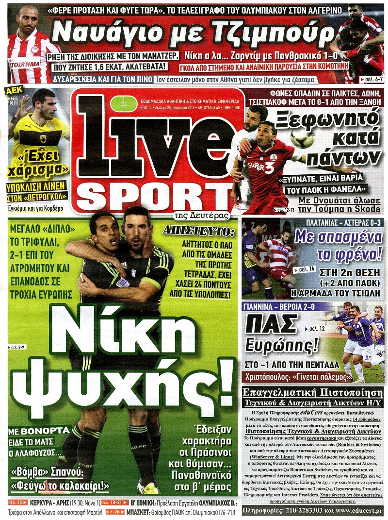 Οι αθλητικές εφημερίδες Enikos Newsroom 08:44, Δευτέρα 28 Ιανουαρίου 2013 Media Οι αθλητικές εφημερίδες ΑΘΛΗΤΙΚΑ ΑΘΛΗΤΙΚΕΣ ΕΦΗΜΕΡΙΔΕΣ ΕΦΗΜΕΡΙΔΕΣ ΠΡΩΤΟΣΕΛΙΔΑ ΠΡΩΤΟΣΕΛΙΔΑ Μοιράσου το: σχολίασε κι εσύ (0 σχόλια) Ακολουθήστε το enikos.gr στο Google News και μάθετε πρώτοι όλες τις ειδήσεις Δείτε όλες τις τελευταίες ειδήσεις από την Ελλάδα και τον Κόσμο στο enikos.gr Ειδήσεις Ροή Ειδήσεων 1 ώρα πριν Ενοίκια: Ποια προγράμματα θα «τρέξουν» για να ανοίξουν τα κλειστά ακίνητα – Όλες οι νέες πληροφορίες 1 ώρα πριν Ίμια 30 χρόνια μετά: «Ο βοσκός πήγαινε και στις δύο βραχονησίδες έως το 2004 – Μετά του έκοψαν τα λεφτά» 50 λεπτά πριν Τραγωδία στη Ρουμανία: Σήμερα και αύριο το τελευταίο «αντίο» στους επτά οπαδούς του ΠΑΟΚ 10 λεπτά πριν Αλέξης Τσίπρας: Συγκροτεί ομάδα και κείμενο για τη σύγκλιση των προοδευτικών δυνάμεων 28 λεπτά πριν Ουκρανικό: Τα ανοιχτά μέτωπα Κιέβου – Μόσχας πριν από τις νέες συνομιλίες στο Αμπού Ντάμπι – Η τακτική «φθοράς» της Ρωσίας 3 ώρες πριν Οπτική ψευδαίσθηση: Μόνο όσοι έχουν τέλεια όραση μπορούν να εντοπίσουν τη 2η γάτα μέσα σε 13 δευτερόλεπτα 3 ώρες πριν Άνοια: Η τροφή που συνδέεται με μειωμένο κίνδυνο και καλύτερη υγεία του εγκεφάλου 6 ώρες πριν Τα ζώδια σήμερα, Παρασκευή 30 Ιανουαρίου 2026: Καρκίνοι, ακούστε το ένστικτό σας και όχι τον φόβο σας 41 λεπτά πριν Ναός μπορεί να αναδύθηκε από το νερό όπως περιγράφει η μυθολογία – Τα στοιχεία της νέας μελέτης 13 λεπτά πριν Στο real taste & style που κυκλοφορεί με τη Realnews 5 λεπτά πριν «Βιολάντα»: Σήμερα οι κηδείες της Βασιλικής Σκαμπαρδώνη και της Ελένης Κατσαρού 10 λεπτά πριν Αλέξης Τσίπρας: Συγκροτεί ομάδα και κείμενο για τη σύγκλιση των προοδευτικών δυνάμεων 11 λεπτά πριν Βασίλειος Τζίγκος: Πέθανε ο δήμαρχος Φιλιατών 17 λεπτά πριν Συνταγή για να μαγειρεύετε εύκολα και άψογα το λευκό ρύζι ENIKOS NETWORK Ο καρκίνος μπορεί να προστατεύσει από το Αλτσχάιμερ; Το παράδοξο συμπέρασμα μελέτης Το κόλπο για να μην πιάσουν μύκητες τα φυτά σας – Είναι εύκολο και αποτελεσματικό Ενοίκια: Ποια προγράμματα θα «τρέξουν» για να ανοίξουν τα κλειστά ακίνητα – Όλες οι νέες πληροφορίες Μυτιληναίος: Προειδοποιεί για τις επιπτώσεις από την άνοδο του ευρώ Google Search: Αναβαθμίζει τις δυνατότητες AI με Gemini 3 και Follow-up ερωτήσεις Κουίζ: Πόσο καλός είσαι στην ελληνική μυθολογία; Δοκίμασε τις γνώσεις σου και κάνε το 3 στα 3 περισσότερα 07:00 , Παρασκευή 30 Ιανουαρίου 2026 Την Κυριακή με τη Realnews: Ό,τι και αν αγοράσεις, σκανάρεις και κερδίζεις! Την Κυριακή με τη Realnews: Ό,τι και αν αγοράσεις, σκανάρεις και κερδίζεις! Με το PADU app, το... 05:48 , Παρασκευή 30 Ιανουαρίου 2026 Οι οικονομικές εφημερίδες 30/1/2026 Διαβάστε τα πρωτοσέλιδα από τις οικονομικές εφημερίδες, σήμερα 30/1/2026. 22:52 , Πέμπτη 29 Ιανουαρίου 2026 Ζελένσκι: Αναμένουμε από τη Ρωσία να σταματήσει τους βομβαρδισμούς για μία εβδομάδα, όπως συμφώνησε Ο Βολοντίμιρ Ζελένσκι δήλωσε απόψε ότι αναμένει την εφαρμογή της συμφωνίας, εκ μέρους της Ρωσί... 18:58 , Πέμπτη 29 Ιανουαρίου 2026 Το σόι σου: Ο Μιχάλης ένα βήμα πριν παρατήσει τον Χαμπέα, απόψε στις 21:00 Ένα ακόμη απολαυστικό επεισόδιο της σειράς “Το σόι σου” έρχεται απόψε στις 21:00 σ... ΤΕΛΕΥΤΑΙΕΣ ΕΙΔΗΣΕΙΣ 5 λεπτά πριν «Βιολάντα»: Σήμερα οι κηδείες της Βασιλικής... 10 λεπτά πριν Αλέξης Τσίπρας: Συγκροτεί ομάδα και κείμενο για τη... 11 λεπτά πριν Βασίλειος Τζίγκος: Πέθανε ο δήμαρχος Φιλιατών 17 λεπτά πριν Συνταγή για να μαγειρεύετε εύκολα και άψογα το λευκό... 23 λεπτά πριν «Βιολάντα»: Στο μικροσκόπιο όλες οι άδειε