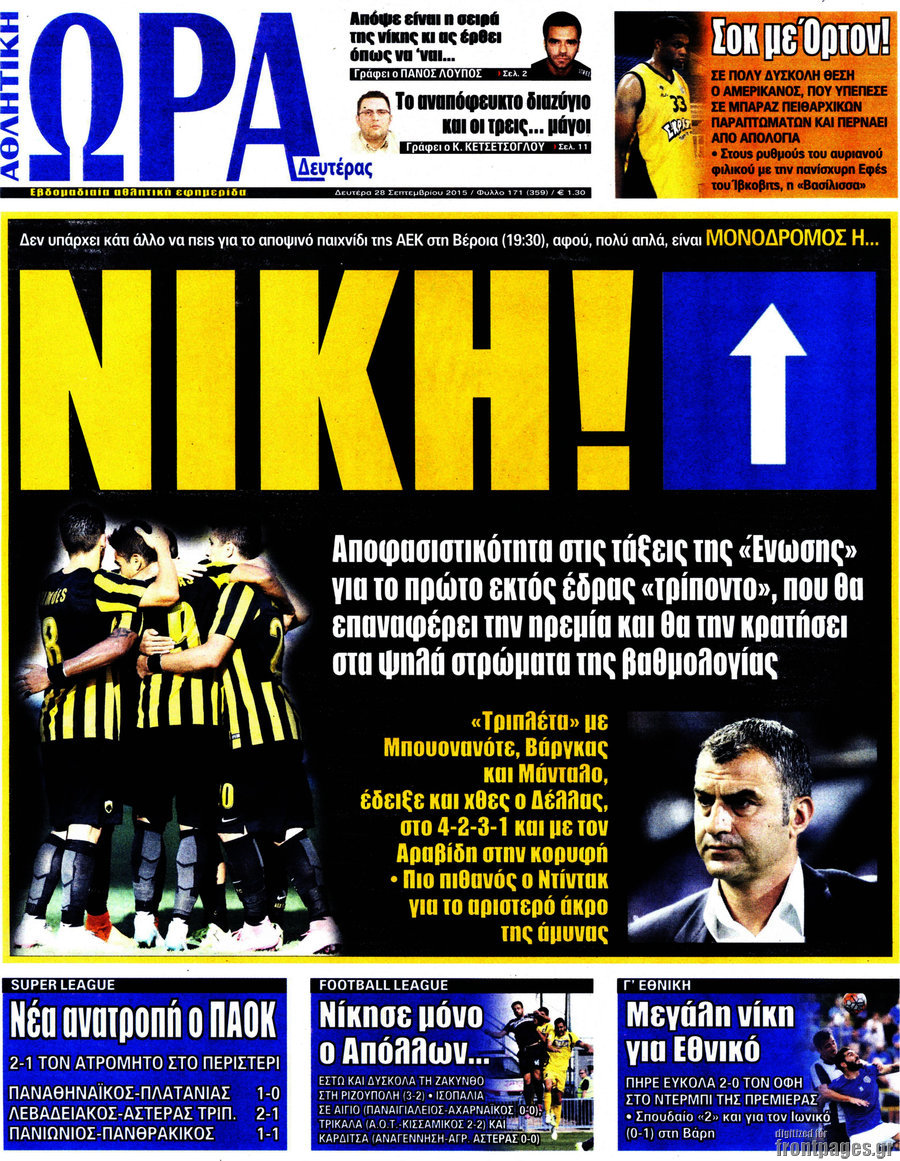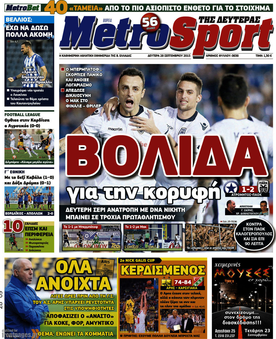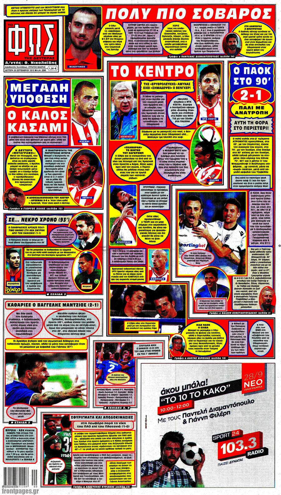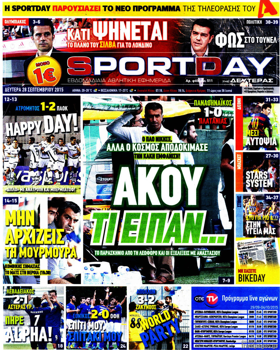 Οι αθλητικές εφημερίδες 28/9/2015 Enikos Newsroom 08:26, Δευτέρα 28 Σεπτεμβρίου 2015 Media Διαβάστε τα σημερινά πρωτοσέλιδα των αθλητικών εφημερίδων: ΑΘΛΗΤΙΚΕΣ ΕΦΗΜΕΡΙΔΕΣ ΠΡΩΤΟΣΕΛΙΔΑ Μοιράσου το: σχολίασε κι εσύ (0 σχόλια) Ακολουθήστε το enikos.gr στο Google News και μάθετε πρώτοι όλες τις ειδήσεις Δείτε όλες τις τελευταίες ειδήσεις από την Ελλάδα και τον Κόσμο στο enikos.gr Ειδήσεις Ροή Ειδήσεων 22 λεπτά πριν Υπόθεση Έπσταϊν: Το Υπουργείο Δικαιοσύνης δημοσιοποίησε μια σειρά από εξαιρετικά επεξεργασμένα αρχεία – «Λείπουν τα πιο σημαντικά έγγραφα», λένε οι Δημοκρατικοί 2 ώρες πριν Σαρωτικοί οι έλεγχοι στους δρόμους ενόψει εορτών – Μπλόκα της τροχαίας σε κεντρικές αρτηρίες της Αττικής 33 λεπτά πριν ΟΝΕΧ – MEGATUGS: Ξεκίνησε η ναυπήγηση ρυμουλκών στην Ελλάδα – Προθάλαμος πολεμικών πλοίων – Δείτε φωτογραφίες και βίντεο 10 ώρες πριν Χριστούγεννα στα μπλόκα: Επιμένουν στις κινητοποιήσεις τους οι αγρότες – Ανοίγουν τα διόδια το Σαββατοκύριακο 9 ώρες πριν Πούτιν: Τα μηνύματα σε Ευρώπη και ΝΑΤΟ από το μαραθώνιο «σόου» του – Η απαίτηση για «σεβασμό» και η ειρήνη «με τους όρους» της Μόσχας 2 ώρες πριν Αυγά: Πόσα μπορείτε να τρώτε την ημέρα με ασφάλεια για μέγιστη πρόσληψη πρωτεΐνης 3 ώρες πριν Τα ζώδια σήμερα, Σάββατο 20 Δεκεμβρίου: Παρθένοι, το σύμπαν σας δίνει το κλειδί 9 ώρες πριν Ανακαλύφθηκαν αρχαία χρυσά νομίσματα 2.200 ετών που απεικονίζουν τον θεό Απόλλωνα – Η άγνωστη σύνδεση με τον Φίλιππο Β΄ της Μακεδονίας 2 ώρες πριν Οπτική ψευδαίσθηση: Μόνο αν είσαι ο Σέρλοκ Χολμς θα βρεις τον αριθμό «87» σε 7 δευτερόλεπτα 2 λεπτά πριν Αρχαιολόγοι ανακάλυψαν σε χωράφι απεικόνιση 600 ετών ενός Αγίου – Τα στοιχεία που δείχνουν ότι μαρτύρησε 10 λεπτά πριν Mega χριστουγεννιάτικη φορολοταρία: «Κλείδωσε» η ημερομηνία για την κλήρωση – Ερωτήσεις και απαντήσεις 17 λεπτά πριν ΗΠΑ: Τέσσερις μετανάστες πέθαναν σε κέντρα κράτησης – Αύξηση θανάτων σε επίπεδο ρεκόρ το 2025 22 λεπτά πριν Υπόθεση Έπσταϊν: Το Υπουργείο Δικαιοσύνης δημοσιοποίησε μια σειρά από εξαιρετικά επεξεργασμένα αρχεία – «Λείπουν τα πιο σημαντικά έγγραφα», λένε οι Δημοκρατικοί 25 λεπτά πριν Καιρός: Αλλαγή σκηνικού σήμερα με βροχές και πτώση της θερμοκρασίας – Οι προβλέψεις των μετεωρολόγων για τα Χριστούγεννα ENIKOS NETWORK Το τεστ των 10 δευτερολέπτων που μπορεί να προβλέψει το προσδόκιμο ζωής σας – Τι λέει ειδικός του Cleveland Επιλέξτε καρέκλα για να μάθετε ποια είναι τα κρυφά χαρακτηριστικά σας – Τι αποκάλυψε για εσάς αυτό το τεστ προσωπικότητας; Mega χριστουγεννιάτικη φορολοταρία: «Κλείδωσε» η ημερομηνία για την κλήρωση – Ερωτήσεις και απαντήσεις Αναστολή μέτρων αναγκαστικής εκτέλεσης για κτηνοτρόφους που πλήττονται από την ευλογιά των αιγοπροβάτων Χαρτογραφώντας το «σημείο χωρίς επιστροφή»: Για πρώτη φορά αποκαλύπτεται με λεπτομέρεια το ακανθώδες όριο της ατμόσφαιρας τ... Η Google καταργεί τη λειτουργία «dark web report» – Πώς θα μπορούν οι χρήστες να διαγράφουν τα δεδομένα τους περισσότερα 05:48 , Σάββατο 20 Δεκεμβρίου 2025 Οι οικονομικές εφημερίδες 20/12/2025 Διαβάστε τα πρωτοσέλιδα από τις οικονομικές εφημερίδες, σήμερα 20/12/2025. 05:43 , Σάββατο 20 Δεκεμβρίου 2025 Οι αθλητικές εφημερίδες 20/12/2025 Διαβάστε τα πρωτοσέλιδα από τις αθλητικές εφημερίδες, σήμερα 20/12/2025. 05:38 , Σάββατο 20 Δεκεμβρίου 2025 Οι πολιτικές εφημερίδες 20/12/2025 Διαβάστε τα πρωτοσέλιδα από τις πολιτικές εφημερίδες, σήμερα 20/12/2025. 04:20 , Σάββατο 20 Δεκεμβρίου 2025 Αγγελική Νικολούλη: Τα συλλυπητήρια για την απ