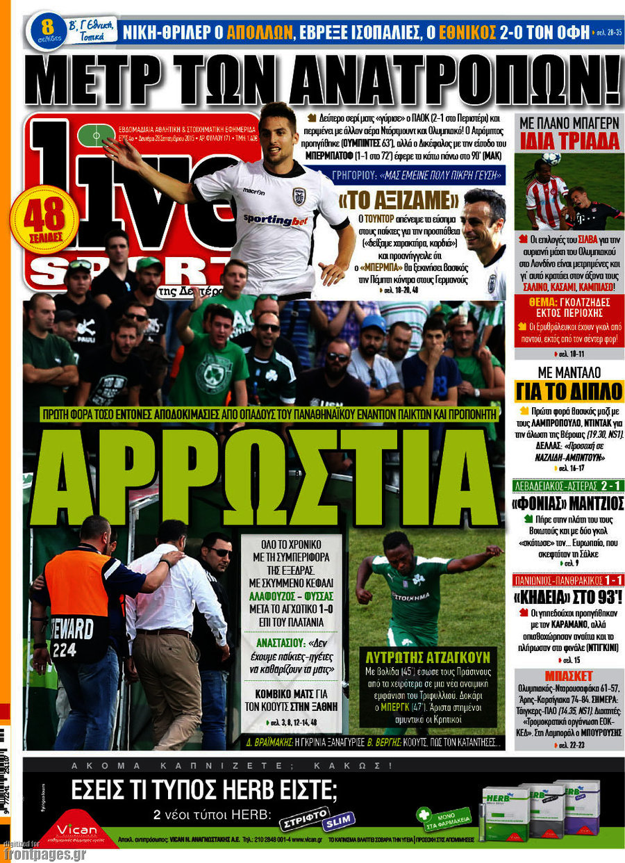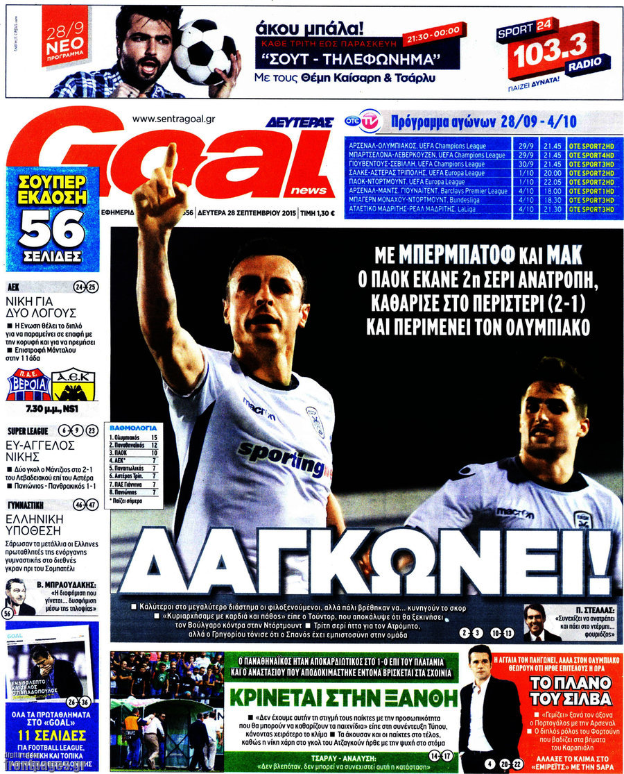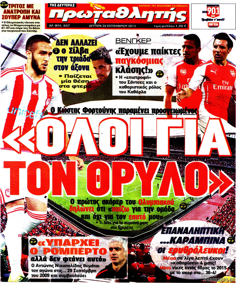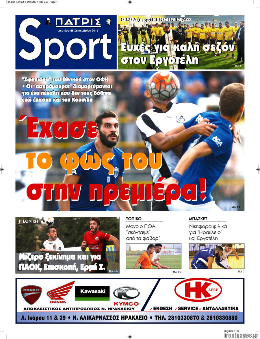 Οι αθλητικές εφημερίδες 28/9/2015 Enikos Newsroom 08:26, Δευτέρα 28 Σεπτεμβρίου 2015 Media Διαβάστε τα σημερινά πρωτοσέλιδα των αθλητικών εφημερίδων: ΑΘΛΗΤΙΚΕΣ ΕΦΗΜΕΡΙΔΕΣ ΠΡΩΤΟΣΕΛΙΔΑ Μοιράσου το: σχολίασε κι εσύ (0 σχόλια) Ακολουθήστε το enikos.gr στο Google News και μάθετε πρώτοι όλες τις ειδήσεις Δείτε όλες τις τελευταίες ειδήσεις από την Ελλάδα και τον Κόσμο στο enikos.gr Ειδήσεις Ροή Ειδήσεων 22 λεπτά πριν Υπόθεση Έπσταϊν: Το Υπουργείο Δικαιοσύνης δημοσιοποίησε μια σειρά από εξαιρετικά επεξεργασμένα αρχεία – «Λείπουν τα πιο σημαντικά έγγραφα», λένε οι Δημοκρατικοί 2 ώρες πριν Σαρωτικοί οι έλεγχοι στους δρόμους ενόψει εορτών – Μπλόκα της τροχαίας σε κεντρικές αρτηρίες της Αττικής 33 λεπτά πριν ΟΝΕΧ – MEGATUGS: Ξεκίνησε η ναυπήγηση ρυμουλκών στην Ελλάδα – Προθάλαμος πολεμικών πλοίων – Δείτε φωτογραφίες και βίντεο 10 ώρες πριν Χριστούγεννα στα μπλόκα: Επιμένουν στις κινητοποιήσεις τους οι αγρότες – Ανοίγουν τα διόδια το Σαββατοκύριακο 9 ώρες πριν Πούτιν: Τα μηνύματα σε Ευρώπη και ΝΑΤΟ από το μαραθώνιο «σόου» του – Η απαίτηση για «σεβασμό» και η ειρήνη «με τους όρους» της Μόσχας 2 ώρες πριν Αυγά: Πόσα μπορείτε να τρώτε την ημέρα με ασφάλεια για μέγιστη πρόσληψη πρωτεΐνης 3 ώρες πριν Τα ζώδια σήμερα, Σάββατο 20 Δεκεμβρίου: Παρθένοι, το σύμπαν σας δίνει το κλειδί 9 ώρες πριν Ανακαλύφθηκαν αρχαία χρυσά νομίσματα 2.200 ετών που απεικονίζουν τον θεό Απόλλωνα – Η άγνωστη σύνδεση με τον Φίλιππο Β΄ της Μακεδονίας 2 ώρες πριν Οπτική ψευδαίσθηση: Μόνο αν είσαι ο Σέρλοκ Χολμς θα βρεις τον αριθμό «87» σε 7 δευτερόλεπτα 2 λεπτά πριν Αρχαιολόγοι ανακάλυψαν σε χωράφι απεικόνιση 600 ετών ενός Αγίου – Τα στοιχεία που δείχνουν ότι μαρτύρησε 10 λεπτά πριν Mega χριστουγεννιάτικη φορολοταρία: «Κλείδωσε» η ημερομηνία για την κλήρωση – Ερωτήσεις και απαντήσεις 17 λεπτά πριν ΗΠΑ: Τέσσερις μετανάστες πέθαναν σε κέντρα κράτησης – Αύξηση θανάτων σε επίπεδο ρεκόρ το 2025 22 λεπτά πριν Υπόθεση Έπσταϊν: Το Υπουργείο Δικαιοσύνης δημοσιοποίησε μια σειρά από εξαιρετικά επεξεργασμένα αρχεία – «Λείπουν τα πιο σημαντικά έγγραφα», λένε οι Δημοκρατικοί 25 λεπτά πριν Καιρός: Αλλαγή σκηνικού σήμερα με βροχές και πτώση της θερμοκρασίας – Οι προβλέψεις των μετεωρολόγων για τα Χριστούγεννα ENIKOS NETWORK Το τεστ των 10 δευτερολέπτων που μπορεί να προβλέψει το προσδόκιμο ζωής σας – Τι λέει ειδικός του Cleveland Επιλέξτε καρέκλα για να μάθετε ποια είναι τα κρυφά χαρακτηριστικά σας – Τι αποκάλυψε για εσάς αυτό το τεστ προσωπικότητας; Mega χριστουγεννιάτικη φορολοταρία: «Κλείδωσε» η ημερομηνία για την κλήρωση – Ερωτήσεις και απαντήσεις Αναστολή μέτρων αναγκαστικής εκτέλεσης για κτηνοτρόφους που πλήττονται από την ευλογιά των αιγοπροβάτων Χαρτογραφώντας το «σημείο χωρίς επιστροφή»: Για πρώτη φορά αποκαλύπτεται με λεπτομέρεια το ακανθώδες όριο της ατμόσφαιρας τ... Η Google καταργεί τη λειτουργία «dark web report» – Πώς θα μπορούν οι χρήστες να διαγράφουν τα δεδομένα τους περισσότερα 05:48 , Σάββατο 20 Δεκεμβρίου 2025 Οι οικονομικές εφημερίδες 20/12/2025 Διαβάστε τα πρωτοσέλιδα από τις οικονομικές εφημερίδες, σήμερα 20/12/2025. 05:43 , Σάββατο 20 Δεκεμβρίου 2025 Οι αθλητικές εφημερίδες 20/12/2025 Διαβάστε τα πρωτοσέλιδα από τις αθλητικές εφημερίδες, σήμερα 20/12/2025. 05:38 , Σάββατο 20 Δεκεμβρίου 2025 Οι πολιτικές εφημερίδες 20/12/2025 Διαβάστε τα πρωτοσέλιδα από τις πολιτικές εφημερίδες, σήμερα 20/12/2025. 04:20 , Σάββατο 20 Δεκεμβρίου 2025 Αγγελική Νικολούλη: Τα συλλυπητήρια για την απ