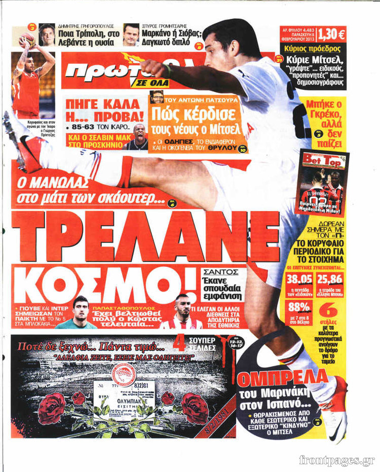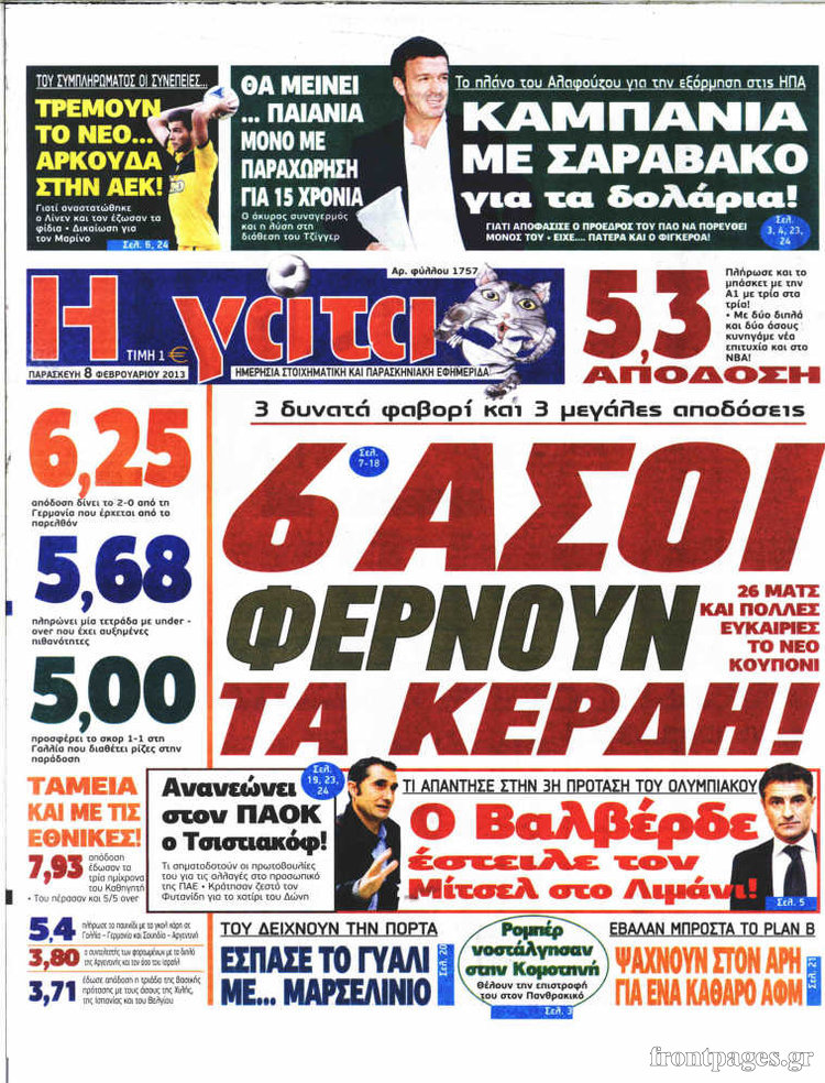 Οι αθλητικές εφημερίδες Enikos Newsroom 09:23, Παρασκευή 08 Φεβρουαρίου 2013 Media Οι αθλητικές εφημερίδες Τα πρωτοσέλιδα των αθλητικών εφημερίδων. ΑΘΛΗΤΙΚΑ ΑΘΛΗΤΙΚΕΣ ΕΦΗΜΕΡΙΔΕΣ ΠΡΩΤΟΣΕΛΙΔΑ Μοιράσου το: σχολίασε κι εσύ (0 σχόλια) Ακολουθήστε το enikos.gr στο Google News και μάθετε πρώτοι όλες τις ειδήσεις Δείτε όλες τις τελευταίες ειδήσεις από την Ελλάδα και τον Κόσμο στο enikos.gr Ειδήσεις Ροή Ειδήσεων 32 λεπτά πριν Νίκος Παππάς: Το παρασκήνιο της αποπομπής του – Οι μπουνιές, τα μηνύματα μετά την επίθεση και η διαγραφή από τον ΣΥΡΙΖΑ 2 ώρες πριν Φοροδιαφυγή: Ποιοι φορολογούμενοι κινδυνεύουν να πληρώσουν «τσουχτερά» πρόστιμα 58 λεπτά πριν Φοινικούντα: Παραδόθηκε 30χρονος στην Καλαμάτα για τη διπλή δολοφονία 1 ώρα πριν Αγρότες: Ανυποχώρητοι στα μπλόκα – Στις Σέρρες σήμερα η κρίσιμη συνεδρίαση της Πανελλαδικής Επιτροπής 1 ώρα πριν Τα επίσημα χρονοδιαγράμματα που η Τουρκία θα παραλάβει τα Eurofighter 3 ώρες πριν Καούρα: Το μπαχαρικό που είναι «εξίσου αποτελεσματικό» με την ομεπραζόλη, σύμφωνα με ειδικούς 3 ώρες πριν Τα ζώδια σήμερα, Πέμπτη 18 Δεκεμβρίου: Λέοντες, η καρδιά σας θέλει να εκφραστεί 3 ώρες πριν Οπτική ψευδαίσθηση: Μόνο οι πιο έξυπνοι άνθρωποι θα βρουν 7 ξωτικά 15 δευτερόλεπτα 24 ώρες πριν 20 χρόνια τα Χριστούγεννα ξεκινούν στα Public με μεγάλη ποικιλία σε δώρα! 4 λεπτά πριν Άστατος ο καιρός τα Χριστούγεννα: Βαρομετρικό χαμηλό από τον κόλπο της Σύρτης «ξεκλειδώνει» κακοκαιρίες – Πώς θα εξελιχθεί έως την Πρωτοχρονιά 7 λεπτά πριν Γρίπη: Η υπουργός Υγείας της Γαλλίας καλεί τους πολίτες να ξαναφορέσουν τις μάσκες τους 16 λεπτά πριν Μαρία Αλιφέρη: «Καλή σου ξεκούραση ακριβέ μου φίλε και αδελφέ» – Η συγκινητική ανάρτηση για τον Αλμπέρτο Εσκενάζυ 20 λεπτά πριν Οφειλές προς το Δημόσιο: Τι απαντά το υπουργείο στα σενάρια για νέα ρύθμιση 25 λεπτά πριν Συνταγή του Gordon Ramsay για σπιτικές πατάτες φούρνου ENIKOS NETWORK 5 ασκήσεις που εξαφανίζουν το «σωσίβιο» πιο γρήγορα από τους κοιλιακούς μετά τα 50 «Έκανα χρόνια μανικιούρ με τζελ μέχρι που κινδύνευσαν να πέσουν» – Πώς ήταν το σημάδι στο νύχι που την προειδοποίησε Οφειλές προς το Δημόσιο: «Φρένο» στα σενάρια για νέα ρύθμιση – Τι απαντά το υπουργείο Εθνικής Οικονομίας και Οικονομικών Φοροδιαφυγή: Ποιοι φορολογούμενοι κινδυνεύουν να πληρώσουν «τσουχτερά» πρόστιμα Χαρτογραφώντας το «σημείο χωρίς επιστροφή»: Για πρώτη φορά αποκαλύπτεται με λεπτομέρεια το ακανθώδες όριο της ατμόσφαιρας τ... Η Google καταργεί τη λειτουργία «dark web report» – Πώς θα μπορούν οι χρήστες να διαγράφουν τα δεδομένα τους περισσότερα 08:00 , Πέμπτη 18 Δεκεμβρίου 2025 Την Κυριακή με τη Realnews: Δωροεπιταγή 10€ Δωροεπιταγή αξίας 10€ για αγορές άνω των 60€ από τα πολυκαταστήματα FactoryOutlet H προσφορά ι... 07:50 , Πέμπτη 18 Δεκεμβρίου 2025 «Το σόι σου»: Backstage στα γυρίσματα για το εορταστικό επεισόδιο «Το σόι σου» φορά τα γιορτινά του για τα Χριστούγεννα και η Όλγα Λαφαζάνη, με την κάμερα του «... 07:36 , Πέμπτη 18 Δεκεμβρίου 2025 Οι αθλητικές μεταδόσεις 18/12/2025 – Πού θα δείτε τον αγώνα της ΑΕΚ με την Κραϊόβα για το Conference League Τα ματς ΑΕΚ – Ουνιβερσιτάτεα Κραϊόβα για το Conference League και Παναθηναϊκός – Χάποελ Τελ Αβ... 05:48 , Πέμπτη 18 Δεκεμβρίου 2025 Οι οικονομικές εφημερίδες 18/12/2025 Διαβάστε τα πρωτοσέλιδα από τις οικονομικές εφημερίδες, σήμερα 18/12/2025. ΤΕΛΕΥΤΑΙΕΣ ΕΙΔΗΣΕΙΣ 4 λεπτά πριν Άστατος ο καιρός τα Χριστούγεννα: Βαρομετρικό χαμηλό... 7 λεπτά πριν Γρίπη: Η υπουργός Υγείας της Γαλλίας καλεί τους... 16 λεπτά πριν Μαρία Αλιφέρ