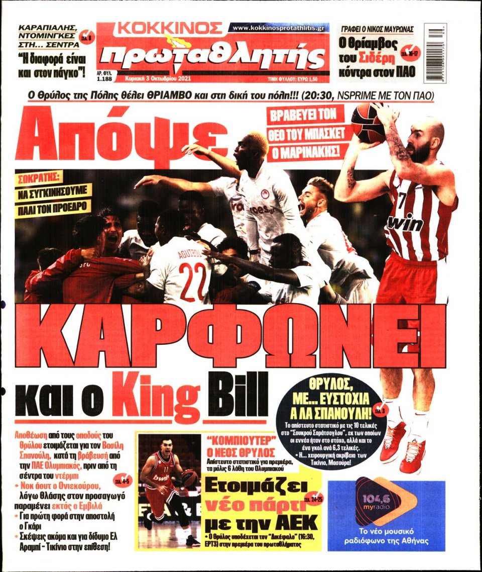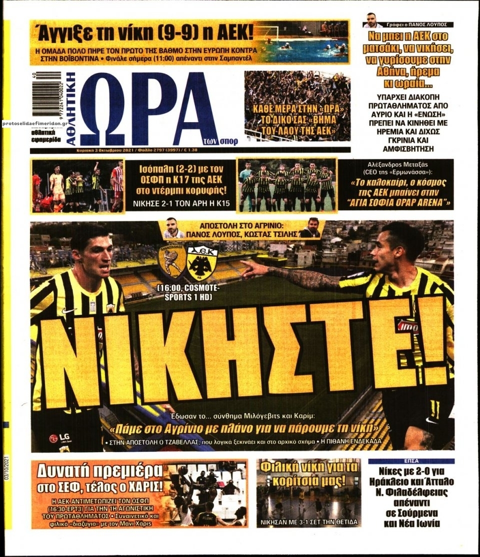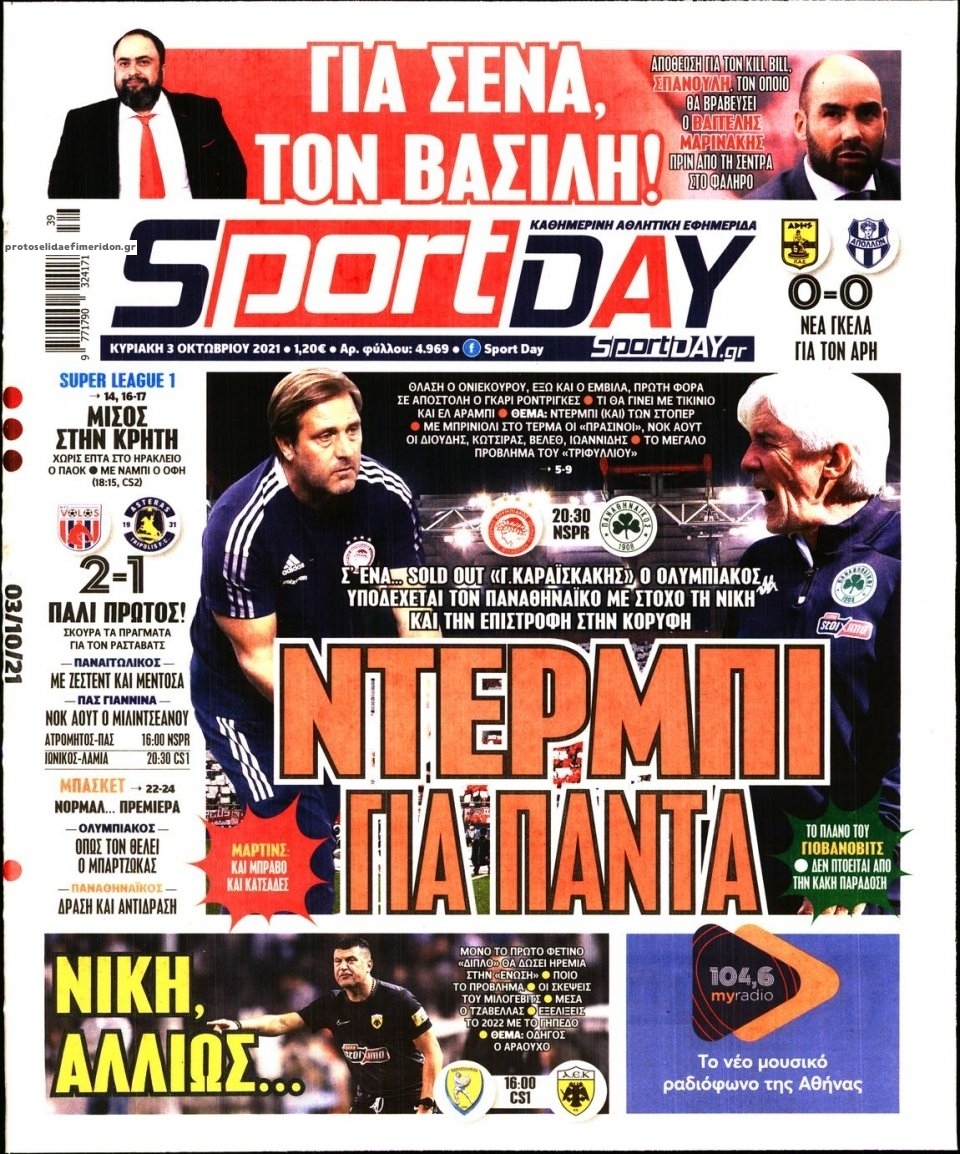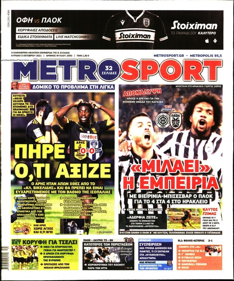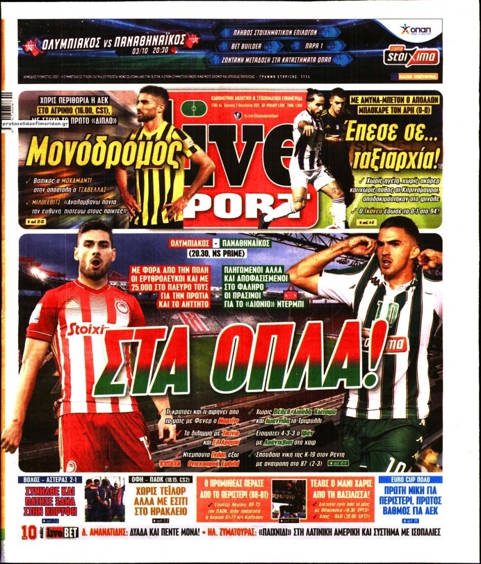 Οι αθλητικές εφημερίδες 3/10/2021 Σήφης Γαρυφαλάκης 07:41, Κυριακή 03 Οκτωβρίου 2021 Media Διαβάστε τα πρωτοσέλιδα των αθλητικών εφημερίδων. ΑΘΛΗΤΙΚΕΣ ΕΦΗΜΕΡΙΔΕΣ ΕΦΗΜΕΡΙΔΕΣ ΠΡΩΤΟΣΕΛΙΔΑ Μοιράσου το: σχολίασε κι εσύ (0 σχόλια) Ακολουθήστε το enikos.gr στο Google News και μάθετε πρώτοι όλες τις ειδήσεις Δείτε όλες τις τελευταίες ειδήσεις από την Ελλάδα και τον Κόσμο στο enikos.gr Ειδήσεις Ροή Ειδήσεων 3 ώρες πριν Από το Ορμένιο ως τα Μάλγαρα κι από τη Σιάτιστα μέχρι τη Νίκαια: Μπλόκα σε όλη την Ελλάδα – Το Σάββατο ανοίγουν τα διόδια οι αγρότες 1 ώρα πριν Εμπλοκή και αερομαχίες με οπλισμένα τουρκικά F-16 στο Αιγαίο 3 ώρες πριν Αττική: Θρίλερ με νεκρό βρέφος 5 μηνών – Κοιμόταν στο ίδιο κρεβάτι με τους γονείς του 53 λεπτά πριν Πούτιν: «Ναι, είμαι ερωτευμένος» – Βίντεο από τη σπάνια προσωπική παραδοχή του 3 ώρες πριν Μεσόγειος: Η διαδρομή του ρωσικού τάνκερ «Qendil» και η στοχευμένη επίθεση της Ουκρανίας με drone – Ο Πούτιν προειδοποίησε για αντίποινα 5 ώρες πριν Τα 5 ζώδια που ευνοούνται στην ερωτική ζωή τους την επόμενη εβδομάδα – «Η ενέργεια του Αιγόκερου φέρνει αγάπη και σταθερότητα» 6 ώρες πριν Αυτό το έξυπνο μαθηματικό κόλπο θα μπορούσε να αλλάξει τον τρόπο με τον οποίο οι επιστήμονες μελετούν τους σεισμούς 2 ώρες πριν Μήπως έχετε χάσει τον εαυτό σας στη σχέση σας; 7 «αθόρυβες» υποχωρήσεις που μάλλον κάνατε, χωρίς να το συνειδητοποιήσετε 4 ώρες πριν Κουίζ για την παλιά Αθήνα: Αναγνωρίζετε την περιοχή; Έχετε περάσει 100% από εκεί 4 λεπτά πριν Don’t Forget The Lyrics: Η Έλλη Κοκκίνου υποδέχεται 4 παίκτες που θα κάνουν τα πάντα για να μη χάσουν ούτε… μισή λέξη από τους στίχους 10 λεπτά πριν Πλεύρης στον ΑΝΤ1: Η βασική πολιτική που ψηφίστηκε από τους υπουργούς Μετανάστευσης είναι η δημιουργία κέντρων κράτησης μεταναστών στην Αφρική – ΒΙΝΤΕΟ 15 λεπτά πριν Η εξομολόγηση της Νίκης Σερέτη: «Δεν κρύβω ότι ήταν πάρα πολύ δύσκολο όλο αυτό που βίωσα» 20 λεπτά πριν Αγρότες: Κλειστό ξανά το ρεύμα εισόδου στα Μάλγαρα – Άνοιξαν τον κόμβο της Χαλκηδόνας 25 λεπτά πριν Νίκος Γιαννόπουλος: «Μου επιτέθηκε ο Παππάς – Ήμουν νηφάλιος, δεν τον προκάλεσα» – ΒΙΝΤΕΟ ENIKOS NETWORK Έχετε πραγματικά μεγάλη καρδιά; 10 χαρακτηριστικά όσων έχουν καλοσύνη «Η σούπερ» γρίπη εξαπλώνεται στην Ευρώπη-Στοιχεία από το ECDC για την αποτελεσματικότητα του εμβολίου Επίδομα παιδιού: Πότε ανοίγει ξανά η πλατφόρμα για τις αιτήσεις Προκήρυξη ΑΣΕΠ για 397 μόνιμες προσλήψεις στο Δημόσιο: Βγήκαν τα προσωρινά αποτελέσματα – Πότε αρχίζει η υποβολή ενστάσεων Χαρτογραφώντας το «σημείο χωρίς επιστροφή»: Για πρώτη φορά αποκαλύπτεται με λεπτομέρεια το ακανθώδες όριο της ατμόσφαιρας τ... Η Google καταργεί τη λειτουργία «dark web report» – Πώς θα μπορούν οι χρήστες να διαγράφουν τα δεδομένα τους περισσότερα 20:37 , Παρασκευή 19 Δεκεμβρίου 2025 Don’t Forget The Lyrics: Η Έλλη Κοκκίνου υποδέχεται 4 παίκτες που θα κάνουν τα πάντα για να μη χάσουν ούτε… μισή λέξη από τους στίχους Το «Don’t Forget The Lyrics» επιστρέφει απόψε, Παρασκευή 19 Δεκεμβρίου, στις 21:00 με νέο επει... 19:31 , Παρασκευή 19 Δεκεμβρίου 2025 GNTM: Απόψε ο μεγάλος τελικός για τους 4 φιναλίστ Έπειτα από μήνες γεμάτους μόδα, δημιουργία και έντονες αναμετρήσεις, το GNTM 2025 κορυφώνεται,... 18:11 , Παρασκευή 19 Δεκεμβρίου 2025 Το σόι σου: Ο Άρης έρχεται στην Ελλάδα για τις γιορτές των Χριστουγέννων – Τι θα δούμε στο αποψινό εορταστικό επεισόδιο Ένα απολαυστικό, εορταστικό επεισόδιο της σειράς “Το σόι σου”, γεμάτο ευτράπελα αλ... 15:15 , Παρασκευή 19 Δεκεμ