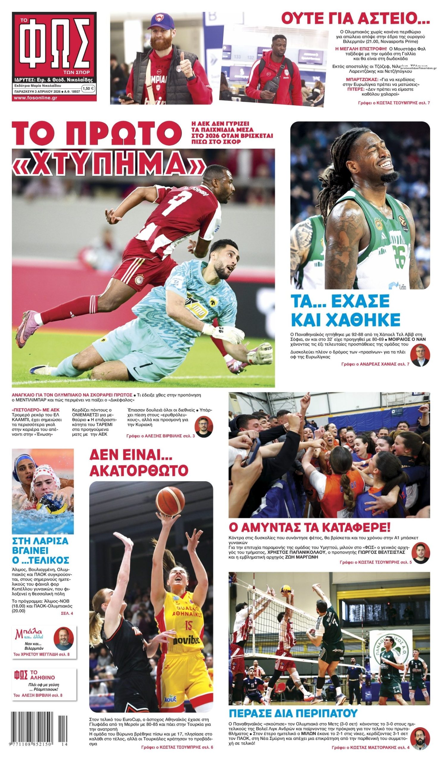 Οι αθλητικές εφημερίδες 3/4/2026 Γιωργος Λαμπρόπουλος 05:43, Παρασκευή 03 Απριλίου 2026 Media & Τηλεοπτικά Νέα Διαβάστε τα πρωτοσέλιδα από τις αθλητικές εφημερίδες, σήμερα 3/4/2026. ΑΘΛΗΤΙΚΕΣ ΕΦΗΜΕΡΙΔΕΣ ΕΦΗΜΕΡΙΔΕΣ ΠΡΩΤΟΣΕΛΙΔΑ Μοιράσου το: Euroleague: H Παρτιζάν πήρε το επεισοδιακό ντέρμπι του Βελιγραδίου – Γερά για 10άδα η Μακάμπι, κάζο της Αρμάνι στο Παρίσι – Όλα τα αποτελέσματα και η βαθμολογία Μίκαελ Σουμάχερ: «Είχε πέσει από άλογο πριν από το μοιραίο ατύχημα» – Τι αποκάλυψε η κόρη του πρωταθλητή της Formula 1, Τζίνα Έργκιν Άταμαν: «Ήμασταν άτυχοι, χάσαμε ευκαιρία για μια εύκολη νίκη» σχολίασε κι εσύ (0 σχόλια) Ακολουθήστε το Enikos στο Google News και μάθετε πρώτοι όλες τις ειδήσεις Δείτε όλες τις τελευταίες ειδήσεις από την Ελλάδα και τον Κόσμο στο enikos.gr Ειδήσεις Ροή Ειδήσεων 2 ώρες πριν Αλέξης Τσίπρας: Όσα είπε στη συνέντευξή του στο «Ενώπιος Ενωπίω» και τον Νίκο Χατζηνικολάου 11 ώρες πριν Τέμπη – Δίκη για τα βίντεο: Δεκτή η δήλωση αποχής της προέδρου – Αναβάλλεται επ’ αόριστον η εκδίκαση 24 ώρες πριν LIVE – 34η ημέρα πολέμου ΗΠΑ – Ισραήλ με Ιράν – Οι εξελίξεις στη Μέση Ανατολή 8 ώρες πριν ΟΠΕΚΕΠΕ: Εν αναμονή της διαβίβασης των δύο δικογραφιών στη Βουλή – Στο φως νέος διάλογος που «καίει» βουλευτή της ΝΔ 8 ώρες πριν Guardian: Πώς μπορεί να αντιμετωπίσει ο κόσμος τον Τραμπ – Η μόνη λύση είναι η υπομονή 1 ώρα πριν Οπτική ψευδαίσθηση: Μόνο το 1% των ανθρώπων θα βρει το μπαστούνι σε 15 δευτερόλεπτα 1 ώρα πριν Καρκίνος του ήπατος: Το προειδοποιητικό σημάδι στον ώμο που δεν πρέπει να αγνοήσετε, σύμφωνα με ειδικό 4 ώρες πριν Ζώδια 3/4: Ημερήσιες προβλέψεις – Δίδυμοι, ήρθε η ώρα να κάνετε μεγαλύτερα σχέδια και να προχωρήσετε πιο πέρα 10 ώρες πριν Ύπνος: Δυσκολεύεστε να κοιμηθείτε; Μια απλή δραστηριότητα ίσως είναι η λύση, σύμφωνα με μελέτη 40 λεπτά πριν Την Κυριακή με τη Realnews: Ό,τι και αν αγοράσεις, σκανάρεις και κερδίζεις! 15 δευτερόλεπτα πριν Fuel Pass: Τι πρέπει να κάνουν οι δικαιούχοι για να λάβουν την ενίσχυση πριν από το Πάσχα – Αναλυτικός οδηγός 3 λεπτά πριν Ανταπόκριση από Ισραήλ: Ο Καρδινάλιος Pierbattista Pizzaballa φωτίζει τον δρόμο για το Άγιο Φως στην Ελλάδα 20 λεπτά πριν Αυτή την Κυριακή με τη Realnews: Στις μυστικές υπηρεσίες της Μαρίας Αντουανέτας – Η νύφη φορούσε μαύρα – Μια μυστηριώδης κλοπή στις Βερσαλλίες αναστατώνει τη βασίλισσα, από τον συγγραφέα Frédéric Lenormand 25 λεπτά πριν Η Κούβα δίνει χάρη σε 2.010 φυλακισμένους ενόψει του Καθολικού Πάσχα ENIKOS NETWORK Ένα καλά καμουφλαρισμένο ελάφι κρύβεται στη φωτογραφία – Σπάστε το ρεκόρ και ανακαλύψτε το σε λιγότερο από 7 δευτερόλεπτα Το ζουμερό φρούτο της μακροζωίας που μπορεί να ανακουφίσει από τη δυσκοιλιότητα και να μειώσει τη φλεγμονή Fuel Pass: Τι πρέπει να κάνουν οι δικαιούχοι για να λάβουν την ενίσχυση πριν από το Πάσχα – Αναλυτικός οδηγός «Πικρά» τα γλυκά λόγω ανατιμήσεων σε ζάχαρη και σοκολάτα – Πού έχουν φτάσει οι τιμές Moya: Το ρομπότ που φέρνει σπίτι σας την πιο «αλλόκοσμη» αίσθηση Κουίζ: Πόσο καλά γνωρίζεις την ελληνική μυθολογία; Μπορείς να κάνεις το 3 στα 3; περισσότερα 05:48 , Παρασκευή 03 Απριλίου 2026 Οι οικονομικές εφημερίδες 3/4/2026 Διαβάστε τα πρωτοσέλιδα από τις οικονομικές εφημερίδες, σήμερα 3/4/2026. 05:38 , Παρασκευή 03 Απριλίου 2026 Οι πολιτικές εφημερίδες 3/4/2026 Διαβάστε τα πρωτοσέλιδα από τις πολιτικές εφημερίδες, σήμερα 3/4/2026. 05:20 , Παρασκευή 03 Απριλίου 2026 Masterchef: Το κλάμα του αρχηγού Πάνου για τη σημερινή αποχώρηση και τα «καντήλια» του Γιώργου Γεμάτο έντον