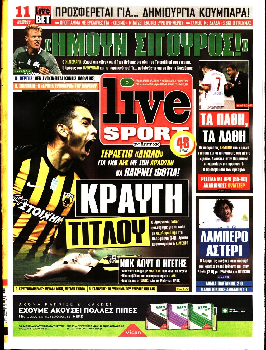 Οι αθλητικές εφημερίδες 30/10/2017 Κώστας Τεό 06:33, Δευτέρα 30 Οκτωβρίου 2017 Media Διαβάστε τα σημερινά πρωτοσέλιδα των αθλητικών εφημερίδων: ΑΘΛΗΤΙΚΕΣ ΕΦΗΜΕΡΙΔΕΣ ΠΡΩΤΟΣΕΛΙΔΑ Μοιράσου το: σχολίασε κι εσύ (0 σχόλια) Ακολουθήστε το enikos.gr στο Google News και μάθετε πρώτοι όλες τις ειδήσεις Δείτε όλες τις τελευταίες ειδήσεις από την Ελλάδα και τον Κόσμο στο enikos.gr Ειδήσεις Ροή Ειδήσεων 2 ώρες πριν Αγρότες: Πολύωροι αποκλεισμοί στα τελωνεία Προμαχώνα, Εξοχής, Ευζώνων και Νίκης – Κλείνουν τον κόμβο Φιλώτα οι παραγωγοί στη Δυτική Μακεδονία 1 ώρα πριν Νίκος Παππάς: Ζητώ συγγνώμη για αυτό το επεισόδιο – Δεν τον γρονθοκόπησα 3 ώρες πριν Ευρωπαϊκό Συμβούλιο: Όλες οι λεπτομέρειες για το δάνειο των 90 δισ. ευρώ στην Ουκρανία – Τα συμπεράσματα της Συνόδου Κορυφής 3 ώρες πριν Αίγιο: 22χρονη κατήγγειλε ότι έπεσε θύμα βιασμού και ληστείας από συγγενικά της πρόσωπα 1 ώρα πριν Τρομακτικό βίντεο: Η στιγμή της έκρηξης στο τζετ που μετέφερε τον οδηγό του NASCAR, Γκρεγκ Μπιφλ και την οικογένειά του 2 ώρες πριν Αλλαγή σελίδας για 3 ζώδια – «Μία δύσκολη περίοδος φτάνει στο τέλος της» 2 ημέρες πριν 20 χρόνια τα Χριστούγεννα ξεκινούν στα Public με μεγάλη ποικιλία σε δώρα! 3 ώρες πριν Ο σύζυγός της συμπεριφέρεται όπως το παιδί τους – «Χρησιμοποιεί αστείες δικαιολογίες για να μην κάνει δουλειές και να ξοδεύει λεφτά» 1 ώρα πριν Γεμάτος νεροχύτης; 5 σοβαρές ευθύνες που «φοβίζουν» όσους αφήνουν άπλυτα πιάτα 8 λεπτά πριν Γονείς για πρώτη φορά ο Πιτ Ντέιβιντσον και η Έλσι Χιούιτ 14 λεπτά πριν Πούτιν: Η Ουκρανία δεν είναι έτοιμη για ειρηνευτικές συνομιλίες – ο ρωσικός στρατός προελαύνει σε όλα τα μέτωπα 20 λεπτά πριν Βουλή: Αποσύρθηκε προσθήκη για έργα του Ταμειακού Προγράμματος Ανάπτυξης της Γ.Γ. Αθλητισμού μετά τις αντιδράσεις της αντιπολίτευσης 25 λεπτά πριν Νορβηγία: Η πριγκίπισσα Μέτε-Μάριτ πιθανότατα θα υποβληθεί σε μεταμόσχευση πνεύμονα 36 λεπτά πριν Ενίσχυση δρομολογίων του Μετρό τις Κυριακές 21 και 28 Δεκεμβρίου – Κυκλοφοριακές ρυθμίσεις αύριο στη Γραμμή 7 του τραμ λόγω εορταστικών εκδηλώσεων ENIKOS NETWORK Κίνδυνος παραπλάνησης από διαφημίσεις οδοντικών εμφυτευμάτων Καρκίνος του πνεύμονα: Έως 8.000 ζωές μπορούν να σωθούν με την έγκαιρη διάγνωση Επιδόματα και παροχές από τον ΟΠΕΚΑ: Τι πιστώνεται σήμερα στους τραπεζικούς λογαριασμούς Απειλή για τον Προϋπολογισμό τα ληξιπρόθεσμα χρέη των ιδιωτών προς την εφορία – Τι δείχνουν τα στοιχεία Χαρτογραφώντας το «σημείο χωρίς επιστροφή»: Για πρώτη φορά αποκαλύπτεται με λεπτομέρεια το ακανθώδες όριο της ατμόσφαιρας τ... Η Google καταργεί τη λειτουργία «dark web report» – Πώς θα μπορούν οι χρήστες να διαγράφουν τα δεδομένα τους περισσότερα 08:00 , Παρασκευή 19 Δεκεμβρίου 2025 Την Κυριακή με τη Realnews: Δωροεπιταγή 10€ Δωροεπιταγή αξίας 10€ για αγορές άνω των 60€ από τα πολυκαταστήματα FactoryOutlet H προσφορά ι... 05:48 , Παρασκευή 19 Δεκεμβρίου 2025 Οι οικονομικές εφημερίδες 19/12/2025 Διαβάστε τα πρωτοσέλιδα από τις οικονομικές εφημερίδες, σήμερα 19/12/2025. 05:43 , Παρασκευή 19 Δεκεμβρίου 2025 Οι αθλητικές εφημερίδες 19/12/2025 Διαβάστε τα πρωτοσέλιδα από τις αθλητικές εφημερίδες, σήμερα 19/12/2025. 05:38 , Παρασκευή 19 Δεκεμβρίου 2025 Οι πολιτικές εφημερίδες 19/12/2025 Διαβάστε τα πρωτοσέλιδα από τις πολιτικές εφημερίδες, σήμερα 19/12/2025. ΤΕΛΕΥΤΑΙΕΣ ΕΙΔΗΣΕΙΣ 8 λεπτά πριν Γονείς για πρώτη φορά ο Πιτ Ντέιβιντσον και η Έλσι... 14 λεπτά πριν Πούτιν: Η Ουκρανία δεν είναι έτοιμη για ειρηνευτικές... 20 λεπτά πριν Βουλή: Αποσύρθηκε π