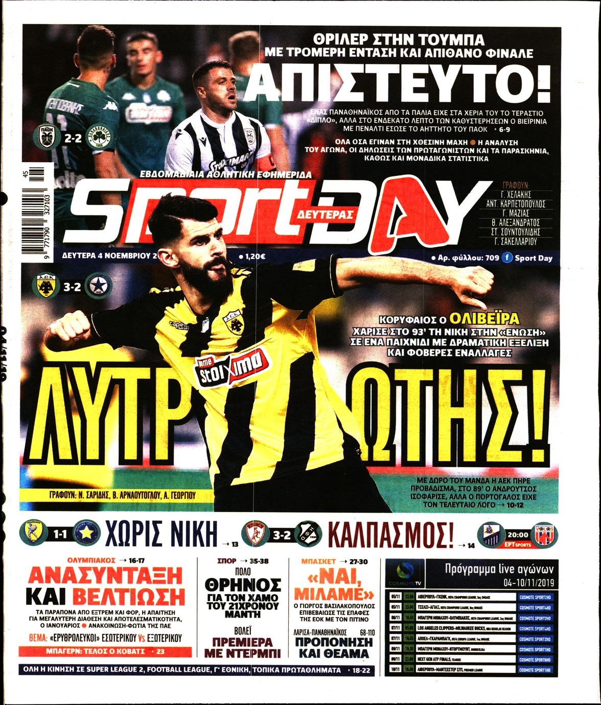 Οι αθλητικές εφημερίδες 4/11/19 Διονύσης Νίκκας 07:04, Δευτέρα 04 Νοεμβρίου 2019 Media Διαβάστε τα πρωτοσέλιδα των αθλητικών εφημερίδων… ΑΘΛΗΤΙΚΕΣ ΕΦΗΜΕΡΙΔΕΣ Μοιράσου το: σχολίασε κι εσύ (0 σχόλια) Ακολουθήστε το enikos.gr στο Google News και μάθετε πρώτοι όλες τις ειδήσεις Δείτε όλες τις τελευταίες ειδήσεις από την Ελλάδα και τον Κόσμο στο enikos.gr Ειδήσεις Ροή Ειδήσεων 2 ώρες πριν Νίκος Παππάς: «Είχα λάθος αντίδραση στη δική του δράση-πρόκληση – Δεν θα αναλύσω σε τι κατάσταση ήταν ο δημοσιογράφος» 1 ώρα πριν Αλεξανδρούπολη: Πολυοργανική ανεπάρκεια λόγω υποσιτισμού η αιτία θανάτου του 3χρονου αγοριού 2 ώρες πριν Δημοσκόπηση Pulse: Η διαφορά ΝΔ-ΠΑΣΟΚ – Με ποια κριτήρια θα ψηφίσουν οι πολίτες στις επόμενες εκλογές 2 ώρες πριν Αγρότες: Άνοιξαν τον μεθοριακό σταθμό του Προμαχώνα – Κανονικά περνούν τα φορτηγά 3 ώρες πριν Συγκλονιστικό βίντεο: Τρόμος για τουρίστες που σώθηκαν την τελευταία στιγμή από λεωφορείο που κατρακυλούσε σε φαράγγι 2 ώρες πριν Αριθμολογία: Οι άνθρωποι που έχουν γεννηθεί αυτές τις 4 ημερομηνίες, είναι τρυφεροί και αγαπούν ανιδιοτελώς 4 ώρες πριν Οι άνθρωποι που θυμούνται τα όνειρά τους, συνήθως μοιράζονται αυτά τα 6 σπάνια χαρακτηριστικά 3 ώρες πριν Καθρέφτες μπάνιου: Το απλό κόλπο με την οδοντόκρεμα για να μην θολώνουν 13 ώρες πριν 20 χρόνια τα Χριστούγεννα ξεκινούν στα Public με μεγάλη ποικιλία σε δώρα! 7 λεπτά πριν Ρούτε: Η μεγαλύτερη επιτυχία εξωτερικής πολιτικής του Τραμπ είναι η δέσμευση των χωρών του ΝΑΤΟ για τις αμυντικές δαπάνες 13 λεπτά πριν Το Σπίτι Δίπλα Στο Ποτάμι: Σε κίνδυνο η υγεία του Απόστολου – Τι θα δούμε απόψε 23 λεπτά πριν Νίκος Γιαννόπουλος για Νίκο Παππά: «Είναι επικίνδυνος, θα του κάνω ασφαλιστικά» – ΒΙΝΤΕΟ 27 λεπτά πριν ΟΠΕΚΕΠΕ – Παράνομες επιδοτήσεις: Ελεύθεροι με περιοριστικούς όρους ακόμη τρεις κατηγορούμενοι – Ανάμεσα τους και η σύζυγος του λογιστή 33 λεπτά πριν Συγγενείς θυμάτων τρομοκρατίας: «Ο Κουφοντίνας να μην πάρει με κρατικά χρήματα, αυτό που κάποτε “αγόραζε” με αίμα» ENIKOS NETWORK Αϋπνία: Το κόλπο που θα σας βοηθήσει να κοιμηθείτε απόψε – Είναι απλό και έχει αποτέλεσμα 2,6 εκατομμύρια πολίτες έχουν ήδη εμβολιαστεί κατά της γρίπης Χειμερινές εκπτώσεις: Πότε αρχίζουν και τι πρέπει να προσέξουν οι καταναλωτές ΑΑΔΕ: Καταβλήθηκε η τέταρτη δόση επιστροφής ΕΦΚ αγροτικού πετρελαίου – Οδηγίες για τη διόρθωση παραστατικών Χαρτογραφώντας το «σημείο χωρίς επιστροφή»: Για πρώτη φορά αποκαλύπτεται με λεπτομέρεια το ακανθώδες όριο της ατμόσφαιρας τ... Η Google καταργεί τη λειτουργία «dark web report» – Πώς θα μπορούν οι χρήστες να διαγράφουν τα δεδομένα τους περισσότερα 22:24 , Τετάρτη 17 Δεκεμβρίου 2025 Το Σπίτι Δίπλα Στο Ποτάμι: Σε κίνδυνο η υγεία του Απόστολου – Τι θα δούμε απόψε “Το Σπίτι Δίπλα στο Ποτάμι” ξετυλίγει το νήμα της ζωής των πέντε αδελφών με καταισ... 21:14 , Τετάρτη 17 Δεκεμβρίου 2025 Παιχνίδια Εκδίκησης: Θα καταφέρει ο Χρήστος να κλονίσει την εμπιστοσύνη της Μάγιας απέναντι στον Άγη; Τα «Παιχνίδια Εκδίκησης» έρχονται απόψε στις 22:30, στον Αντ1, με το τελευταίο επεισόδιο της χ... 20:57 , Τετάρτη 17 Δεκεμβρίου 2025 Άγιος Έρωτας: Η Χλόη καταθέτει εναντίον του πατέρα της και ο Χάρης αποκαλύπτει στον Κλεάνθη ότι δεν είναι ο βιολογικός του πατέρας. Γεμάτο αποκαλύψεις είναι το νέο επεισόδιο της σειράς “Άγιος Έρωτας” απόψε στις 21:... 20:15 , Τετάρτη 17 Δεκεμβρίου 2025 Η ανακοίνωση της ΕΣΗΕΑ για την επίθεση του Ευρωβουλευτή Νίκου Παππά κατά του δημοσιογράφο