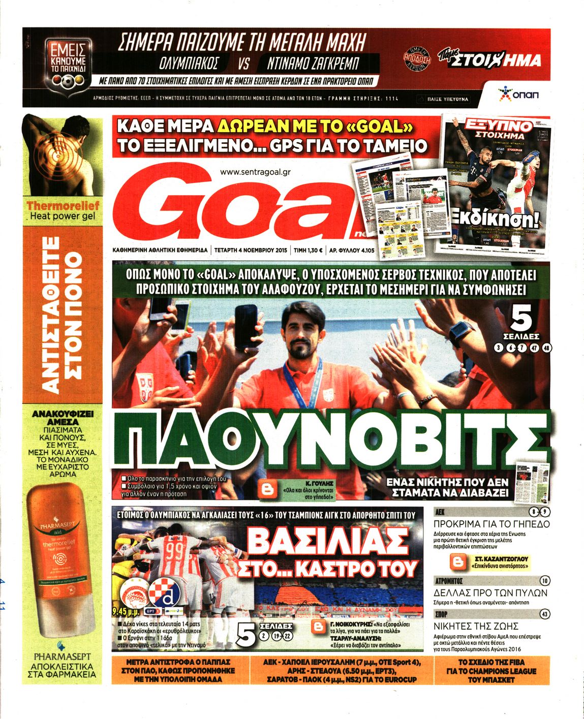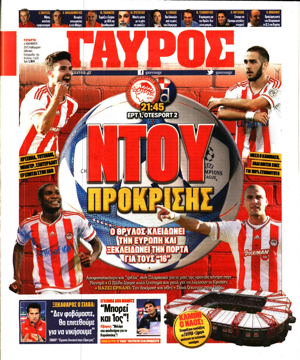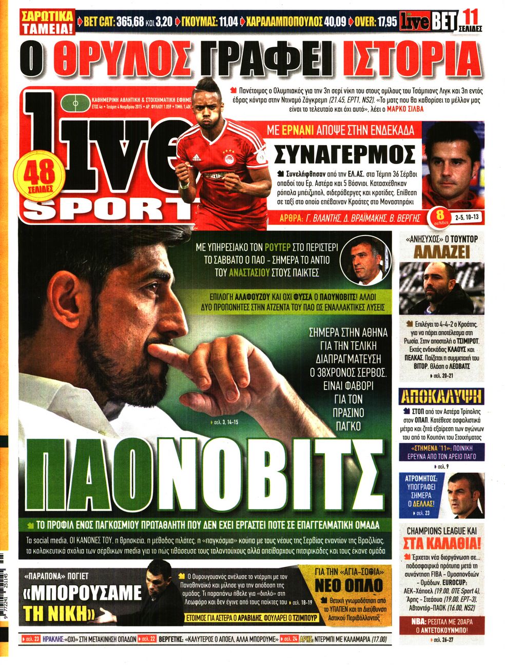 Οι αθλητικές εφημερίδες 4/11/2015 Enikos Newsroom 06:18, Τετάρτη 04 Νοεμβρίου 2015 Media Διαβάστε τα σημερινά πρωτοσέλιδα των αθλητικών εφημερίδων: ΑΘΛΗΤΙΚΕΣ ΕΦΗΜΕΙΔΕΣ ΠΡΩΤΟΣΕΛΙΔΑ Μοιράσου το: σχολίασε κι εσύ (0 σχόλια) Ακολουθήστε το enikos.gr στο Google News και μάθετε πρώτοι όλες τις ειδήσεις Δείτε όλες τις τελευταίες ειδήσεις από την Ελλάδα και τον Κόσμο στο enikos.gr Ειδήσεις Ροή Ειδήσεων 5 ώρες πριν Θετικοί οι αγρότες στη νέα πρόσκληση για διάλογο με τον Πρωθυπουργό – Αποφασίζουν την Παρασκευή εάν θα «σπάσουν» τον 48ωρο αποκλεισμό 5 ώρες πριν Πάτρα: Την Παρασκευή οι απολογίες των 4 εμπλεκομένων για τον θανάσιμο ξυλοδαρμό του 30χρονου – Το ξέσπασμα της μητέρας του θύματος και το βίντεο-σοκ 4 ώρες πριν Μινεάπολη: Η εκτέλεση της 37χρονης Ρενέ Γκουντ αποκαλύπτει δύο εντελώς αντίθετες διαχωριστικές γραμμές στην αμερικανική πολιτική 7 ώρες πριν Κύπρος: Πολιτικές αντιδράσεις μετά την διαρροή του βίντεο με «χρηματοδοτήσεις» και «επενδυτές» – Κυβέρνηση: Υβριδική επίθεση με κακόβουλο μοντάζ 2 ώρες πριν Χρήστος Πολίτης: Το πραγματικό του όνομα, η καριέρα και το… φαινόμενο «Γιάγκος Δράκος» 7 ώρες πριν Αριθμολογία 2026: Οι άτυχοι μήνες της χρονιάς, με βάση την ημερομηνία γέννησής σας 8 ώρες πριν Περιορίστε τη σκόνη στο σπίτι σας με μια απλή και οικονομική λύση – Ο ρόλος της υγρασίας 6 ώρες πριν Ύπνος: Δυσκολεύεστε να κοιμηθείτε; Γιατρός μοιράζεται ένα «μυστικό» συστατικό που βοηθάει στη χαλάρωση 5 ώρες πριν Ανακαλύφθηκε εντυπωσιακός τάφος 1.300 ετών – Τα τεχνουργήματα που περιείχε ρίχνουν φως στη ζωή των ελίτ της δυναστείας Τανγκ 33 λεπτά πριν Ιωάννα Μαλέσκου: «Δεν θα επιτρέψω σε κανέναν να εισβάλλει με το έτσι θέλω στο σπίτι μου και στη ζωή μου» 49 λεπτά πριν Μάκης Δελαπόρτας: Ξέρω πράγματα για τη Ρένα Παγκράτη που δεν τα ‘χω πει ποτέ 1 ώρα πριν Φιλιππίνες: Ένας νεκρός και 27 αγνοούμενοι από κατάρρευση εγκατάστασης απορριμμάτων 1 ώρα πριν Συναγερμός στο Πόρτλαντ: Πράκτορες της Υπηρεσίας Μετανάστευσης πυροβόλησαν δύο άτομα 2 ώρες πριν Χρήστος Πολίτης: Το πραγματικό του όνομα, η καριέρα και το… φαινόμενο «Γιάγκος Δράκος» ENIKOS NETWORK Γιατί κάποιοι κρεμάνε φύλλα δάφνης στην πόρτα της κρεβατοκάμαρας; Το μυστικό για καλύτερο ύπνο ΠΟΕΔΗΝ: Σήμα κινδύνου εκπέμπει η Πνευμονολογική Κλινική του Νοσοκομείου Άρτας ΣΑΤΑ: 48ωρη απεργία για τις 13 και 14 Ιανουαρίου αποφάσισαν οι αυτοκινητιστές των ταξί στην Αττική ΔΥΠΑ: Αρχίζει η υποβολή προγραμμάτων κατάρτισης για άνεργους δικαιούχους του Ελάχιστου Εγγυημένου Εισοδήματος – Όλες οι λεπ... Ο Google Assistant θα παραμείνει λίγο περισσότερο για ορισμένους χρήστες Android Τεστ προσωπικότητας: Το βάζο που θα επιλέξετε αποκαλύπτει πώς λύνετε προβλήματα στη ζωή σας περισσότερα 18:15 , Πέμπτη 08 Ιανουαρίου 2026 Άγιος Έρωτας: Ο πατήρ Νικόλαος σώζει τη μικρή Ελευθερία και ο Παύλος παθαίνει καρδιακή προσβολή – Καθηλώνουν τα επόμενα επεισόδια Η αγαπημένη δραματική σειρά “Άγιος ‘Ερωτας” επιστρέφει στις οθόνες μας με νέ... 17:43 , Πέμπτη 08 Ιανουαρίου 2026 Οι Αθώοι: Η μουσική της μεγάλης παραγωγής του Mega – Νέο lyrics video Η σειρά εποχής, που έχει ήδη κλέψει τις εντυπώσεις από τις πρώτες κιόλας εικόνες των τρέιλερ π... 17:04 , Πέμπτη 08 Ιανουαρίου 2026 Νέα δυναμική διεθνής επένδυση του Θοδωρή Κυριακού στις ΗΠΑ Ο Πρόεδρος του Ομίλου Antenna, Θοδωρής Κυριακού, συνεχίζει να ενισχύει δυναμικά την παγκόσμια ... 12:40 , Πέμπτη 08 Ιανουαρίου 2026 Ακούστε την εκπομπή του Νίκου Χατζηνικολάου 8/1/2026 Ακούστε την εκπ