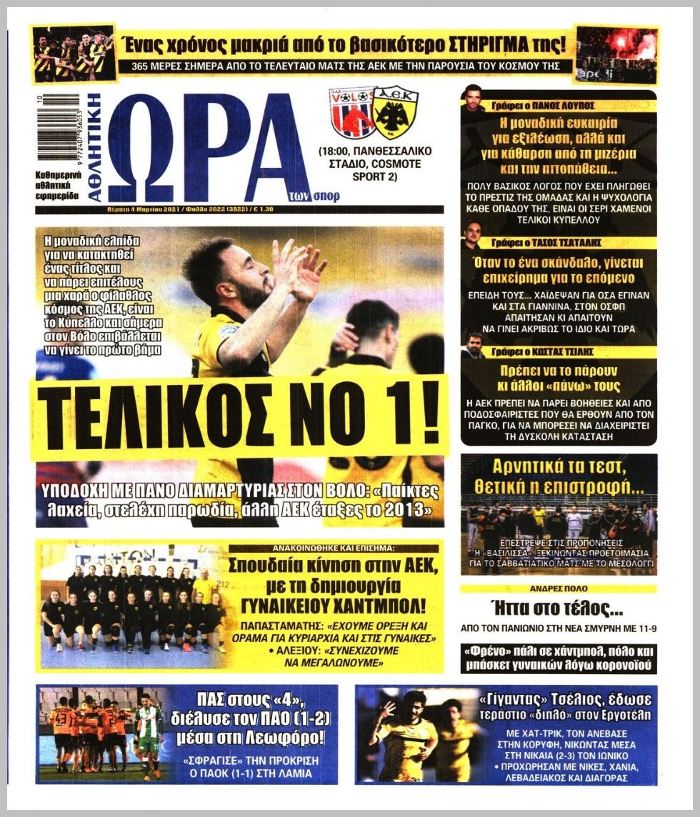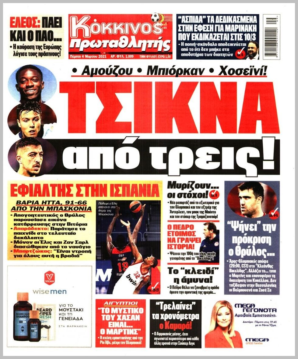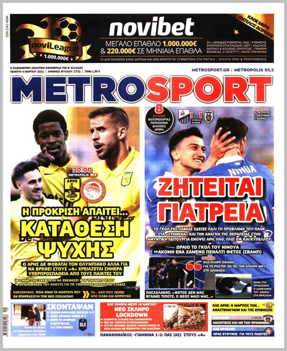 Οι αθλητικές εφημερίδες 4/3/2021 Διονύσης Νίκκας 06:41, Πέμπτη 04 Μαρτίου 2021 Media Διαβάστε τα πρωτοσέλιδα των αθλητικών εφημερίδων… ΑΘΛΗΤΙΚΕΣ ΑΘΛΗΤΙΚΕΣ ΕΦΗΜΕΡΙΔΕΣ Μοιράσου το: σχολίασε κι εσύ (0 σχόλια) Ακολουθήστε το enikos.gr στο Google News και μάθετε πρώτοι όλες τις ειδήσεις Δείτε όλες τις τελευταίες ειδήσεις από την Ελλάδα και τον Κόσμο στο enikos.gr Ειδήσεις Ροή Ειδήσεων 2 ώρες πριν Με μπλόκα η έξοδος των εκδρομέων για τα Χριστούγεννα – Οι αγρότες αναδιατάσσουν τα τρακτέρ τους 22 λεπτά πριν Κωνσταντινούπολη: Ελληνίδα έπεσε θύμα ερωτικής απάτης και έχασε 60.000 ευρώ – Η παγίδα που της έστησε ο «Μουράτ από τον Λίβανο» 1 ώρα πριν Ακρίβεια: Μεγάλη η «ψαλίδα» από το χωράφι στο ράφι – Σημαντικές ανατιμήσεις σε βασικά αγαθά 32 λεπτά πριν Αττική: Παράτησε Lamborghini σε στάση λεωφορείου και έφυγε με τα πόδια για να αποφύγει μπλόκο της Τροχαίας 42 λεπτά πριν Βινς Ζαμπέλα: Σκοτώθηκε σε τροχαίο ο συνδημιουργός του «Call of Duty» – Βίντεο-σοκ από την πρόσκρουση της κόκκινης Ferrari του 4 ώρες πριν Φλεγμονή: Έμπειρη μαγείρισσα αποκαλύπτει το πανίσχυρο ελληνικό βότανο που την καταπολεμά 2 ώρες πριν Ανακαλύφθηκε μωσαϊκό της ύστερης αρχαιότητας με ελληνική επιγραφή 1 ώρα πριν Ανακάλυψε την απιστία της συζύγου του με τον πρώην της και ζήτησε διαζύγιο – «Δεν σκοπεύω να την βοηθήσω οικονομικά» 3 ημέρες πριν Enerwave: Το νέο «ρεύμα» στη λιανική ενέργειας που αλλάζει την εμπειρία του καταναλωτή 4 λεπτά πριν Ξεκινάει σήμερα το πρόγραμμα για την παχυσαρκία με 30.000 δικαιούχους – Πάνω από 2 εκατ. οι εμβολιασμοί για την γρίπη 9 λεπτά πριν Δανάη Παππά: «Αφήνω πίσω τους ανθρώπους που με πλήγωσαν εσκεμμένα» 14 λεπτά πριν Ποσειδώνος: Φωτιά σε αυτοκίνητο στο ύψος του Μοσχάτου – Διακοπή κυκλοφορίας 17 λεπτά πριν Αυτά τα 4 ζώδια έχουν πολλά να περιμένουν μετά τη σημερινή ημέρα – «Έρχονται υπέροχα νέα» 22 λεπτά πριν Κωνσταντινούπολη: Ελληνίδα έπεσε θύμα ερωτικής απάτης και έχασε 60.000 ευρώ – Η παγίδα που της έστησε ο «Μουράτ από τον Λίβανο» ENIKOS NETWORK Ποια συμπτώματα έχει το μίνι εγκεφαλικό – Μπορεί να εμφανιστούν ακόμα και μήνες πριν από ένα βαρύ επεισόδιο Στοιχεία σοκ για τη χρήση ναρκωτικών και αλκοόλ από ανήλικους-Καμπανάκι κινδύνου ενόψει γιορτών ΟΠΕΚΕΠΕ: Σήμερα ανοίγει η πλατφόρμα για τα αγροτεμάχια – Ποιους αφορά Καιρός: Βροχές και καταιγίδες σήμερα – Πώς θα κάνουμε Χριστούγεννα Ο Google Assistant θα παραμείνει λίγο περισσότερο για ορισμένους χρήστες Android Τεστ προσωπικότητας: Το βάζο που θα επιλέξετε αποκαλύπτει πώς λύνετε προβλήματα στη ζωή σας περισσότερα 07:01 , Τρίτη 23 Δεκεμβρίου 2025 Την Κυριακή με τη Realnews: Δωροεπιταγή 10€ Την Κυριακή με τη Realnews: Δωροεπιταγή 10€ Δωροεπιταγή αξίας 10€ για αγορές άνω των 60€ από τ... 20:16 , Δευτέρα 22 Δεκεμβρίου 2025 «Το παιδί από την αρχή»: Special edition επεισόδια της επιτυχημένης σειράς αρχίζουν από σήμερα στην ΕΡΤ1 «Το παιδί», η ξεχωριστή σειρά της ΕΡΤ1 με στοιχεία μαύρης κωμωδίας, που φέρει την υπογραφή του... 19:41 , Δευτέρα 22 Δεκεμβρίου 2025 Porto Leone: Στη γειτονιά με τα κόκκινα φανάρια – Η Αλεξάνδρα ανακαλύπτει το μυστικό της Γαλήνης και της στήνει παγίδα Απόψε στις 22:30 στον Alpha η συγκλονιστική συνέχεια της δραματικής σειράς του Apha «Porto Leo... 19:16 , Δευτέρα 22 Δεκεμβρίου 2025 Άγιος έρωτας: Η Πετρούλα αφήνει την τελευταία της πνοή Καθηλώνει το προτελευταίο επεισόδιο της χρονιάς της σειράς “Άγιος Έρωτας” απόψε στ... ΤΕΛΕΥΤΑΙΕΣ ΕΙΔΗΣΕΙΣ 9 λεπτά πριν Δανάη Παππά: «Αφήνω πίσω τους ανθρώπους που με... 14 λεπτά π