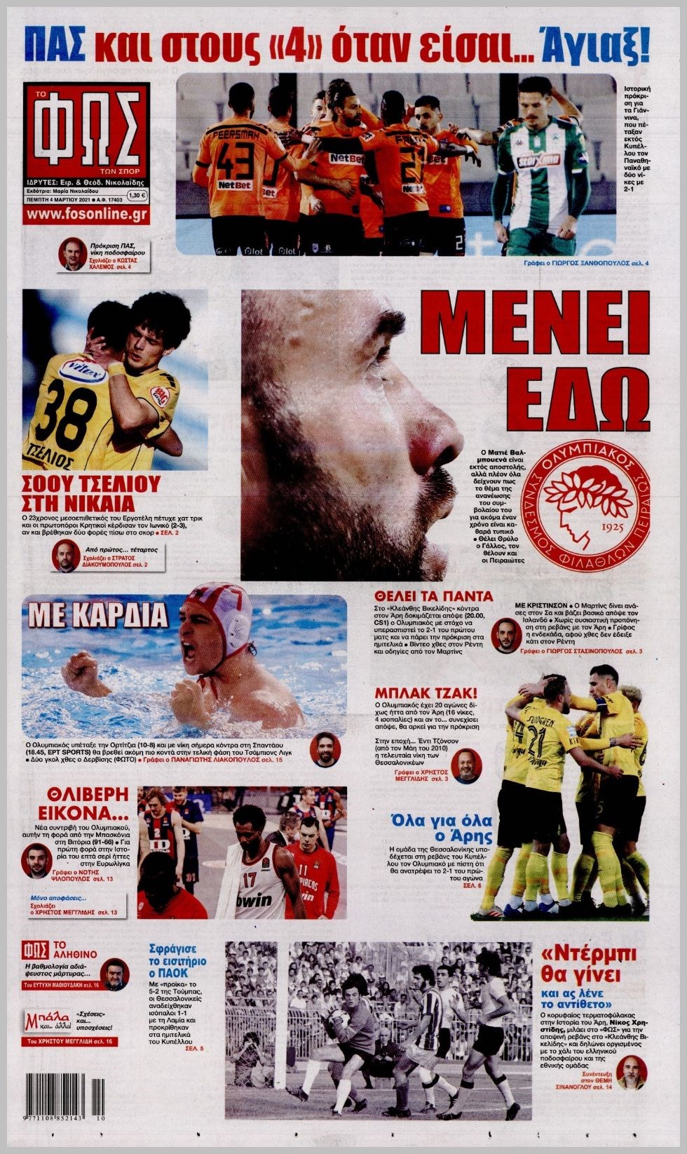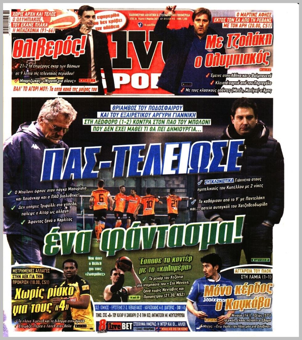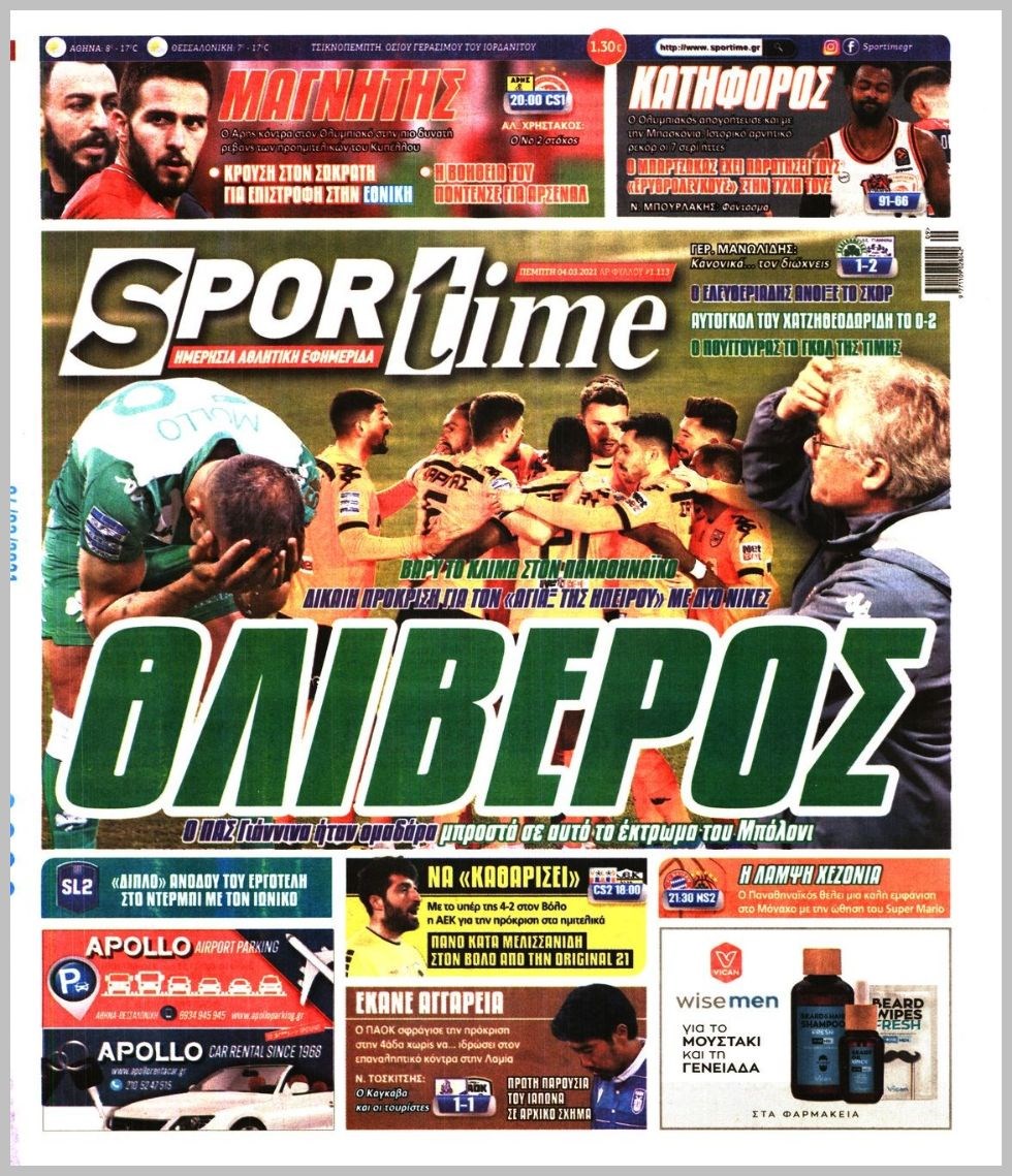 Οι αθλητικές εφημερίδες 4/3/2021 Διονύσης Νίκκας 06:41, Πέμπτη 04 Μαρτίου 2021 Media Διαβάστε τα πρωτοσέλιδα των αθλητικών εφημερίδων… ΑΘΛΗΤΙΚΕΣ ΑΘΛΗΤΙΚΕΣ ΕΦΗΜΕΡΙΔΕΣ Μοιράσου το: σχολίασε κι εσύ (0 σχόλια) Ακολουθήστε το enikos.gr στο Google News και μάθετε πρώτοι όλες τις ειδήσεις Δείτε όλες τις τελευταίες ειδήσεις από την Ελλάδα και τον Κόσμο στο enikos.gr Ειδήσεις Ροή Ειδήσεων 2 ώρες πριν Με μπλόκα η έξοδος των εκδρομέων για τα Χριστούγεννα – Οι αγρότες αναδιατάσσουν τα τρακτέρ τους 22 λεπτά πριν Κωνσταντινούπολη: Ελληνίδα έπεσε θύμα ερωτικής απάτης και έχασε 60.000 ευρώ – Η παγίδα που της έστησε ο «Μουράτ από τον Λίβανο» 1 ώρα πριν Ακρίβεια: Μεγάλη η «ψαλίδα» από το χωράφι στο ράφι – Σημαντικές ανατιμήσεις σε βασικά αγαθά 32 λεπτά πριν Αττική: Παράτησε Lamborghini σε στάση λεωφορείου και έφυγε με τα πόδια για να αποφύγει μπλόκο της Τροχαίας 42 λεπτά πριν Βινς Ζαμπέλα: Σκοτώθηκε σε τροχαίο ο συνδημιουργός του «Call of Duty» – Βίντεο-σοκ από την πρόσκρουση της κόκκινης Ferrari του 4 ώρες πριν Φλεγμονή: Έμπειρη μαγείρισσα αποκαλύπτει το πανίσχυρο ελληνικό βότανο που την καταπολεμά 2 ώρες πριν Ανακαλύφθηκε μωσαϊκό της ύστερης αρχαιότητας με ελληνική επιγραφή 1 ώρα πριν Ανακάλυψε την απιστία της συζύγου του με τον πρώην της και ζήτησε διαζύγιο – «Δεν σκοπεύω να την βοηθήσω οικονομικά» 3 ημέρες πριν Enerwave: Το νέο «ρεύμα» στη λιανική ενέργειας που αλλάζει την εμπειρία του καταναλωτή 4 λεπτά πριν Ξεκινάει σήμερα το πρόγραμμα για την παχυσαρκία με 30.000 δικαιούχους – Πάνω από 2 εκατ. οι εμβολιασμοί για την γρίπη 9 λεπτά πριν Δανάη Παππά: «Αφήνω πίσω τους ανθρώπους που με πλήγωσαν εσκεμμένα» 14 λεπτά πριν Ποσειδώνος: Φωτιά σε αυτοκίνητο στο ύψος του Μοσχάτου – Διακοπή κυκλοφορίας 17 λεπτά πριν Αυτά τα 4 ζώδια έχουν πολλά να περιμένουν μετά τη σημερινή ημέρα – «Έρχονται υπέροχα νέα» 22 λεπτά πριν Κωνσταντινούπολη: Ελληνίδα έπεσε θύμα ερωτικής απάτης και έχασε 60.000 ευρώ – Η παγίδα που της έστησε ο «Μουράτ από τον Λίβανο» ENIKOS NETWORK Ποια συμπτώματα έχει το μίνι εγκεφαλικό – Μπορεί να εμφανιστούν ακόμα και μήνες πριν από ένα βαρύ επεισόδιο Στοιχεία σοκ για τη χρήση ναρκωτικών και αλκοόλ από ανήλικους-Καμπανάκι κινδύνου ενόψει γιορτών ΟΠΕΚΕΠΕ: Σήμερα ανοίγει η πλατφόρμα για τα αγροτεμάχια – Ποιους αφορά Καιρός: Βροχές και καταιγίδες σήμερα – Πώς θα κάνουμε Χριστούγεννα Ο Google Assistant θα παραμείνει λίγο περισσότερο για ορισμένους χρήστες Android Τεστ προσωπικότητας: Το βάζο που θα επιλέξετε αποκαλύπτει πώς λύνετε προβλήματα στη ζωή σας περισσότερα 07:01 , Τρίτη 23 Δεκεμβρίου 2025 Την Κυριακή με τη Realnews: Δωροεπιταγή 10€ Την Κυριακή με τη Realnews: Δωροεπιταγή 10€ Δωροεπιταγή αξίας 10€ για αγορές άνω των 60€ από τ... 20:16 , Δευτέρα 22 Δεκεμβρίου 2025 «Το παιδί από την αρχή»: Special edition επεισόδια της επιτυχημένης σειράς αρχίζουν από σήμερα στην ΕΡΤ1 «Το παιδί», η ξεχωριστή σειρά της ΕΡΤ1 με στοιχεία μαύρης κωμωδίας, που φέρει την υπογραφή του... 19:41 , Δευτέρα 22 Δεκεμβρίου 2025 Porto Leone: Στη γειτονιά με τα κόκκινα φανάρια – Η Αλεξάνδρα ανακαλύπτει το μυστικό της Γαλήνης και της στήνει παγίδα Απόψε στις 22:30 στον Alpha η συγκλονιστική συνέχεια της δραματικής σειράς του Apha «Porto Leo... 19:16 , Δευτέρα 22 Δεκεμβρίου 2025 Άγιος έρωτας: Η Πετρούλα αφήνει την τελευταία της πνοή Καθηλώνει το προτελευταίο επεισόδιο της χρονιάς της σειράς “Άγιος Έρωτας” απόψε στ... ΤΕΛΕΥΤΑΙΕΣ ΕΙΔΗΣΕΙΣ 9 λεπτά πριν Δανάη Παππά: «Αφήνω πίσω τους ανθρώπους που με... 14 λεπτά π