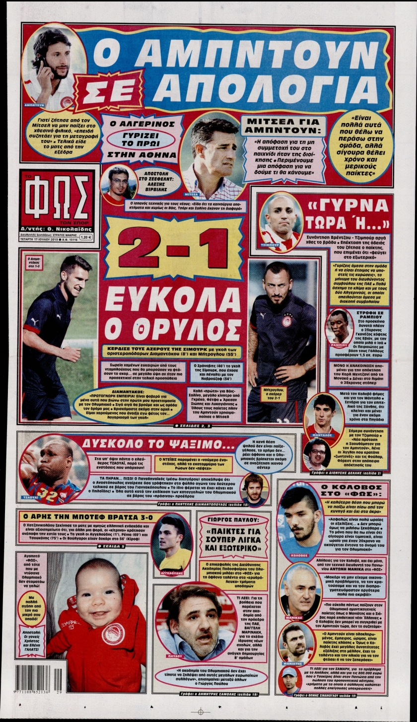 Οι αθλητικές εφημερίδες Enikos Newsroom 08:33, Τετάρτη 17 Ιουλίου 2013 Media Οι αθλητικές εφημερίδες Διαβάστε τα πρωτοσέλιδα των αθλητικών εφημερίδων: ΑΘΛΗΤΙΚΕΣ ΕΦΗΜΕΡΙΔΕΣ ΕΦΗΜΕΡΙΔΕΣ ΠΡΩΤΟΣΕΛΙΔΑ Μοιράσου το: σχολίασε κι εσύ (0 σχόλια) Ακολουθήστε το enikos.gr στο Google News και μάθετε πρώτοι όλες τις ειδήσεις Δείτε όλες τις τελευταίες ειδήσεις από την Ελλάδα και τον Κόσμο στο enikos.gr Ειδήσεις Ροή Ειδήσεων 2 ώρες πριν Αυξάνουν την πίεση προς την κυβέρνηση οι αγρότες: Κλείνουν παρακαμπτήριους και ανοίγουν διόδια – Τι θα γίνει τις γιορτές 48 λεπτά πριν ΟΠΕΚΕΠΕ: Προφυλακιστέος ο φερόμενος αρχηγός και ο λογιστής της εγκληματικής οργάνωσης 2 ώρες πριν Φοινικούντα: Το Σάββατο απολογείται ο 30χρονος γιος γνωστού επιχειρηματία της Πλάκας που παραδόθηκε – Όσα είπε στους αστυνομικούς και ο ρόλος του στο έγκλημα 1 ώρα πριν Μπορεί ο Μαδούρο να αντέξει τον αποκλεισμό του Τραμπ; Τι θα χρειαστεί η Ουάσινγκτον για να τον ανατρέψει 3 ώρες πριν Πρίγκιπας Ουίλιαμ – Κέιτ: Η νέα οικογενειακή φωτογραφία για τις Χριστουγεννιάτικες κάρτες του 2025 3 ώρες πριν Ύπνος: Η απλή βραδινή ρουτίνα για να προστατεύσετε τα μαλλιά σας από το κρύο κατά τη διάρκεια του χειμώνα 4 ώρες πριν Manifesting: Πώς να συναντήσετε τον σύντροφο της ζωής σας, ανάλογα με τον μήνα γέννησής σας 2 ημέρες πριν 20 χρόνια τα Χριστούγεννα ξεκινούν στα Public με μεγάλη ποικιλία σε δώρα! 2 ώρες πριν Αρχαιολόγοι ανακάλυψαν ρωμαϊκά τεχνουργήματα από μια πόλη που δεν υπήρξε ποτέ – Τα τρία εντυπωσιακά κτίρια και ο αμφορέας με τις… σαρδέλες 28 λεπτά πριν ΑΕΚ – Κραϊόβα 3-2: Επική ανατροπή και πρόκριση στους «16» του Conference League η Ένωση 48 λεπτά πριν ΟΠΕΚΕΠΕ: Προφυλακιστέος ο φερόμενος αρχηγός και ο λογιστής της εγκληματικής οργάνωσης 58 λεπτά πριν Αθηνά Μαξίμου: Η τρυφερή ανάρτηση για τα γενέθλια του Αιμίλιου Χειλάκη – «Είναι η εκλεκτική συγγένειά μου, η επιλογή και η ευθύνη μου» 1 ώρα πριν Παναθηναϊκός – Χάποελ Τελ Αβίβ 93-82: Με… φόρα από την Κωνσταντινούπολη 1 ώρα πριν Μπορεί ο Μαδούρο να αντέξει τον αποκλεισμό του Τραμπ; Τι θα χρειαστεί η Ουάσινγκτον για να τον ανατρέψει ENIKOS NETWORK Σε περίοδο αυξημένης δραστηριότητας η γρίπη στην Ελλάδα-Μέτρα προστασίας από τον ΕΟΔΥ Σκέφτεστε συνέχεια συζητήσεις που έχετε κάνει; Τι σημαίνει αυτό, σύμφωνα με ειδικό Στεγαστικό: Τι λέει η ΠΟΜΙΔΑ για τα νέα μέτρα που ανακοίνωσε ο Κυριάκος Μητσοτάκης Λαγκάρντ: Αισιόδοξη για την ανάπτυξη της Ευρωζώνης, αβέβαιη για τον πληθωρισμό Χαρτογραφώντας το «σημείο χωρίς επιστροφή»: Για πρώτη φορά αποκαλύπτεται με λεπτομέρεια το ακανθώδες όριο της ατμόσφαιρας τ... Η Google καταργεί τη λειτουργία «dark web report» – Πώς θα μπορούν οι χρήστες να διαγράφουν τα δεδομένα τους περισσότερα 17:45 , Πέμπτη 18 Δεκεμβρίου 2025 ROUK ZOUK: Εορταστικό επεισόδιο με καλεσμένους τους πρωταγωνιστές του «Γιατί ρε πατέρα» Το Σάββατο 20 Δεκεμβρίου στις 21:00, η Ζέτα Μακρυπούλια υποδέχεται εκλεκτούς ηθοποιούς που όλο... 17:20 , Πέμπτη 18 Δεκεμβρίου 2025 Άγιος έρωτας: Η Χριστίνα εξομολογείται στον πατέρα Νικόλαο, απόψε στις 21:00 στον Alpha Η Νότα αποφασίζει να εκδικηθεί τον Πέτρο και τον Στέφανο, για χάρη του Λούη, όμως τα πράγματα ... 16:50 , Πέμπτη 18 Δεκεμβρίου 2025 Να μ’ αγαπάς: Ζωή και Φωτεινή συμφιλιώνονται ως μάνα με κόρη, απόψε στις 20:00 Η ταυτότητα του Άγγελου αποκαλύπτεται στο νέο επεισόδιο της σειράς “Να μ’ αγαπάς... 15:52 , Πέμπτη 18 Δεκεμβρίου 2025 Το Σπίτι Δίπλα Στο Ποτάμι: Το καθηλωτικό τελευταίο επεισόδιο για το 2025 απόψε στις 22:30 Καθηλ