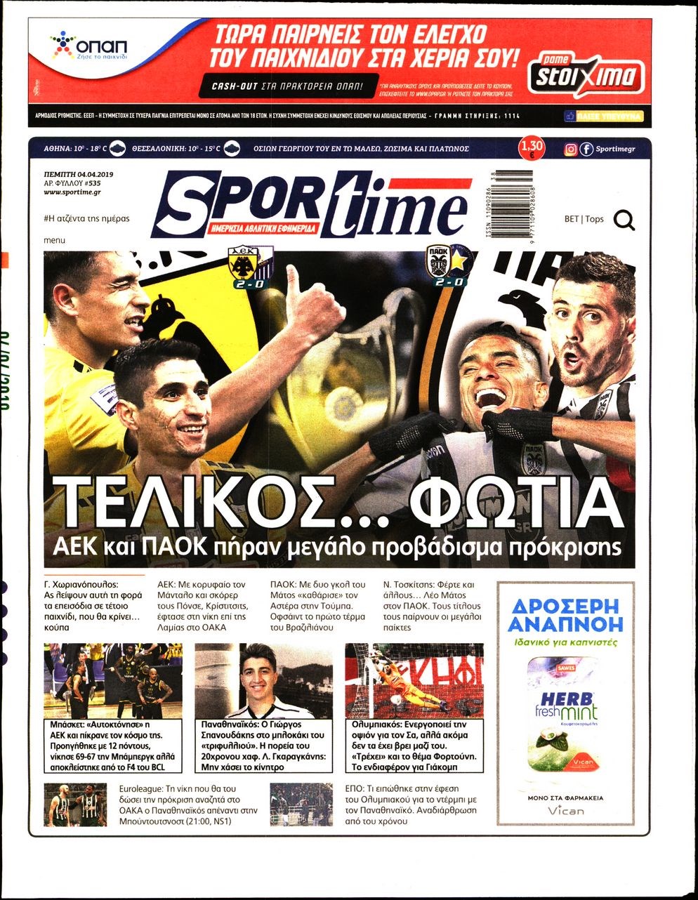 Οι αθλητικές εφημερίδες 4/4/2019 Enikos Newsroom 06:53, Πέμπτη 04 Απριλίου 2019 Media Διαβάστε τα πρωτοσέλιδα των αθλητικών εφημερίδων: ΑΘΛΗΤΙΚΕΣ ΕΦΗΜΕΡΙΔΕΣ ΠΡΩΤΟΣΕΛΙΔΑ Μοιράσου το: σχολίασε κι εσύ (0 σχόλια) Ακολουθήστε το enikos.gr στο Google News και μάθετε πρώτοι όλες τις ειδήσεις Δείτε όλες τις τελευταίες ειδήσεις από την Ελλάδα και τον Κόσμο στο enikos.gr Ειδήσεις Ροή Ειδήσεων 8 ώρες πριν Χριστούγεννα στα μπλόκα: Επιμένουν στις κινητοποιήσεις τους οι αγρότες – Ανοίγουν τα διόδια το Σαββατοκύριακο 8 ώρες πριν Ουκρανία: Η άνευ προηγουμένου επίθεση σε ρωσικό τάνκερ στη Μεσόγειο και το μήνυμα προς στον Πούτιν – Το «μακρύ χέρι» του Κιέβου 7 ώρες πριν Πούτιν: Τα μηνύματα σε Ευρώπη και ΝΑΤΟ από το μαραθώνιο «σόου» του – Η απαίτηση για «σεβασμό» και η ειρήνη «με τους όρους» της Μόσχας 6 ώρες πριν ΗΠΑ: Η κυβέρνηση του Ντόναλντ Τραμπ άρχισε να δημοσιοποιεί τα αρχεία Έπσταϊν 7 ώρες πριν Άνω Λιόσια: Πυροβολισμοί σε επιχείρηση με χαλιά – Εντοπίστηκαν 10 κάλυκες 14 λεπτά πριν Αυγά: Πόσα μπορείτε να τρώτε την ημέρα με ασφάλεια για μέγιστη πρόσληψη πρωτεΐνης 44 λεπτά πριν Τα ζώδια σήμερα, Σάββατο 20 Δεκεμβρίου: Παρθένοι, το σύμπαν σας δίνει το κλειδί 7 ώρες πριν Ανακαλύφθηκαν αρχαία χρυσά νομίσματα 2.200 ετών που απεικονίζουν τον θεό Απόλλωνα – Η άγνωστη σύνδεση με τον Φίλιππο Β΄ της Μακεδονίας 8 ώρες πριν Ύπνος: Μια κρυφή κατάσταση του εγκεφάλου πριν από τον ύπνο μπορεί να είναι το “κλειδί” για υψηλή ευφυΐα και δημιουργικότητα 5 λεπτά πριν Σαρωτικοί οι έλεγχοι στους δρόμους ενόψει εορτών – Μπλόκα της τροχαίας σε κεντρικές αρτηρίες της Αττικής 14 λεπτά πριν Αυγά: Πόσα μπορείτε να τρώτε την ημέρα με ασφάλεια για μέγιστη πρόσληψη πρωτεΐνης 20 λεπτά πριν Σαν σήμερα 20 Δεκεμβρίου: Τα σημαντικότερα γεγονότα της ημέρας 25 λεπτά πριν Οι οικονομικές εφημερίδες 20/12/2025 30 λεπτά πριν Οι αθλητικές εφημερίδες 20/12/2025 ENIKOS NETWORK Το ΕΚΑΒ τιμήθηκε από την Ακαδημία Αθηνών για τα 40 χρόνια προσφοράς του Έχετε πραγματικά μεγάλη καρδιά; 10 χαρακτηριστικά όσων έχουν καλοσύνη Αναστολή μέτρων αναγκαστικής εκτέλεσης για κτηνοτρόφους που πλήττονται από την ευλογιά των αιγοπροβάτων Πλήρης επάρκεια προϊόντων στις λαϊκές της Αττικής, παρά τις αγροτικές κινητοποιήσεις – Τι απαντούν οι πωλητές Χαρτογραφώντας το «σημείο χωρίς επιστροφή»: Για πρώτη φορά αποκαλύπτεται με λεπτομέρεια το ακανθώδες όριο της ατμόσφαιρας τ... Η Google καταργεί τη λειτουργία «dark web report» – Πώς θα μπορούν οι χρήστες να διαγράφουν τα δεδομένα τους περισσότερα 05:48 , Σάββατο 20 Δεκεμβρίου 2025 Οι οικονομικές εφημερίδες 20/12/2025 Διαβάστε τα πρωτοσέλιδα από τις οικονομικές εφημερίδες, σήμερα 20/12/2025. 05:43 , Σάββατο 20 Δεκεμβρίου 2025 Οι αθλητικές εφημερίδες 20/12/2025 Διαβάστε τα πρωτοσέλιδα από τις αθλητικές εφημερίδες, σήμερα 20/12/2025. 05:38 , Σάββατο 20 Δεκεμβρίου 2025 Οι πολιτικές εφημερίδες 20/12/2025 Διαβάστε τα πρωτοσέλιδα από τις πολιτικές εφημερίδες, σήμερα 20/12/2025. 04:20 , Σάββατο 20 Δεκεμβρίου 2025 Αγγελική Νικολούλη: Τα συλλυπητήρια για την απώλεια της Ειρήνης Μαρινάκη Τα συλληπητήρια στον πρόεδρο του Mega, τον Βαγγέλη Μαρινάκη, για την απώλεια της μητέρας του Ε... ΤΕΛΕΥΤΑΙΕΣ ΕΙΔΗΣΕΙΣ 5 λεπτά πριν Σαρωτικοί οι έλεγχοι στους δρόμους ενόψει εορτών –... 14 λεπτά πριν Αυγά: Πόσα μπορείτε να τρώτε την ημέρα με ασφάλεια για... 20 λεπτά πριν Σαν σήμερα 20 Δεκεμβρίου: Τα σημαντικότερα γεγονότα... 25 λεπτά πριν Οι οικονομικές εφημερίδες 20/12/2025 30 λεπτά πριν Οι αθλητικές εφημερίδες 20/12/2025 35 λεπτά πρ