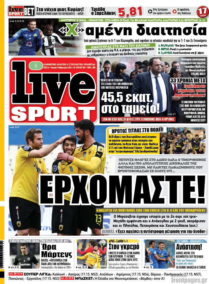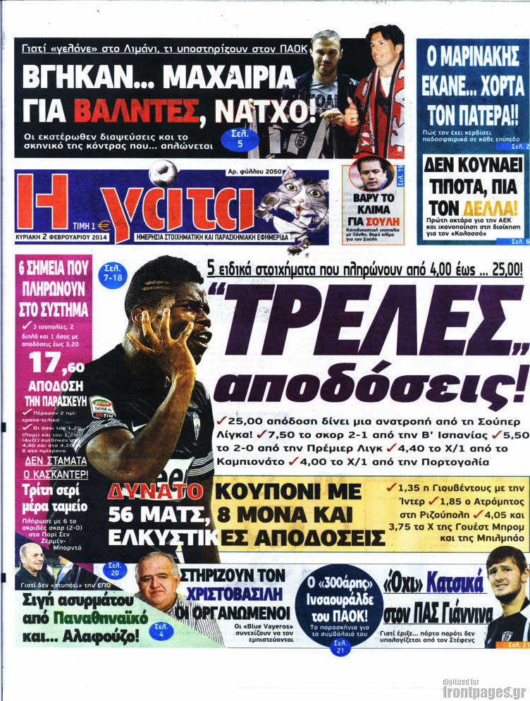 Οι αθλητικές εφημερίδες Enikos Newsroom 07:46, Κυριακή 02 Φεβρουαρίου 2014 Media Οι αθλητικές εφημερίδες ΑΘΛΗΤΙΚΕΣ ΕΦΗΜΕΡΙΔΕΣ ΕΦΗΜΕΡΙΔΕΣ Μοιράσου το: σχολίασε κι εσύ (0 σχόλια) Ακολουθήστε το enikos.gr στο Google News και μάθετε πρώτοι όλες τις ειδήσεις Δείτε όλες τις τελευταίες ειδήσεις από την Ελλάδα και τον Κόσμο στο enikos.gr Ειδήσεις Ροή Ειδήσεων 5 ώρες πριν Εκτός ευρωομάδας ΣΥΡΙΖΑ ο Νίκος Παππάς μετά την επίθεση στον δημοσιογράφο Νίκο Γιαννόπουλο – Η μήνυση και οι νέες δηλώσεις 6 ώρες πριν «Αγριεύουν» οι αγρότες: «Δεν συντρέχει λόγος συνάντησης με τον πρωθυπουργό» – Ώρα αποφάσεων στη σύσκεψη της Πέμπτης 5 ώρες πριν Κυψέλη: Χωρίς την οικογένειά της δίπλα της απολογήθηκε η 16χρονη – «Της είχε επιτεθεί κάποιος για να την βιάσει, φοβήθηκε και κυκλοφορούσε με μαχαίρι» 5 ώρες πριν Politico: Το πρόβλημα της Ευρώπης δεν είναι το Βέλγιο αλλά ο Ντόναλντ Τραμπ 7 ώρες πριν Αλεξανδρούπολη: Πολυοργανική ανεπάρκεια λόγω υποσιτισμού η αιτία θανάτου του 3χρονου αγοριού 5 ώρες πριν Μυστήριο με τεράστιες κυκλικές πέτρες 200 κιλών – Ανακαλύφθηκαν τυχαία κατά τη διάρκεια οδικών έργων και κανείς δεν ξέρει από πού προέρχονται 6 ώρες πριν Ύπνος: Ειδικός εξηγεί τον πραγματικό λόγο που ξυπνάτε στις 4 τα ξημερώματα – Ο ρόλος των ορμονών και του κιρκάδιου ρυθμού 7 ώρες πριν Αριθμολογία: Οι άνθρωποι που έχουν γεννηθεί αυτές τις 4 ημερομηνίες, είναι τρυφεροί και αγαπούν ανιδιοτελώς 19 ώρες πριν 20 χρόνια τα Χριστούγεννα ξεκινούν στα Public με μεγάλη ποικιλία σε δώρα! 16 λεπτά πριν Αλ Τσαντίρι Νιουζ: «Λύγισε» ο Δημήτρης Λάλος για τον Δημήτρη Ήμελλο – «Τον μνημονεύω, να ‘ναι καλά εκεί που είναι» 31 λεπτά πριν GNTM: Με δάκρυα τον αποχαιρέτησε η Ηλιάνα Παπαγεωργίου πριν από τον ημιτελικό – «Αισθάνομαι πολύ παράξενα» 46 λεπτά πριν Αμερικανικά στρατεύματα στον Ισημερινό για «προσωρινή» επιχείρηση κατά των ναρκωτικών 1 ώρα πριν Βραζιλία: Το Κογκρέσο ενέκρινε σχέδιο νόμου για τη μείωση της ποινής του πρώην προέδρου Μπολσονάρου 1 ώρα πριν Ένταση στο περιφερειακό συμβούλιο Δυτικής Μακεδονίας: Φωνές, σπρωξιές και διακοπή – Δείτε βίντεο ENIKOS NETWORK Αϋπνία: Το κόλπο που θα σας βοηθήσει να κοιμηθείτε απόψε – Είναι απλό και έχει αποτέλεσμα 2,6 εκατομμύρια πολίτες έχουν ήδη εμβολιαστεί κατά της γρίπης ΕΛΣΤΑΤ: Τι δείχνουν τα νέα στοιχεία για τις ηλεκτρονικές παραγγελίες των επιχειρήσεων ΚΕΠΕ: Οι 3 διακριτές συμβολές των ΜμΕ και της μεταποίησης στην ελληνική οικονομία Χαρτογραφώντας το «σημείο χωρίς επιστροφή»: Για πρώτη φορά αποκαλύπτεται με λεπτομέρεια το ακανθώδες όριο της ατμόσφαιρας τ... Η Google καταργεί τη λειτουργία «dark web report» – Πώς θα μπορούν οι χρήστες να διαγράφουν τα δεδομένα τους περισσότερα 02:30 , Πέμπτη 18 Δεκεμβρίου 2025 Αλ Τσαντίρι Νιουζ: Η κόρη της Πάολα στο κοινό – Η ατάκα Λαζόπουλου που την έκανε να «κοκκινήσει» Γιορτινή διάθεση και ευχάριστες στιγμές γέμισε η αποψινή, τελευταία για το 2025, εκπομπή του «... 22:24 , Τετάρτη 17 Δεκεμβρίου 2025 Το Σπίτι Δίπλα Στο Ποτάμι: Σε κίνδυνο η υγεία του Απόστολου – Τι θα δούμε απόψε “Το Σπίτι Δίπλα στο Ποτάμι” ξετυλίγει το νήμα της ζωής των πέντε αδελφών με καταισ... 21:14 , Τετάρτη 17 Δεκεμβρίου 2025 Παιχνίδια Εκδίκησης: Θα καταφέρει ο Χρήστος να κλονίσει την εμπιστοσύνη της Μάγιας απέναντι στον Άγη; Τα «Παιχνίδια Εκδίκησης» έρχονται απόψε στις 22:30, στον Αντ1, με το τελευταίο επεισόδιο της χ... 20:57 , Τετάρτη 17 Δεκεμβρίου 2025 Άγιος Έρωτας: Η Χλόη καταθέτει εναντίον του πατέρα της και ο Χάρ