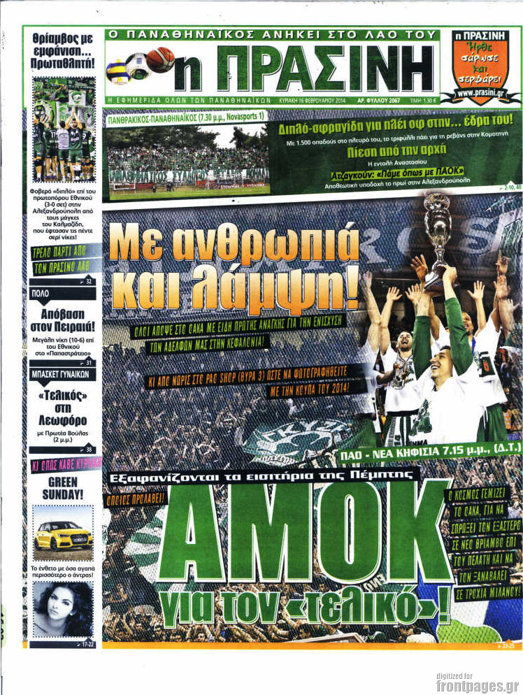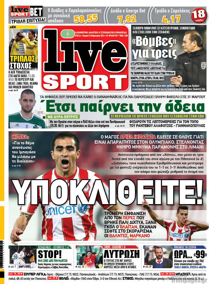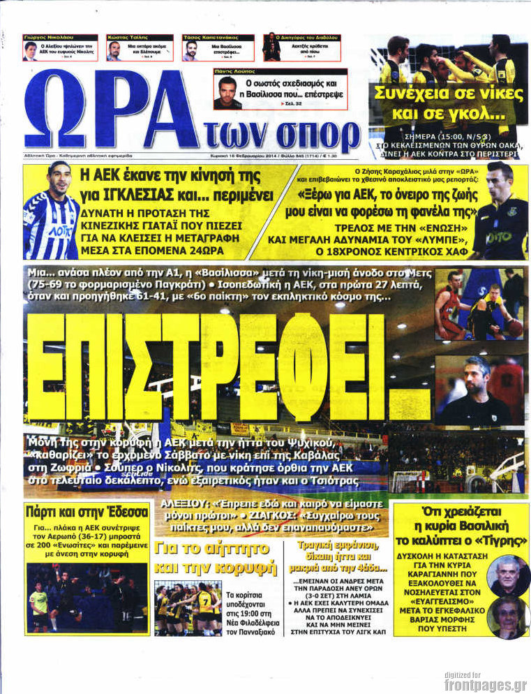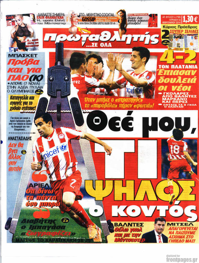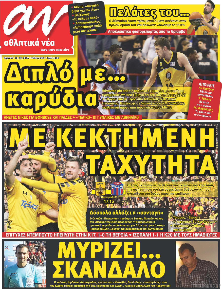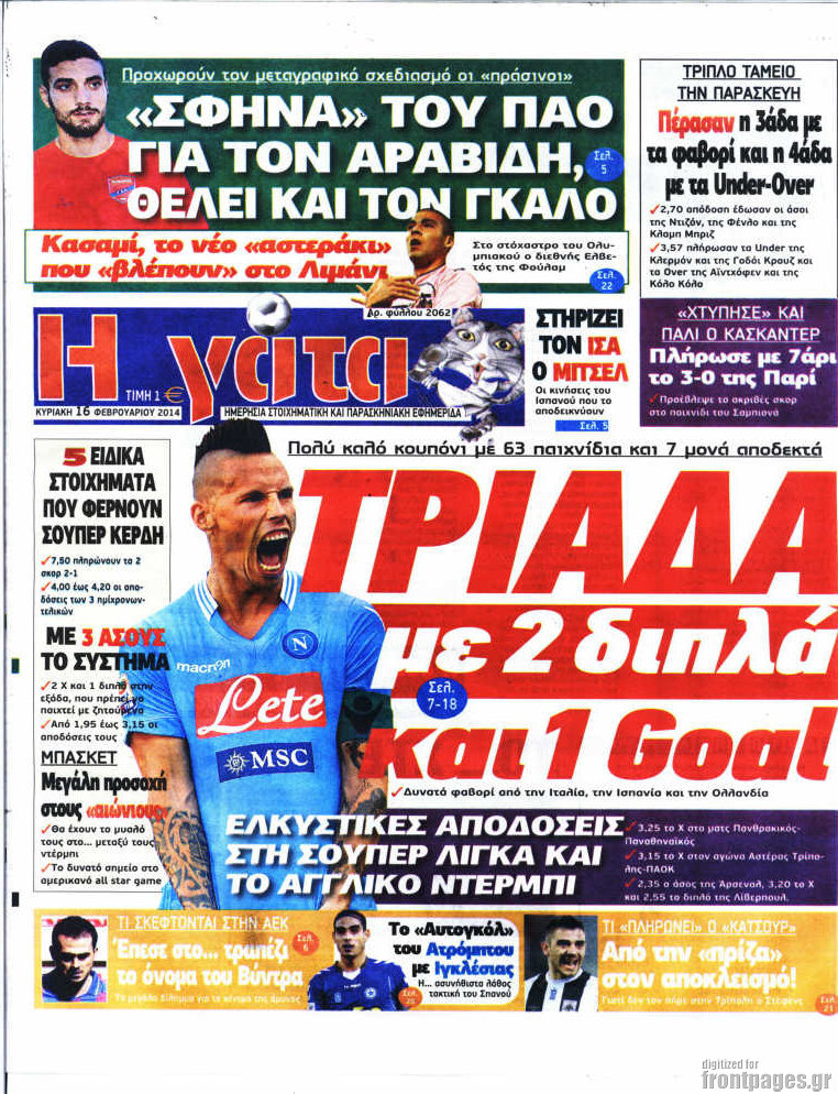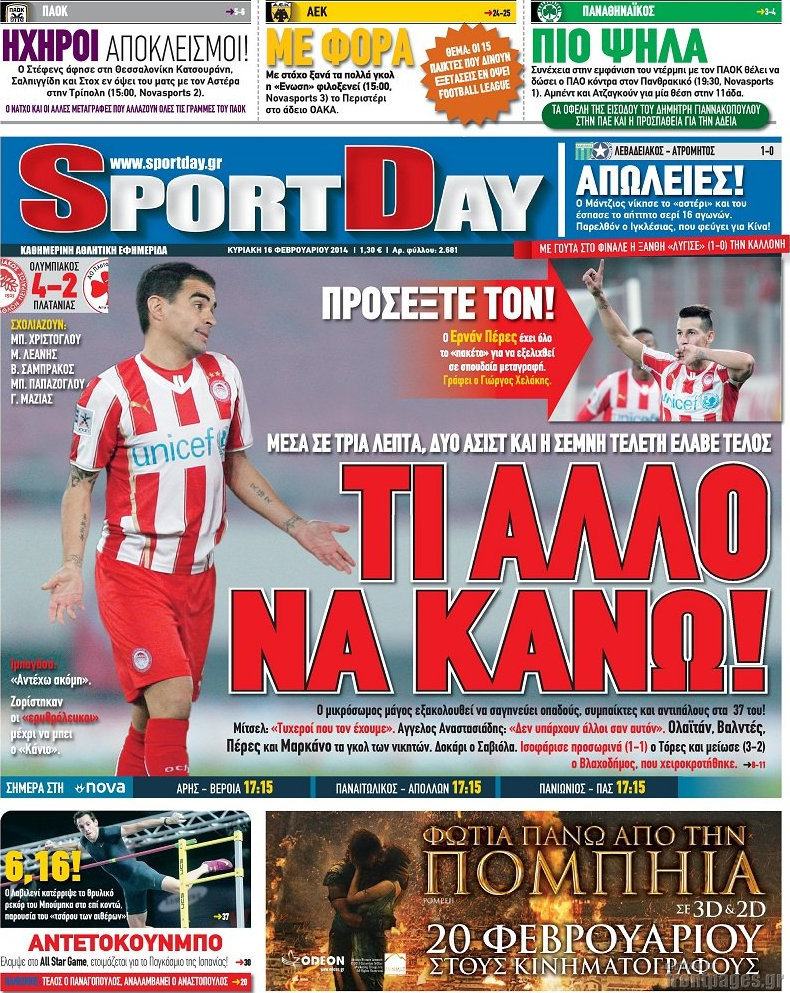 Οι αθλητικές εφημερίδες Enikos Newsroom 08:17, Κυριακή 16 Φεβρουαρίου 2014 Media Οι αθλητικές εφημερίδες ΑΘΛΗΤΙΚΕΣ ΕΦΗΜΕΡΙΔΕΣ ΕΦΗΜΕΡΙΔΕΣ Μοιράσου το: σχολίασε κι εσύ (0 σχόλια) Ακολουθήστε το enikos.gr στο Google News και μάθετε πρώτοι όλες τις ειδήσεις Δείτε όλες τις τελευταίες ειδήσεις από την Ελλάδα και τον Κόσμο στο enikos.gr Ειδήσεις Ροή Ειδήσεων 3 ώρες πριν Χριστούγεννα στα μπλόκα: Επιμένουν στις κινητοποιήσεις τους οι αγρότες – Ανοίγουν τα διόδια το Σαββατοκύριακο 3 ώρες πριν Ουκρανία: Η άνευ προηγουμένου επίθεση σε ρωσικό τάνκερ στη Μεσόγειο και το μήνυμα προς στον Πούτιν – Το «μακρύ χέρι» του Κιέβου 3 ώρες πριν Πούτιν: Τα μηνύματα σε Ευρώπη και ΝΑΤΟ από το μαραθώνιο «σόου» του – Η απαίτηση για «σεβασμό» και η ειρήνη «με τους όρους» της Μόσχας 3 ώρες πριν Τραμπ: Δεν αποκλείει την πιθανότητα ενός πολέμου στη Βενεζουέλα – «Ο Μαδούρο ξέρει καλύτερα από τον καθένα τι ακριβώς θέλω» 4 ώρες πριν Συνεχίζει να προκαλεί ο Μίτσκοσκι: «Για μένα το όνομα Μακεδονία είναι ιερό» 3 ώρες πριν Ανακαλύφθηκαν αρχαία χρυσά νομίσματα 2.200 ετών που απεικονίζουν τον θεό Απόλλωνα – Η άγνωστη σύνδεση με τον Φίλιππο Β΄ της Μακεδονίας 4 ώρες πριν Ύπνος: Μια κρυφή κατάσταση του εγκεφάλου πριν από τον ύπνο μπορεί να είναι το “κλειδί” για υψηλή ευφυΐα και δημιουργικότητα 5 ώρες πριν Αριθμολογία: Οι άνθρωποι που έχουν γεννηθεί αυτές τις 4 ημερομηνίες, συχνά παρεξηγούνται – «Η καλοσύνη τους κρύβει τεράστια δύναμη» 6 ώρες πριν Ξεχάστε το καθάρισμα το Σαββατοκύριακο: Ο «κανόνας των 20 λεπτών» που θα σας λύσει τα χέρια 13 λεπτά πριν Euroleague: Επέστρεψε στις νίκες ο Ολυμπιακός, πήρε την ματσάρα της χρονιάς η Μπάρτσα – Τα αποτελέσματα και η βαθμολογία 28 λεπτά πριν Συρία: Μαζικά πλήγματα των ΗΠΑ σε θέσεις του Ισλαμικού Κράτους – Χέγκσεθ: «Δεν είναι αρχή πολέμου, είναι μια δήλωση εκδίκησης» για το θάνατο των στρατιωτών μας 41 λεπτά πριν Ουκρανία: Ολοκληρώθηκαν οι συνομιλίες με τους Αμερικανούς κι Ευρωπαίους διαπραγματευτές 56 λεπτά πριν Μπαρτσελόνα – Μπασκόνια 134-124: Οι «μπλαουγκράνα» πήραν το ματς της χρονιάς ύστερα από τρεις παρατάσεις 1 ώρα πριν Φαίη Σκορδά: «Παλιότερα τα κομπλιμέντα τα προσπερνούσα, τώρα τα έχω ανάγκη» ENIKOS NETWORK Το ΕΚΑΒ τιμήθηκε από την Ακαδημία Αθηνών για τα 40 χρόνια προσφοράς του Έχετε πραγματικά μεγάλη καρδιά; 10 χαρακτηριστικά όσων έχουν καλοσύνη Αναστολή μέτρων αναγκαστικής εκτέλεσης για κτηνοτρόφους που πλήττονται από την ευλογιά των αιγοπροβάτων Πλήρης επάρκεια προϊόντων στις λαϊκές της Αττικής, παρά τις αγροτικές κινητοποιήσεις – Τι απαντούν οι πωλητές Χαρτογραφώντας το «σημείο χωρίς επιστροφή»: Για πρώτη φορά αποκαλύπτεται με λεπτομέρεια το ακανθώδες όριο της ατμόσφαιρας τ... Η Google καταργεί τη λειτουργία «dark web report» – Πώς θα μπορούν οι χρήστες να διαγράφουν τα δεδομένα τους περισσότερα 22:42 , Παρασκευή 19 Δεκεμβρίου 2025 Γιώργος Γιαννόπουλος για “Το σόι σου”: “Είναι ευτυχία και ευλογία αυτή η σειρά” «Είναι ευτυχία και ευλογία η συγκυρία αυτής της σειράς», θα πει ο Γιώργος Γιαννόπουλος -ο αγαπ... 20:37 , Παρασκευή 19 Δεκεμβρίου 2025 Don’t Forget The Lyrics: Η Έλλη Κοκκίνου υποδέχεται 4 παίκτες που θα κάνουν τα πάντα για να μη χάσουν ούτε… μισή λέξη από τους στίχους Το «Don’t Forget The Lyrics» επιστρέφει απόψε, Παρασκευή 19 Δεκεμβρίου, στις 21:00 με νέο επει... 19:31 , Παρασκευή 19 Δεκεμβρίου 2025 GNTM: Απόψε ο μεγάλος τελικός για τους 4 φιναλίστ Έπειτα από μήνες γεμάτους μόδα, δημιουργία και έντονες αναμετρήσεις, 