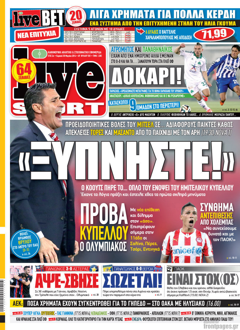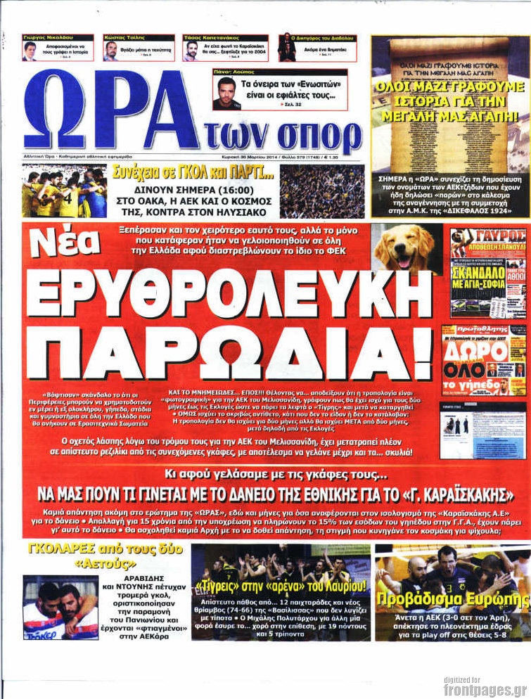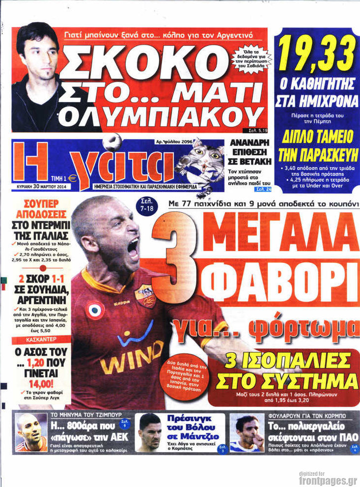 Οι αθλητικές εφημερίδες Enikos Newsroom 08:06, Κυριακή 30 Μαρτίου 2014 Media Οι αθλητικές εφημερίδες ΑΘΛΗΤΙΚΕΣ ΕΦΗΜΕΡΙΔΕΣ Μοιράσου το: σχολίασε κι εσύ (0 σχόλια) Ακολουθήστε το enikos.gr στο Google News και μάθετε πρώτοι όλες τις ειδήσεις Δείτε όλες τις τελευταίες ειδήσεις από την Ελλάδα και τον Κόσμο στο enikos.gr Ειδήσεις Ροή Ειδήσεων 3 ώρες πριν Αυξάνουν την πίεση προς την κυβέρνηση οι αγρότες: Κλείνουν παρακαμπτήριους και ανοίγουν διόδια – Τι θα γίνει τις γιορτές 2 ώρες πριν ΟΠΕΚΕΠΕ: Προφυλακιστέος ο φερόμενος αρχηγός και ο λογιστής της εγκληματικής οργάνωσης 3 ώρες πριν Φοινικούντα: Το Σάββατο απολογείται ο 30χρονος γιος γνωστού επιχειρηματία της Πλάκας που παραδόθηκε – Όσα είπε στους αστυνομικούς και ο ρόλος του στο έγκλημα 2 ώρες πριν Μπορεί ο Μαδούρο να αντέξει τον αποκλεισμό του Τραμπ; Τι θα χρειαστεί η Ουάσινγκτον για να τον ανατρέψει 4 ώρες πριν Πρίγκιπας Ουίλιαμ – Κέιτ: Η νέα οικογενειακή φωτογραφία για τις Χριστουγεννιάτικες κάρτες του 2025 3 ώρες πριν Ύπνος: Η απλή βραδινή ρουτίνα για να προστατεύσετε τα μαλλιά σας από το κρύο κατά τη διάρκεια του χειμώνα 4 ώρες πριν Manifesting: Πώς να συναντήσετε τον σύντροφο της ζωής σας, ανάλογα με τον μήνα γέννησής σας 2 ημέρες πριν 20 χρόνια τα Χριστούγεννα ξεκινούν στα Public με μεγάλη ποικιλία σε δώρα! 2 ώρες πριν Αρχαιολόγοι ανακάλυψαν ρωμαϊκά τεχνουργήματα από μια πόλη που δεν υπήρξε ποτέ – Τα τρία εντυπωσιακά κτίρια και ο αμφορέας με τις… σαρδέλες 1 λεπτό πριν Σύνοδος Κορυφής στις Βρυξέλλες: Ακόμη πιο κοντά σε διέξοδο για τη χρηματοδότηση της Ουκρανίας 10 λεπτά πριν ΟΗΕ: Iστορική επίσκεψη του Συμβουλίου Ασφαλείας στη Δαμασκό – Mήνυμα Ελλάδας για συμπερίληψη και λογοδοσία 17 λεπτά πριν Νέος πρέσβης της Μεγάλης Βρετανίας στις ΗΠΑ ο Κρίστιαν Τέρνερ 20 λεπτά πριν Conference League: Με Νόα, Ντρίτα, Άλκμααρ ή Τσέλιε στους «16» η ΑΕΚ 29 λεπτά πριν Conference League: Απευθείας στους «16» η ΑΕΚ Λάρνακας και η Ρακόβ των Σβάρνα και Κωνσταντόπουλου – Τα αποτελέσματα και η βαθμολογία, 3η η ΑΕΚ ENIKOS NETWORK Σε περίοδο αυξημένης δραστηριότητας η γρίπη στην Ελλάδα-Μέτρα προστασίας από τον ΕΟΔΥ Σκέφτεστε συνέχεια συζητήσεις που έχετε κάνει; Τι σημαίνει αυτό, σύμφωνα με ειδικό Στεγαστικό: Τι λέει η ΠΟΜΙΔΑ για τα νέα μέτρα που ανακοίνωσε ο Κυριάκος Μητσοτάκης Λαγκάρντ: Αισιόδοξη για την ανάπτυξη της Ευρωζώνης, αβέβαιη για τον πληθωρισμό Χαρτογραφώντας το «σημείο χωρίς επιστροφή»: Για πρώτη φορά αποκαλύπτεται με λεπτομέρεια το ακανθώδες όριο της ατμόσφαιρας τ... Η Google καταργεί τη λειτουργία «dark web report» – Πώς θα μπορούν οι χρήστες να διαγράφουν τα δεδομένα τους περισσότερα 17:45 , Πέμπτη 18 Δεκεμβρίου 2025 ROUK ZOUK: Εορταστικό επεισόδιο με καλεσμένους τους πρωταγωνιστές του «Γιατί ρε πατέρα» Το Σάββατο 20 Δεκεμβρίου στις 21:00, η Ζέτα Μακρυπούλια υποδέχεται εκλεκτούς ηθοποιούς που όλο... 17:20 , Πέμπτη 18 Δεκεμβρίου 2025 Άγιος έρωτας: Η Χριστίνα εξομολογείται στον πατέρα Νικόλαο, απόψε στις 21:00 στον Alpha Η Νότα αποφασίζει να εκδικηθεί τον Πέτρο και τον Στέφανο, για χάρη του Λούη, όμως τα πράγματα ... 16:50 , Πέμπτη 18 Δεκεμβρίου 2025 Να μ’ αγαπάς: Ζωή και Φωτεινή συμφιλιώνονται ως μάνα με κόρη, απόψε στις 20:00 Η ταυτότητα του Άγγελου αποκαλύπτεται στο νέο επεισόδιο της σειράς “Να μ’ αγαπάς... 15:52 , Πέμπτη 18 Δεκεμβρίου 2025 Το Σπίτι Δίπλα Στο Ποτάμι: Το καθηλωτικό τελευταίο επεισόδιο για το 2025 απόψε στις 22:30 Καθηλώνει το σημερινό επεισόδιο της σειράς “Το Σπίτι Δίπλα Στο Ποτάμι” που έρχεται... ΤΕΛΕΥΤΑΙ