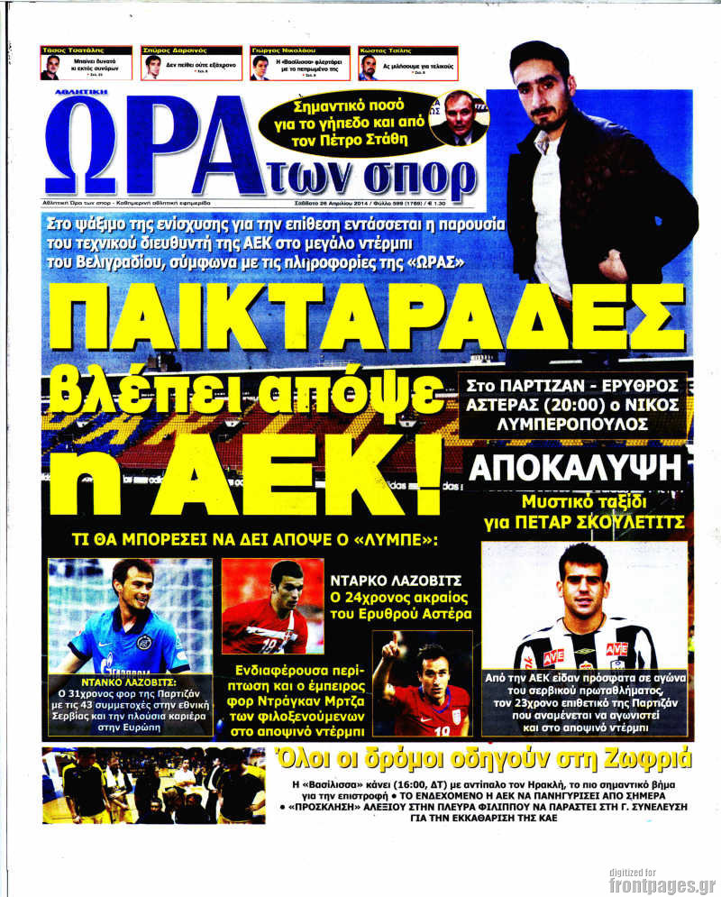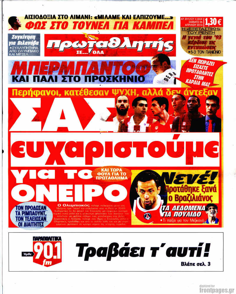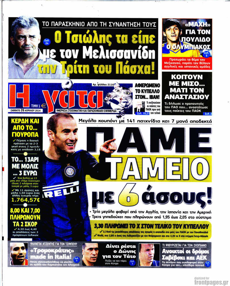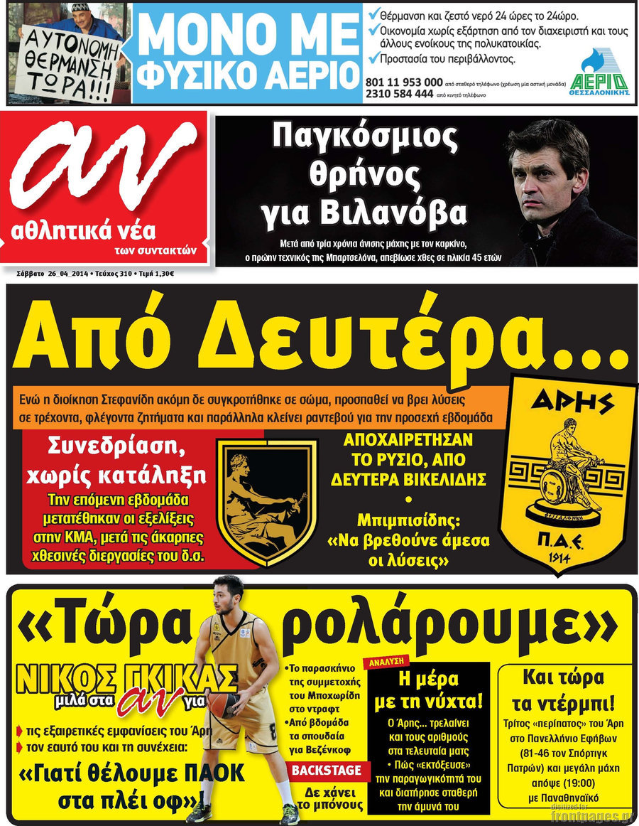 Οι αθλητικές εφημερίδες Enikos Newsroom 07:55, Σάββατο 26 Απριλίου 2014 Media Οι αθλητικές εφημερίδες ΑΘΛΗΤΙΚΕΣ ΕΦΗΜΕΡΙΔΕΣ ΕΦΗΜΕΡΙΔΕΣ Μοιράσου το: σχολίασε κι εσύ (0 σχόλια) Ακολουθήστε το enikos.gr στο Google News και μάθετε πρώτοι όλες τις ειδήσεις Δείτε όλες τις τελευταίες ειδήσεις από την Ελλάδα και τον Κόσμο στο enikos.gr Ειδήσεις Ροή Ειδήσεων 2 ώρες πριν Αυξάνουν την πίεση προς την κυβέρνηση οι αγρότες: Κλείνουν παρακαμπτήριους και ανοίγουν διόδια – Τι θα γίνει τις γιορτές 41 λεπτά πριν ΟΠΕΚΕΠΕ: Προφυλακιστέος ο φερόμενος αρχηγός και ο λογιστής της εγκληματικής οργάνωσης 2 ώρες πριν Φοινικούντα: Το Σάββατο απολογείται ο 30χρονος γιος γνωστού επιχειρηματία της Πλάκας που παραδόθηκε – Όσα είπε στους αστυνομικούς και ο ρόλος του στο έγκλημα 1 ώρα πριν Μπορεί ο Μαδούρο να αντέξει τον αποκλεισμό του Τραμπ; Τι θα χρειαστεί η Ουάσινγκτον για να τον ανατρέψει 3 ώρες πριν Πρίγκιπας Ουίλιαμ – Κέιτ: Η νέα οικογενειακή φωτογραφία για τις Χριστουγεννιάτικες κάρτες του 2025 2 ώρες πριν Ύπνος: Η απλή βραδινή ρουτίνα για να προστατεύσετε τα μαλλιά σας από το κρύο κατά τη διάρκεια του χειμώνα 3 ώρες πριν Manifesting: Πώς να συναντήσετε τον σύντροφο της ζωής σας, ανάλογα με τον μήνα γέννησής σας 2 ημέρες πριν 20 χρόνια τα Χριστούγεννα ξεκινούν στα Public με μεγάλη ποικιλία σε δώρα! 1 ώρα πριν Αρχαιολόγοι ανακάλυψαν ρωμαϊκά τεχνουργήματα από μια πόλη που δεν υπήρξε ποτέ – Τα τρία εντυπωσιακά κτίρια και ο αμφορέας με τις… σαρδέλες 21 λεπτά πριν ΑΕΚ – Κραϊόβα 3-2: Επική ανατροπή και πρόκριση στους «16» του Conference League η Ένωση 41 λεπτά πριν ΟΠΕΚΕΠΕ: Προφυλακιστέος ο φερόμενος αρχηγός και ο λογιστής της εγκληματικής οργάνωσης 51 λεπτά πριν Αθηνά Μαξίμου: Η τρυφερή ανάρτηση για τα γενέθλια του Αιμίλιου Χειλάκη – «Είναι η εκλεκτική συγγένειά μου, η επιλογή και η ευθύνη μου» 1 ώρα πριν Παναθηναϊκός – Χάποελ Τελ Αβίβ 93-82: Με… φόρα από την Κωνσταντινούπολη 1 ώρα πριν Μπορεί ο Μαδούρο να αντέξει τον αποκλεισμό του Τραμπ; Τι θα χρειαστεί η Ουάσινγκτον για να τον ανατρέψει ENIKOS NETWORK Σε περίοδο αυξημένης δραστηριότητας η γρίπη στην Ελλάδα-Μέτρα προστασίας από τον ΕΟΔΥ Σκέφτεστε συνέχεια συζητήσεις που έχετε κάνει; Τι σημαίνει αυτό, σύμφωνα με ειδικό Στεγαστικό: Τι λέει η ΠΟΜΙΔΑ για τα νέα μέτρα που ανακοίνωσε ο Κυριάκος Μητσοτάκης Λαγκάρντ: Αισιόδοξη για την ανάπτυξη της Ευρωζώνης, αβέβαιη για τον πληθωρισμό Χαρτογραφώντας το «σημείο χωρίς επιστροφή»: Για πρώτη φορά αποκαλύπτεται με λεπτομέρεια το ακανθώδες όριο της ατμόσφαιρας τ... Η Google καταργεί τη λειτουργία «dark web report» – Πώς θα μπορούν οι χρήστες να διαγράφουν τα δεδομένα τους περισσότερα 17:45 , Πέμπτη 18 Δεκεμβρίου 2025 ROUK ZOUK: Εορταστικό επεισόδιο με καλεσμένους τους πρωταγωνιστές του «Γιατί ρε πατέρα» Το Σάββατο 20 Δεκεμβρίου στις 21:00, η Ζέτα Μακρυπούλια υποδέχεται εκλεκτούς ηθοποιούς που όλο... 17:20 , Πέμπτη 18 Δεκεμβρίου 2025 Άγιος έρωτας: Η Χριστίνα εξομολογείται στον πατέρα Νικόλαο, απόψε στις 21:00 στον Alpha Η Νότα αποφασίζει να εκδικηθεί τον Πέτρο και τον Στέφανο, για χάρη του Λούη, όμως τα πράγματα ... 16:50 , Πέμπτη 18 Δεκεμβρίου 2025 Να μ’ αγαπάς: Ζωή και Φωτεινή συμφιλιώνονται ως μάνα με κόρη, απόψε στις 20:00 Η ταυτότητα του Άγγελου αποκαλύπτεται στο νέο επεισόδιο της σειράς “Να μ’ αγαπάς... 15:52 , Πέμπτη 18 Δεκεμβρίου 2025 Το Σπίτι Δίπλα Στο Ποτάμι: Το καθηλωτικό τελευταίο επεισόδιο για το 2025 απόψε στις 22:30 Καθηλώνει το σημερινό επεισόδιο της σειράς “Το Σπίτι Δίπλα Στο Ποτά