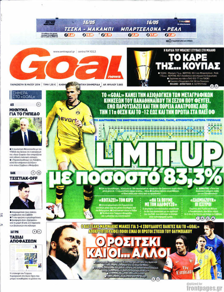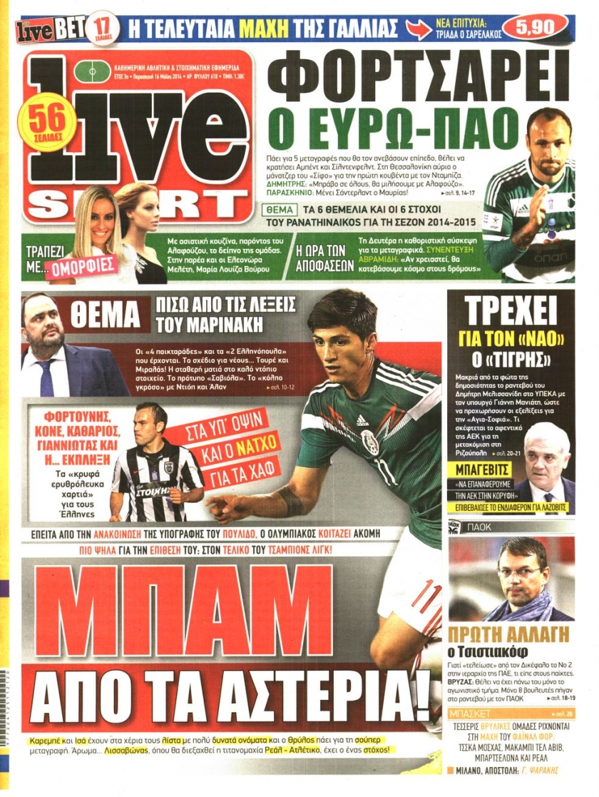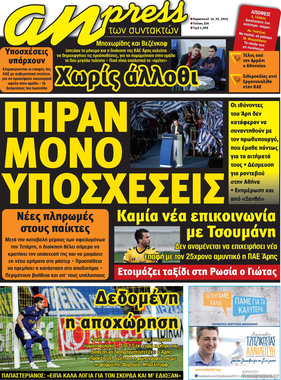 Οι αθλητικές εφημερίδες Enikos Newsroom 08:44, Παρασκευή 16 Μαΐου 2014 Media Οι αθλητικές εφημερίδες Διαβάστε τα πρωτοσέλιδα των αθλητικών εφημερίδων: ΑΘΛΗΤΙΚΕΣ ΕΦΗΜΕΡΙΔΕΣ ΕΦΗΜΕΡΙΔΕΣ ΠΡΩΤΟΣΕΛΙΔΑ Μοιράσου το: σχολίασε κι εσύ (0 σχόλια) Ακολουθήστε το enikos.gr στο Google News και μάθετε πρώτοι όλες τις ειδήσεις Δείτε όλες τις τελευταίες ειδήσεις από την Ελλάδα και τον Κόσμο στο enikos.gr Ειδήσεις Ροή Ειδήσεων 33 λεπτά πριν Live streaming – Ο Μάκης Βορίδης στο στούντιο του Realfm 97,8 σε μια εφ’ όλης της ύλης συνέντευξη στον Νίκο Χατζηνικολάου 59 λεπτά πριν Κατρίνης: «Ο μικρός μου γιος οδηγούσε χωρίς δίπλωμα, πράξη αδικαιολόγητη και παράνομη – Ο νόμος ισχύει για όλους» 48 λεπτά πριν ΕΕ: Η Κομισιόν παρουσιάζει σήμερα σχέδιο για την αντιμετώπιση της στεγαστικής κρίσης – Προτείνει πλαφόν στα Airbnb 1 ώρα πριν Κυβέρνηση: Αγώνας για γιορτές χωρίς μπλόκα – Τι συζητά και τι απορρίπτει το Μαξίμου 18 λεπτά πριν Βίντεο: Κατέρρευσε άγαλμα στη Βραζιλία λόγω ισχυρών ανέμων – Καρέ καρέ η δραματική πτώση του 2 ώρες πριν Τέλος η μοναξιά για 3 ζώδια μετά τις 16 Δεκεμβρίου – «Ξαναβρίσκετε τον εαυτό σας» 4 ώρες πριν Ανακαλύφθηκε περίτεχνη μαρμάρινη μπανιέρα που επαναχρησιμοποιήθηκε ως κρήνη 3 ώρες πριν Η πεθερά της την κατηγορεί πως δεν την ταΐζει σωστά – «Δεν παραπονιέται όμως στον γιο της» 43 λεπτά πριν Οι άνθρωποι που φαίνονται «τυχεροί» στη ζωή τους, συνήθως έχουν αυτές τις 8 αθόρυβες συνήθειες 3 λεπτά πριν WSJ: Η Ευρώπη προετοιμάζει τους πολίτες της για πόλεμο με τη Ρωσία – Η «γκρίζα ζώνη» της Μόσχας και το τέλος του εφησυχασμού 8 λεπτά πριν Χάος σε σχολείο της Γλυφάδας: Βάζουν φωτιά σε αίθουσες και πετάνε θρανία από σκάλες – ΒΙΝΤΕΟ 13 λεπτά πριν ΔΥΠΑ: Από αύριο η προπληρωμή επιδομάτων, παροχών και Δώρου Χριστουγέννων 18 λεπτά πριν Βίντεο: Κατέρρευσε άγαλμα στη Βραζιλία λόγω ισχυρών ανέμων – Καρέ καρέ η δραματική πτώση του 23 λεπτά πριν Αγρότες στα τελωνεία: Μπλόκο σε δύο φάσεις στους Ευζώνους – Πολύωροι αποκλεισμοί σε Νίκη, Προμαχώνα και Εξοχή ENIKOS NETWORK Οι ρίζες της άνοιας ίσως βρίσκονται στην παιδική ηλικία – Τι έδειξαν πρόσφατες μελέτες Όμιλος ΠΡΟΣΥΦΑΠΕ: Επιστρέφει στην κοινωνία τμήμα της υπεραξίας που παράγει Βουλή: Σήμερα η ψήφιση του προϋπολογισμού με τα νέα μέτρα για τη στέγη – Ποιοι είναι οι δημοσιονομικοί και αναπτυξιακοί στ... Επιδόματα της ΔΥΠΑ και Δώρο Χριστουγέννων: Από αύριο η προπληρωμή τους Σύγχρονος Νοστράδαμος: Προειδοποιεί για «μεγάλο γεγονός» τους επόμενους μήνες που θα συγκλονίσει τη Βρετανία και τον κόσμο Τεστ παρατηρητικότητας: Μπορείτε να βρείτε τις 3 διαφορές στις εικόνες με έναν πιγκουίνο σε 14 δευτερόλεπτα περισσότερα 09:58 , Τρίτη 16 Δεκεμβρίου 2025 LIVE – Ακούστε την εκπομπή του Νίκου Χατζηνικολάου 16/12/2025 Ακούστε την εκπομπή του Νίκου Χατζηνικολάου, στον Realfm 97,8. Ακούστε LIVE εδώ 09:26 , Τρίτη 16 Δεκεμβρίου 2025 Τηλεθέαση (15/12): Τα νούμερα για την prime time – Ποιες σειρές ξεχώρισαν Ξεκάθαρη πρωτιά στην τηλεθέαση κατέκτησε η σειρά «Μια νύχτα μόνο», η οποία βρέθηκε στην κορυφή... 08:00 , Τρίτη 16 Δεκεμβρίου 2025 Την Κυριακή με τη Realnews: Δωροεπιταγή 10€ Δωροεπιταγή αξίας 10€ για αγορές άνω των 60€ από τα πολυκαταστήματα FactoryOutlet H προσφορά ι... 05:48 , Τρίτη 16 Δεκεμβρίου 2025 Οι οικονομικές εφημερίδες 16/12/2025 Διαβάστε τα πρωτοσέλιδα από τις οικονομικές εφημερίδες, σήμερα 16/12/2025. ΤΕΛΕΥΤΑΙΕΣ ΕΙΔΗΣΕΙΣ 3 λεπτά πριν WSJ: Η Ευρώπη προετοιμάζει τους πολίτες της για πόλεμο... 8 λεπτά πριν Χάος σε σχολείο της Γλυφάδας: Βάζουν φω
