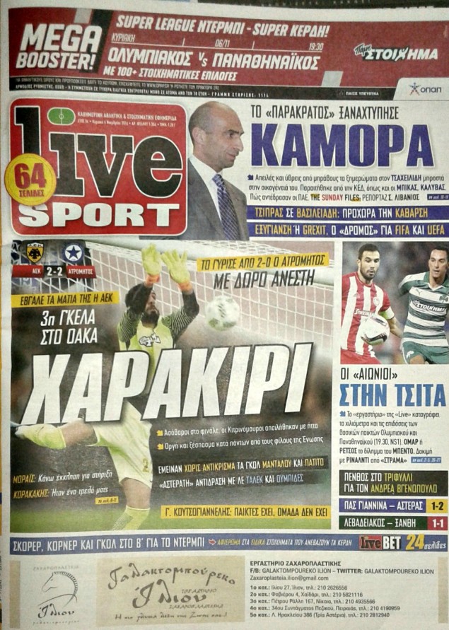 Οι αθλητικές εφημερίδες 6/11/2016 Κώστας Τεό 03:57, Κυριακή 06 Νοεμβρίου 2016 Media Διαβάστε τα σημερινά πρωτοσέλιδα των αθλητικών εφημερίδων: ΑΘΛΗΤΙΚΕΣ ΕΦΗΜΕΡΙΔΕΣ ΠΡΩΤΟΣΕΛΙΔΑ Μοιράσου το: σχολίασε κι εσύ (0 σχόλια) Ακολουθήστε το enikos.gr στο Google News και μάθετε πρώτοι όλες τις ειδήσεις Δείτε όλες τις τελευταίες ειδήσεις από την Ελλάδα και τον Κόσμο στο enikos.gr Ειδήσεις Ροή Ειδήσεων 3 ώρες πριν Αγρότες: Πολύωροι αποκλεισμοί στα τελωνεία Προμαχώνα, Εξοχής, Ευζώνων και Νίκης – Κλείνουν τον κόμβο Φιλώτα οι παραγωγοί στη Δυτική Μακεδονία 2 ώρες πριν Νίκος Παππάς: Ζητώ συγγνώμη για αυτό το επεισόδιο – Δεν τον γρονθοκόπησα 1 ώρα πριν Πούτιν: Η Ουκρανία δεν είναι έτοιμη για ειρηνευτικές συνομιλίες – ο ρωσικός στρατός προελαύνει σε όλα τα μέτωπα 49 λεπτά πριν Κρήτη: Στο Ρέθυμνο μεταφέρονται οι εκατοντάδες μετανάστες που διασώθηκαν ανοιχτά της Γαύδου 2 ώρες πριν Τρομακτικό βίντεο: Η στιγμή της έκρηξης στο τζετ που μετέφερε τον οδηγό του NASCAR, Γκρεγκ Μπιφλ και την οικογένειά του 3 ώρες πριν Αλλαγή σελίδας για 3 ζώδια – «Μία δύσκολη περίοδος φτάνει στο τέλος της» 2 ημέρες πριν 20 χρόνια τα Χριστούγεννα ξεκινούν στα Public με μεγάλη ποικιλία σε δώρα! 2 ώρες πριν Γεμάτος νεροχύτης; 5 σοβαρές ευθύνες που «φοβίζουν» όσους αφήνουν άπλυτα πιάτα 54 λεπτά πριν Ειδικός μοιράζεται 6 κόλπα για να διατηρείστε σε φόρμα με πάνω από 40 ώρες εργασίας την εβδομάδα: «Προπονηθείτε πριν από τη δουλειά, όχι μετά» 2 λεπτά πριν Νέα Φιλαδέλφεια: Βίντεο ντοκουμέντο από το θανατηφόρο τροχαίο 6 λεπτά πριν Παπαθανάσης: «Η Ελλάδα αλλάζει με μεταρρυθμίσεις και έργα – Το 2026 χρονιά μεγάλης ανάπτυξης, νέων θέσεων εργασίας, καλύτερων αμοιβών» 13 λεπτά πριν Αγρότες: Παραμένουν στα μπλόκα και ενισχύουν τις δράσεις τους σε Ημαθία, Πέλλα, Πιερία και Καβάλα 19 λεπτά πριν Γιώργος Μαζωνάκης: «Φοβόταν, θεώρησα ότι έπρεπε να τον προστατεύσω» – Τι λέει η τραγουδίστρια, Νωαίνα για τον Στέφανο Παπαδόπουλο 24 λεπτά πριν Βελόπουλος: Ό,τι και να κάνουν στην κυβέρνηση, όλοι οι υπαίτιοι του εγκλήματος των Τεμπών θα μπουν στην φυλακή ENIKOS NETWORK Κίνδυνος παραπλάνησης από διαφημίσεις οδοντικών εμφυτευμάτων Καρκίνος του πνεύμονα: Έως 8.000 ζωές μπορούν να σωθούν με την έγκαιρη διάγνωση Αγορά πολυτελών κατοικιών: Αυτές είναι οι προτεραιότητες των αγοραστών – Σε ποιες περιοχές στρέφονται και τι επιλέγουν ΕΥΔΑΠ: Στο τραπέζι αλλαγές στους λογαριασμούς του νερού – Τι θα ισχύσει για ευάλωτα νοικοκυριά και επιχειρήσεις Χαρτογραφώντας το «σημείο χωρίς επιστροφή»: Για πρώτη φορά αποκαλύπτεται με λεπτομέρεια το ακανθώδες όριο της ατμόσφαιρας τ... Η Google καταργεί τη λειτουργία «dark web report» – Πώς θα μπορούν οι χρήστες να διαγράφουν τα δεδομένα τους περισσότερα 08:00 , Παρασκευή 19 Δεκεμβρίου 2025 Την Κυριακή με τη Realnews: Δωροεπιταγή 10€ Δωροεπιταγή αξίας 10€ για αγορές άνω των 60€ από τα πολυκαταστήματα FactoryOutlet H προσφορά ι... 05:48 , Παρασκευή 19 Δεκεμβρίου 2025 Οι οικονομικές εφημερίδες 19/12/2025 Διαβάστε τα πρωτοσέλιδα από τις οικονομικές εφημερίδες, σήμερα 19/12/2025. 05:43 , Παρασκευή 19 Δεκεμβρίου 2025 Οι αθλητικές εφημερίδες 19/12/2025 Διαβάστε τα πρωτοσέλιδα από τις αθλητικές εφημερίδες, σήμερα 19/12/2025. 05:38 , Παρασκευή 19 Δεκεμβρίου 2025 Οι πολιτικές εφημερίδες 19/12/2025 Διαβάστε τα πρωτοσέλιδα από τις πολιτικές εφημερίδες, σήμερα 19/12/2025. ΤΕΛΕΥΤΑΙΕΣ ΕΙΔΗΣΕΙΣ 6 λεπτά πριν Παπαθανάσης: «Η Ελλάδα αλλάζει με μεταρρυθμίσεις και... 13 λεπτά πριν Αγρότες: Παραμένουν στα μπλόκα και ενισχ