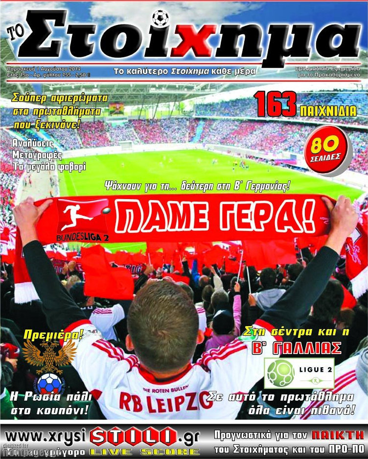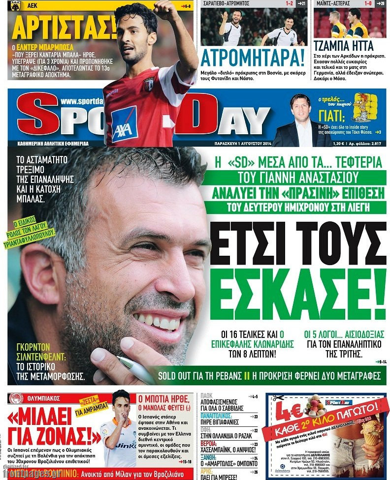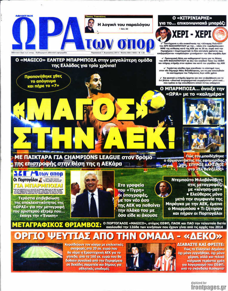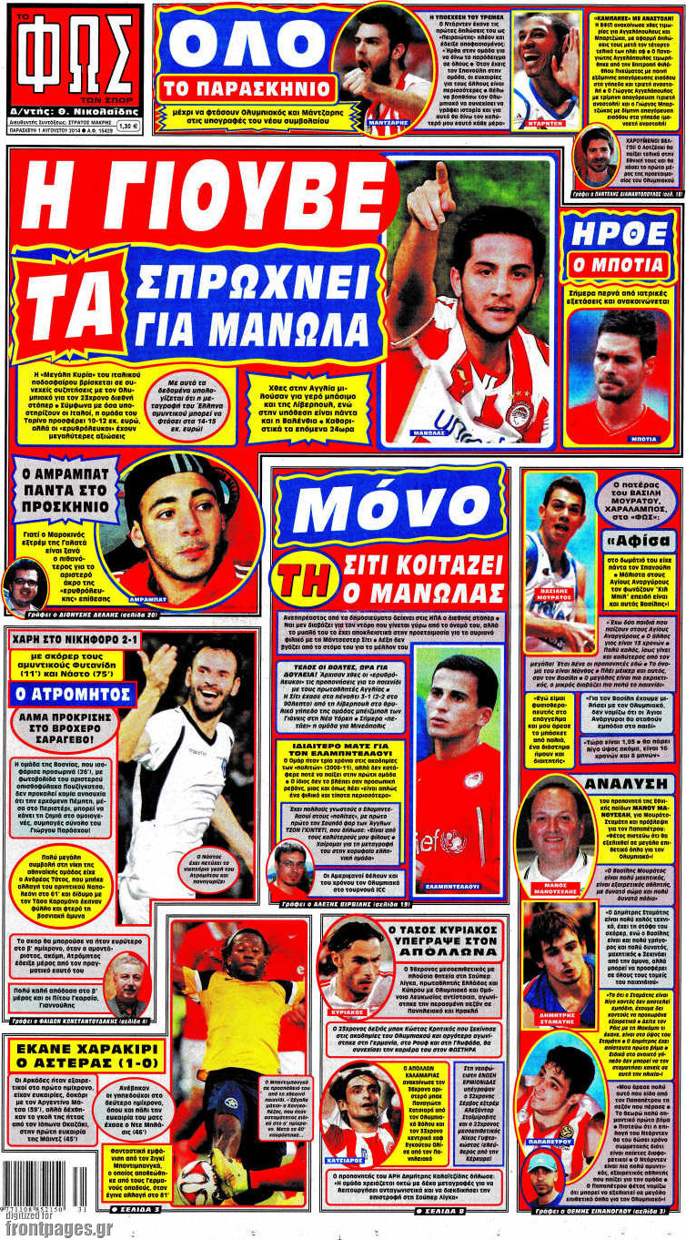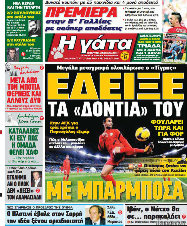 Οι αθλητικές εφημερίδες Enikos Newsroom 07:49, Παρασκευή 01 Αυγούστου 2014 Media Οι αθλητικές εφημερίδες Διαβάστε τα πρωτοσέλιδα των αθλητικών εφημερίδων. ΑΘΛΗΤΙΚΕΣ ΕΦΗΜΕΡΙΔΕΣ ΠΡΩΤΟΣΕΛΙΔΑ Μοιράσου το: σχολίασε κι εσύ (0 σχόλια) Ακολουθήστε το enikos.gr στο Google News και μάθετε πρώτοι όλες τις ειδήσεις Δείτε όλες τις τελευταίες ειδήσεις από την Ελλάδα και τον Κόσμο στο enikos.gr Ειδήσεις Ροή Ειδήσεων 8 ώρες πριν Μητσοτάκης: Αναγκαία η μεταρρύθμιση του πρωτογενούς τομέα – Τα 6 νέα μέτρα για το στεγαστικό και οι αναφορές σε «Ιθάκη» και «πολιτικούς του καναπέ» 7 ώρες πριν Δάνεια σε ελβετικό φράγκο: Τα βασικά σημεία της ρύθμισης – ανάσας για 40.000 δανειολήπτες – Αναλυτικός οδηγός με ερωτήσεις και απαντήσεις 7 ώρες πριν Κυψέλη: Εξιτήριο πήρε η 14χρονη μαθήτρια που μαχαιρώθηκε από την 16χρονη σε σχολείο – «Θέλω να βοηθήσω το παιδί, έχει μπλέξει με κακές παρέες» 7 ώρες πριν Τραμπ: Γιατί κατέθεσε τώρα την αγωγή κατά του BBC – Πώς η κίνησή του εξυπηρετεί το νέο δόγμα του για «αντίσταση» στην Ευρώπη, υπέρ των συντηρητικών 8 ώρες πριν ΟΠΕΚΕΠΕ – Παράνομες επιδοτήσεις: Ελεύθεροι με περιοριστικούς όρους και οι 7 κατηγορούμενοι που απολογήθηκαν σήμερα 7 ώρες πριν Ανακαλύφθηκε βυθισμένη πέτρινη κατασκευή ανοιχτά της Κριμαίας – Αποτελεί μέρος αρχαίας ελληνικής αποικίας 8 ώρες πριν Ύπνος: Αυτό μπορεί να είναι το χειρότερο λάθος για το βιολογικό ρολόι σας, σύμφωνα με ειδικό 9 ώρες πριν Αριθμολογία: Οι άνθρωποι που έχουν γεννηθεί αυτές τις 3 ημερομηνίες, προσελκύουν μεγάλη τύχη πριν από το τέλος του 2025 11 ώρες πριν Οι 7 συμπεριφορές που μαρτυρούν ότι ένας άνδρας επενδύει μακροπρόθεσμα σε μια σχέση 55 δευτερόλεπτα πριν Οι πολιτικές εφημερίδες 17/12/2025 9 λεπτά πριν Τα ζώδια σήμερα, Τετάρτη 17 Δεκεμβρίου: Κριοί, η αυτοπεποίθησή σας ενισχύεται 17 λεπτά πριν Εφημερεύοντα φαρμακεία σε Αθήνα και Θεσσαλονίκη (17/12) 23 λεπτά πριν Κόστα Ρίκα: Το Κογκρέσο απέρριψε το αίτημα για άρση της ασυλίας του προέδρου Τσάβες 31 λεπτά πριν Κολομβία: Νεκροί τέσσερις αστυνομικοί σε βομβιστικές επιθέσεις ανταρτών ENIKOS NETWORK Αίτημα ΙΣΑ για την εξαίρεση των προσωπικών γιατρών από τις κατ’ οίκον επισκέψεις Η σκανδιναβική μέθοδος στον ύπνο που μπορεί να σώσει έναν γάμο Πιερρακάκης: Ο προϋπολογισμός συμβάλλει ουσιαστικά στην ενίσχυση της αγοραστικής δύναμης της πλειονότητας των εργαζομένων e-ΕΦΚΑ: Παρατείνεται η προθεσμία για την υποβολή ΑΠΔ – Ποιους αφορά Σύγχρονος Νοστράδαμος: Προειδοποιεί για «μεγάλο γεγονός» τους επόμενους μήνες που θα συγκλονίσει τη Βρετανία και τον κόσμο Τεστ παρατηρητικότητας: Μπορείτε να βρείτε τις 3 διαφορές στις εικόνες με έναν πιγκουίνο σε 14 δευτερόλεπτα περισσότερα 05:38 , Τετάρτη 17 Δεκεμβρίου 2025 Οι πολιτικές εφημερίδες 17/12/2025 Διαβάστε τα πρωτοσέλιδα από τις πολιτικές εφημερίδες, σήμερα 17/12/2025. 20:06 , Τρίτη 16 Δεκεμβρίου 2025 Ο ΣΚΑΙ καταγγέλλει τον ΕΚΚΟΜΕΔ Επιστολή με την οποία καταγράφει την έντονη διαμαρτυρία του προς τον διευθύνοντα σύμβουλο του... 17:40 , Τρίτη 16 Δεκεμβρίου 2025 Eurovision: Στις 4 Ιανουαρίου αποκαλύπτονται τα 28 τραγούδια του ελληνικού τελικού Η αγωνία τελειώνει, η γιορτή της Eurovision αρχίζει στην ΕΡΤ από τις πρώτες ημέρες της νέας χρ... 17:09 , Τρίτη 16 Δεκεμβρίου 2025 Alter Ego Media: Βαθύτατη θλίψη και ειλικρινή συλλυπητήρια για την απώλεια της Ειρήνης Μαρινάκη Τη βαθύτατη θλίψη και τα ειλικρινή συλλυπητήριά της εκφράζει η Alter Ego Media για τον θάνατο ... ΤΕΛΕΥΤΑΙΕΣ ΕΙΔΗΣΕΙΣ 9 λεπτά πριν Τα ζώδια σήμερα, Τετάρτη