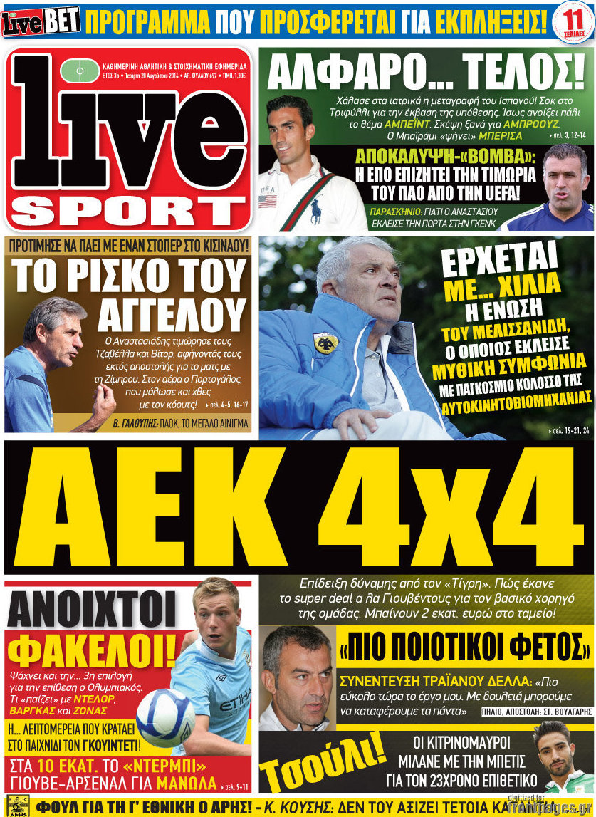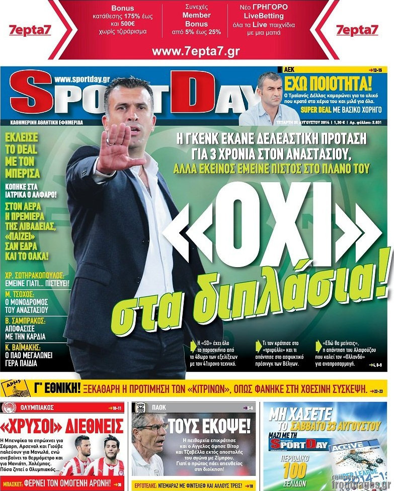Οι αθλητικές εφημερίδες Enikos Newsroom 08:04, Τετάρτη 20 Αυγούστου 2014 Media Οι αθλητικές εφημερίδες Διαβάστε τα πρωτοσέλιδα των αθλητικών εφημερίδων: ΑΘΛΗΤΙΚΕΣ ΕΦΗΜΕΡΙΔΕΣ ΠΡΩΤΟΣΕΛΙΔΑ Μοιράσου το: σχολίασε κι εσύ (0 σχόλια) Ακολουθήστε το enikos.gr στο Google News και μάθετε πρώτοι όλες τις ειδήσεις Δείτε όλες τις τελευταίες ειδήσεις από την Ελλάδα και τον Κόσμο στο enikos.gr Ειδήσεις Ροή Ειδήσεων 52 λεπτά πριν Αυξάνουν την πίεση προς την κυβέρνηση οι αγρότες: Κλείνουν παρακαμπτήριους και ανοίγουν διόδια – Τι θα γίνει τις γιορτές 42 λεπτά πριν Φοινικούντα: Το Σάββατο απολογείται ο 30χρονος γιος γνωστού επιχειρηματία της Πλάκας που παραδόθηκε – Όσα είπε στους αστυνομικούς και ο ρόλος του στο έγκλημα 24 λεπτά πριν Μπορεί ο Μαδούρο να αντέξει τον αποκλεισμό του Τραμπ; Τι θα χρειαστεί η Ουάσινγκτον για να τον ανατρέψει 2 ώρες πριν Δημοσκόπηση Metron Analysis: Στις 10 μονάδες η διαφορά ΝΔ-ΠΑΣΟΚ, στην 3η θέση η Πλεύση Ελευθερίας – 8 στους 10 στηρίζουν τον αγώνα των αγροτών 2 ώρες πριν Πρίγκιπας Ουίλιαμ – Κέιτ: Η νέα οικογενειακή φωτογραφία για τις Χριστουγεννιάτικες κάρτες του 2025 1 ώρα πριν Ύπνος: Η απλή βραδινή ρουτίνα για να προστατεύσετε τα μαλλιά σας από το κρύο κατά τη διάρκεια του χειμώνα 2 ώρες πριν Manifesting: Πώς να συναντήσετε τον σύντροφο της ζωής σας, ανάλογα με τον μήνα γέννησής σας 2 ημέρες πριν 20 χρόνια τα Χριστούγεννα ξεκινούν στα Public με μεγάλη ποικιλία σε δώρα! 28 λεπτά πριν Αρχαιολόγοι ανακάλυψαν ρωμαϊκά τεχνουργήματα από μια πόλη που δεν υπήρξε ποτέ – Τα τρία εντυπωσιακά κτίρια και ο αμφορέας με τις… σαρδέλες 9 λεπτά πριν Παναθηναϊκός – Χάποελ Τελ Αβίβ 93-82: Με… φόρα από την Κωνσταντινούπολη 24 λεπτά πριν Μπορεί ο Μαδούρο να αντέξει τον αποκλεισμό του Τραμπ; Τι θα χρειαστεί η Ουάσινγκτον για να τον ανατρέψει 28 λεπτά πριν Αρχαιολόγοι ανακάλυψαν ρωμαϊκά τεχνουργήματα από μια πόλη που δεν υπήρξε ποτέ – Τα τρία εντυπωσιακά κτίρια και ο αμφορέας με τις… σαρδέλες 30 λεπτά πριν Στο ΟΑΚΑ για το «Παναθηναϊκός – Χάποελ» η Κίμπερλι Γκίλφοϊλ – ΦΩΤΟ 37 λεπτά πριν Ούρσουλα φον ντερ Λάιεν: Μετατίθεται για τον Ιανουάριο η υπογραφή της εμπορικής συμφωνίας «ΕΕ-MERCOSUR» ENIKOS NETWORK Σε περίοδο αυξημένης δραστηριότητας η γρίπη στην Ελλάδα-Μέτρα προστασίας από τον ΕΟΔΥ Σκέφτεστε συνέχεια συζητήσεις που έχετε κάνει; Τι σημαίνει αυτό, σύμφωνα με ειδικό Στεγαστικό: Τι λέει η ΠΟΜΙΔΑ για τα νέα μέτρα που ανακοίνωσε ο Κυριάκος Μητσοτάκης Λαγκάρντ: Αισιόδοξη για την ανάπτυξη της Ευρωζώνης, αβέβαιη για τον πληθωρισμό Χαρτογραφώντας το «σημείο χωρίς επιστροφή»: Για πρώτη φορά αποκαλύπτεται με λεπτομέρεια το ακανθώδες όριο της ατμόσφαιρας τ... Η Google καταργεί τη λειτουργία «dark web report» – Πώς θα μπορούν οι χρήστες να διαγράφουν τα δεδομένα τους περισσότερα 17:45 , Πέμπτη 18 Δεκεμβρίου 2025 ROUK ZOUK: Εορταστικό επεισόδιο με καλεσμένους τους πρωταγωνιστές του «Γιατί ρε πατέρα» Το Σάββατο 20 Δεκεμβρίου στις 21:00, η Ζέτα Μακρυπούλια υποδέχεται εκλεκτούς ηθοποιούς που όλο... 17:20 , Πέμπτη 18 Δεκεμβρίου 2025 Άγιος έρωτας: Η Χριστίνα εξομολογείται στον πατέρα Νικόλαο, απόψε στις 21:00 στον Alpha Η Νότα αποφασίζει να εκδικηθεί τον Πέτρο και τον Στέφανο, για χάρη του Λούη, όμως τα πράγματα ... 16:50 , Πέμπτη 18 Δεκεμβρίου 2025 Να μ’ αγαπάς: Ζωή και Φωτεινή συμφιλιώνονται ως μάνα με κόρη, απόψε στις 20:00 Η ταυτότητα του Άγγελου αποκαλύπτεται στο νέο επεισόδιο της σειράς “Να μ’ αγαπάς... 15:52 , Πέμπτη 18 Δεκεμβρίου 2025 Το Σπίτι Δίπλα Στο Ποτάμι: Το καθηλ