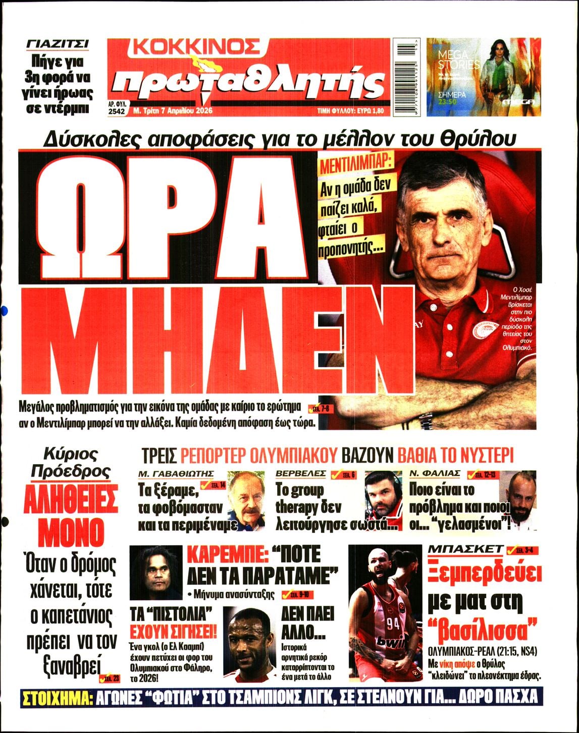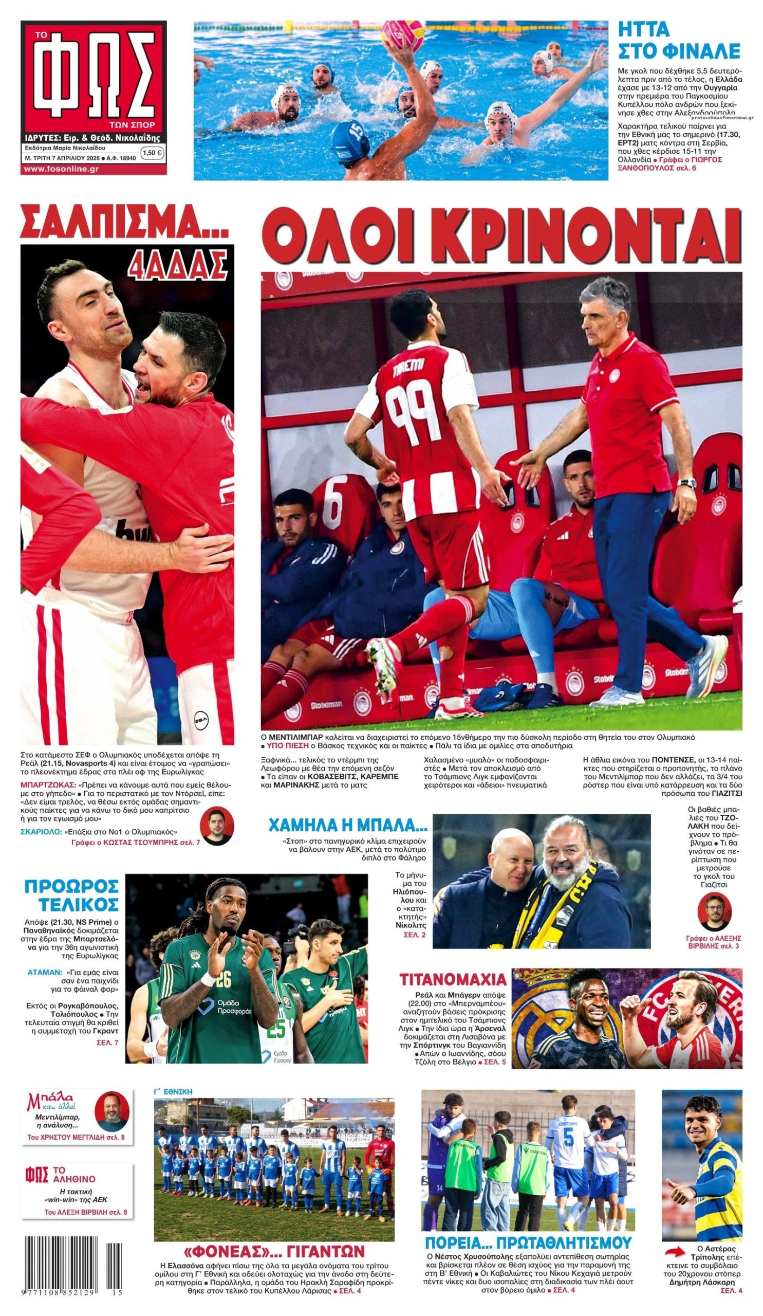 Οι αθλητικές εφημερίδες 7/4/2026 Enikos Newsroom 05:43, Τρίτη 07 Απριλίου 2026 Media & Τηλεοπτικά Νέα Διαβάστε τα πρωτοσέλιδα από τις αθλητικές εφημερίδες, σήμερα 7/4/2026. ΑΘΛΗΤΙΚΕΣ ΕΦΗΜΕΡΙΔΕΣ ΕΦΗΜΕΡΙΔΕΣ ΠΡΩΤΟΣΕΛΙΔΑ Μοιράσου το: Πόλο: Ουγγαρία-Ελλάδα 13-12 – Δείτε τα highlights του αγώνα για το World Cup (video) Βέλγιο: Με σκόρερ και πρωταγωνιστή τον Χρήστο Τζόλη η Μπριζ ξανά στον ένα βαθμό από την κορυφή Μιρτσέα Λουτσέσκου: Εξετάζεται η τοποθέτηση συσκευής καρδιακής υποβοήθησης στον Ρουμάνο τεχνικό σχολίασε κι εσύ (0 σχόλια) Ακολουθήστε το Enikos στο Google News και μάθετε πρώτοι όλες τις ειδήσεις Δείτε όλες τις τελευταίες ειδήσεις από την Ελλάδα και τον Κόσμο στο enikos.gr Ειδήσεις Ροή Ειδήσεων 9 ώρες πριν Fuel Pass: Αλλάζει ο τρόπος υποβολής των αιτήσεων μετά τα προβλήματα – Ποιοι θα μπαίνουν κάθε μέρα στην πλατφόρμα 9 ώρες πριν Παπακώστα: «Ζητώ την άρση της ασυλίας μου – Δεν θα συμμετάσχω στις επόμενες εκλογές, αν υπάρχει σε βάρος μου σκιά ποινικής απαξίας» 24 ώρες πριν LIVE – 38η ημέρα πολέμου ΗΠΑ – Ισραήλ με Ιράν – Όλες οι εξελίξεις στη Μέση Ανατολή 8 ώρες πριν Δημήτρης Μελάς: Νέες αποκαλύψεις για τον πρώην πρόεδρο του ΟΠΕΚΕΠΕ – «Παίρνεις 30 χιλιάδες και κλαις για τα 7 κατοστάρια» 8 ώρες πριν Τραμπ: Γιατί ξέφυγε από τον έλεγχό του ο πόλεμος με το Ιράν – Τα τρία βασικά λάθη της Ουάσιγκτον 1 ώρα πριν Οπτική ψευδαίσθηση: Μόνο το 1% των ανθρώπων θα βρει τον φάκελο σε 10 δευτερόλεπτα 1 ώρα πριν Υψηλή αρτηριακή πίεση: Η άσκηση που συμβάλλει στην μείωσή της σε 4 εβδομάδες, σύμφωνα με ειδικούς 4 ώρες πριν Ζώδια 7/4: Ημερήσιες προβλέψεις – Καρκίνοι, σταματήστε να προσπαθείτε τόσο πολύ για τους άλλους 8 ώρες πριν Ανακαλύφθηκε χρυσό μενταγιόν του 9ου αιώνα με την μορφή του Ιωάννη του Βαπτιστή – Γιατί οι αρχαιολόγοι το χαρακτηρίζουν σπάνιο και μοναδικό 9 λεπτά πριν Οι αθλητικές μεταδόσεις της Μεγάλης Τρίτης (7/4) 20 λεπτά πριν Το MasterChef πήγε Λέσβο: Γυρίσματα στο Πλωμάρι με άρωμα παράδοσης και τοπικών προϊόντων 35 λεπτά πριν Ο Ντόναλντ Τραμπ θα συνομιλήσει ζωντανά ξανά σήμερα με τους αστροναύτες του Artemis II 50 λεπτά πριν ΔΕΔΔΗΕ: Διακοπές ρεύματος σήμερα (7/4) στην Αθήνα και σε άλλες 9 περιοχές της Αττικής 60 λεπτά πριν Ο Τραμπ «έχει περίπου 20 ώρες» για να παραδοθεί στο Ιράν, δήλωσε κορυφαίο στέλεχος της Τεχεράνης ENIKOS NETWORK Βρείτε τις διαφορές στη φωτό με τον νεαρό που παίζει μπάλα – Μόνο όσοι έχουν βλέμμα διαιτητή μπορούν να τις εντοπίσουν μέσα... Το βότανο της δύναμης που μπορεί να αυξήσει τα επίπεδα τεστοστερόνης και να ρίξει το σάκχαρο Ακρίβεια: Οι τιμές στις τομάτες πλησιάζουν… το κρέας- Δείτε πόσο αυξήθηκαν οι τιμές χονδρικής στα λαχανικά ΔΕΣΦΑ: Τετραπλασιάστηκαν οι εξαγωγές φυσικού αερίου κατά το πρώτο τρίμηνο του 2026 Το ρομπότ Maximo της AES εγκατέστησε ηλιακή ισχύ 100 μεγαβάτ Κουίζ: Πόσο καλός είσαι στην ελληνική μυθολογία; Δοκίμασε τις γνώσεις σου και κάνε το 3 στα 3 περισσότερα 07:11 , Τρίτη 07 Απριλίου 2026 Οι αθλητικές μεταδόσεις της Μεγάλης Τρίτης (7/4) Τα ματς Ολυμπιακός – Ρεάλ Μαδρίτης και Μπαρτσελόνα – Παναθηναϊκός για τη Euroleague και τα παι... 05:38 , Τρίτη 07 Απριλίου 2026 Οι πολιτικές εφημερίδες 7/4/2026 Διαβάστε τα πρωτοσέλιδα από τις πολιτικές εφημερίδες, σήμερα 7/4/2026. 22:55 , Δευτέρα 06 Απριλίου 2026 Porto Leone: Στη γειτονιά με τα κόκκινα φανάρια – Βούλγαρης – Γιάμαρης: Η πρώτη αναμέτρηση απόψε στο νοσοκομείο Καθηλωτικό το νέο επεισόδιο της σειράς “Porto Leone: Στη γειτονιά με τα κόκκινα φανάρια&... 21:44 , Δευτέρα 06 Απριλίου 2026 Άγιος έρωτας: Ο Λεωνί