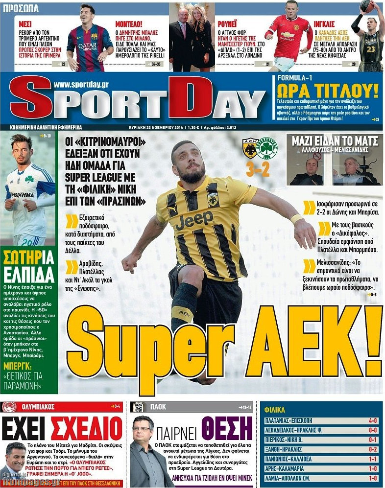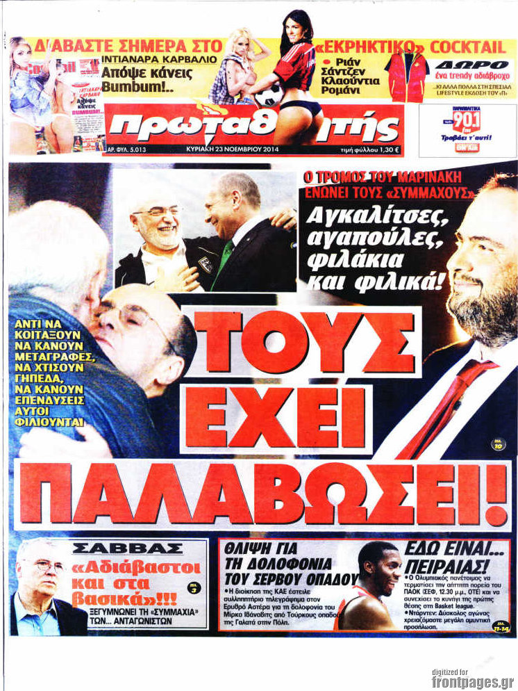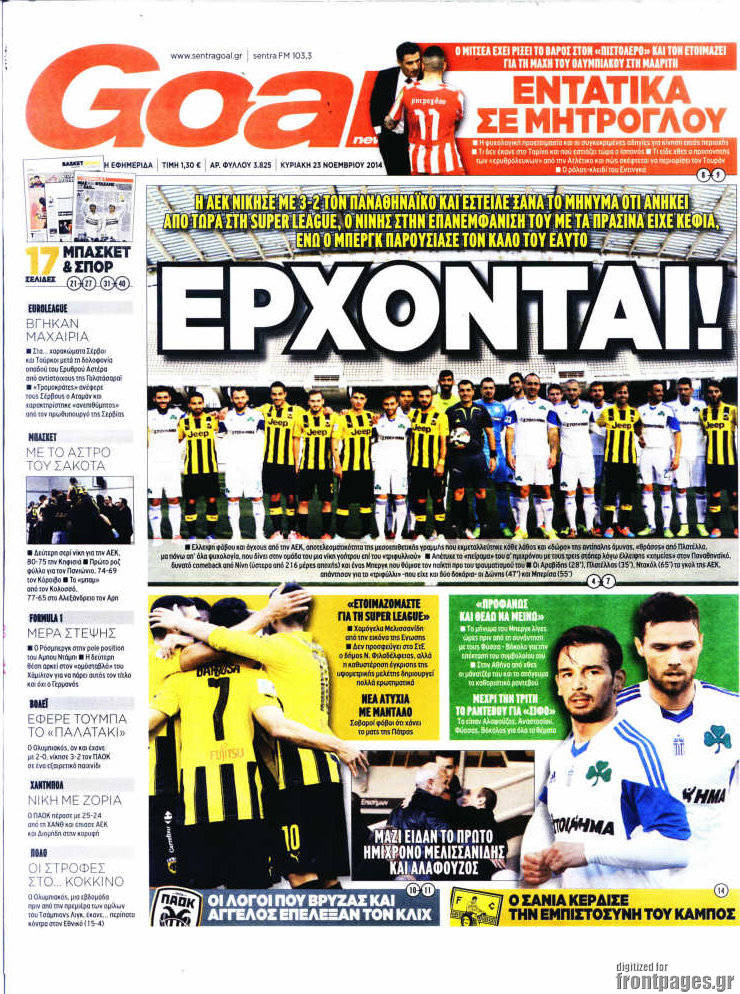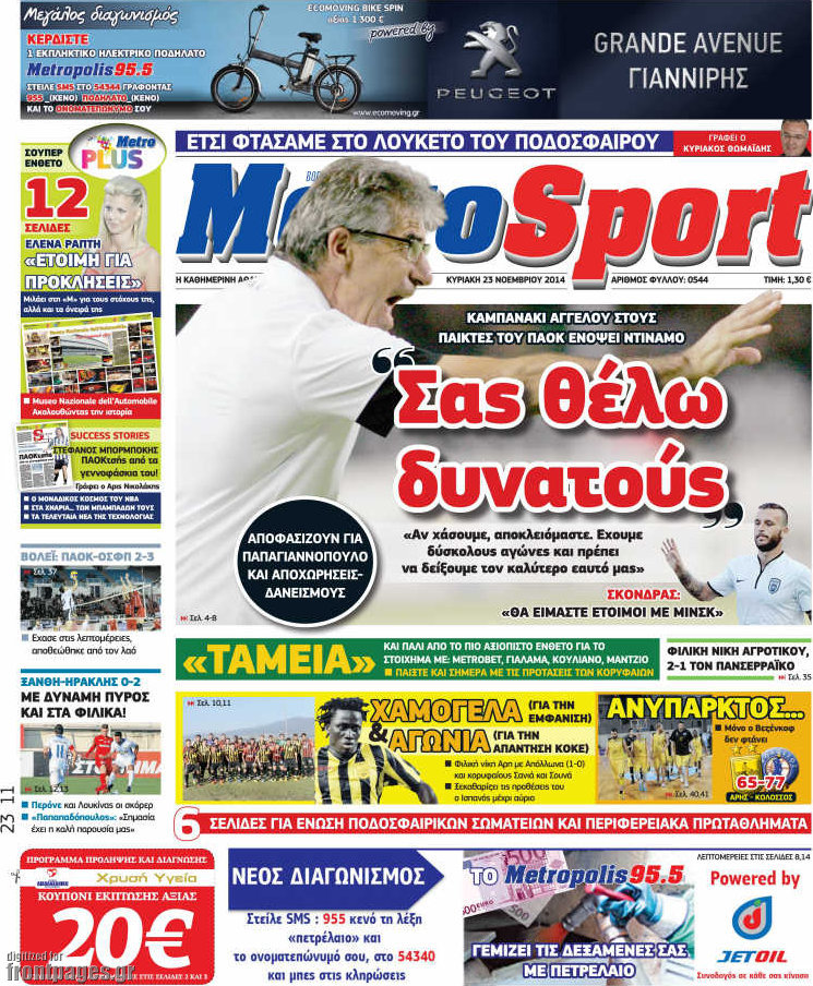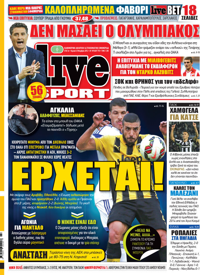 Οι αθλητικές εφημερίδες Enikos Newsroom 07:45, Κυριακή 23 Νοεμβρίου 2014 Media Οι αθλητικές εφημερίδες Διαβάστε τα πρωτοσέλιδα των αθλητικών εφημερίδων: ΑΘΛΗΤΙΚΕΣ ΕΦΗΜΕΡΙΔΕΣ ΠΡΩΤΟΣΕΛΙΔΑ Μοιράσου το: σχολίασε κι εσύ (0 σχόλια) Ακολουθήστε το enikos.gr στο Google News και μάθετε πρώτοι όλες τις ειδήσεις Δείτε όλες τις τελευταίες ειδήσεις από την Ελλάδα και τον Κόσμο στο enikos.gr Ειδήσεις Ροή Ειδήσεων 24 λεπτά πριν Πώς στήθηκε η επιχείρηση «Ίπαλλος» που οδήγησε στη σύλληψη του «Έλληνα Εσκομπάρ» – «Ο πόλεμος ενάντια στους εμπόρους ναρκωτικών θα συνεχιστεί» 9 λεπτά πριν Δίκη Χρυσής Αυγής: Την ενοχή και των 42 κατηγορουμένων ζητά η εισαγγελέας 29 λεπτά πριν Κυψέλη: Στη φυλακή η 16χρονη που μαχαίρωσε συμμαθήτριά της 3 ώρες πριν Αμοργός: «Θα προσπαθήσω να το κάνω κάθε μέρα» – Ποιος είναι ο αγρότης που έστησε μόνος του το πρώτο μπλόκο στο νησί 1 ώρα πριν Τραγωδία στην Αλεξανδρούπολη: Παιδάκι 3 ετών μεταφέρθηκε νεκρό από τη μητέρα του στο νοσοκομείο 34 λεπτά πριν Τα 3 ζώδια που θα δουν τη ζωή τους να αλλάζει ριζικά το 2026 – «Όλα γίνονται καλύτερα σταδιακά» 6 ώρες πριν «Δεν είχα κλάψει από τότε που διαγνώστηκα με καρκίνο, ώσπου ένα τηλεφώνημα με έκανε να λυγίσω» – Η συγκλονιστική εξομολόγηση ενός άνδρα 1 ώρα πριν Ο σπάνιος σεισμός που έλυσε τα χέρια των επιστημόνων – Αποκάλυψε ακριβώς όσα αναζητούσαν 7 ώρες πριν 20 χρόνια τα Χριστούγεννα ξεκινούν στα Public με μεγάλη ποικιλία σε δώρα! 2 λεπτά πριν Τραγωδία στην Αχαΐα: 48χρονος κατέρρευσε στο κυνήγι μπροστά στα μάτια του πατέρα του 9 λεπτά πριν Δίκη Χρυσής Αυγής: Την ενοχή και των 42 κατηγορουμένων ζητά η εισαγγελέας 10 λεπτά πριν Μαρκέλλα Γιαννάτου: «Είμαι κοντά στα 14 χρόνια σε ψυχανάλυση – Είχα αρχίσει να έχω κρίσεις άγχους, νόμιζα ότι θα πεθάνω» 17 λεπτά πριν Υπουργείο Αγροτικής Ανάπτυξης: Πώς θα γίνει η πληρωμή αγροτεμαχίων έως 20 στρέμματα παρά τα ζητήματα ΚΑΕΚ 24 λεπτά πριν Πώς στήθηκε η επιχείρηση «Ίπαλλος» που οδήγησε στη σύλληψη του «Έλληνα Εσκομπάρ» – «Ο πόλεμος ενάντια στους εμπόρους ναρκωτικών θα συνεχιστεί» ENIKOS NETWORK Σοβαροί κίνδυνοι από τη λάθος χορήγηση φαρμάκου για τις αιμορραγίες-Συστάσεις προς τους γιατρούς 5 πράγματα που αποφεύγει γαστρεντερολόγος για να μειώσει τον κίνδυνο καρκίνου του εντέρου Eurostat: Κάτω από την αρχική εκτίμηση της Υπηρεσίας ο πληθωρισμός στην Ελλάδα τον Νοέμβριο του 2025 – Tα στοιχεία για την ... Συντάξεις Ιανουαρίου 2026: Σε ποιους θα πιστωθούν την Πέμπτη τα χρήματα και τι αυξήσεις θα δοθούν – Δείτε αναλυτικά παραδεί... Χαρτογραφώντας το «σημείο χωρίς επιστροφή»: Για πρώτη φορά αποκαλύπτεται με λεπτομέρεια το ακανθώδες όριο της ατμόσφαιρας τ... Η Google καταργεί τη λειτουργία «dark web report» – Πώς θα μπορούν οι χρήστες να διαγράφουν τα δεδομένα τους περισσότερα 12:35 , Τετάρτη 17 Δεκεμβρίου 2025 Μίρκα Παπακωνσταντίνου: «Δεν ήμουν αισιόδοξη για τα νούμερα – Είμαι ρεαλίστρια» Στα γυρίσματα του εορταστικού επεισοδίου της αγαπημένης σειράς “Το Σόι Σου”, βρέθηκε η κάμερα ... 12:12 , Τετάρτη 17 Δεκεμβρίου 2025 Ακούστε την εκπομπή του Νίκου Χατζηνικολάου 17/12/2025 Ακούστε την εκπομπή του Νίκου Χατζηνικολάου στον ραδιοφωνικό σταθμό RealFm 97,8, την Τετάρτη 1... 11:35 , Τετάρτη 17 Δεκεμβρίου 2025 Home Alone: Το σπίτι της ταινίας θα ανακαινιστεί – Επιστροφή στην αισθητική της δεκαετίας του ’90 Οι νέοι ιδιοκτήτες του πραγματικού σπιτιού που παρουσιάζεται στην κλασική ταινία του 1990 «Hom... 11:25 , Τετάρτη 17 Δεκεμβρίου 2025 Grand Hotel: Απόψε το τελευταίο επεισόδιο τ