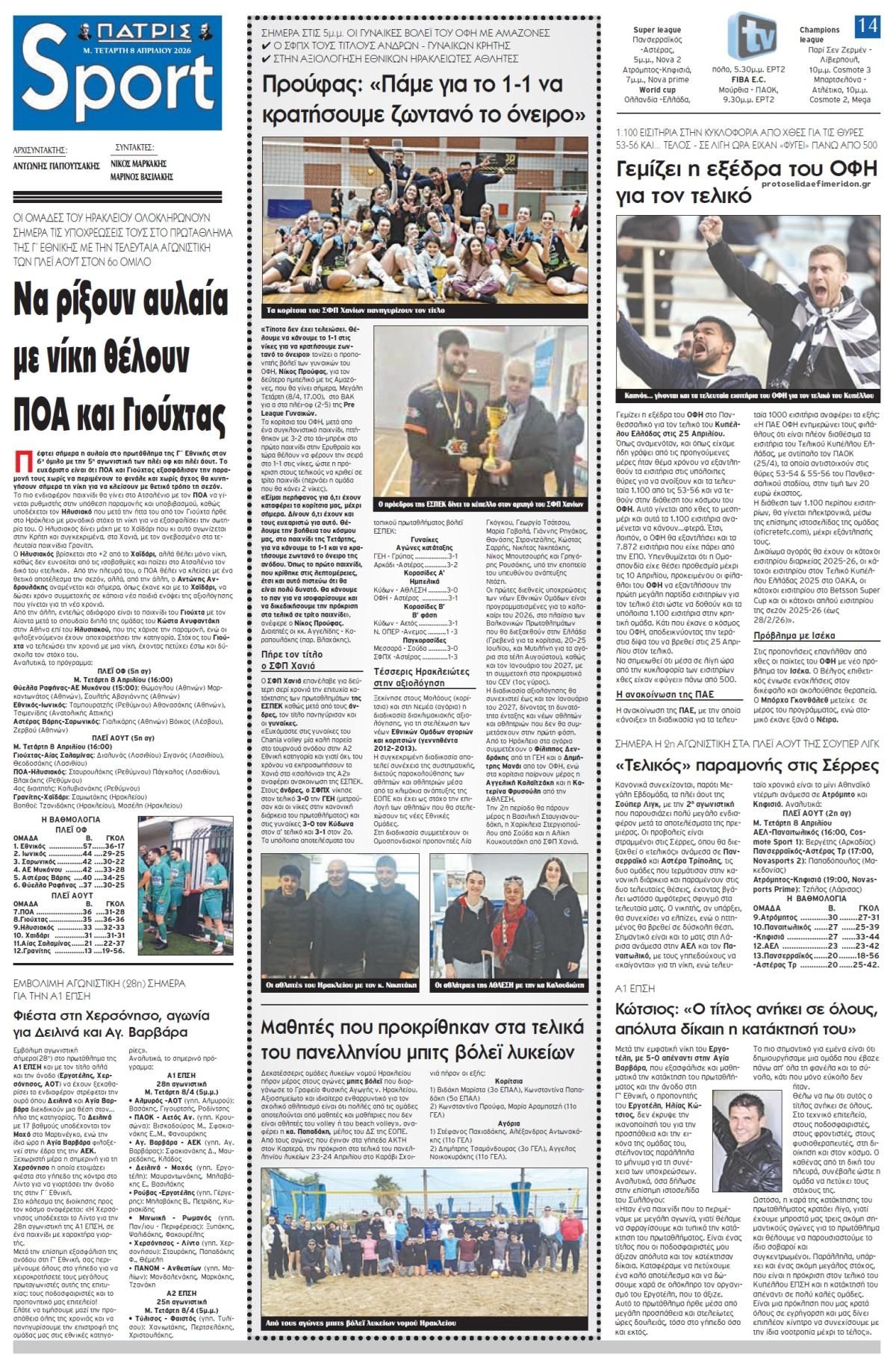 Οι αθλητικές εφημερίδες 8/4/2026 Enikos Newsroom 05:43, Τετάρτη 08 Απριλίου 2026 Media & Τηλεοπτικά Νέα Διαβάστε τα πρωτοσέλιδα από τις αθλητικές εφημερίδες, σήμερα 8/4/2026. ΑΘΛΗΤΙΚΕΣ ΕΦΗΜΕΡΙΔΕΣ ΕΦΗΜΕΡΙΔΕΣ ΠΡΩΤΟΣΕΛΙΔΑ Μοιράσου το: Γιώργος Μπαρτζώκας: Παίξαμε ομαδικά, Ντόρσεϊ και Βεζένκοφ ήταν τρομεροί Έργκιν Aταμάν: «Για 37 λεπτά παίξαμε τέλειο μπάσκετ, η μεγάλη μας μεταγραφή ήταν ο Λεσόρ» Champions League: Μπάγερν και Άρσεναλ έκαναν το πρώτο βήμα για την πρόκριση στα ημιτελικά σχολίασε κι εσύ (0 σχόλια) Ακολουθήστε το Enikos στο Google News και μάθετε πρώτοι όλες τις ειδήσεις Δείτε όλες τις τελευταίες ειδήσεις από την Ελλάδα και τον Κόσμο στο enikos.gr Ειδήσεις Ροή Ειδήσεων 3 λεπτά πριν LIVE – 40η ημέρα πολέμου ΗΠΑ – Ισραήλ με Ιράν – Όλες οι εξελίξεις στη Μέση Ανατολή 9 ώρες πριν Ιράν: Μπορεί ο βομβαρδισμός του και η επιστροφή του «στη λίθινη εποχή», να οδηγήσει στην επίτευξη των στρατιωτικών στόχων των ΗΠΑ; 8 ώρες πριν Συνεχίζεται το θρίλερ στην Παλλήνη: Τα 3 στοιχεία που προκαλούν ερωτήματα για τον θάνατο του 49χρονου – Το σημείωμα που άφησε ο επιχειρηματίας 11 ώρες πριν ΟΠΕΚΕΠΕ: Η ανώνυμη καταγγελία που έγινε αφορμή να αρχίσουν οι παρακολουθήσεις – «Βρωμάει η κατάσταση, με τις παρανομίες τους καταστρέφουν το έθνος» 11 ώρες πριν Δημοσκόπηση Alco: Το 55% θα αναγκαστεί να ξοδέψει λιγότερα χρήματα φέτος το Πάσχα – Τι λένε οι πολίτες για ακρίβεια και μεταναστευτική πολιτική 1 ώρα πριν Οπτική ψευδαίσθηση: Μόνο αν έχετε παρατηρητικότητα ντετέκτιβ, θα εντοπίσετε το smartphone στην εικόνα σε 11 δευτερόλεπτα 1 ώρα πριν Πολλαπλή σκλήρυνση: Ο ρόλος της φλεγμονής του εντέρου στην ασθένεια, σύμφωνα με μελέτη 4 ώρες πριν Ζώδια 8/4: Ημερήσιες προβλέψεις – Υδροχόοι, έχετε τη δύναμη να βάλετε γερές βάσεις για να πετύχετε όσα θέλετε 8 ώρες πριν Αρχαιολογικός θησαυρός στην «Οικία του Θριάμβου του Διονύσου» – Η κόρη του ιερέα του Απόλλωνα και τα λάφυρα της Τροίας 31 λεπτά πριν Εκτάκτως το Μ. Σάββατο με τη Realnews: Ό,τι και αν αγοράσεις, σκανάρεις και κερδίζεις! 3 λεπτά πριν LIVE – 40η ημέρα πολέμου ΗΠΑ – Ισραήλ με Ιράν – Όλες οι εξελίξεις στη Μέση Ανατολή 10 λεπτά πριν Οργή στην Τουρκία για την Ελλάδα: «Η βρώμικη συνεργασία με το Ισραήλ συνεχίζεται» 20 λεπτά πριν Οι αθλητικές μεταδόσεις της Μεγάλης Τετάρτης (8/4) 34 λεπτά πριν Ντόναλντ Τραμπ: «Πλήρης και ολοκληρωτική νίκη στο Ιράν» – «Η Κίνα συνέβαλε για τη διαπραγμάτευση» ENIKOS NETWORK Μπορείτε να εντοπίσετε την κρυμμένη κασετίνα μέσα στη φωτογραφία με το δάσος; Μόνο το 1% μπορεί να τα καταφέρει μέσα σε 7″ Το όσπριο των δύσκολων εποχών που μπορεί να ενισχύσει την καρδιά και έχει αντιοξειδωτική δράση Πάσχα: «Κλείδωσαν» οι τιμές σε αρνιά και κατσίκια – Πόσο τελικά θα κοστίσει φέτος το Πασχαλινό τραπέζι Συντάξεις Μαΐου 2026: Πότε πληρώνονται – Όλες οι ημερομηνίες από τον e-ΕΦΚΑ Μοζαμβίκη: Μετατροπή αγροτικών αποβλήτων σε λύσεις νερού και ενέργειας Κουίζ: Πόσο καλά θυμάστε την ελληνική μυθολογία; Μπορείτε να απαντήσετε σωστά και στις 3 ερωτήσεις; περισσότερα 07:09 , Τετάρτη 08 Απριλίου 2026 Οι αθλητικές μεταδόσεις της Μεγάλης Τετάρτης (8/4) Τα ματς για τα play out στη Super League και για τα προημιτελικά στο Champions League ξεχωρίζο... 05:38 , Τετάρτη 08 Απριλίου 2026 Οι πολιτικές εφημερίδες 8/4/2026 Διαβάστε τα πρωτοσέλιδα από τις πολιτικές εφημερίδες, σήμερα 8/4/2026. 20:40 , Τρίτη 07 Απριλίου 2026 Grand Hotel: Ένας απρόσμενος επισκέπτης από τη Θεσσαλονίκη έρχεται για να αλλάξει τα πάντα Ανατρεπτικές εξελίξεις έρχονται στο νέο επεισ