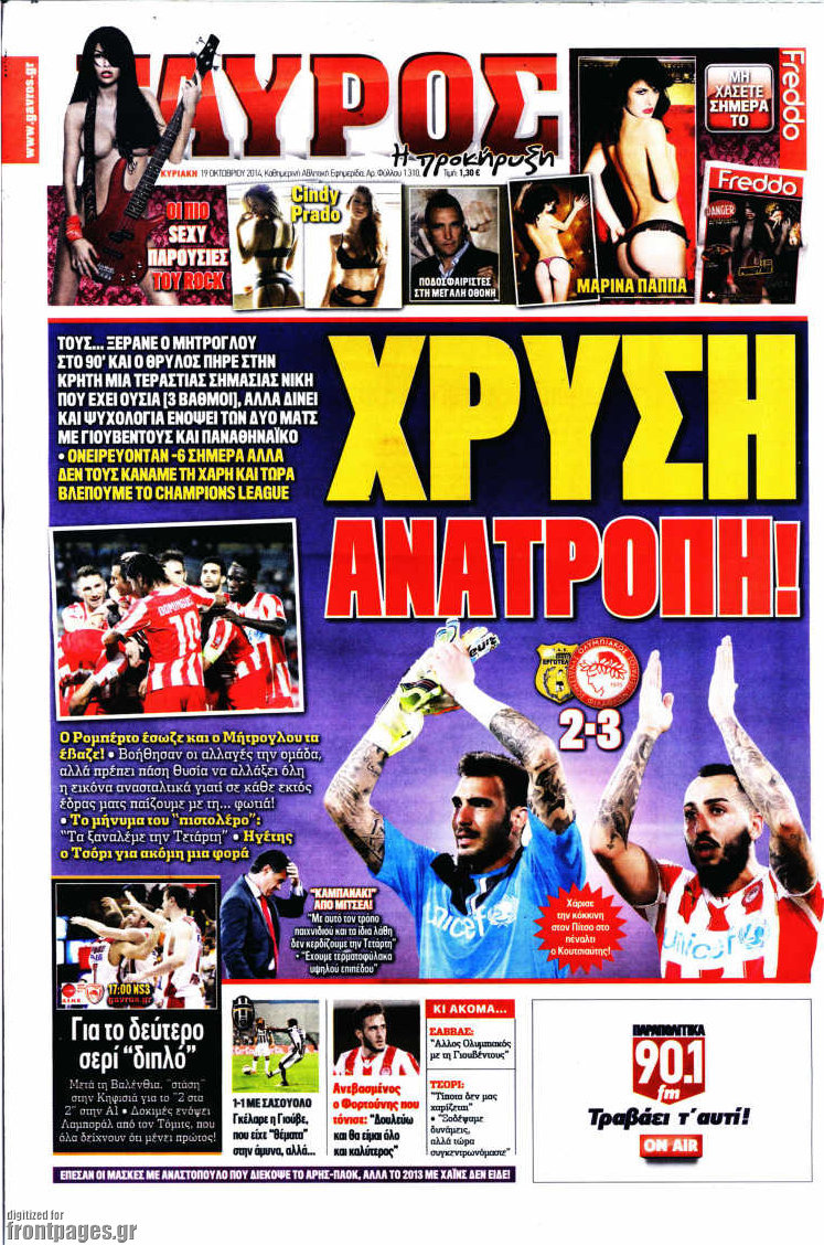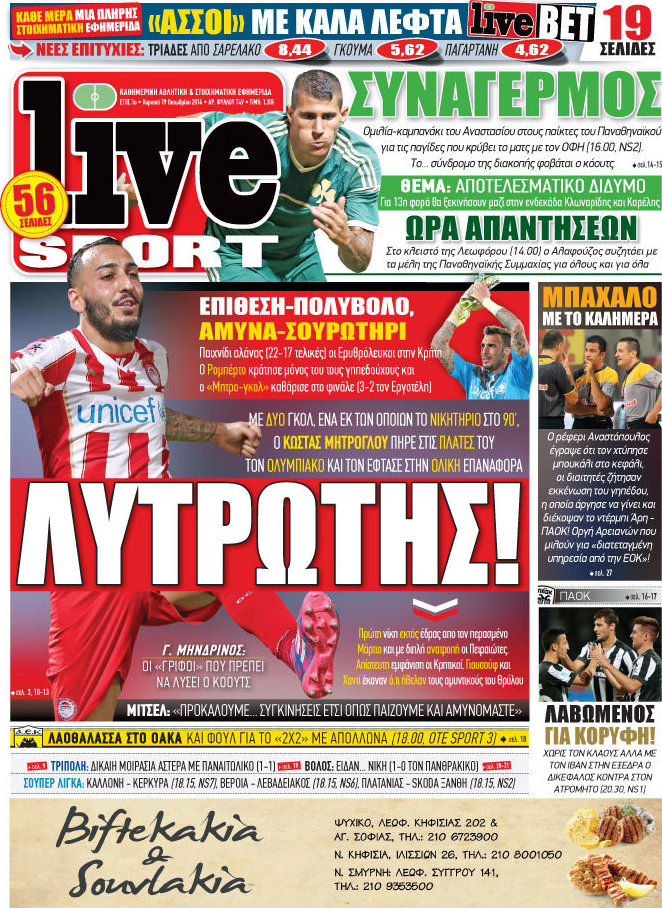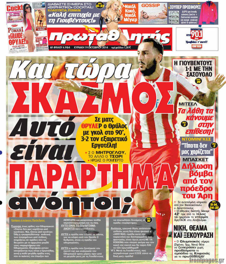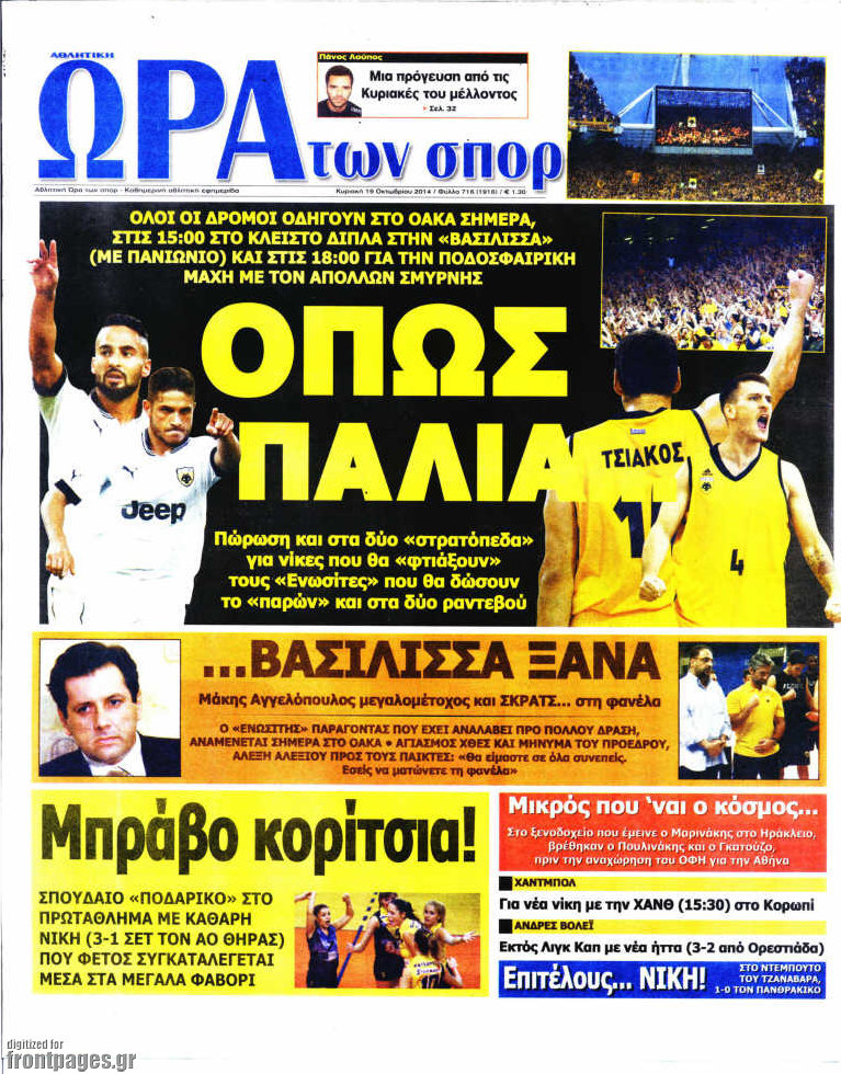 Οι αθλητικές εφημερίδες Enikos Newsroom 08:07, Κυριακή 19 Οκτωβρίου 2014 Media Οι αθλητικές εφημερίδες Διαβάστε τα πρωτοσέλιδα των αθλητικών εφημερίδων. ΑΘΛΗΤΙΚΕΣ ΕΦΗΜΕΡΙΔΕΣ ΠΡΩΤΟΣΕΛΙΔΑ Μοιράσου το: σχολίασε κι εσύ (0 σχόλια) Ακολουθήστε το enikos.gr στο Google News και μάθετε πρώτοι όλες τις ειδήσεις Δείτε όλες τις τελευταίες ειδήσεις από την Ελλάδα και τον Κόσμο στο enikos.gr Ειδήσεις Ροή Ειδήσεων 57 λεπτά πριν Ευρωπαϊκή Ένωση: Χωρίς συμφωνία, για την μακροπρόθεσμη χρηματοδότηση της Ουκρανίας, ολοκληρώθηκε η Σύνοδος Κορυφής στις Βρυξέλλες 4 ώρες πριν ΟΠΕΚΕΠΕ: Προφυλακιστέος ο φερόμενος αρχηγός και ο λογιστής της εγκληματικής οργάνωσης 5 ώρες πριν Αυξάνουν την πίεση προς την κυβέρνηση οι αγρότες: Κλείνουν παρακαμπτήριους και ανοίγουν διόδια – Τι θα γίνει τις γιορτές 5 ώρες πριν Φοινικούντα: Το Σάββατο απολογείται ο 30χρονος γιος γνωστού επιχειρηματία της Πλάκας που παραδόθηκε – Όσα είπε στους αστυνομικούς και ο ρόλος του στο έγκλημα 4 ώρες πριν ΑΕΚ – Κραϊόβα 3-2: Επική ανατροπή και πρόκριση στους «16» του Conference League η Ένωση 5 ώρες πριν Αρχαιολόγοι ανακάλυψαν ρωμαϊκά τεχνουργήματα από μια πόλη που δεν υπήρξε ποτέ – Τα τρία εντυπωσιακά κτίρια και ο αμφορέας με τις… σαρδέλες 6 ώρες πριν Ύπνος: Η απλή βραδινή ρουτίνα για να προστατεύσετε τα μαλλιά σας από το κρύο κατά τη διάρκεια του χειμώνα 7 ώρες πριν Manifesting: Πώς να συναντήσετε τον σύντροφο της ζωής σας, ανάλογα με τον μήνα γέννησής σας 2 ημέρες πριν 20 χρόνια τα Χριστούγεννα ξεκινούν στα Public με μεγάλη ποικιλία σε δώρα! 9 λεπτά πριν Αιματηρή βομβιστική επίθεση στην Υεμένη: Τουλάχιστον τρεις νεκροί και 13 τραυματίες 13 λεπτά πριν Στη Φλόριντα σήμερα οι διαβουλεύσεις σχετικά με τα επόμενα στάδια για τη Λωρίδα της Γάζας 17 λεπτά πριν Σίσσυ Τουμάση: «Είμαι ασθενοφοβική πάρα πολύ και με πιάνει μια παράνοια μ’ αυτό» 41 λεπτά πριν Ντόναλντ Τραμπ: Δεν χρειάζομαι την έγκριση του Κογκρέσου για να διατάξω στρατιωτικά πλήγματα στη Βενεζουέλα 57 λεπτά πριν Ευρωπαϊκή Ένωση: Χωρίς συμφωνία, για την μακροπρόθεσμη χρηματοδότηση της Ουκρανίας, ολοκληρώθηκε η Σύνοδος Κορυφής στις Βρυξέλλες ENIKOS NETWORK Σε περίοδο αυξημένης δραστηριότητας η γρίπη στην Ελλάδα-Μέτρα προστασίας από τον ΕΟΔΥ Σκέφτεστε συνέχεια συζητήσεις που έχετε κάνει; Τι σημαίνει αυτό, σύμφωνα με ειδικό Στεγαστικό: Τι λέει η ΠΟΜΙΔΑ για τα νέα μέτρα που ανακοίνωσε ο Κυριάκος Μητσοτάκης Λαγκάρντ: Αισιόδοξη για την ανάπτυξη της Ευρωζώνης, αβέβαιη για τον πληθωρισμό Χαρτογραφώντας το «σημείο χωρίς επιστροφή»: Για πρώτη φορά αποκαλύπτεται με λεπτομέρεια το ακανθώδες όριο της ατμόσφαιρας τ... Η Google καταργεί τη λειτουργία «dark web report» – Πώς θα μπορούν οι χρήστες να διαγράφουν τα δεδομένα τους περισσότερα 02:50 , Παρασκευή 19 Δεκεμβρίου 2025 GNTM: «Κλείδωσαν» οι τέσσερις φιναλίστ – Μεγάλη ανατροπή στις τελευταίες αποχωρήσεις Για προτελευταία φορά εμφανίστηκαν στο πλατό του GNTM οι φιναλίστ του φετινού κύκλου, το βράδυ... 17:45 , Πέμπτη 18 Δεκεμβρίου 2025 ROUK ZOUK: Εορταστικό επεισόδιο με καλεσμένους τους πρωταγωνιστές του «Γιατί ρε πατέρα» Το Σάββατο 20 Δεκεμβρίου στις 21:00, η Ζέτα Μακρυπούλια υποδέχεται εκλεκτούς ηθοποιούς που όλο... 17:20 , Πέμπτη 18 Δεκεμβρίου 2025 Άγιος έρωτας: Η Χριστίνα εξομολογείται στον πατέρα Νικόλαο, απόψε στις 21:00 στον Alpha Η Νότα αποφασίζει να εκδικηθεί τον Πέτρο και τον Στέφανο, για χάρη του Λούη, όμως τα πράγματα ... 16:50 , Πέμπτη 18 Δεκεμβρίου 2025 Να μ’ αγαπάς: Ζωή και Φωτεινή συμφιλιώνον