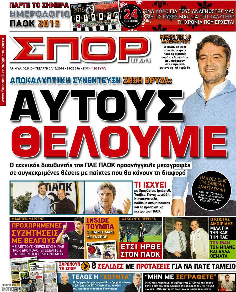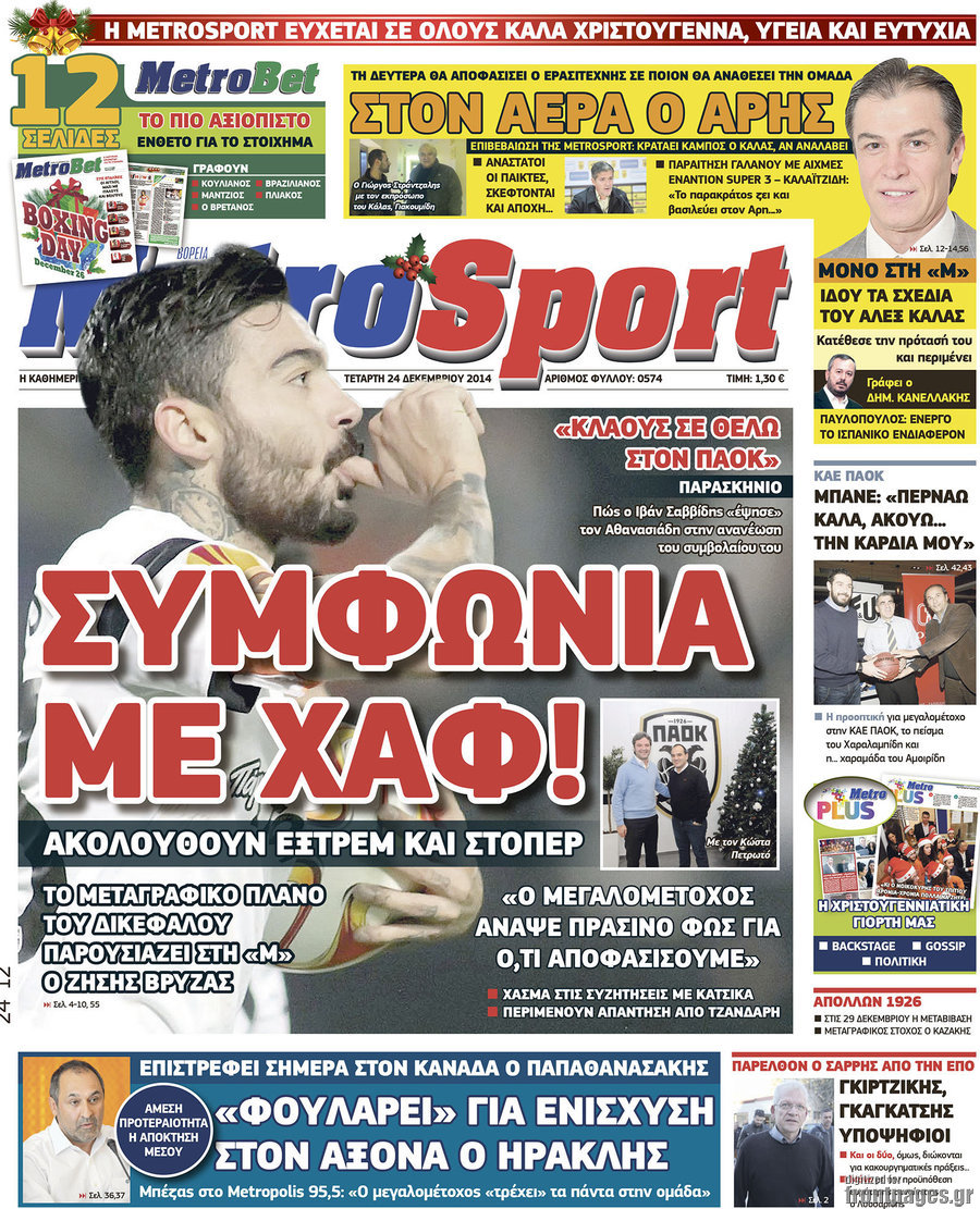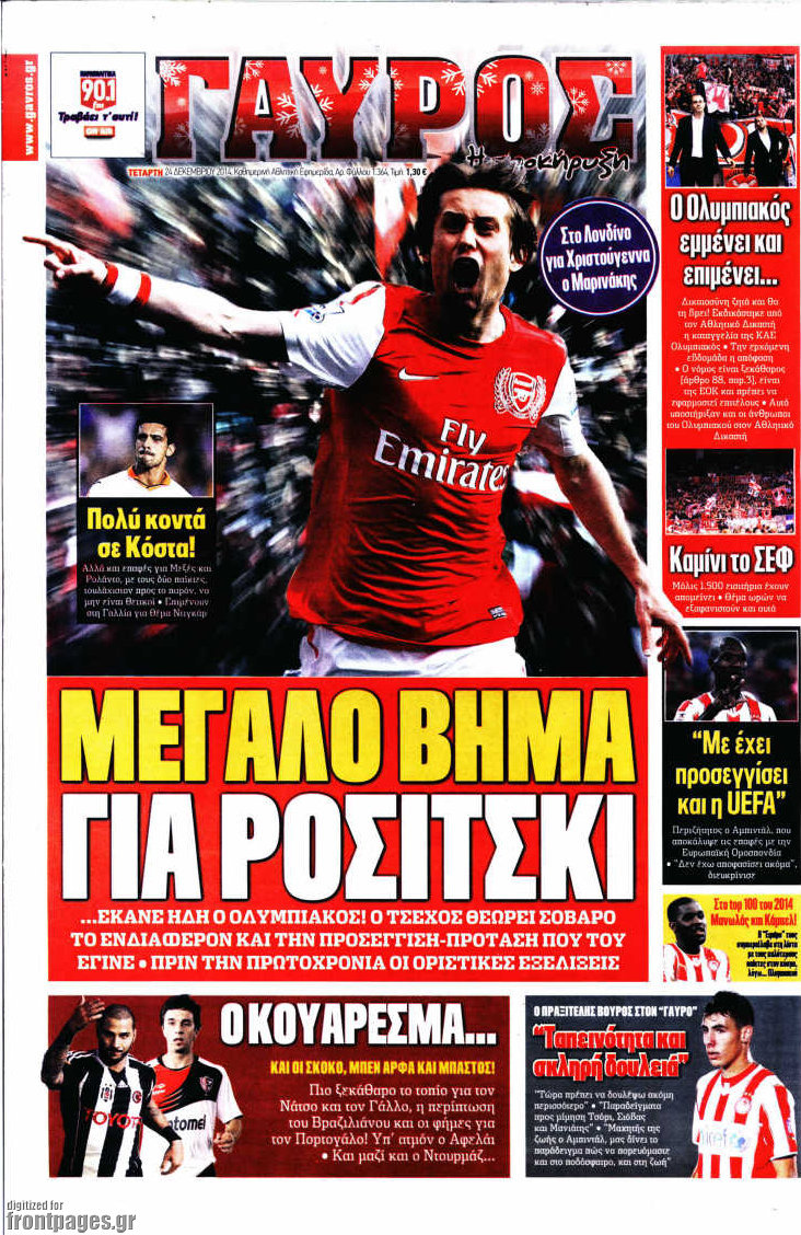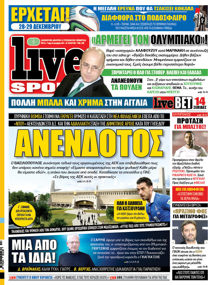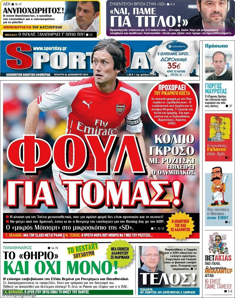 Οι αθλητικές εφημερίδες Enikos Newsroom 08:03, Τετάρτη 24 Δεκεμβρίου 2014 Media Διαβάστε τα πρωτοσέλιδα των αθλητικών εφημερίδων: ΑΘΛΗΤΙΚΕΣ ΕΦΗΜΕΡΙΔΕΣ Μοιράσου το: σχολίασε κι εσύ (0 σχόλια) Ακολουθήστε το enikos.gr στο Google News και μάθετε πρώτοι όλες τις ειδήσεις Δείτε όλες τις τελευταίες ειδήσεις από την Ελλάδα και τον Κόσμο στο enikos.gr Ειδήσεις Ροή Ειδήσεων 5 ώρες πριν Συνεχίζουν τις κινητοποιήσεις οι αγρότες: Κλείνουν τις σήραγγες των Τεμπών για τα φορτηγά – Τι θα γίνει τα Χριστούγεννα 26 λεπτά πριν Από τα μέσα Ιανουαρίου τα πρώτα «ραβασάκια» στους οδηγούς από τις έξυπνες κάμερες – Τι δήλωσε ο Παπαστεργίου 57 λεπτά πριν Μόσχα: Πιθανή εμπλοκή της Ουκρανίας στην έκρηξη βόμβας που σκότωσε Ρώσο στρατηγό 2 ώρες πριν Θεσσαλονίκη: Γρονθοκόπησαν 13χρονο σε αγώνα βόλεϊ γιατί τους… ενοχλούσε το τύμπανο 1 ώρα πριν Τουρκία: Χαοτικές σκηνές στη Βουλή με ξύλο μεταξύ βουλευτών στη συζήτηση για τον προϋπολογισμό – Βίντεο 3 ώρες πριν Τα 4 ζώδια που παίρνουν επιτέλους την αναγνώριση που τους αξίζει – «Απρόσμενες ευκαιρίες, που μοιάζουν με δώρα από το σύμπαν» 49 λεπτά πριν Γυναίκα που έχασε 18 κιλά αποκαλύπτει τα μυστικά της επιτυχίας της: «Σταματήστε να γυμνάζεστε απλώς για να ολοκληρώσετε την προπόνηση» 2 ώρες πριν Έχετε κρατήσει αυτά 8 αντικείμενα από την παιδική ηλικία σας; Δείτε τι αποκαλύπτει για τον χαρακτήρα σας 2 ημέρες πριν Enerwave: Το νέο «ρεύμα» στη λιανική ενέργειας που αλλάζει την εμπειρία του καταναλωτή 31 δευτερόλεπτα πριν Πηγές ΕΛ.ΑΣ. για μπλόκα: Δεν κλείνει κανένας δρόμος χωρίς λόγο 6 λεπτά πριν Κρήτη: Στη φυλακή ο 28χρονος για παιδική πορνογραφία – Η γνωριμία με 15χρονη μέσω social media, οι φωτογραφίες και η καταγγελία 13 λεπτά πριν Σαρκοζί: Από την «κόλαση» της φυλακής στον «παράδεισο» της Γουαδελούπης – Σε διακοπές με την Κάρλα Μπρούνι και την κόρη τους 19 λεπτά πριν ΑΠΕΥΘΕΙΑΣ – Η ενημέρωση από τον Κυβερνητικό Εκπρόσωπο 24 λεπτά πριν Χαμός on air ανάμεσα στις πρωινές εκπομπές του Open και του Mega – «Έχω να δω κάτι τέτοιο από τη δεκαετία του 90’» – «Κάποιοι να κοιτάνε και λίγο στον καθρέφτη» ENIKOS NETWORK Η χειμερινή δραστηριότητα που μπορεί να αυξήσει τον κίνδυνο καρδιακής προσβολής Χοληστερίνη: Το σημάδι στο δέρμα που μπορεί να δείχνει ότι είναι υπερβολικά υψηλή Χρυσός: Νέο ιστορικό υψηλό για την τιμή του – Τι λένε οι αναλυτές Επίδομα θέρμανσης: Ποιοι λαμβάνουν έως αύριο την προκαταβολή – Πότε ακολουθούν οι επόμενες πληρωμές Χαρτογραφώντας το «σημείο χωρίς επιστροφή»: Για πρώτη φορά αποκαλύπτεται με λεπτομέρεια το ακανθώδες όριο της ατμόσφαιρας τ... Η Google καταργεί τη λειτουργία «dark web report» – Πώς θα μπορούν οι χρήστες να διαγράφουν τα δεδομένα τους περισσότερα 12:25 , Δευτέρα 22 Δεκεμβρίου 2025 Χαμός on air ανάμεσα στις πρωινές εκπομπές του Open και του Mega – «Έχω να δω κάτι τέτοιο από τη δεκαετία του 90’» – «Κάποιοι να κοιτάνε και λίγο στον καθρέφτη» Κόντρα στον… αέρα είχαν οι ενημερωτικές εκπομπές της πρωινής ζώνης στο Open και το Mega,... 10:15 , Δευτέρα 22 Δεκεμβρίου 2025 Πρωτοχρονιάτικο δώρο της ΕΡΤ η «Μεγάλη χίμαιρα» – Διπλή πρεμιέρα για την ακριβότερη ελληνική σειρά Με πρωτότυπο τρόπο και σπαστή πρεμιέρα σε ΕΡΤflix και ΕΡΤ1 θα κάνει η δημόσια τηλεόραση το λαν... 09:45 , Δευτέρα 22 Δεκεμβρίου 2025 Ο χριστουγεννιάτικος τηλεμαραθώνιος αλληλεγγύης του ANT1 για τα παιδιά Ο ANT1 διοργανώνει Χριστουγεννιάτικο Τηλεμαραθώνιο για τα Παιδιά την 22η Δεκεμβρίου 2025, με σ... 09:30 , Δευτέρα 22 Δεκεμβρίου 2025 Eurovision 2026: Φαβορί η 