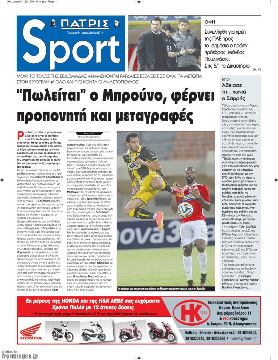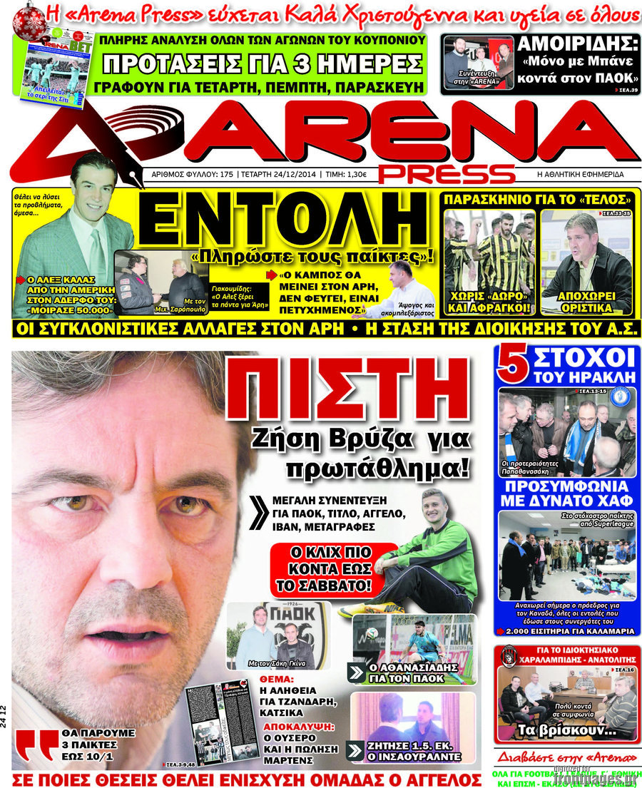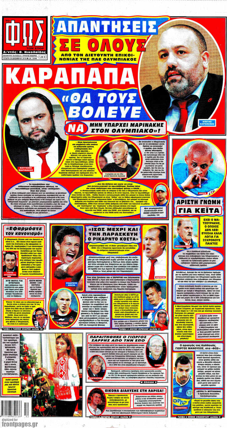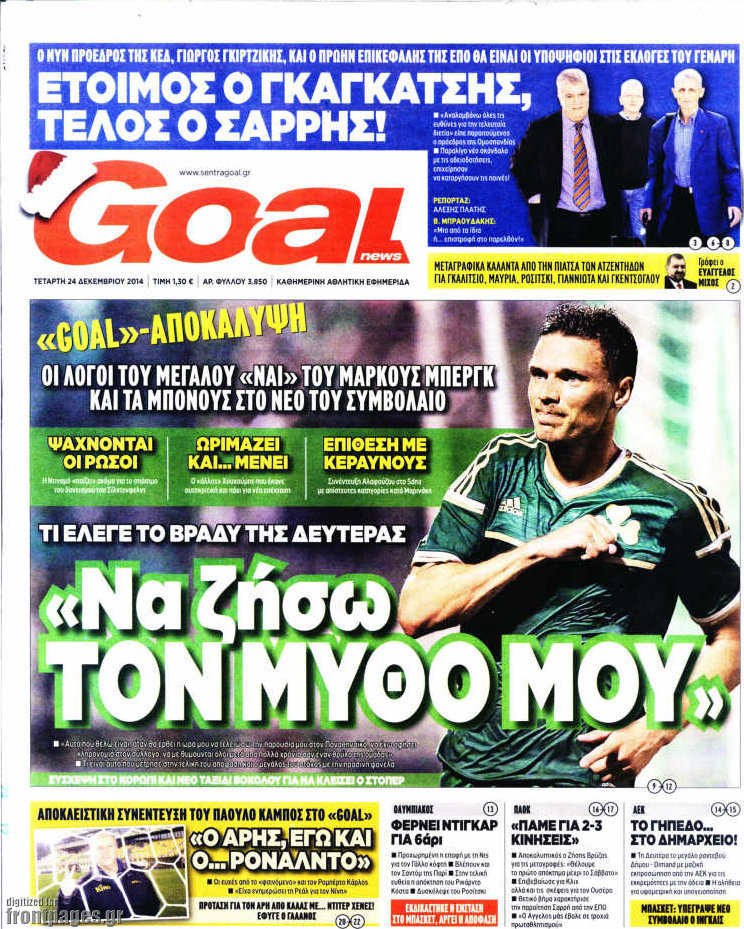 Οι αθλητικές εφημερίδες Enikos Newsroom 08:03, Τετάρτη 24 Δεκεμβρίου 2014 Media Διαβάστε τα πρωτοσέλιδα των αθλητικών εφημερίδων: ΑΘΛΗΤΙΚΕΣ ΕΦΗΜΕΡΙΔΕΣ Μοιράσου το: σχολίασε κι εσύ (0 σχόλια) Ακολουθήστε το enikos.gr στο Google News και μάθετε πρώτοι όλες τις ειδήσεις Δείτε όλες τις τελευταίες ειδήσεις από την Ελλάδα και τον Κόσμο στο enikos.gr Ειδήσεις Ροή Ειδήσεων 5 ώρες πριν Συνεχίζουν τις κινητοποιήσεις οι αγρότες: Κλείνουν τις σήραγγες των Τεμπών για τα φορτηγά – Τι θα γίνει τα Χριστούγεννα 26 λεπτά πριν Από τα μέσα Ιανουαρίου τα πρώτα «ραβασάκια» στους οδηγούς από τις έξυπνες κάμερες – Τι δήλωσε ο Παπαστεργίου 57 λεπτά πριν Μόσχα: Πιθανή εμπλοκή της Ουκρανίας στην έκρηξη βόμβας που σκότωσε Ρώσο στρατηγό 2 ώρες πριν Θεσσαλονίκη: Γρονθοκόπησαν 13χρονο σε αγώνα βόλεϊ γιατί τους… ενοχλούσε το τύμπανο 1 ώρα πριν Τουρκία: Χαοτικές σκηνές στη Βουλή με ξύλο μεταξύ βουλευτών στη συζήτηση για τον προϋπολογισμό – Βίντεο 3 ώρες πριν Τα 4 ζώδια που παίρνουν επιτέλους την αναγνώριση που τους αξίζει – «Απρόσμενες ευκαιρίες, που μοιάζουν με δώρα από το σύμπαν» 49 λεπτά πριν Γυναίκα που έχασε 18 κιλά αποκαλύπτει τα μυστικά της επιτυχίας της: «Σταματήστε να γυμνάζεστε απλώς για να ολοκληρώσετε την προπόνηση» 2 ώρες πριν Έχετε κρατήσει αυτά 8 αντικείμενα από την παιδική ηλικία σας; Δείτε τι αποκαλύπτει για τον χαρακτήρα σας 2 ημέρες πριν Enerwave: Το νέο «ρεύμα» στη λιανική ενέργειας που αλλάζει την εμπειρία του καταναλωτή 31 δευτερόλεπτα πριν Πηγές ΕΛ.ΑΣ. για μπλόκα: Δεν κλείνει κανένας δρόμος χωρίς λόγο 6 λεπτά πριν Κρήτη: Στη φυλακή ο 28χρονος για παιδική πορνογραφία – Η γνωριμία με 15χρονη μέσω social media, οι φωτογραφίες και η καταγγελία 13 λεπτά πριν Σαρκοζί: Από την «κόλαση» της φυλακής στον «παράδεισο» της Γουαδελούπης – Σε διακοπές με την Κάρλα Μπρούνι και την κόρη τους 19 λεπτά πριν ΑΠΕΥΘΕΙΑΣ – Η ενημέρωση από τον Κυβερνητικό Εκπρόσωπο 24 λεπτά πριν Χαμός on air ανάμεσα στις πρωινές εκπομπές του Open και του Mega – «Έχω να δω κάτι τέτοιο από τη δεκαετία του 90’» – «Κάποιοι να κοιτάνε και λίγο στον καθρέφτη» ENIKOS NETWORK Η χειμερινή δραστηριότητα που μπορεί να αυξήσει τον κίνδυνο καρδιακής προσβολής Χοληστερίνη: Το σημάδι στο δέρμα που μπορεί να δείχνει ότι είναι υπερβολικά υψηλή Χρυσός: Νέο ιστορικό υψηλό για την τιμή του – Τι λένε οι αναλυτές Επίδομα θέρμανσης: Ποιοι λαμβάνουν έως αύριο την προκαταβολή – Πότε ακολουθούν οι επόμενες πληρωμές Χαρτογραφώντας το «σημείο χωρίς επιστροφή»: Για πρώτη φορά αποκαλύπτεται με λεπτομέρεια το ακανθώδες όριο της ατμόσφαιρας τ... Η Google καταργεί τη λειτουργία «dark web report» – Πώς θα μπορούν οι χρήστες να διαγράφουν τα δεδομένα τους περισσότερα 12:25 , Δευτέρα 22 Δεκεμβρίου 2025 Χαμός on air ανάμεσα στις πρωινές εκπομπές του Open και του Mega – «Έχω να δω κάτι τέτοιο από τη δεκαετία του 90’» – «Κάποιοι να κοιτάνε και λίγο στον καθρέφτη» Κόντρα στον… αέρα είχαν οι ενημερωτικές εκπομπές της πρωινής ζώνης στο Open και το Mega,... 10:15 , Δευτέρα 22 Δεκεμβρίου 2025 Πρωτοχρονιάτικο δώρο της ΕΡΤ η «Μεγάλη χίμαιρα» – Διπλή πρεμιέρα για την ακριβότερη ελληνική σειρά Με πρωτότυπο τρόπο και σπαστή πρεμιέρα σε ΕΡΤflix και ΕΡΤ1 θα κάνει η δημόσια τηλεόραση το λαν... 09:45 , Δευτέρα 22 Δεκεμβρίου 2025 Ο χριστουγεννιάτικος τηλεμαραθώνιος αλληλεγγύης του ANT1 για τα παιδιά Ο ANT1 διοργανώνει Χριστουγεννιάτικο Τηλεμαραθώνιο για τα Παιδιά την 22η Δεκεμβρίου 2025, με σ... 09:30 , Δευτέρα 22 Δεκεμβρίου 2025 Eurovision 2026: Φαβορί η 