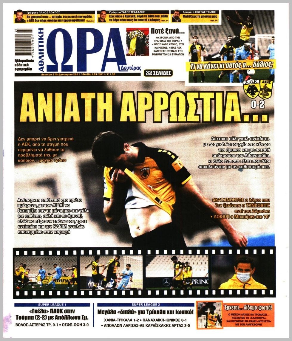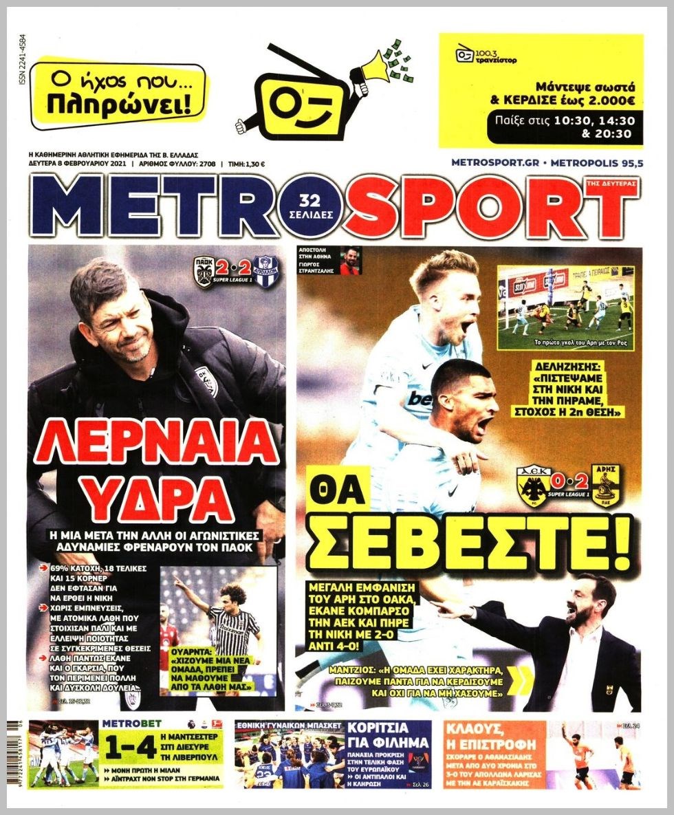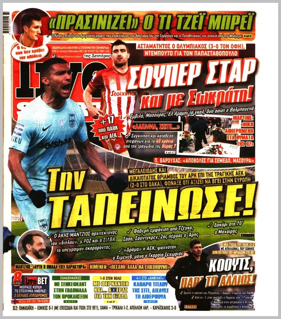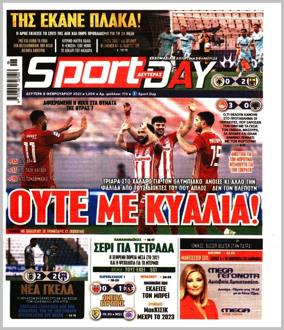 Οι αθλητικές εφημερίδες 8/2/2021 Διονύσης Νίκκας 06:28, Δευτέρα 08 Φεβρουαρίου 2021 Media Διαβάστε τα πρωτοσέλιδα των αθλητικών εφημερίδων… ΑΘΛΗΤΙΚΕΣ ΕΦΗΜΕΡΙΔΕΣ Μοιράσου το: σχολίασε κι εσύ (0 σχόλια) Ακολουθήστε το enikos.gr στο Google News και μάθετε πρώτοι όλες τις ειδήσεις Δείτε όλες τις τελευταίες ειδήσεις από την Ελλάδα και τον Κόσμο στο enikos.gr Ειδήσεις Ροή Ειδήσεων 7 ώρες πριν Χριστούγεννα στα μπλόκα: Επιμένουν στις κινητοποιήσεις τους οι αγρότες – Ανοίγουν τα διόδια το Σαββατοκύριακο 7 ώρες πριν Ουκρανία: Η άνευ προηγουμένου επίθεση σε ρωσικό τάνκερ στη Μεσόγειο και το μήνυμα προς στον Πούτιν – Το «μακρύ χέρι» του Κιέβου 7 ώρες πριν Πούτιν: Τα μηνύματα σε Ευρώπη και ΝΑΤΟ από το μαραθώνιο «σόου» του – Η απαίτηση για «σεβασμό» και η ειρήνη «με τους όρους» της Μόσχας 7 ώρες πριν Τραμπ: Δεν αποκλείει την πιθανότητα ενός πολέμου στη Βενεζουέλα – «Ο Μαδούρο ξέρει καλύτερα από τον καθένα τι ακριβώς θέλω» 8 ώρες πριν Συνεχίζει να προκαλεί ο Μίτσκοσκι: «Για μένα το όνομα Μακεδονία είναι ιερό» 7 ώρες πριν Ανακαλύφθηκαν αρχαία χρυσά νομίσματα 2.200 ετών που απεικονίζουν τον θεό Απόλλωνα – Η άγνωστη σύνδεση με τον Φίλιππο Β΄ της Μακεδονίας 8 ώρες πριν Ύπνος: Μια κρυφή κατάσταση του εγκεφάλου πριν από τον ύπνο μπορεί να είναι το “κλειδί” για υψηλή ευφυΐα και δημιουργικότητα 9 ώρες πριν Αριθμολογία: Οι άνθρωποι που έχουν γεννηθεί αυτές τις 4 ημερομηνίες, συχνά παρεξηγούνται – «Η καλοσύνη τους κρύβει τεράστια δύναμη» 10 ώρες πριν Ξεχάστε το καθάρισμα το Σαββατοκύριακο: Ο «κανόνας των 20 λεπτών» που θα σας λύσει τα χέρια 4 λεπτά πριν Τα ζώδια σήμερα, Σάββατο 20 Δεκεμβρίου: Παρθένοι, το σύμπαν σας δίνει το κλειδί 9 λεπτά πριν Παιανία: Δυο αυτοκίνητα τυλίχτηκαν στις φλόγες – Συναγερμός στην Πυροσβεστική 12 λεπτά πριν Εφημερεύοντα φαρμακεία σε Αθήνα και Θεσσαλονίκη (20/12) 18 λεπτά πριν Γιώργος Μπαρτζώκας: «Για εμένα σημαίνει πάρα πολλά να ακούω το όνομά μου από τον κόσμο του Ολυμπιακού» 28 λεπτά πριν ΟΗΕ: Το Συμβούλιο Ασφαλείας παρατείνει για έναν χρόνο την εντολή της ειρηνευτικής δύναμης στο Κονγκό ENIKOS NETWORK Το ΕΚΑΒ τιμήθηκε από την Ακαδημία Αθηνών για τα 40 χρόνια προσφοράς του Έχετε πραγματικά μεγάλη καρδιά; 10 χαρακτηριστικά όσων έχουν καλοσύνη Αναστολή μέτρων αναγκαστικής εκτέλεσης για κτηνοτρόφους που πλήττονται από την ευλογιά των αιγοπροβάτων Πλήρης επάρκεια προϊόντων στις λαϊκές της Αττικής, παρά τις αγροτικές κινητοποιήσεις – Τι απαντούν οι πωλητές Χαρτογραφώντας το «σημείο χωρίς επιστροφή»: Για πρώτη φορά αποκαλύπτεται με λεπτομέρεια το ακανθώδες όριο της ατμόσφαιρας τ... Η Google καταργεί τη λειτουργία «dark web report» – Πώς θα μπορούν οι χρήστες να διαγράφουν τα δεδομένα τους περισσότερα 04:20 , Σάββατο 20 Δεκεμβρίου 2025 Αγγελική Νικολούλη: Τα συλλυπητήρια για την απώλεια της Ειρήνης Μαρινάκη Τα συλληπητήρια στον πρόεδρο του Mega, τον Βαγγέλη Μαρινάκη, για την απώλεια της μητέρας του Ε... 02:50 , Σάββατο 20 Δεκεμβρίου 2025 GNTM: Η Ξένια Τσίρκοβα αναδείχθηκε μεγάλη νικήτρια και πήρε τις 50.000 ευρώ – Ποιος βρέθηκε σε απόσταση αναπνοής; Με φαντασμαγορικό τρόπο ολοκληρώθηκε το βράδυ της Παρασκευής ο μεγάλος τελικός του GNTM, μέσα ... 22:42 , Παρασκευή 19 Δεκεμβρίου 2025 Γιώργος Γιαννόπουλος για “Το σόι σου”: “Είναι ευτυχία και ευλογία αυτή η σειρά” «Είναι ευτυχία και ευλογία η συγκυρία αυτής της σειράς», θα πει ο Γιώργος Γιαννόπουλος -ο αγαπ... 20:37 , Παρασκευή 19 Δεκεμβρίου 2025 Don’t Forget The Lyrics: Η Έλλη Κο