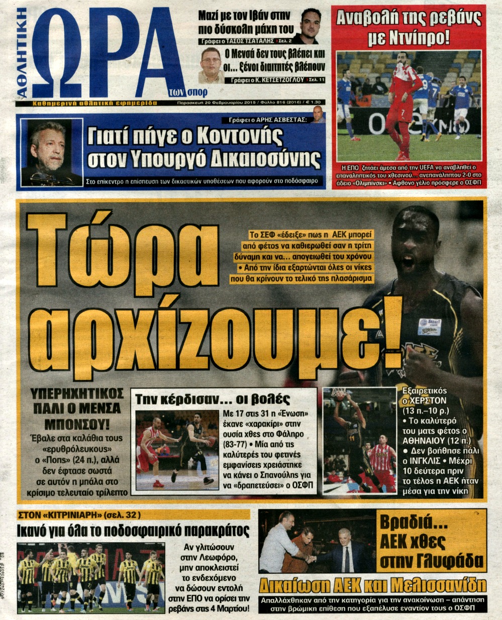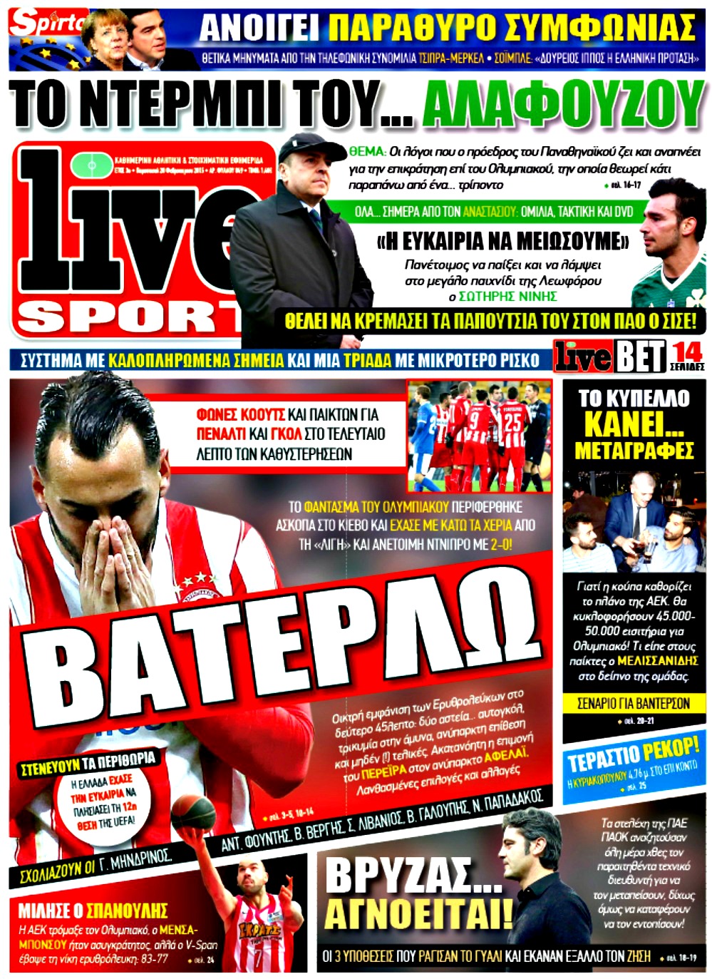 Οι αθλητικές εφημερίδες Enikos Newsroom 07:55, Παρασκευή 20 Φεβρουαρίου 2015 Media Διαβάστε τα πρωτοσέλιδα των αθλητικών εφημερίδων: ΑΘΛΗΤΙΚΕΣ ΕΦΗΜΕΡΙΔΕΣ ΕΦΗΜΕΡΙΔΕΣ ΠΡΩΤΟΣΕΛΙΔΑ Μοιράσου το: σχολίασε κι εσύ (0 σχόλια) Ακολουθήστε το enikos.gr στο Google News και μάθετε πρώτοι όλες τις ειδήσεις Δείτε όλες τις τελευταίες ειδήσεις από την Ελλάδα και τον Κόσμο στο enikos.gr Ειδήσεις Ροή Ειδήσεων 8 ώρες πριν Μητσοτάκης: Αναγκαία η μεταρρύθμιση του πρωτογενούς τομέα – Τα 6 νέα μέτρα για το στεγαστικό και οι αναφορές σε «Ιθάκη» και «πολιτικούς του καναπέ» 7 ώρες πριν Δάνεια σε ελβετικό φράγκο: Τα βασικά σημεία της ρύθμισης – ανάσας για 40.000 δανειολήπτες – Αναλυτικός οδηγός με ερωτήσεις και απαντήσεις 7 ώρες πριν Κυψέλη: Εξιτήριο πήρε η 14χρονη μαθήτρια που μαχαιρώθηκε από την 16χρονη σε σχολείο – «Θέλω να βοηθήσω το παιδί, έχει μπλέξει με κακές παρέες» 6 ώρες πριν Τραμπ: Γιατί κατέθεσε τώρα την αγωγή κατά του BBC – Πώς η κίνησή του εξυπηρετεί το νέο δόγμα του για «αντίσταση» στην Ευρώπη, υπέρ των συντηρητικών 7 ώρες πριν ΟΠΕΚΕΠΕ – Παράνομες επιδοτήσεις: Ελεύθεροι με περιοριστικούς όρους και οι 7 κατηγορούμενοι που απολογήθηκαν σήμερα 6 ώρες πριν Ανακαλύφθηκε βυθισμένη πέτρινη κατασκευή ανοιχτά της Κριμαίας – Αποτελεί μέρος αρχαίας ελληνικής αποικίας 7 ώρες πριν Ύπνος: Αυτό μπορεί να είναι το χειρότερο λάθος για το βιολογικό ρολόι σας, σύμφωνα με ειδικό 8 ώρες πριν Αριθμολογία: Οι άνθρωποι που έχουν γεννηθεί αυτές τις 3 ημερομηνίες, προσελκύουν μεγάλη τύχη πριν από το τέλος του 2025 10 ώρες πριν Οι 7 συμπεριφορές που μαρτυρούν ότι ένας άνδρας επενδύει μακροπρόθεσμα σε μια σχέση 2 λεπτά πριν Κόστα Ρίκα: Το Κογκρέσο απέρριψε το αίτημα για άρση της ασυλίας του προέδρου Τσάβες 10 λεπτά πριν Κολομβία: Νεκροί τέσσερις αστυνομικοί σε βομβιστικές επιθέσεις ανταρτών 18 λεπτά πριν Στάση εργασίας 11:00 – 17:00 σήμερα στα λεωφορεία του ΟΑΣΑ – Ποιες γραμμές θα λειτουργήσουν 33 λεπτά πριν Παλαιστινιακό: «Η λύση των δύο κρατών είναι ο μόνος βιώσιμος δρόμος», τόνισε η Ελλάδα στο Συμβούλιο Ασφαλείας του ΟΗΕ 41 λεπτά πριν Ελένη Καρακάση: «Ένιωθα πολύ αδικημένη, δεν μπορούσα να ελέγξω τον εαυτό μου σε δύσκολες στιγμές» ENIKOS NETWORK Αίτημα ΙΣΑ για την εξαίρεση των προσωπικών γιατρών από τις κατ’ οίκον επισκέψεις Η σκανδιναβική μέθοδος στον ύπνο που μπορεί να σώσει έναν γάμο Πιερρακάκης: Ο προϋπολογισμός συμβάλλει ουσιαστικά στην ενίσχυση της αγοραστικής δύναμης της πλειονότητας των εργαζομένων e-ΕΦΚΑ: Παρατείνεται η προθεσμία για την υποβολή ΑΠΔ – Ποιους αφορά Σύγχρονος Νοστράδαμος: Προειδοποιεί για «μεγάλο γεγονός» τους επόμενους μήνες που θα συγκλονίσει τη Βρετανία και τον κόσμο Τεστ παρατηρητικότητας: Μπορείτε να βρείτε τις 3 διαφορές στις εικόνες με έναν πιγκουίνο σε 14 δευτερόλεπτα περισσότερα 20:06 , Τρίτη 16 Δεκεμβρίου 2025 Ο ΣΚΑΙ καταγγέλλει τον ΕΚΚΟΜΕΔ Επιστολή με την οποία καταγράφει την έντονη διαμαρτυρία του προς τον διευθύνοντα σύμβουλο του... 17:40 , Τρίτη 16 Δεκεμβρίου 2025 Eurovision: Στις 4 Ιανουαρίου αποκαλύπτονται τα 28 τραγούδια του ελληνικού τελικού Η αγωνία τελειώνει, η γιορτή της Eurovision αρχίζει στην ΕΡΤ από τις πρώτες ημέρες της νέας χρ... 17:09 , Τρίτη 16 Δεκεμβρίου 2025 Alter Ego Media: Βαθύτατη θλίψη και ειλικρινή συλλυπητήρια για την απώλεια της Ειρήνης Μαρινάκη Τη βαθύτατη θλίψη και τα ειλικρινή συλλυπητήριά της εκφράζει η Alter Ego Media για τον θάνατο ... 13:00 , Τρίτη 16 Δεκεμβρίου 2025 «Στο Παρά Πέντε – 20 Χρόνια Μετά»: 
