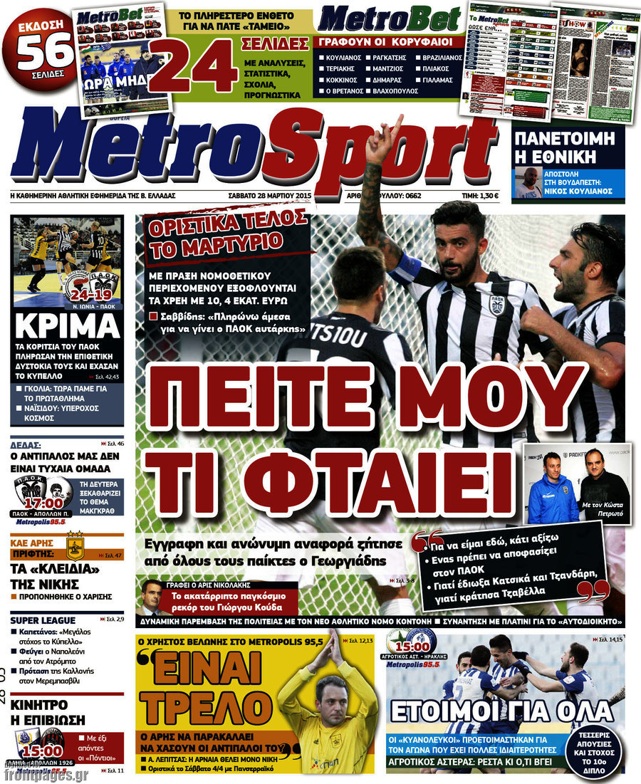 Οι αθλητικές εφημερίδες Enikos Newsroom 07:40, Σάββατο 28 Μαρτίου 2015 Media Διαβάστε τα σημερινά πρωτοσέλιδα των αθλητικών εφημερίδων: ΑΘΛΗΤΙΚΕΣ ΕΦΗΜΕΡΙΔΕΣ ΕΦΗΜΕΡΙΔΕΣ ΠΡΩΤΟΣΕΛΙΔΑ Μοιράσου το: σχολίασε κι εσύ (0 σχόλια) Ακολουθήστε το enikos.gr στο Google News και μάθετε πρώτοι όλες τις ειδήσεις Δείτε όλες τις τελευταίες ειδήσεις από την Ελλάδα και τον Κόσμο στο enikos.gr Ειδήσεις Ροή Ειδήσεων 1 ώρα πριν ΣΥΡΙΖΑ: Διαγράφεται ο ευρωβουλευτής Νίκος Παππάς μετά την μήνυση δημοσιογράφου για ξυλοδαρμό 2 ώρες πριν Πώς στήθηκε η επιχείρηση «Ίπαλλος» που οδήγησε στη σύλληψη του «Έλληνα Εσκομπάρ» – «Ο πόλεμος ενάντια στους εμπόρους ναρκωτικών θα συνεχιστεί» 2 ώρες πριν Δίκη Χρυσής Αυγής: Την ενοχή και των 42 κατηγορουμένων ζητά η εισαγγελέας 2 ώρες πριν Κυψέλη: Στη φυλακή η 16χρονη που μαχαίρωσε συμμαθήτριά της 5 ώρες πριν Αμοργός: «Θα προσπαθήσω να το κάνω κάθε μέρα» – Ποιος είναι ο αγρότης που έστησε μόνος του το πρώτο μπλόκο στο νησί 2 ώρες πριν Τα 3 ζώδια που θα δουν τη ζωή τους να αλλάζει ριζικά το 2026 – «Όλα γίνονται καλύτερα σταδιακά» 7 ώρες πριν «Δεν είχα κλάψει από τότε που διαγνώστηκα με καρκίνο, ώσπου ένα τηλεφώνημα με έκανε να λυγίσω» – Η συγκλονιστική εξομολόγηση ενός άνδρα 3 ώρες πριν Ο σπάνιος σεισμός που έλυσε τα χέρια των επιστημόνων – Αποκάλυψε ακριβώς όσα αναζητούσαν 9 ώρες πριν 20 χρόνια τα Χριστούγεννα ξεκινούν στα Public με μεγάλη ποικιλία σε δώρα! 3 λεπτά πριν Τουρκία: Επιδιώκει την επιστροφή των S-400 στη Ρωσία – Οι αμερικανικές πιέσεις 8 λεπτά πριν Στις Βρυξέλλες ο Κυριάκος Μητσοτάκης για τη Σύνοδο Κορυφής ΕΕ-Δυτικών Βαλκανίων και τη συνεδρίαση του Ευρωπαϊκού Συμβουλίου 14 λεπτά πριν ΟΠΕΚΕΠΕ: Ελεύθερες με όρους η σύζυγος και η αδελφή του φερόμενου αρχηγού – Τι υποστήριξαν 16 λεπτά πριν Υπουργείο Εργασίας: Οι 5 άξονες του σχεδίου δράσης για την ενίσχυση των συλλογικών συμβάσεων – Δείτε την Υπουργική Απόφαση 20 λεπτά πριν Καβάλα: Βίντεο ντοκουμέντο από διάρρηξη σε καφετέρια – Έσπασαν την τζαμαρία, άρπαξαν το συρτάρι του ταμείου και έγιναν καπνός ENIKOS NETWORK Γιατί αναζητούμε τα Χριστούγεννα όλο και νωρίτερα; Ποιοι οι ψυχολογικοί και οι συναισθηματικοί λόγοι Σοβαροί κίνδυνοι από τη λάθος χορήγηση φαρμάκου για τις αιμορραγίες-Συστάσεις προς τους γιατρούς Έρχεται νέα ενίσχυση 17.500 ευρώ από τη ΔΥΠΑ για ανέργους- Όλες οι λεπτομέρειες «Αναταράξεις» στην εφοδιαστική αλυσίδα από τα μπλόκα: Επιστολή του Συνδέσμου Θεσσαλικών Βιομηχανιών στον πρωθυπουργό -Τι αν... Χαρτογραφώντας το «σημείο χωρίς επιστροφή»: Για πρώτη φορά αποκαλύπτεται με λεπτομέρεια το ακανθώδες όριο της ατμόσφαιρας τ... Η Google καταργεί τη λειτουργία «dark web report» – Πώς θα μπορούν οι χρήστες να διαγράφουν τα δεδομένα τους περισσότερα 12:35 , Τετάρτη 17 Δεκεμβρίου 2025 Μίρκα Παπακωνσταντίνου: «Δεν ήμουν αισιόδοξη για τα νούμερα – Είμαι ρεαλίστρια» Στα γυρίσματα του εορταστικού επεισοδίου της αγαπημένης σειράς “Το Σόι Σου”, βρέθηκε η κάμερα ... 12:12 , Τετάρτη 17 Δεκεμβρίου 2025 Ακούστε την εκπομπή του Νίκου Χατζηνικολάου 17/12/2025 Ακούστε την εκπομπή του Νίκου Χατζηνικολάου στον ραδιοφωνικό σταθμό RealFm 97,8, την Τετάρτη 1... 11:35 , Τετάρτη 17 Δεκεμβρίου 2025 Home Alone: Το σπίτι της ταινίας θα ανακαινιστεί – Επιστροφή στην αισθητική της δεκαετίας του ’90 Οι νέοι ιδιοκτήτες του πραγματικού σπιτιού που παρουσιάζεται στην κλασική ταινία του 1990 «Hom... 11:25 , Τετάρτη 17 Δεκεμβρίου 2025 Grand Hotel: Απόψε το τελευταίο επεισόδιο της χρονιάς – Όλα τα μυστ