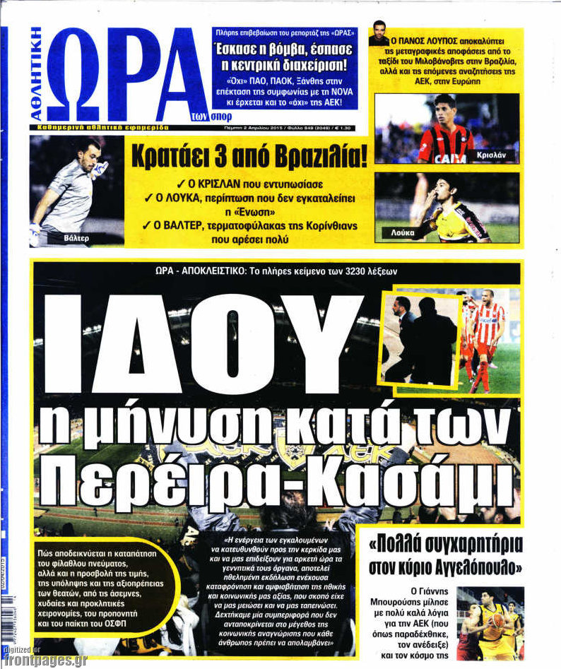 Οι αθλητικές εφημερίδες Enikos Newsroom 08:58, Πέμπτη 02 Απριλίου 2015 Media Διαβάστε τα σημερινά πρωτοσέλιδα των αθλητικών εφημερίδων: ΑΘΛΗΤΙΚΕΣ ΕΦΗΜΕΙΔΕΣ ΕΦΗΜΕΡΙΔΕΣ ΠΡΩΤΟΣΕΛΙΔΑ Μοιράσου το: σχολίασε κι εσύ (0 σχόλια) Ακολουθήστε το enikos.gr στο Google News και μάθετε πρώτοι όλες τις ειδήσεις Δείτε όλες τις τελευταίες ειδήσεις από την Ελλάδα και τον Κόσμο στο enikos.gr Ειδήσεις Ροή Ειδήσεων 2 ώρες πριν Αγρότες: Πολύωροι αποκλεισμοί στα τελωνεία Προμαχώνα, Εξοχής, Ευζώνων και Νίκης – Κλείνουν τον κόμβο Φιλώτα οι παραγωγοί στη Δυτική Μακεδονία 2 ώρες πριν Νίκος Παππάς: Ζητώ συγγνώμη για αυτό το επεισόδιο – Δεν τον γρονθοκόπησα 4 ώρες πριν Ευρωπαϊκό Συμβούλιο: Όλες οι λεπτομέρειες για το δάνειο των 90 δισ. ευρώ στην Ουκρανία – Τα συμπεράσματα της Συνόδου Κορυφής 3 ώρες πριν Αίγιο: 22χρονη κατήγγειλε ότι έπεσε θύμα βιασμού και ληστείας από συγγενικά της πρόσωπα 2 ώρες πριν Τρομακτικό βίντεο: Η στιγμή της έκρηξης στο τζετ που μετέφερε τον οδηγό του NASCAR, Γκρεγκ Μπιφλ και την οικογένειά του 2 ώρες πριν Αλλαγή σελίδας για 3 ζώδια – «Μία δύσκολη περίοδος φτάνει στο τέλος της» 2 ημέρες πριν 20 χρόνια τα Χριστούγεννα ξεκινούν στα Public με μεγάλη ποικιλία σε δώρα! 3 ώρες πριν Ο σύζυγός της συμπεριφέρεται όπως το παιδί τους – «Χρησιμοποιεί αστείες δικαιολογίες για να μην κάνει δουλειές και να ξοδεύει λεφτά» 1 ώρα πριν Γεμάτος νεροχύτης; 5 σοβαρές ευθύνες που «φοβίζουν» όσους αφήνουν άπλυτα πιάτα 7 λεπτά πριν Οδοντιατρικός Σύλλογος Αττικής: Προσοχή στις παραπλανητικές διαφημίσεις οδοντικών εμφυτευμάτων 13 λεπτά πριν Αλεξάνδρα Νίκα για Κωνσταντίνο Αργυρό: «Τον συμβουλεύομαι για όλα» – Πώς θα περάσουν τις γιορτές 19 λεπτά πριν Κρήτη: Στο Ρέθυμνο μεταφέρονται οι εκατοντάδες μετανάστες που διασώθηκαν ανοιχτά της Γαύδου 24 λεπτά πριν Ειδικός μοιράζεται 6 κόλπα για να διατηρείστε σε φόρμα με πάνω από 40 ώρες εργασίας την εβδομάδα: «Προπονηθείτε πριν από τη δουλειά, όχι μετά» 32 λεπτά πριν Γονείς για πρώτη φορά ο Πιτ Ντέιβιντσον και η Έλσι Χιούιτ ENIKOS NETWORK Κίνδυνος παραπλάνησης από διαφημίσεις οδοντικών εμφυτευμάτων Καρκίνος του πνεύμονα: Έως 8.000 ζωές μπορούν να σωθούν με την έγκαιρη διάγνωση ΕΥΔΑΠ: Στο τραπέζι αλλαγές στους λογαριασμούς του νερού – Τι θα ισχύσει για ευάλωτα νοικοκυριά και επιχειρήσεις Επιδόματα και παροχές από τον ΟΠΕΚΑ: Τι πιστώνεται σήμερα στους τραπεζικούς λογαριασμούς Χαρτογραφώντας το «σημείο χωρίς επιστροφή»: Για πρώτη φορά αποκαλύπτεται με λεπτομέρεια το ακανθώδες όριο της ατμόσφαιρας τ... Η Google καταργεί τη λειτουργία «dark web report» – Πώς θα μπορούν οι χρήστες να διαγράφουν τα δεδομένα τους περισσότερα 08:00 , Παρασκευή 19 Δεκεμβρίου 2025 Την Κυριακή με τη Realnews: Δωροεπιταγή 10€ Δωροεπιταγή αξίας 10€ για αγορές άνω των 60€ από τα πολυκαταστήματα FactoryOutlet H προσφορά ι... 05:48 , Παρασκευή 19 Δεκεμβρίου 2025 Οι οικονομικές εφημερίδες 19/12/2025 Διαβάστε τα πρωτοσέλιδα από τις οικονομικές εφημερίδες, σήμερα 19/12/2025. 05:43 , Παρασκευή 19 Δεκεμβρίου 2025 Οι αθλητικές εφημερίδες 19/12/2025 Διαβάστε τα πρωτοσέλιδα από τις αθλητικές εφημερίδες, σήμερα 19/12/2025. 05:38 , Παρασκευή 19 Δεκεμβρίου 2025 Οι πολιτικές εφημερίδες 19/12/2025 Διαβάστε τα πρωτοσέλιδα από τις πολιτικές εφημερίδες, σήμερα 19/12/2025. ΤΕΛΕΥΤΑΙΕΣ ΕΙΔΗΣΕΙΣ 7 λεπτά πριν Οδοντιατρικός Σύλλογος Αττικής: Προσοχή στις... 13 λεπτά πριν Αλεξάνδρα Νίκα για Κωνσταντίνο Αργυρό: «Τον... 19 λεπτά πριν Κρήτη: Στο Ρέθυμνο μεταφέρονται οι εκατοντάδες... 24 λεπτά πριν Ειδικός 