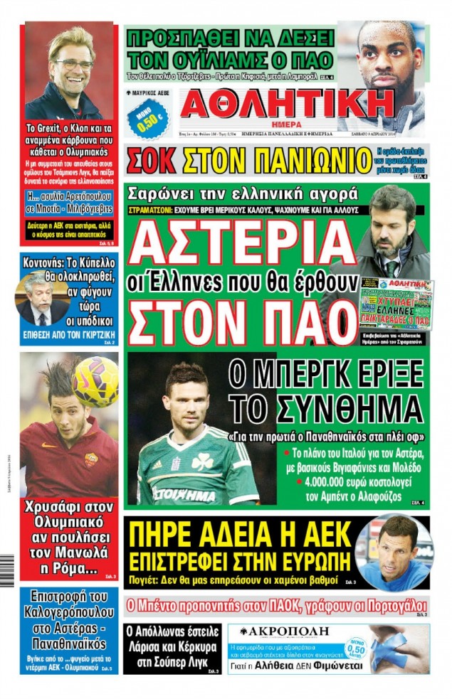 Οι αθλητικές εφημερίδες 9/4/2016 Enikos Newsroom 06:27, Σάββατο 09 Απριλίου 2016 Media Διαβάστε τα σημερινά πρωτοσέλιδα των αθλητικών εφημερίδων: ΑΘΛΗΤΙΚΕΣ ΕΦΗΜΕΡΙΔΕΣ ΠΡΩΤΟΣΕΛΙΔΑ Μοιράσου το: σχολίασε κι εσύ (0 σχόλια) Ακολουθήστε το enikos.gr στο Google News και μάθετε πρώτοι όλες τις ειδήσεις Δείτε όλες τις τελευταίες ειδήσεις από την Ελλάδα και τον Κόσμο στο enikos.gr Ειδήσεις Ροή Ειδήσεων 1 ώρα πριν ΗΠΑ: Κατέρριψαν ιρανικό drone που πλησίαζε το αεροπλανοφόρο Lincoln 2 ώρες πριν Νέα Πέραμος: Είχε δολοφονηθεί και ο θείος του 27χρονου το 1999 – «Όλη η οικογένεια ήξερε ότι ο Μανώλης κινδύνευε» είπε ο πατέρας του 2 ώρες πριν Αμβούργο: Αυτούς που παρήγγειλαν το σαμποτάζ στα πολεμικά πλοία αναζητούν οι γερμανικές αρχές – Ποιος είναι ο 55χρονος Έλληνας που συνελήφθη 4 ώρες πριν «Αναβρασμός» για τον 13ο και 14ο μισθό στο Δημόσιο: Εν αναμονή δημοσίευσης της απόφασης του ΣτΕ – Τι ζητεί η ΑΔΕΔΥ, τι αναφέρει η Ένωση Δικαστών και Εισαγγελέων 6 ώρες πριν Τέμπη: Τα «γυμνά» καθίσματα του Intercity 62 στη φωτιά και οι τραγικές συνέπειες – «Ενδεχομένως κάποιοι να είχαν γλιτώσει, εάν ήταν πυράντοχα» 55 λεπτά πριν Οι άνδρες που δεν σταματούν ποτέ να κάνουν τις γυναίκες τους να νιώθουν ξεχωριστές, έχουν συνήθως αυτά τα 4 ιδιαίτερα χαρακτηριστικά 5 ώρες πριν Τα 3 ζώδια που θα δουν τη ζωή τους να βελτιώνεται αισθητά μέχρι τα τέλη Φεβρουαρίου – «Τα πράγματα πηγαίνουν προς το καλύτερο» 6 ώρες πριν Είναι τελικά επικίνδυνο να κάθεστε σε μια δημόσια τουαλέτα; Η επιστήμη ίσως σας εκπλήξει 2 ώρες πριν Air fryer: Η απλή μέθοδος καθαρισμού για να απαλλαγείτε από τη βρωμιά σε 2 λεπτά χωρίς τρίψιμο 7 λεπτά πριν ΣΥΡΙΖΑ: Εισαγωγή στην Τριτοβάθμια Εκπαίδευση με ένα σύστημα που να ανοίγει δρόμους και όχι να τους κλείνει 15 λεπτά πριν Dubai BC – Ολυμπιακός 108-98: «Λύγισαν» στην παράταση οι «ερυθρόλευκοι» 20 λεπτά πριν Αυστραλία: Ατρόμητος έφηβος κολύμπησε 4 ώρες σε φουρτουνιασμένη θάλασσα για να σώσει τη μητέρα και τα αδέλφια του 28 λεπτά πριν Θεσσαλονίκη: Συνελήφθη γυναίκα που δάγκωσε το αυτί του συντρόφου της και έκοψε κομμάτι 34 λεπτά πριν Μαρίν Λεπέν: Την επικύρωση των πρωτόδικων ποινών της πρότεινε ο εισαγγελέας – Τι σημαίνει η στέρηση του δικαιώματος του εκλέγεσθαι ENIKOS NETWORK Κρίση άγχους: Το πρώτο πράγμα που προτείνει ένας ψυχοθεραπευτής να κάνετε για να ηρεμήσετε Άδωνις Γεωργιάδης: Σε app για το κινητό τηλέφωνο το Εθνικό Μητρώο Νεοπλασιών Στην πρώτη 5άδα σε ζήτηση η Αθήνα: Πώς διαμορφώνεται η πληρότητα στα ξενοδοχεία Μικρές επιχειρήσεις: Πωλήσεις αγαθών χωρίς ΦΠΑ έως 100.000 ευρώ στην ευρωπαϊκή αγορά – Η διαδικασία των αιτήσεων Ευπάθεια στο moltbook ai αποκαλύπτει email, tokens σύνδεσης και api keys Αυτός είναι ο ρόλος της μικρής τρύπας στους νυχοκόπτες – «Είμαι ο μόνος που δεν το ήξερε;»» περισσότερα 19:52 , Τρίτη 03 Φεβρουαρίου 2026 Να μ’ αγαπάς: Ο Θεόφιλος ζητά από την Σοφία να φύγει από το σπίτι Στο σπίτι των Καλλιγά, τα αληθινά αποτελέσματα DNA επιβεβαιώνουν ότι η Εβίτα είναι κόρη του Θε... 10:57 , Τρίτη 03 Φεβρουαρίου 2026 Ακούστε το σχόλιο του Νίκου Χατζηνικολάου 3/2/2026 Ακούστε το σχόλιο του Νίκου Χατζηνικολάου στον ραδιοφωνικό σταθμό Realfm 97,8, την Τρίτη 3 Φεβ... 10:42 , Τρίτη 03 Φεβρουαρίου 2026 Τηλεθέαση (2/2): Ανατροπή στους πίνακες για την πρωινή ψυχαγωγική ζώνη Στις πρωινές εκπομπές, οι «Αταίριαστοι» του ΣΚΑΪ βρέθηκαν στην κορυφή της τηλεθέασης τόσο στο ... 05:48 , Τρίτη 03 Φεβρουαρίου 2026 Οι οικονομικές εφημερίδες 3/2/2026 Διαβάστε τα πρωτοσέλιδα από τις οικονομικές εφημερί