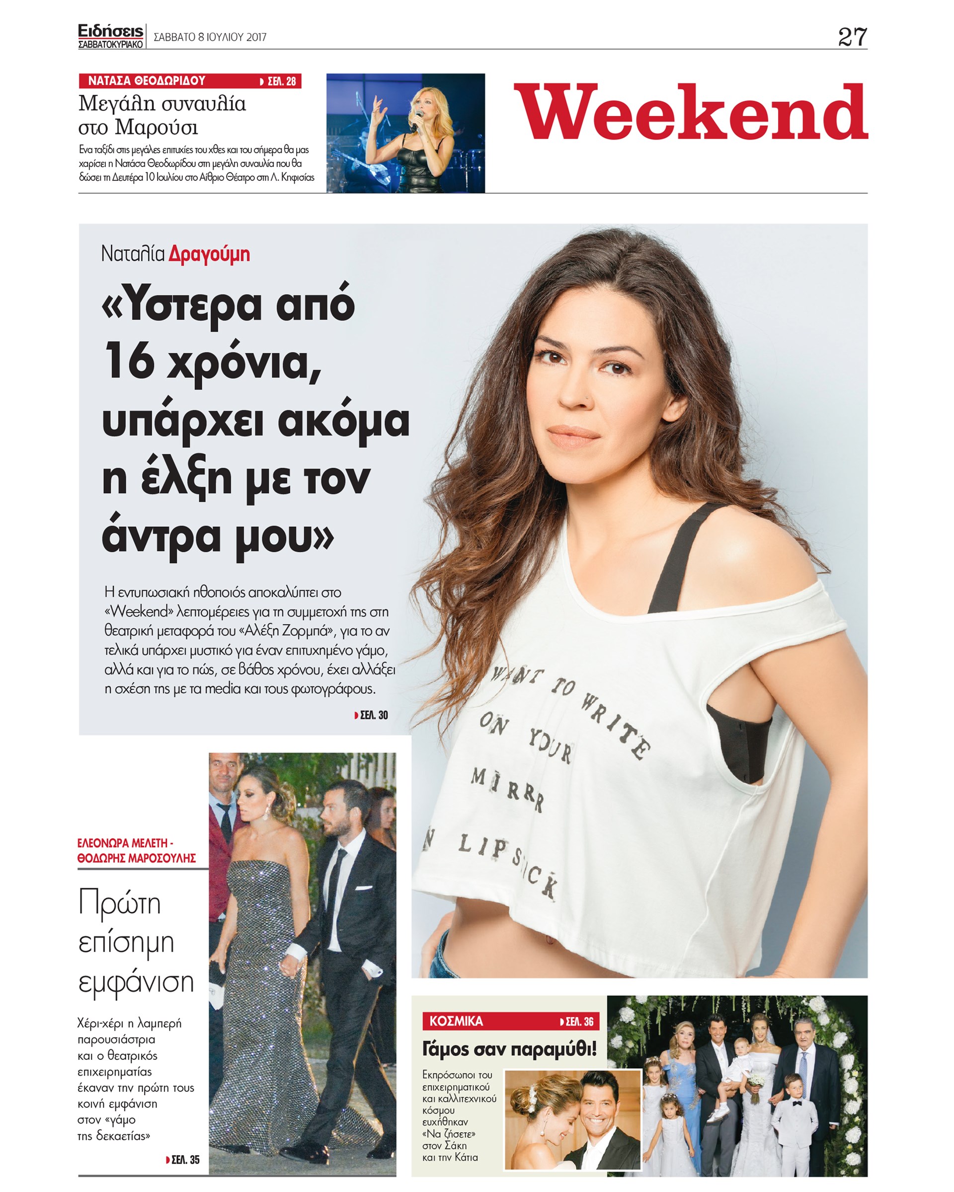 Με τίτλο «Tι αλλάζει στο Δημόσιο» κυκλοφορεί σήμερα η εφημερίδα «Ειδήσεις» του Σαββατοκύριακου του Real Group.Η εφημερίδα αποκαλύπτει τις αλλαγές που φέρνει στο Δημόσιο η τρίτη αξιολόγηση, στο επίκεντρο της οποίας βρίσκεται μια σειρά παρεμβάσεων στην κρατική μηχανή.Στις «Ειδήσεις» μπορείτε ακόμη να διαβάσετε:-Δημοσκόπηση της ΜRB. «Βέτο στην Ε.Ε. αν η Τουρκία συνεχίσει να προκαλεί στο Αιγαίο». -Αποκαλυπτικές συνεντεύξεις του υφυπουργού παρά τω Πρωθυπουργώ Δημήτρη Λιάκου, που δηλώνει ότι είναι «πολύτιμη η συμβολή Τσακαλώτου», και του βουλευτή της Νέας Δημοκρατίας Γιώργου Κουμουτσάκου, ο οποίος τονίζει: «Δεν θα παίξουμε το παιχνίδι του ΣΥΡΙΖΑ».Επίσης, ρεπορτάζ για: -Την περιπέτεια υγείας της Μαρίας Μενούνος. «Με έσωσε η ασθένεια της μητέρας μου», λέει στις «Ειδήσεις».- Την πρώτη συνάντηση του Ντόναλντ Τραμπ με τον Βλαντιμίρ Πούτιν στο περιθώριο της Συνόδου του G20 στο Αμβούργο.- Λεπτομέρειες για την αγορά του Σκορπιού, όπως τις περιγράφει σε βιβλίο ο Ρώσος μεγιστάνας Ντμίτρι Ριμπολόβλεφ.
