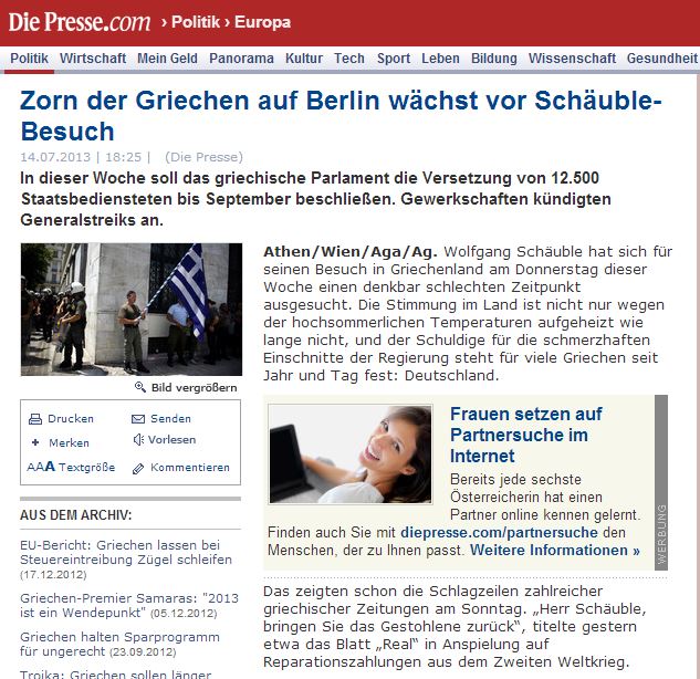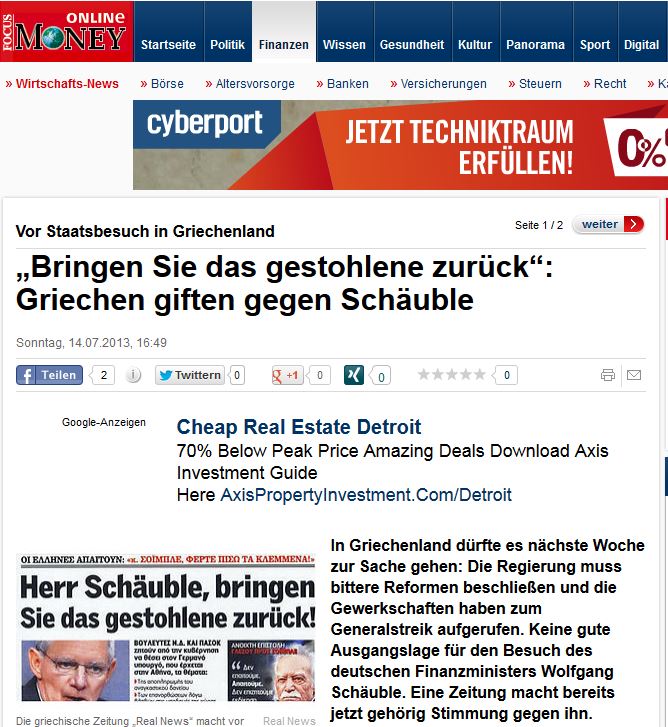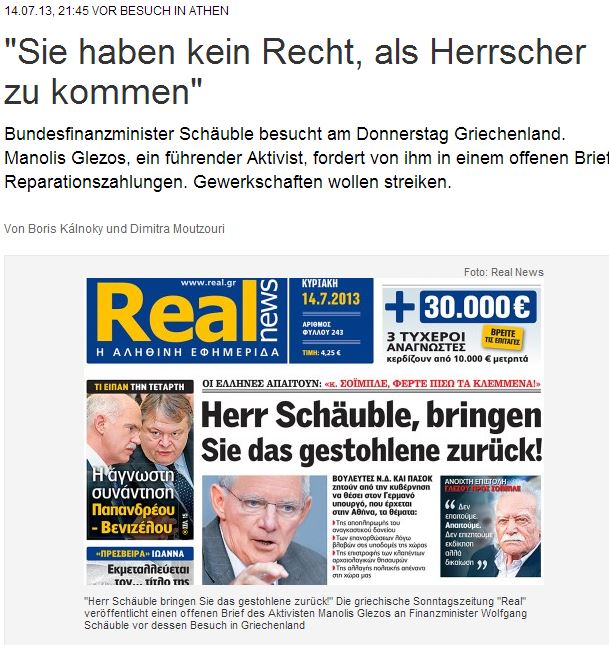 «Με μία επίσκεψη στη χώρα, στην οποία έχει δαιμονοποιηθεί ως η αιτία όλης της δυστυχίας του ελληνικού λαού, ο υπουργός Οικονομικών, Βόλφγκανγκ Σόιμπλε, θέλει να ‘κερδίσει’ τις καρδιές των Ελλήνων και να τους αλλάξει τη γνώμη για τη Γερμανία και τη λιτότητα. Δεν ακούγεται και πολύ καλό αυτό…» γράφει η γερμανική εφημερίδα ενώ λίγο πιο πάνω δεσπόζει το πρωτοσέλιδο της Real News με τον τίτλο στα γερμανικά: «Herr Schäuble, bringen Sie das gestohlene zurück!»