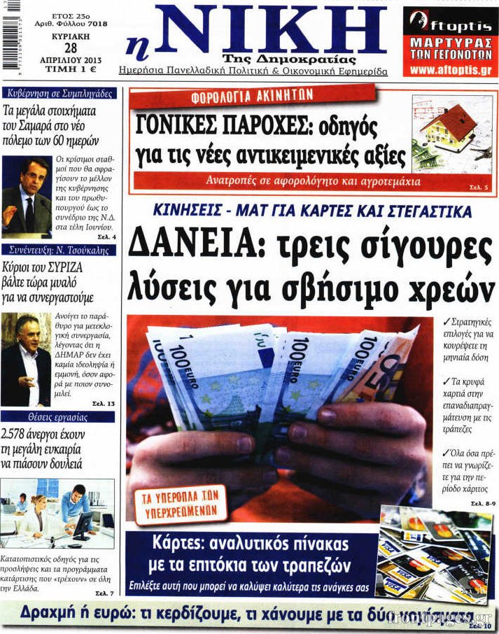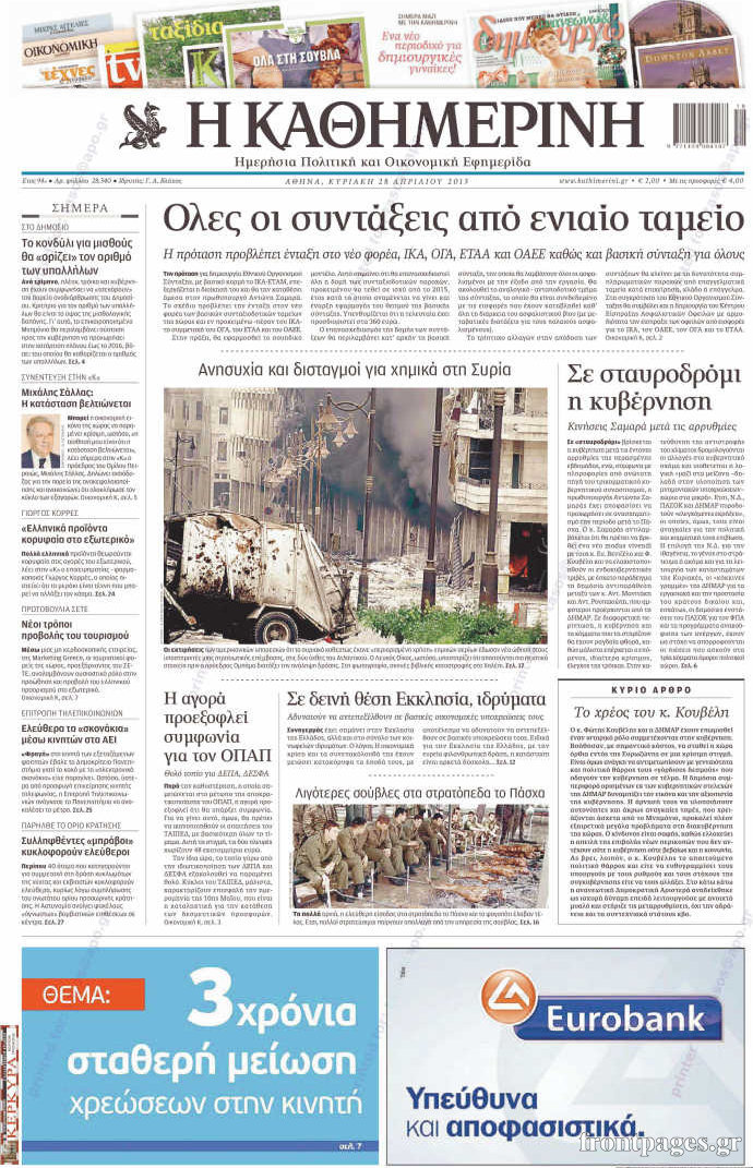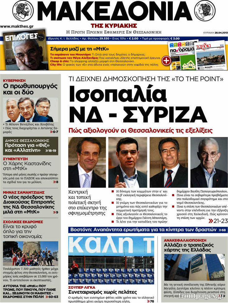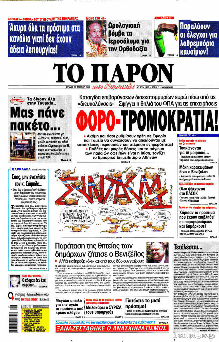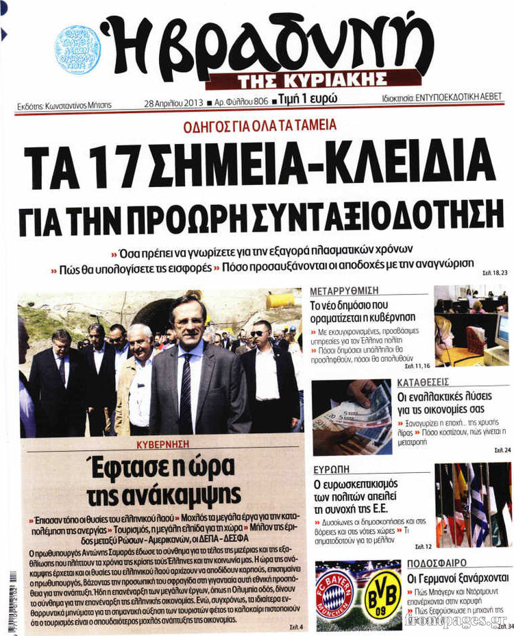 Οι κυριακάτικες εφημερίδες Enikos Newsroom 09:39, Κυριακή 28 Απριλίου 2013 Media Οι κυριακάτικες εφημερίδες ΚΥΡΙΑΚΑΤΙΚΕΣ ΕΦΗΜΕΡΙΔΕΣ ΠΟΛΙΤΙΚΕΣ ΕΦΗΜΕΡΙΔΕΣ Μοιράσου το: σχολίασε κι εσύ (0 σχόλια) Ακολουθήστε το enikos.gr στο Google News και μάθετε πρώτοι όλες τις ειδήσεις Δείτε όλες τις τελευταίες ειδήσεις από την Ελλάδα και τον Κόσμο στο enikos.gr Ειδήσεις Ροή Ειδήσεων 8 ώρες πριν Μακελειό στο Σίδνεϊ: Πατέρας και γιος οι δράστες της τρομοκρατικής επίθεσης – Γιατί η Αυστραλία βάζει στο στόχαστρο το Ιράν 8 ώρες πριν Μακελειό στην Αυστραλία: «Πέρασαν οι σφαίρες πάνω από το αυτοκίνητο» – Συγκλονίζει η μαρτυρία Έλληνα που ζει στο Σίδνεϊ 7 ώρες πριν Τρομοκρατική επίθεση στο Σίδνεϊ: «Το αναπόφευκτο συνέβη πλέον» – Πώς οι δράστες είχαν χάσει τον ανθρωπισμό τους πριν πατήσουν την σκανδάλη 7 ώρες πριν Όλα τα αιτήματα αγροτών, κτηνοτρόφων και μελισσοκόμων προς την κυβέρνηση – Παραμένουν στα μπλόκα και προαναγγέλλουν κλιμάκωση 10 ώρες πριν Λακωνία: Βίντεο ντοκουμέντο από την επιχείρηση διάσωσης της 13χρονης που έπεσε σε πηγάδι – Ποια ήταν τα πρώτα λόγια της 21 λεπτά πριν Οπτική ψευδαίσθηση: Μόνο το 1% των ανθρώπων θα βρει το ψάρι σε 12 δευτερόλεπτα 36 λεπτά πριν Διατροφή: Γιατρός προειδοποιεί για 2 απλά λάθη που αυξάνουν τον κίνδυνο χρόνιων παθήσεων 1 ώρα πριν Τα ζώδια σήμερα, Δευτέρα 15 Δεκεμβρίου: Ιχθύες, ξεκινήστε από εκεί που η παρουσία σας έχει σημασία 9 ώρες πριν Ύπνος: 5 λόγοι για τους οποίους ξυπνάτε κουρασμένοι το πρωί κατά τη διάρκεια του χειμώνα 5 λεπτά πριν Δημόσιο χρέος: Η Ελλάδα αποπληρώνει σήμερα πρόωρα 5,287 δισ. ευρώ από το πρώτο μνημόνιο – Στα 1,6 δισ. ευρώ η ελάφρυνση 13 λεπτά πριν Τραγωδία στην Κολομβία: Δεκαεπτά νεκροί, ανάμεσά τους 16 μαθητές λυκείου, από πτώση λεωφορείου σε χαράδρα 21 λεπτά πριν Οπτική ψευδαίσθηση: Μόνο το 1% των ανθρώπων θα βρει το ψάρι σε 12 δευτερόλεπτα 28 λεπτά πριν Δώρο Χριστουγέννων 2025: Πότε ξεκινά η πληρωμή του και πως να το υπολογίσετε – Ποιοι θα πάρουν περισσότερα φέτος 36 λεπτά πριν Διατροφή: Γιατρός προειδοποιεί για 2 απλά λάθη που αυξάνουν τον κίνδυνο χρόνιων παθήσεων ENIKOS NETWORK 8 κορυφαίες συμβουλές για άνδρες που θέλουν φλογερή σεξουαλική ζωή, σύμφωνα με ειδικό Baby botox: Ποια τα οφέλη και οι κίνδυνοι του να ξεκινήσει κάποιος τις ενέσεις πριν εμφανιστούν ρυτίδες Τέλος οι διώξεις για χρέη σε Εφορία και ΕΦΚΑ – Τι προβλέπει νέα διάταξη μετά την πτώχευση Υπουργείο Αγροτικής Ανάπτυξης: Ενισχύσεις de minimis ύψους 2,1 εκατ. ευρώ – Οι δικαιούχοι Σύγχρονος Νοστράδαμος: Προειδοποιεί για «μεγάλο γεγονός» τους επόμενους μήνες που θα συγκλονίσει τη Βρετανία και τον κόσμο Τεστ παρατηρητικότητας: Μπορείτε να βρείτε τις 3 διαφορές στις εικόνες με έναν πιγκουίνο σε 14 δευτερόλεπτα περισσότερα 05:49 , Δευτέρα 15 Δεκεμβρίου 2025 Οι οικονομικές εφημερίδες 15/12/2025 Διαβάστε τα πρωτοσέλιδα από τις οικονομικές εφημερίδες, σήμερα 15/12/2025. 05:43 , Δευτέρα 15 Δεκεμβρίου 2025 Οι αθλητικές εφημερίδες 15/12/2025 Διαβάστε τα πρωτοσέλιδα από τις αθλητικές εφημερίδες, σήμερα 15/12/2025. 05:38 , Δευτέρα 15 Δεκεμβρίου 2025 Οι πολιτικές εφημερίδες 15/12/2025 Διαβάστε τα πρωτοσέλιδα από τις πολιτικές εφημερίδες, σήμερα 15/12/2025. 21:34 , Κυριακή 14 Δεκεμβρίου 2025 Ο Δικαστής: Η Λέττα είναι αποφασισμένη να αποκαλύψει την αλήθεια για το τροχαίο, απόψε στις 21:45 στον ΑΝΤ1 Ραγδαίες οι εξελίξεις στο νέο επεισόδιο της σειράς “Ο Δικαστής” απόψε στις 21:45 σ... ΤΕΛΕΥΤΑΙΕΣ ΕΙΔΗΣΕΙΣ 5 λεπτά πριν Δημόσιο χρέος: Η Ελλάδα αποπληρώνει σήμερα πρόωρα 5