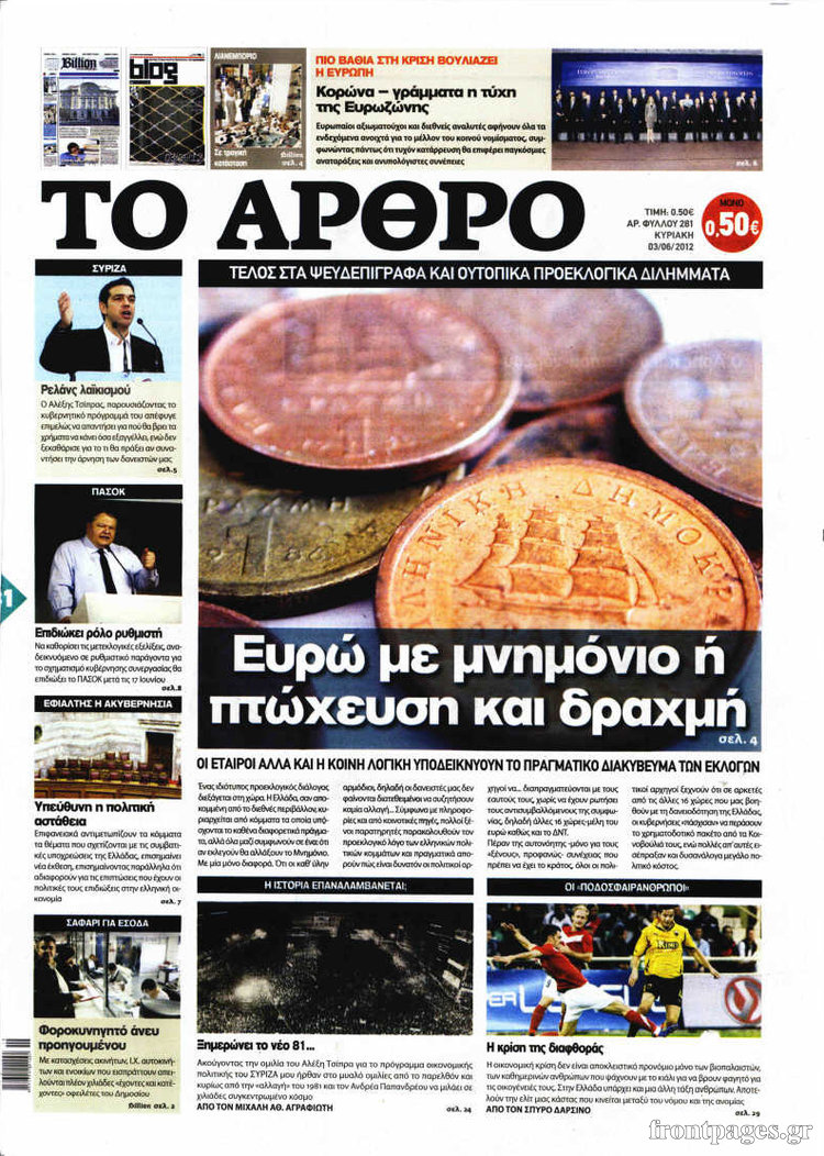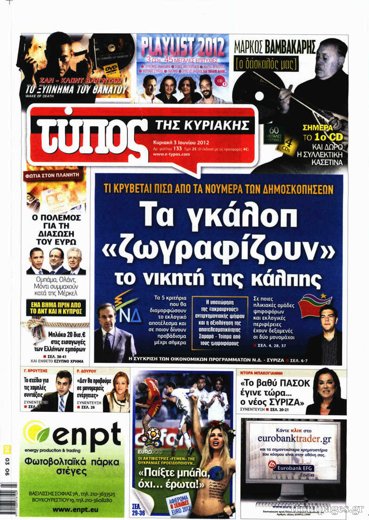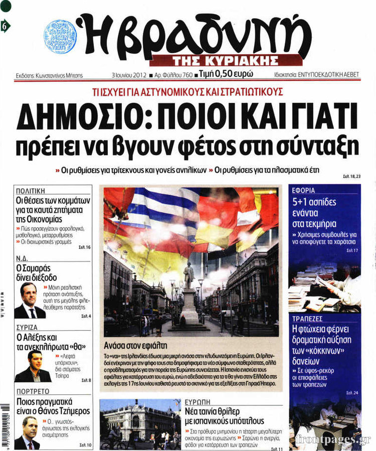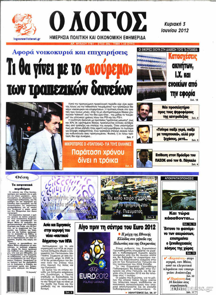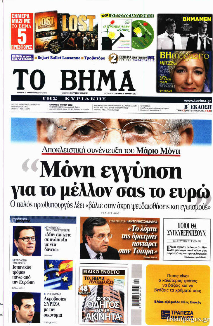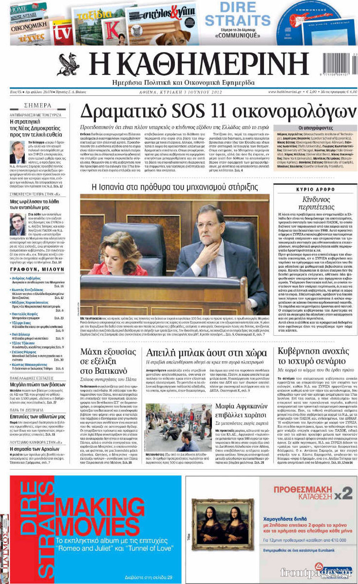 Οι κυριακάτικες εφημερίδες Enikos Newsroom 08:56, Κυριακή 03 Ιουνίου 2012 Media ΕΦΗΜΕΡΙΔΕΣ Μοιράσου το: σχολίασε κι εσύ (0 σχόλια) Ακολουθήστε το enikos.gr στο Google News και μάθετε πρώτοι όλες τις ειδήσεις Δείτε όλες τις τελευταίες ειδήσεις από την Ελλάδα και τον Κόσμο στο enikos.gr Ειδήσεις Ροή Ειδήσεων 9 ώρες πριν Χριστούγεννα στα μπλόκα: Επιμένουν στις κινητοποιήσεις τους οι αγρότες – Ανοίγουν τα διόδια το Σαββατοκύριακο 1 ώρα πριν Σαρωτικοί οι έλεγχοι στους δρόμους ενόψει εορτών – Μπλόκα της τροχαίας σε κεντρικές αρτηρίες της Αττικής 8 ώρες πριν Πούτιν: Τα μηνύματα σε Ευρώπη και ΝΑΤΟ από το μαραθώνιο «σόου» του – Η απαίτηση για «σεβασμό» και η ειρήνη «με τους όρους» της Μόσχας 7 ώρες πριν ΗΠΑ: Η κυβέρνηση του Ντόναλντ Τραμπ άρχισε να δημοσιοποιεί τα αρχεία Έπσταϊν 8 ώρες πριν Άνω Λιόσια: Πυροβολισμοί σε επιχείρηση με χαλιά – Εντοπίστηκαν 10 κάλυκες 1 ώρα πριν Αυγά: Πόσα μπορείτε να τρώτε την ημέρα με ασφάλεια για μέγιστη πρόσληψη πρωτεΐνης 2 ώρες πριν Τα ζώδια σήμερα, Σάββατο 20 Δεκεμβρίου: Παρθένοι, το σύμπαν σας δίνει το κλειδί 8 ώρες πριν Ανακαλύφθηκαν αρχαία χρυσά νομίσματα 2.200 ετών που απεικονίζουν τον θεό Απόλλωνα – Η άγνωστη σύνδεση με τον Φίλιππο Β΄ της Μακεδονίας 1 ώρα πριν Οπτική ψευδαίσθηση: Μόνο αν είσαι ο Σέρλοκ Χολμς θα βρεις τον αριθμό «87» σε 7 δευτερόλεπτα 5 λεπτά πριν Οι αθλητικές μεταδόσεις 20/12/2025 15 λεπτά πριν Εορτολόγιο: Ποιοι γιορτάζουν σήμερα 20 Δεκεμβρίου 22 λεπτά πριν Συρία: Μπαράζ αμερικανικών επιδρομών εναντίον του ISIS – «Πλήττουμε δυνατά οχυρά του ΙΚ» λέει ο Ντόναλντ Τραμπ 31 λεπτά πριν Αναβολή συμφωνίας ΕΕ-Mercosur: Ο χρόνος «δεν είναι απεριόριστος» προειδοποιεί η Παραγουάη 45 λεπτά πριν Κίριλ Ντμίτριεφ: Στις ΗΠΑ ο απεσταλμένος της Ρωσίας για συνομιλίες με τους ομολόγους του, Γουίτκοφ και Κούσνερ ENIKOS NETWORK Πρέπει να αποδέχεστε ή να απορρίπτετε όλα τα cookies; Ένας ειδικός εξηγεί Η αγαπημένη λιχουδιά των πόνι που μπορεί να ενισχύσει όραση, εγκέφαλο και ανοσοποιητικό Αναστολή μέτρων αναγκαστικής εκτέλεσης για κτηνοτρόφους που πλήττονται από την ευλογιά των αιγοπροβάτων Πλήρης επάρκεια προϊόντων στις λαϊκές της Αττικής, παρά τις αγροτικές κινητοποιήσεις – Τι απαντούν οι πωλητές Χαρτογραφώντας το «σημείο χωρίς επιστροφή»: Για πρώτη φορά αποκαλύπτεται με λεπτομέρεια το ακανθώδες όριο της ατμόσφαιρας τ... Η Google καταργεί τη λειτουργία «dark web report» – Πώς θα μπορούν οι χρήστες να διαγράφουν τα δεδομένα τους περισσότερα 05:48 , Σάββατο 20 Δεκεμβρίου 2025 Οι οικονομικές εφημερίδες 20/12/2025 Διαβάστε τα πρωτοσέλιδα από τις οικονομικές εφημερίδες, σήμερα 20/12/2025. 05:43 , Σάββατο 20 Δεκεμβρίου 2025 Οι αθλητικές εφημερίδες 20/12/2025 Διαβάστε τα πρωτοσέλιδα από τις αθλητικές εφημερίδες, σήμερα 20/12/2025. 05:38 , Σάββατο 20 Δεκεμβρίου 2025 Οι πολιτικές εφημερίδες 20/12/2025 Διαβάστε τα πρωτοσέλιδα από τις πολιτικές εφημερίδες, σήμερα 20/12/2025. 04:20 , Σάββατο 20 Δεκεμβρίου 2025 Αγγελική Νικολούλη: Τα συλλυπητήρια για την απώλεια της Ειρήνης Μαρινάκη Τα συλληπητήρια στον πρόεδρο του Mega, τον Βαγγέλη Μαρινάκη, για την απώλεια της μητέρας του Ε... ΤΕΛΕΥΤΑΙΕΣ ΕΙΔΗΣΕΙΣ 5 λεπτά πριν Οι αθλητικές μεταδόσεις 20/12/2025 15 λεπτά πριν Εορτολόγιο: Ποιοι γιορτάζουν σήμερα 20 Δεκεμβρίου 22 λεπτά πριν Συρία: Μπαράζ αμερικανικών επιδρομών εναντίον του ISIS... 31 λεπτά πριν Αναβολή συμφωνίας ΕΕ-Mercosur: Ο χρόνος «δεν είναι... 45 λεπτά πριν Κίριλ Ντμίτριεφ: Στις ΗΠΑ ο απεσταλμένος της Ρωσίας... 53 λεπτά πριν ΔΕΔΔΗΕ: Διακοπές ρεύματος σήμερα 