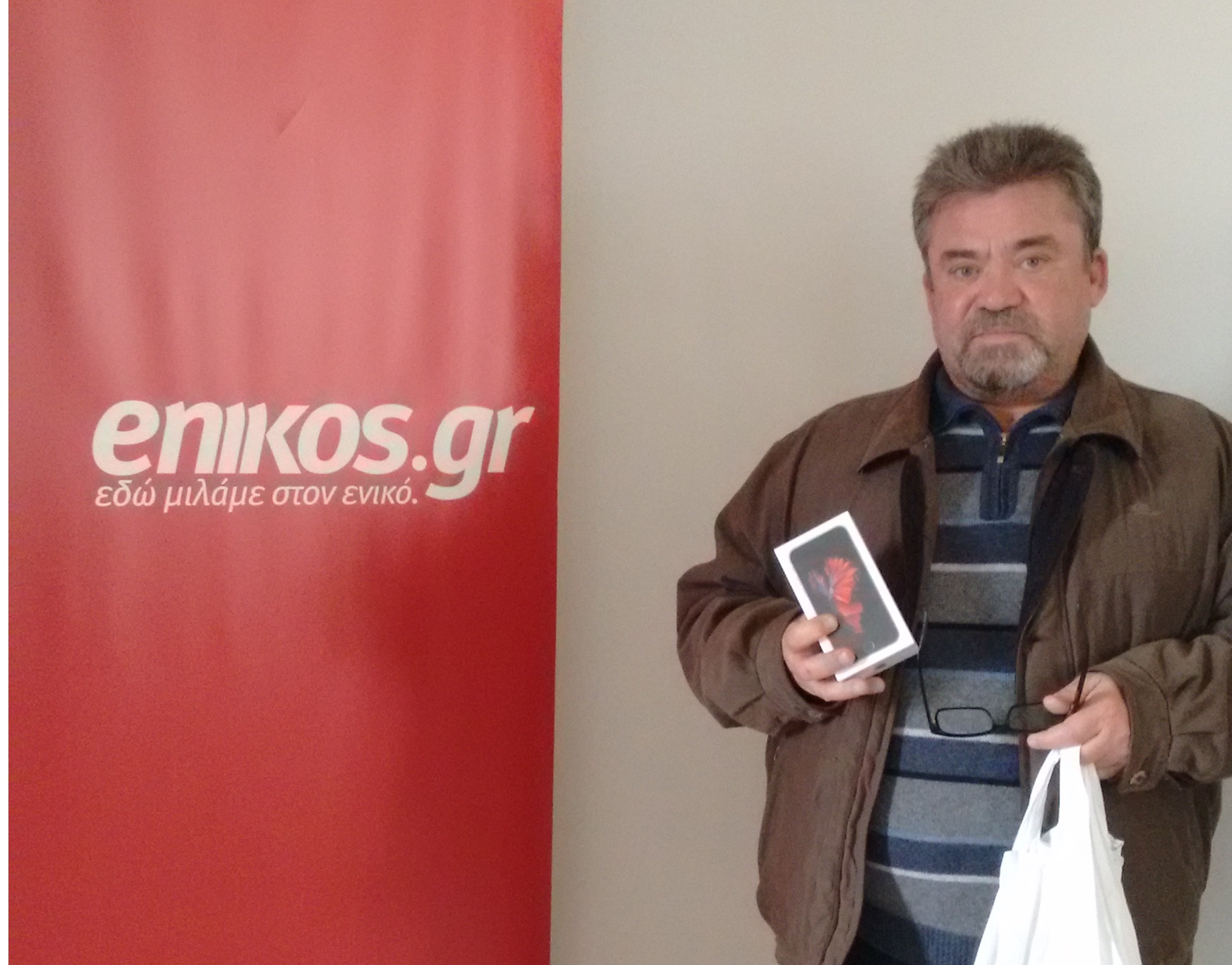 Ο νικητής του iPhone, Αθανάσιος Δημητρίου όταν παρέλαβε το δικό του έπαθλο.