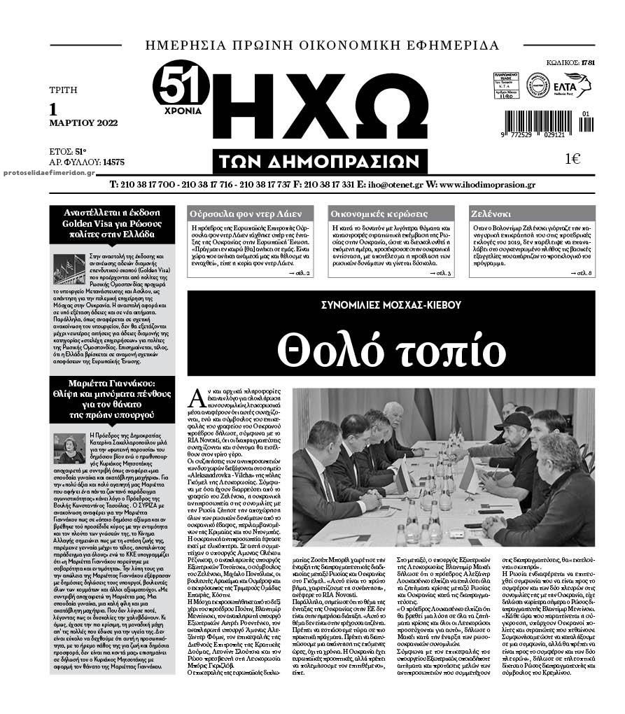 Οι οικονομικές εφημερίδες 1/3/2022 Σήφης Γαρυφαλάκης 06:21, Τρίτη 01 Μαρτίου 2022 Media Διαβάστε τα πρωτοσέλιδα από τις οικονομικές εφημερίδες… ΕΦΗΜΕΡΙΔΕΣ ΟΙΚΟΝΟΜΙΚΕΣ ΕΦΗΜΕΡΙΔΕΣ ΠΡΩΤΟΣΕΛΙΔΑ Μοιράσου το: σχολίασε κι εσύ (0 σχόλια) Ακολουθήστε το enikos.gr στο Google News και μάθετε πρώτοι όλες τις ειδήσεις Δείτε όλες τις τελευταίες ειδήσεις από την Ελλάδα και τον Κόσμο στο enikos.gr Ειδήσεις Ροή Ειδήσεων 1 ώρα πριν Νίκος Παππάς: Το παρασκήνιο της αποπομπής του – Οι μπουνιές, τα μηνύματα μετά την επίθεση και η διαγραφή από τον ΣΥΡΙΖΑ 15 λεπτά πριν Ντόναλντ Τραμπ: Το διάγγελμα, η πτώση στις δημοσκοπήσεις και το… χάος που κληρονόμησε από τον Μπάιντεν 1 ώρα πριν Άστατος ο καιρός τα Χριστούγεννα: Βαρομετρικό χαμηλό από τον κόλπο της Σύρτης «ξεκλειδώνει» κακοκαιρίες – Πώς θα εξελιχθεί έως την Πρωτοχρονιά 2 ώρες πριν Φοινικούντα: Παραδόθηκε 30χρονος στην Καλαμάτα για τη διπλή δολοφονία 2 ώρες πριν Αγρότες: Ανυποχώρητοι στα μπλόκα – Στις Σέρρες σήμερα η κρίσιμη συνεδρίαση της Πανελλαδικής Επιτροπής 4 ώρες πριν Καούρα: Το μπαχαρικό που είναι «εξίσου αποτελεσματικό» με την ομεπραζόλη, σύμφωνα με ειδικούς 4 ώρες πριν Οπτική ψευδαίσθηση: Μόνο οι πιο έξυπνοι άνθρωποι θα βρουν 7 ξωτικά 15 δευτερόλεπτα 52 λεπτά πριν Η σύζυγός του παραπονιέται για τα χρήματα που της δίνει για ψώνια κάθε μήνα – «Λέει ότι νιώθει φτωχή και της είπα να βρει δουλειά» 1 ημέρα πριν 20 χρόνια τα Χριστούγεννα ξεκινούν στα Public με μεγάλη ποικιλία σε δώρα! 7 λεπτά πριν Μάριο Πινέιδα: Ο αμυντικός του Ισημερινού σκοτώθηκε σε ένοπλη επίθεση στη Γκουαγιακίλ 15 λεπτά πριν Ντόναλντ Τραμπ: Το διάγγελμα, η πτώση στις δημοσκοπήσεις και το… χάος που κληρονόμησε από τον Μπάιντεν 21 λεπτά πριν Τηλεθέαση (17/12): Η μάχη στην prime time ζώνη 26 λεπτά πριν Απολογούνται σήμερα ο Έλληνας «Εσκομπάρ» και οι υπόλοιποι συλληφθέντες για το φορτίο με την κοκαΐνη – Ο ρόλος του 73χρονου συνεργού του 32 λεπτά πριν Νέα ωκεανογραφική αποστολή στη Σαντορίνη: Στο μικροσκόπιο το σεισμικό σμήνος του 2025 – Πώς αντιδρούν τα ηφαιστειακά συστήματα της περιοχής ENIKOS NETWORK 5 ασκήσεις που εξαφανίζουν το «σωσίβιο» πιο γρήγορα από τους κοιλιακούς μετά τα 50 «Έκανα χρόνια μανικιούρ με τζελ μέχρι που κινδύνευσαν να πέσουν» – Πώς ήταν το σημάδι στο νύχι που την προειδοποίησε Οφειλές προς το Δημόσιο: «Φρένο» στα σενάρια για νέα ρύθμιση – Τι απαντά το υπουργείο Εθνικής Οικονομίας και Οικονομικών Φοροδιαφυγή: Ποιοι φορολογούμενοι κινδυνεύουν να πληρώσουν «τσουχτερά» πρόστιμα Χαρτογραφώντας το «σημείο χωρίς επιστροφή»: Για πρώτη φορά αποκαλύπτεται με λεπτομέρεια το ακανθώδες όριο της ατμόσφαιρας τ... Η Google καταργεί τη λειτουργία «dark web report» – Πώς θα μπορούν οι χρήστες να διαγράφουν τα δεδομένα τους περισσότερα 08:00 , Πέμπτη 18 Δεκεμβρίου 2025 Την Κυριακή με τη Realnews: Δωροεπιταγή 10€ Δωροεπιταγή αξίας 10€ για αγορές άνω των 60€ από τα πολυκαταστήματα FactoryOutlet H προσφορά ι... 07:50 , Πέμπτη 18 Δεκεμβρίου 2025 «Το σόι σου»: Backstage στα γυρίσματα για το εορταστικό επεισόδιο «Το σόι σου» φορά τα γιορτινά του για τα Χριστούγεννα και η Όλγα Λαφαζάνη, με την κάμερα του «... 07:36 , Πέμπτη 18 Δεκεμβρίου 2025 Οι αθλητικές μεταδόσεις 18/12/2025 – Πού θα δείτε τον αγώνα της ΑΕΚ με την Κραϊόβα για το Conference League Τα ματς ΑΕΚ – Ουνιβερσιτάτεα Κραϊόβα για το Conference League και Παναθηναϊκός – Χάποελ Τελ Αβ... 05:48 , Πέμπτη 18 Δεκεμβρίου 2025 Οι οικονομικές εφημερίδες 18/12/2025 Διαβάστε τα πρωτοσέλιδα από τις οικονομικές εφημερίδε