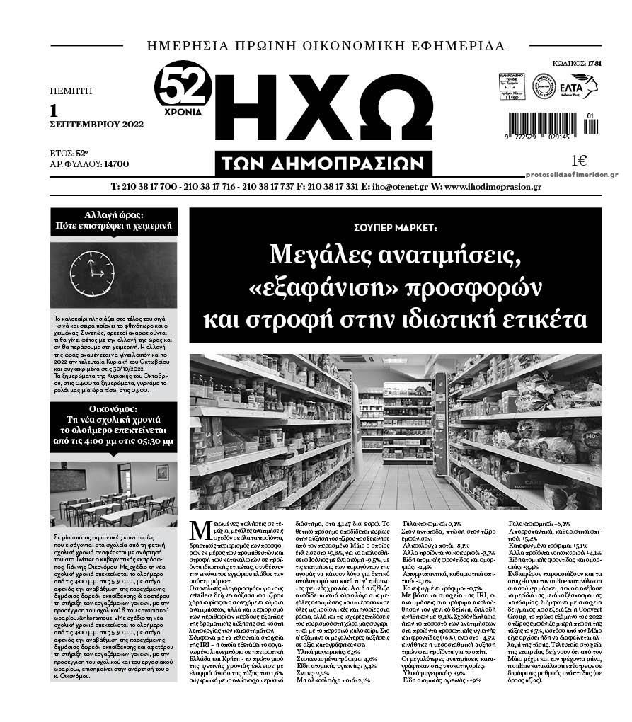 Διαβάστε τα πρωτοσέλιδα από τις οικονομικές εφημερίδες, σήμερα 1/9/2022.