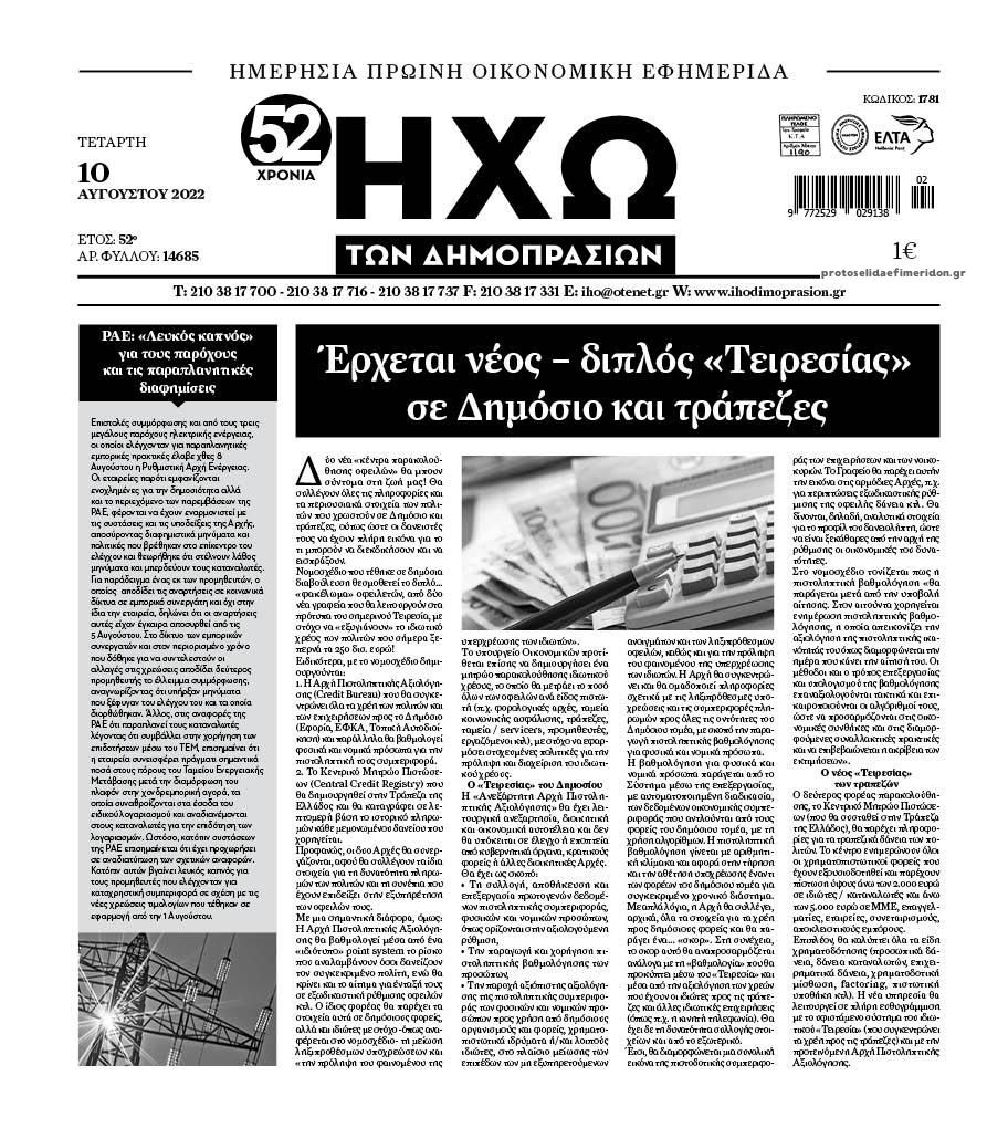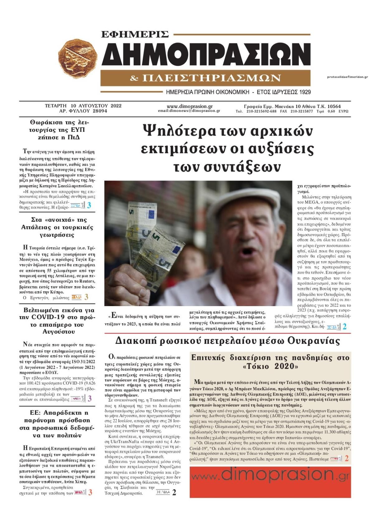 Οι οικονομικές εφημερίδες 10/8/2022 Σταύρος Ιωακείμ 06:48, Τετάρτη 10 Αυγούστου 2022 Media Διαβάστε τα πρωτοσέλιδα από τις οικονομικές εφημερίδες, σήμερα 10/08/2022. ΕΦΗΜΕΡΙΔΕΣ ΟΙΚΟΝΟΜΙΚΕΣ ΕΦΗΜΕΡΙΔΕΣ ΠΡΩΤΟΣΕΛΙΔΑ Μοιράσου το: Οι αθλητικές εφημερίδες 10/8/2022 Το Ποντίκι σήμερα Τετάρτη 10/8/2022 Οι πολιτικές εφημερίδες 10/8/2022 σχολίασε κι εσύ (0 σχόλια) Ακολουθήστε το enikos.gr στο Google News και μάθετε πρώτοι όλες τις ειδήσεις Δείτε όλες τις τελευταίες ειδήσεις από την Ελλάδα και τον Κόσμο στο enikos.gr Ειδήσεις Ροή Ειδήσεων 6 ώρες πριν Εκτός ευρωομάδας ΣΥΡΙΖΑ ο Νίκος Παππάς μετά την επίθεση στον δημοσιογράφο Νίκο Γιαννόπουλο – Η μήνυση και οι νέες δηλώσεις 7 ώρες πριν «Αγριεύουν» οι αγρότες: «Δεν συντρέχει λόγος συνάντησης με τον πρωθυπουργό» – Ώρα αποφάσεων στη σύσκεψη της Πέμπτης 7 ώρες πριν Κυψέλη: Χωρίς την οικογένειά της δίπλα της απολογήθηκε η 16χρονη – «Της είχε επιτεθεί κάποιος για να την βιάσει, φοβήθηκε και κυκλοφορούσε με μαχαίρι» 6 ώρες πριν Politico: Το πρόβλημα της Ευρώπης δεν είναι το Βέλγιο αλλά ο Ντόναλντ Τραμπ 8 ώρες πριν Αλεξανδρούπολη: Πολυοργανική ανεπάρκεια λόγω υποσιτισμού η αιτία θανάτου του 3χρονου αγοριού 7 ώρες πριν Μυστήριο με τεράστιες κυκλικές πέτρες 200 κιλών – Ανακαλύφθηκαν τυχαία κατά τη διάρκεια οδικών έργων και κανείς δεν ξέρει από πού προέρχονται 8 ώρες πριν Ύπνος: Ειδικός εξηγεί τον πραγματικό λόγο που ξυπνάτε στις 4 τα ξημερώματα – Ο ρόλος των ορμονών και του κιρκάδιου ρυθμού 9 ώρες πριν Αριθμολογία: Οι άνθρωποι που έχουν γεννηθεί αυτές τις 4 ημερομηνίες, είναι τρυφεροί και αγαπούν ανιδιοτελώς 20 ώρες πριν 20 χρόνια τα Χριστούγεννα ξεκινούν στα Public με μεγάλη ποικιλία σε δώρα! 3 λεπτά πριν Τα ζώδια σήμερα, Πέμπτη 18 Δεκεμβρίου: Λέοντες, η καρδιά σας θέλει να εκφραστεί 10 λεπτά πριν Το Ποντίκι σήμερα Πέμπτη 18/12/2025 15 λεπτά πριν Εφημερεύοντα φαρμακεία σε Αθήνα και Θεσσαλονίκη (18/12) 17 λεπτά πριν Αλεξάνδρα Ούστα: «Αυτό που με τρέλανε στον σύζυγό μου ήταν η ορθολογική του σκέψη» 24 λεπτά πριν Μιχάλης Αεράκης: «Της είπα “θέλω να κάνουμε σπιτικό, αλλά υπάρχουν τρεις προϋποθέσεις…”» ENIKOS NETWORK Αϋπνία: Το κόλπο που θα σας βοηθήσει να κοιμηθείτε απόψε – Είναι απλό και έχει αποτέλεσμα 2,6 εκατομμύρια πολίτες έχουν ήδη εμβολιαστεί κατά της γρίπης ΕΛΣΤΑΤ: Τι δείχνουν τα νέα στοιχεία για τις ηλεκτρονικές παραγγελίες των επιχειρήσεων ΚΕΠΕ: Οι 3 διακριτές συμβολές των ΜμΕ και της μεταποίησης στην ελληνική οικονομία Χαρτογραφώντας το «σημείο χωρίς επιστροφή»: Για πρώτη φορά αποκαλύπτεται με λεπτομέρεια το ακανθώδες όριο της ατμόσφαιρας τ... Η Google καταργεί τη λειτουργία «dark web report» – Πώς θα μπορούν οι χρήστες να διαγράφουν τα δεδομένα τους περισσότερα 05:22 , Πέμπτη 18 Δεκεμβρίου 2025 Το Ποντίκι σήμερα Πέμπτη 18/12/2025 Διαβάστε το πρωτοσέλιδο της εφημερίδας «Το Ποντίκι» σήμερα 18/12/2025. 02:30 , Πέμπτη 18 Δεκεμβρίου 2025 Αλ Τσαντίρι Νιουζ: Η κόρη της Πάολα στο κοινό – Η ατάκα Λαζόπουλου που την έκανε να «κοκκινήσει» Γιορτινή διάθεση και ευχάριστες στιγμές γέμισε η αποψινή, τελευταία για το 2025, εκπομπή του «... 22:24 , Τετάρτη 17 Δεκεμβρίου 2025 Το Σπίτι Δίπλα Στο Ποτάμι: Σε κίνδυνο η υγεία του Απόστολου – Τι θα δούμε απόψε “Το Σπίτι Δίπλα στο Ποτάμι” ξετυλίγει το νήμα της ζωής των πέντε αδελφών με καταισ... 21:14 , Τετάρτη 17 Δεκεμβρίου 2025 Παιχνίδια Εκδίκησης: Θα καταφέρει ο Χρήστος να κλονίσει την εμπιστοσύνη της Μάγιας απέναντι στον Άγη; Τα «Παιχνίδια Εκδίκησης» έρχονται απόψε στις 22:30, στον Αντ1, με