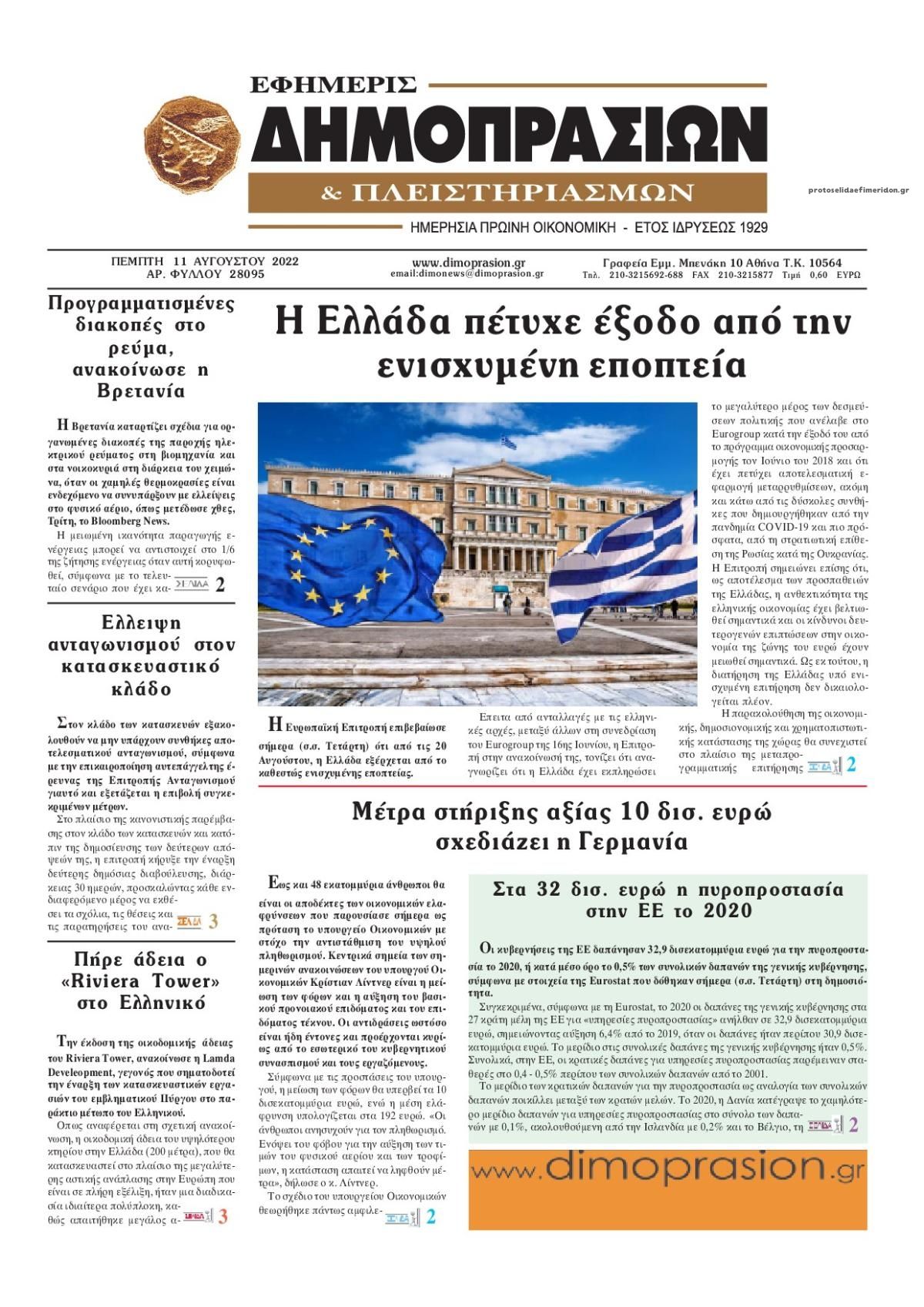 Οι οικονομικές εφημερίδες 11/8/2022 Σταύρος Ιωακείμ 06:49, Πέμπτη 11 Αυγούστου 2022 Media Διαβάστε τα πρωτοσέλιδα από τις οικονομικές εφημερίδες, σήμερα 11/08/2022. ΕΦΗΜΕΡΙΔΕΣ ΟΙΚΟΝΟΜΙΚΕΣ ΕΦΗΜΕΡΙΔΕΣ ΠΡΩΤΟΣΕΛΙΔΑ Μοιράσου το: Οι αθλητικές εφημερίδες 11/8/2022 Θάσος: Μαίνεται η φωτιά – Σηκώθηκαν τα εναέρια μέσα Οι πολιτικές εφημερίδες 11/8/2022 σχολίασε κι εσύ (0 σχόλια) Ακολουθήστε το enikos.gr στο Google News και μάθετε πρώτοι όλες τις ειδήσεις Δείτε όλες τις τελευταίες ειδήσεις από την Ελλάδα και τον Κόσμο στο enikos.gr Ειδήσεις Ροή Ειδήσεων 21 λεπτά πριν Εκτός ευρωομάδας ΣΥΡΙΖΑ ο Νίκος Παππάς μετά την επίθεση στον δημοσιογράφο Νίκο Γιαννόπουλο – Η μήνυση και οι νέες δηλώσεις 50 λεπτά πριν «Αγριεύουν» οι αγρότες: «Δεν συντρέχει λόγος συνάντησης με τον πρωθυπουργό» – Ώρα αποφάσεων στη σύσκεψη της Πέμπτης 44 λεπτά πριν Κυψέλη: Χωρίς την οικογένειά της δίπλα της απολογήθηκε η 16χρονη – «Της είχε επιτεθεί κάποιος για να την βιάσει, φοβήθηκε και κυκλοφορούσε με μαχαίρι» 16 λεπτά πριν Politico: Το πρόβλημα της Ευρώπης δεν είναι το Βέλγιο αλλά ο Ντόναλντ Τραμπ 2 ώρες πριν Αλεξανδρούπολη: Πολυοργανική ανεπάρκεια λόγω υποσιτισμού η αιτία θανάτου του 3χρονου αγοριού 34 λεπτά πριν Μυστήριο με τεράστιες κυκλικές πέτρες 200 κιλών – Ανακαλύφθηκαν τυχαία κατά τη διάρκεια οδικών έργων και κανείς δεν ξέρει από πού προέρχονται 2 ώρες πριν Ύπνος: Ειδικός εξηγεί τον πραγματικό λόγο που ξυπνάτε στις 4 τα ξημερώματα – Ο ρόλος των ορμονών και του κιρκάδιου ρυθμού 3 ώρες πριν Αριθμολογία: Οι άνθρωποι που έχουν γεννηθεί αυτές τις 4 ημερομηνίες, είναι τρυφεροί και αγαπούν ανιδιοτελώς 14 ώρες πριν 20 χρόνια τα Χριστούγεννα ξεκινούν στα Public με μεγάλη ποικιλία σε δώρα! 16 λεπτά πριν Politico: Το πρόβλημα της Ευρώπης δεν είναι το Βέλγιο αλλά ο Ντόναλντ Τραμπ 21 λεπτά πριν Εκτός ευρωομάδας ΣΥΡΙΖΑ ο Νίκος Παππάς μετά την επίθεση στον δημοσιογράφο Νίκο Γιαννόπουλο – Η μήνυση και οι νέες δηλώσεις 21 λεπτά πριν Κύπελλο Ελλάδας: Η Μαρκό έστειλε τον ΠΑΟΚ στον Ολυμπιακό… μέσω Ατρόμητου 25 λεπτά πριν Άκης Σκέρτσος: Μήνυση και αγωγή κατά της Ζωής Κωνσταντοπούλου θα καταθέσει ο υπουργός Επικρατείας 34 λεπτά πριν Μυστήριο με τεράστιες κυκλικές πέτρες 200 κιλών – Ανακαλύφθηκαν τυχαία κατά τη διάρκεια οδικών έργων και κανείς δεν ξέρει από πού προέρχονται ENIKOS NETWORK Αϋπνία: Το κόλπο που θα σας βοηθήσει να κοιμηθείτε απόψε – Είναι απλό και έχει αποτέλεσμα 2,6 εκατομμύρια πολίτες έχουν ήδη εμβολιαστεί κατά της γρίπης ΕΛΣΤΑΤ: Τι δείχνουν τα νέα στοιχεία για τις ηλεκτρονικές παραγγελίες των επιχειρήσεων ΚΕΠΕ: Οι 3 διακριτές συμβολές των ΜμΕ και της μεταποίησης στην ελληνική οικονομία Χαρτογραφώντας το «σημείο χωρίς επιστροφή»: Για πρώτη φορά αποκαλύπτεται με λεπτομέρεια το ακανθώδες όριο της ατμόσφαιρας τ... Η Google καταργεί τη λειτουργία «dark web report» – Πώς θα μπορούν οι χρήστες να διαγράφουν τα δεδομένα τους περισσότερα 22:24 , Τετάρτη 17 Δεκεμβρίου 2025 Το Σπίτι Δίπλα Στο Ποτάμι: Σε κίνδυνο η υγεία του Απόστολου – Τι θα δούμε απόψε “Το Σπίτι Δίπλα στο Ποτάμι” ξετυλίγει το νήμα της ζωής των πέντε αδελφών με καταισ... 21:14 , Τετάρτη 17 Δεκεμβρίου 2025 Παιχνίδια Εκδίκησης: Θα καταφέρει ο Χρήστος να κλονίσει την εμπιστοσύνη της Μάγιας απέναντι στον Άγη; Τα «Παιχνίδια Εκδίκησης» έρχονται απόψε στις 22:30, στον Αντ1, με το τελευταίο επεισόδιο της χ... 20:57 , Τετάρτη 17 Δεκεμβρίου 2025 Άγιος Έρωτας: Η Χλόη καταθέτει εναντίον του πατέρα της και ο Χάρης αποκαλύπτει στ