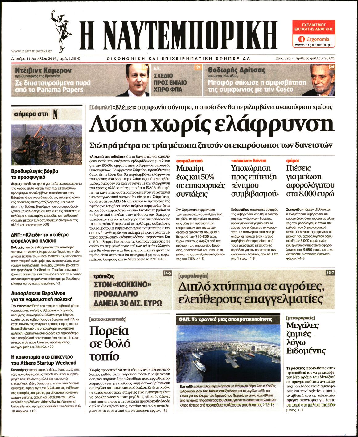 Οι οικονομικές εφημερίδες 11/4/2016 Enikos Newsroom 06:37, Δευτέρα 11 Απριλίου 2016 Media Διαβάστε τα σημερινά πρωτοσέλιδα των οικονομικών εφημερίδων… ΟΙΚΟΝΟΜΙΚΕΣ ΕΦΗΜΕΡΙΔΕΣ ΠΡΩΤΟΣΕΛΙΔΑ Μοιράσου το: σχολίασε κι εσύ (0 σχόλια) Ακολουθήστε το enikos.gr στο Google News και μάθετε πρώτοι όλες τις ειδήσεις Δείτε όλες τις τελευταίες ειδήσεις από την Ελλάδα και τον Κόσμο στο enikos.gr Ειδήσεις Ροή Ειδήσεων 1 ώρα πριν Αγρότες: «Όχι στον διάλογο, μας εμπαίζει η κυβέρνηση» – Αποφάσισαν κλιμάκωση των κινητοποιήσεων, τι θα γίνει τα Χριστούγεννα 2 ώρες πριν Την πρώτη Belharra παρέλαβε η χώρα μας, υψώθηκε η ελληνική σημαία στη φρεγάτα «Κίμων» – Δένδιας: «Το ισχυρότερο Πολεμικό Ναυτικό που είχε ποτέ ο ελληνισμός» 4 ώρες πριν Γιώργος Μαζωνάκης: «Δεν ζήτησα χρήματα, παρά μόνο ηθική δικαίωση» – Οι πρώτες δηλώσεις του 21χρονου μετά την κατάθεση της μήνυσης 55 λεπτά πριν Μιχάλης Χουρδάκης: «Είμαι διαθέσιμος να συμβάλω στην προσωρινή κάλυψη του ιατρείου της Ψερίμου» – Η επιστολή στον Άδωνι Γεωργιάδη 1 ώρα πριν Εξώδικο Γεωργιάδη στην Κωνσταντοπούλου – «Με κατηγόρησε ότι έχω καταδικαστεί για παιδεραστία» 2 ώρες πριν Τα 5 ζώδια που θα ευνοηθούν στα οικονομικά τους το 2026 – «Τραβούν το χρήμα σαν μαγνήτες» 7 ώρες πριν Αν κάνετε συνεχώς αυτά τα 8 πράγματα με τα κατοικίδιά σας, σας λείπει η ανθρώπινη επαφή 3 ώρες πριν Αυτό που κρύβεται κάτω από τη Γροιλανδία θα μπορούσε να ανατρέψει όσα γνωρίζουμε για την άνοδο της στάθμης των θαλασσών 1 ημέρα πριν 20 χρόνια τα Χριστούγεννα ξεκινούν στα Public με μεγάλη ποικιλία σε δώρα! 3 λεπτά πριν Δίκη για υποκλοπές: Τη βίαιη προσαγωγή δύο μαρτύρων διέταξε το δικαστήριο – Τι κατέθεσε ο Τάσος Τέλλογλου 9 λεπτά πριν Σύνοδος Κορυφής: Οι Ευρωπαίοι συμφώνησαν να εξετάσουν την χρήση των ρωσικών περιουσιακών για την χρηματοδότηση της Ουκρανίας – Η δήλωση Ζελένσκι 13 λεπτά πριν Δένδιας: Έναρξη διαπραγματεύσεων για την ταχύτερη ανανέωση της Στρατηγικής Εταιρικής Σχέσης Ελλάδας – Γαλλίας 18 λεπτά πριν ROUK ZOUK: Εορταστικό επεισόδιο με καλεσμένους τους πρωταγωνιστές του «Γιατί ρε πατέρα» 23 λεπτά πριν Φιντάν: «Η Κυπριακή Δημοκρατία μας παρεμποδίζει όπου βρει την ευκαιρία» – Η πονηρή πρόταση που ανοίγει τον δρόμο για δύο κράτη ENIKOS NETWORK ΕΟΔΥ: Δωρεάν τεστ για HIV, Ηπατίτιδες, Σύφιλη, Χλαμύδια, Γονόρροια 100 χρόνια ΠΙΣ: Ένας αιώνας προσφοράς στην Ιατρική και την κοινωνία Χριστούγεννα και Πρωτοχρονιά: Δείτε πόσα χρήματα θα πάρουν ως αμοιβή όσοι εργαστούν Κρατική επιχορήγηση έως 14.500 ευρώ: Ποιοι θα λάβουν από σήμερα την προκαταβολή στον τραπεζικό λογαριασμό τους Χαρτογραφώντας το «σημείο χωρίς επιστροφή»: Για πρώτη φορά αποκαλύπτεται με λεπτομέρεια το ακανθώδες όριο της ατμόσφαιρας τ... Η Google καταργεί τη λειτουργία «dark web report» – Πώς θα μπορούν οι χρήστες να διαγράφουν τα δεδομένα τους περισσότερα 17:45 , Πέμπτη 18 Δεκεμβρίου 2025 ROUK ZOUK: Εορταστικό επεισόδιο με καλεσμένους τους πρωταγωνιστές του «Γιατί ρε πατέρα» Το Σάββατο 20 Δεκεμβρίου στις 21:00, η Ζέτα Μακρυπούλια υποδέχεται εκλεκτούς ηθοποιούς που όλο... 17:20 , Πέμπτη 18 Δεκεμβρίου 2025 Άγιος έρωτας: Η Χριστίνα εξομολογείται στον πατέρα Νικόλαο, απόψε στις 21:00 στον Alpha Η Νότα αποφασίζει να εκδικηθεί τον Πέτρο και τον Στέφανο, για χάρη του Λούη, όμως τα πράγματα ... 16:50 , Πέμπτη 18 Δεκεμβρίου 2025 Να μ’ αγαπάς: Ζωή και Φωτεινή συμφιλιώνονται ως μάνα με κόρη, απόψε στις 20:00 Η ταυτότητα του Άγγελου αποκαλύπτεται στο νέο επεισόδιο της σειράς “Να μ’ αγαπάς... 15:52
