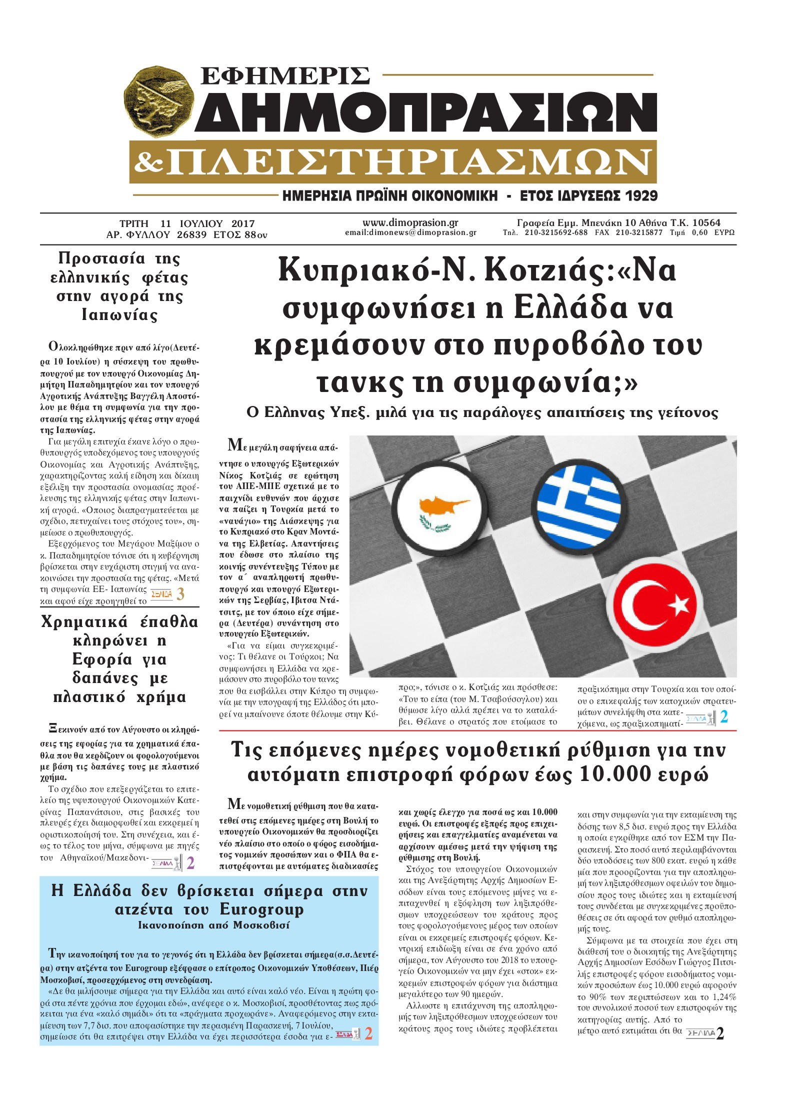 Οι οικονομικές εφημερίδες 11/7/2017 Enikos Newsroom 07:06, Τρίτη 11 Ιουλίου 2017 Media Διαβάστε τα σημερινά πρωτοσέλιδα των οικονομικών εφημερίδων: ΟΙΚΟΝΟΜΙΚΕΣ ΕΦΗΜΕΡΙΔΕΣ ΠΡΩΤΟΣΕΛΙΔΑ Μοιράσου το: σχολίασε κι εσύ (0 σχόλια) Ακολουθήστε το enikos.gr στο Google News και μάθετε πρώτοι όλες τις ειδήσεις Δείτε όλες τις τελευταίες ειδήσεις από την Ελλάδα και τον Κόσμο στο enikos.gr Ειδήσεις Ροή Ειδήσεων 4 ώρες πριν Χριστούγεννα στα μπλόκα: Επιμένουν στις κινητοποιήσεις τους οι αγρότες – Ανοίγουν τα διόδια το Σαββατοκύριακο 5 ώρες πριν Ουκρανία: Η άνευ προηγουμένου επίθεση σε ρωσικό τάνκερ στη Μεσόγειο και το μήνυμα προς στον Πούτιν – Το «μακρύ χέρι» του Κιέβου 4 ώρες πριν Πούτιν: Τα μηνύματα σε Ευρώπη και ΝΑΤΟ από το μαραθώνιο «σόου» του – Η απαίτηση για «σεβασμό» και η ειρήνη «με τους όρους» της Μόσχας 5 ώρες πριν Τραμπ: Δεν αποκλείει την πιθανότητα ενός πολέμου στη Βενεζουέλα – «Ο Μαδούρο ξέρει καλύτερα από τον καθένα τι ακριβώς θέλω» 5 ώρες πριν Συνεχίζει να προκαλεί ο Μίτσκοσκι: «Για μένα το όνομα Μακεδονία είναι ιερό» 4 ώρες πριν Ανακαλύφθηκαν αρχαία χρυσά νομίσματα 2.200 ετών που απεικονίζουν τον θεό Απόλλωνα – Η άγνωστη σύνδεση με τον Φίλιππο Β΄ της Μακεδονίας 5 ώρες πριν Ύπνος: Μια κρυφή κατάσταση του εγκεφάλου πριν από τον ύπνο μπορεί να είναι το “κλειδί” για υψηλή ευφυΐα και δημιουργικότητα 6 ώρες πριν Αριθμολογία: Οι άνθρωποι που έχουν γεννηθεί αυτές τις 4 ημερομηνίες, συχνά παρεξηγούνται – «Η καλοσύνη τους κρύβει τεράστια δύναμη» 7 ώρες πριν Ξεχάστε το καθάρισμα το Σαββατοκύριακο: Ο «κανόνας των 20 λεπτών» που θα σας λύσει τα χέρια 15 λεπτά πριν Θεσσαλονίκη: Εξαφανίστηκε 13χρονος από χώρο φιλοξενίας ασυνόδευτων ανηλίκων στο Ωραιόκαστρο 25 λεπτά πριν Ντόναλντ Τραμπ: «Πολύ βαριά αντίποινα» στη Συρία – «Πλήττουμε πολύ δυνατά οχυρά του Ισλαμικού Κράτους» 40 λεπτά πριν Εξάρχεια: Ένταση με μολότοφ, χημικά και κρότου λάμψης 56 λεπτά πριν ΗΠΑ: Τραγωδία στην Αλαμπάμα – Σκότωσε την δημοσιογράφο σύζυγό του και αυτοκτόνησε μπροστά στον 3χρονο γιο τους 1 ώρα πριν Πρόταση γάμου στο ΣΕΦ κατά την διάρκεια του αγώνα Ολυμπιακός-Βιλερμπάν – Δείτε βίντεο ENIKOS NETWORK Το ΕΚΑΒ τιμήθηκε από την Ακαδημία Αθηνών για τα 40 χρόνια προσφοράς του Έχετε πραγματικά μεγάλη καρδιά; 10 χαρακτηριστικά όσων έχουν καλοσύνη Αναστολή μέτρων αναγκαστικής εκτέλεσης για κτηνοτρόφους που πλήττονται από την ευλογιά των αιγοπροβάτων Πλήρης επάρκεια προϊόντων στις λαϊκές της Αττικής, παρά τις αγροτικές κινητοποιήσεις – Τι απαντούν οι πωλητές Χαρτογραφώντας το «σημείο χωρίς επιστροφή»: Για πρώτη φορά αποκαλύπτεται με λεπτομέρεια το ακανθώδες όριο της ατμόσφαιρας τ... Η Google καταργεί τη λειτουργία «dark web report» – Πώς θα μπορούν οι χρήστες να διαγράφουν τα δεδομένα τους περισσότερα 22:42 , Παρασκευή 19 Δεκεμβρίου 2025 Γιώργος Γιαννόπουλος για “Το σόι σου”: “Είναι ευτυχία και ευλογία αυτή η σειρά” «Είναι ευτυχία και ευλογία η συγκυρία αυτής της σειράς», θα πει ο Γιώργος Γιαννόπουλος -ο αγαπ... 20:37 , Παρασκευή 19 Δεκεμβρίου 2025 Don’t Forget The Lyrics: Η Έλλη Κοκκίνου υποδέχεται 4 παίκτες που θα κάνουν τα πάντα για να μη χάσουν ούτε… μισή λέξη από τους στίχους Το «Don’t Forget The Lyrics» επιστρέφει απόψε, Παρασκευή 19 Δεκεμβρίου, στις 21:00 με νέο επει... 19:31 , Παρασκευή 19 Δεκεμβρίου 2025 GNTM: Απόψε ο μεγάλος τελικός για τους 4 φιναλίστ Έπειτα από μήνες γεμάτους μόδα, δημιουργία και έντονες αναμετρήσεις, το GNTM 2025 κορυφώνεται,... 18:11 , Παρασκευή 19 Δεκεμβρίου 202