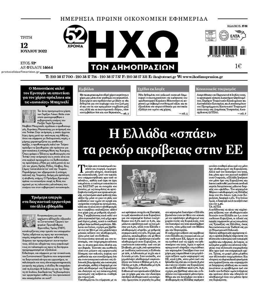 Οι οικονομικές εφημερίδες 12/7/2022 Σταύρος Ιωακείμ 06:39, Τρίτη 12 Ιουλίου 2022 Media Διαβάστε τα πρωτοσέλιδα από τις οικονομικές εφημερίδες, σήμερα 12/07/2022. ΕΦΗΜΕΡΙΔΕΣ ΟΙΚΟΝΟΜΙΚΕΣ ΕΦΗΜΕΡΙΔΕΣ ΠΡΩΤΟΣΕΛΙΔΑ Μοιράσου το: Οι αθλητικές εφημερίδες 12/7/2022 Οι πολιτικές εφημερίδες 12/7/2022 Άρης: «Μπαμ» με Ζερβίνιο – Έμεινε ελεύθερος από την Τράμπζονσπορ σχολίασε κι εσύ (0 σχόλια) Ακολουθήστε το enikos.gr στο Google News και μάθετε πρώτοι όλες τις ειδήσεις Δείτε όλες τις τελευταίες ειδήσεις από την Ελλάδα και τον Κόσμο στο enikos.gr Ειδήσεις Ροή Ειδήσεων 44 λεπτά πριν Πούτιν: «Ανοησίες» και «υστερίες» οι ισχυρισμοί της Ευρώπης για πιθανή σύγκρουση με τη Ρωσία – «Κάνουν πλύση εγκεφάλου» 5 ώρες πριν Έρευνα MRB: Η πρόθεση ψήφου και τα σημαντικότερα προβλήματα – Οι «λέξεις» που εκφράζουν τους πολίτες 1 ώρα πριν Κυψέλη: Στον ανακριτή η 16χρονη που μαχαίρωσε την 14χρονη – «Είχα το μαχαίρι για προστασία – Έχω θέμα με τα νεύρα μου» 33 λεπτά πριν Συνάντηση Μητσοτάκη με την Κ.Ο. της ΝΔ: Οι αφίξεις των βουλευτών, τα γλυκά και τα «πηγαδάκια» 2 ώρες πριν Αμοργός: «Θα προσπαθήσω να το κάνω κάθε μέρα» – Ποιος είναι ο αγρότης που έστησε μόνος του το πρώτο μπλόκο στο νησί 5 ώρες πριν Τα 4 ζώδια που ξαναβρίσκουν τον εαυτό τους – «Μπαίνετε επιτέλους στην ουσία των πραγμάτων» 6 ώρες πριν 20 χρόνια τα Χριστούγεννα ξεκινούν στα Public με μεγάλη ποικιλία σε δώρα! 4 ώρες πριν «Δεν είχα κλάψει από τότε που διαγνώστηκα με καρκίνο, ώσπου ένα τηλεφώνημα με έκανε να λυγίσω» – Η συγκλονιστική εξομολόγηση ενός άνδρα 3 ώρες πριν Τα 7 σπάνια χαρακτηριστικά που κάνουν κάποιους ανθρώπους ακαταμάχητους 3 λεπτά πριν Τζιτζικώστας από το Στρασβούργο: «Σανίδα σωτηρίας για την ευρωπαϊκή αυτοκινητοβιομηχανία η νέα δέσμη μέτρων που υιοθετήσαμε – Κινητήρες εσωτερικής καύσης και υβριδικά οχήματα και μετά το 2035» 6 λεπτά πριν Τροχαίο στην Αττική Οδό: Κλειστή η δεξιά λωρίδα μετά την έξοδο Μαραθώνος στο ρεύμα προς Αεροδρόμιο 8 λεπτά πριν Βόλος: Καθηγητής κλείδωσε μαθητές στην τάξη για να κάνει μάθημα – Οι καταγγελίες 13 λεπτά πριν Debate Καιρίδη – Γιαννούλη στον Realfm 97,8 για τη συζήτηση στη Βουλή, την ακρίβεια και τον πρωτογενή τομέα 18 λεπτά πριν Λίλι Κόλινς: Σχολίασε τη διαμάχη Μακρόν – Ρώμης για το «Emily in Paris» – «Γίναμε μέρος ενός ευρωπαϊκού πολιτικού ερωτικού τριγώνου» ENIKOS NETWORK 5 πράγματα που αποφεύγει γαστρεντερολόγος για να μειώσει τον κίνδυνο καρκίνου του εντέρου Ανησυχητική αύξηση της υπέρτασης στα παιδιά – Πώς θα τα προστατέψουμε; «IRIS Παντού»: Στην κορυφή της Ευρώπης η Ελλάδα με 120 εκατ. ευρώ συναλλαγές το 2025 – Η σύγκριση με τις άλλες χώρες της Ευ... Αδειοδωρόσημο Χριστουγέννων 2025: Πότε γίνεται η καταβολή του και σε ποιους Σύγχρονος Νοστράδαμος: Προειδοποιεί για «μεγάλο γεγονός» τους επόμενους μήνες που θα συγκλονίσει τη Βρετανία και τον κόσμο Τεστ παρατηρητικότητας: Μπορείτε να βρείτε τις 3 διαφορές στις εικόνες με έναν πιγκουίνο σε 14 δευτερόλεπτα περισσότερα 12:35 , Τετάρτη 17 Δεκεμβρίου 2025 Μίρκα Παπακωνσταντίνου: «Δεν ήμουν αισιόδοξη για τα νούμερα – Είμαι ρεαλίστρια» Στα γυρίσματα του εορταστικού επεισοδίου της αγαπημένης σειράς “Το Σόι Σου”, βρέθηκε η κάμερα ... 12:12 , Τετάρτη 17 Δεκεμβρίου 2025 Ακούστε την εκπομπή του Νίκου Χατζηνικολάου 17/12/2025 Ακούστε την εκπομπή του Νίκου Χατζηνικολάου στον ραδιοφωνικό σταθμό RealFm 97,8, την Τετάρτη 1... 11:35 , Τετάρτη 17 Δεκεμβρίου 2025 Home Alone: Το σπίτι της ταινίας θα ανακαινιστεί – Επιστροφή στην αισθητι
