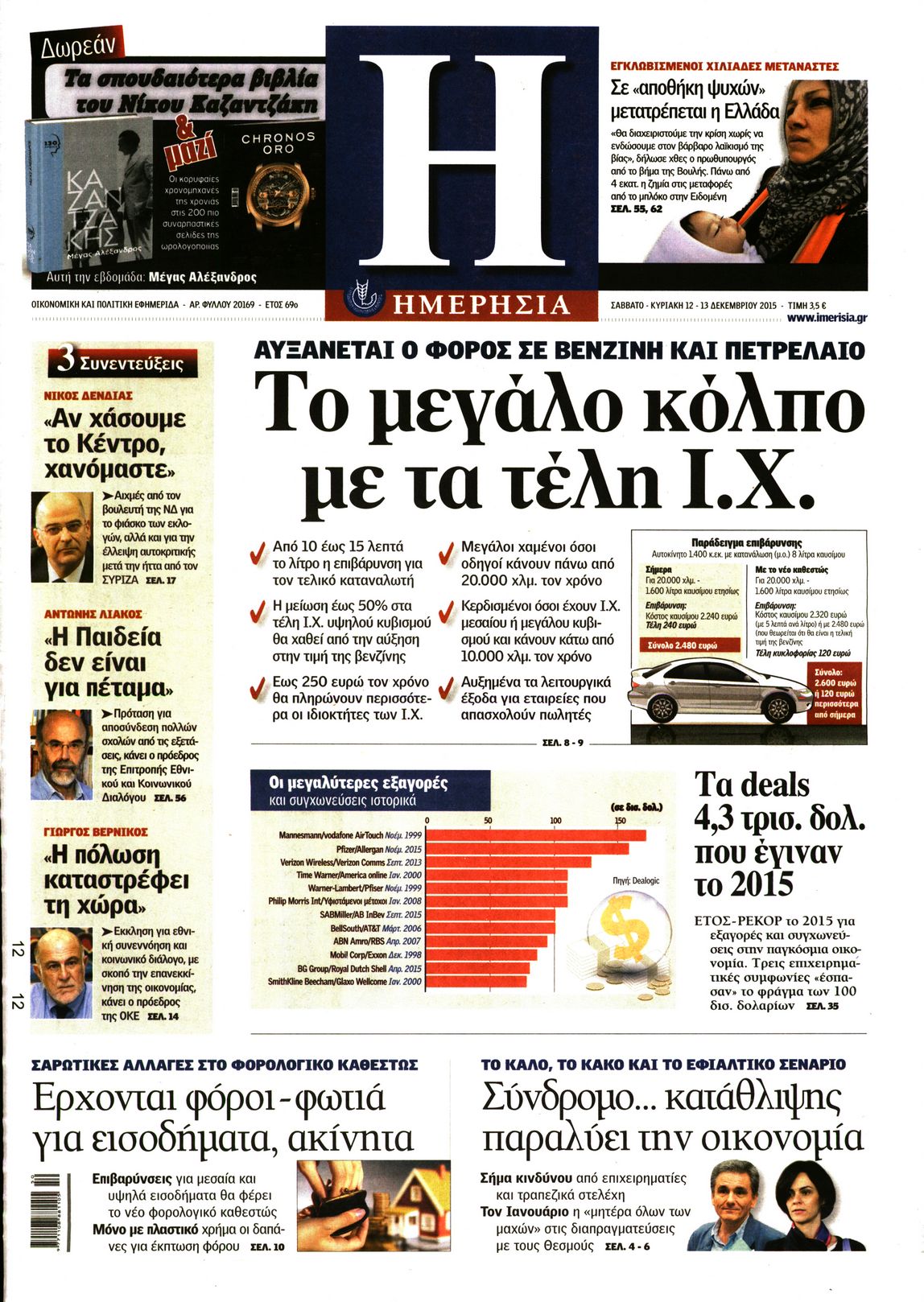 Oι οικονομικές εφημερίδες 12/12/2015 Enikos Newsroom 05:17, Σάββατο 12 Δεκεμβρίου 2015 Media Διαβάστε τα σημερινά πρωτοσέλιδα των οικονομικών εφημερίδων: ΟΙΚΟΝΟΜΙΚΕΣ ΕΦΗΜΕΡΙΔΕΣ ΠΡΩΤΟΣΕΛΙΔΑ Μοιράσου το: σχολίασε κι εσύ (0 σχόλια) Ακολουθήστε το enikos.gr στο Google News και μάθετε πρώτοι όλες τις ειδήσεις Δείτε όλες τις τελευταίες ειδήσεις από την Ελλάδα και τον Κόσμο στο enikos.gr Ειδήσεις Ροή Ειδήσεων 1 ώρα πριν Ευρωπαϊκή Ένωση: Συμφωνία για δάνειο 90 δισ. ευρώ στην Ουκρανία τη διετία 2026-2027 6 ώρες πριν ΟΠΕΚΕΠΕ: Προφυλακιστέος ο φερόμενος αρχηγός και ο λογιστής της εγκληματικής οργάνωσης 7 ώρες πριν Αυξάνουν την πίεση προς την κυβέρνηση οι αγρότες: Κλείνουν παρακαμπτήριους και ανοίγουν διόδια – Τι θα γίνει τις γιορτές 7 ώρες πριν Φοινικούντα: Το Σάββατο απολογείται ο 30χρονος γιος γνωστού επιχειρηματία της Πλάκας που παραδόθηκε – Όσα είπε στους αστυνομικούς και ο ρόλος του στο έγκλημα 5 ώρες πριν ΑΕΚ – Κραϊόβα 3-2: Επική ανατροπή και πρόκριση στους «16» του Conference League η Ένωση 6 ώρες πριν Αρχαιολόγοι ανακάλυψαν ρωμαϊκά τεχνουργήματα από μια πόλη που δεν υπήρξε ποτέ – Τα τρία εντυπωσιακά κτίρια και ο αμφορέας με τις… σαρδέλες 7 ώρες πριν Ύπνος: Η απλή βραδινή ρουτίνα για να προστατεύσετε τα μαλλιά σας από το κρύο κατά τη διάρκεια του χειμώνα 8 ώρες πριν Manifesting: Πώς να συναντήσετε τον σύντροφο της ζωής σας, ανάλογα με τον μήνα γέννησής σας 2 ημέρες πριν 20 χρόνια τα Χριστούγεννα ξεκινούν στα Public με μεγάλη ποικιλία σε δώρα! 4 λεπτά πριν Εφημερεύοντα φαρμακεία σε Αθήνα και Θεσσαλονίκη (19/12) 11 λεπτά πριν Η TikTok στις ΗΠΑ πωλείται σε Oracle, Silver Lake και MGX – Οι λεπτομέρειες του «deal» 19 λεπτά πριν Αλεξάντερ Λουκασένκο: Η Λευκορωσία βρίσκεται κοντά στην αποκατάσταση των σχέσεών της με τις ΗΠΑ 35 λεπτά πριν Αυστραλία: Κήρυξε την Κυριακή (21/12) ημέρα εθνικού πένθους για τη φονική επίθεση στην παραλία Μπόνταϊ 45 λεπτά πριν Ρόδος: Δάσκαλος καράτε καταδικάστηκε για ασέλγεια σε ανήλικες αθλήτριες – Μαρτυρίες για αγγίγματα σε ευαίσθητα σημεία ENIKOS NETWORK Σε περίοδο αυξημένης δραστηριότητας η γρίπη στην Ελλάδα-Μέτρα προστασίας από τον ΕΟΔΥ Σκέφτεστε συνέχεια συζητήσεις που έχετε κάνει; Τι σημαίνει αυτό, σύμφωνα με ειδικό Στεγαστικό: Τι λέει η ΠΟΜΙΔΑ για τα νέα μέτρα που ανακοίνωσε ο Κυριάκος Μητσοτάκης Λαγκάρντ: Αισιόδοξη για την ανάπτυξη της Ευρωζώνης, αβέβαιη για τον πληθωρισμό Χαρτογραφώντας το «σημείο χωρίς επιστροφή»: Για πρώτη φορά αποκαλύπτεται με λεπτομέρεια το ακανθώδες όριο της ατμόσφαιρας τ... Η Google καταργεί τη λειτουργία «dark web report» – Πώς θα μπορούν οι χρήστες να διαγράφουν τα δεδομένα τους περισσότερα 02:50 , Παρασκευή 19 Δεκεμβρίου 2025 GNTM: «Κλείδωσαν» οι τέσσερις φιναλίστ – Μεγάλη ανατροπή στις τελευταίες αποχωρήσεις Για προτελευταία φορά εμφανίστηκαν στο πλατό του GNTM οι φιναλίστ του φετινού κύκλου, το βράδυ... 17:45 , Πέμπτη 18 Δεκεμβρίου 2025 ROUK ZOUK: Εορταστικό επεισόδιο με καλεσμένους τους πρωταγωνιστές του «Γιατί ρε πατέρα» Το Σάββατο 20 Δεκεμβρίου στις 21:00, η Ζέτα Μακρυπούλια υποδέχεται εκλεκτούς ηθοποιούς που όλο... 17:20 , Πέμπτη 18 Δεκεμβρίου 2025 Άγιος έρωτας: Η Χριστίνα εξομολογείται στον πατέρα Νικόλαο, απόψε στις 21:00 στον Alpha Η Νότα αποφασίζει να εκδικηθεί τον Πέτρο και τον Στέφανο, για χάρη του Λούη, όμως τα πράγματα ... 16:50 , Πέμπτη 18 Δεκεμβρίου 2025 Να μ’ αγαπάς: Ζωή και Φωτεινή συμφιλιώνονται ως μάνα με κόρη, απόψε στις 20:00 Η ταυτότητα του Άγγελου αποκαλύπτεται στο νέο επεισόδιο της σειράς “Να μ’ αγαπά